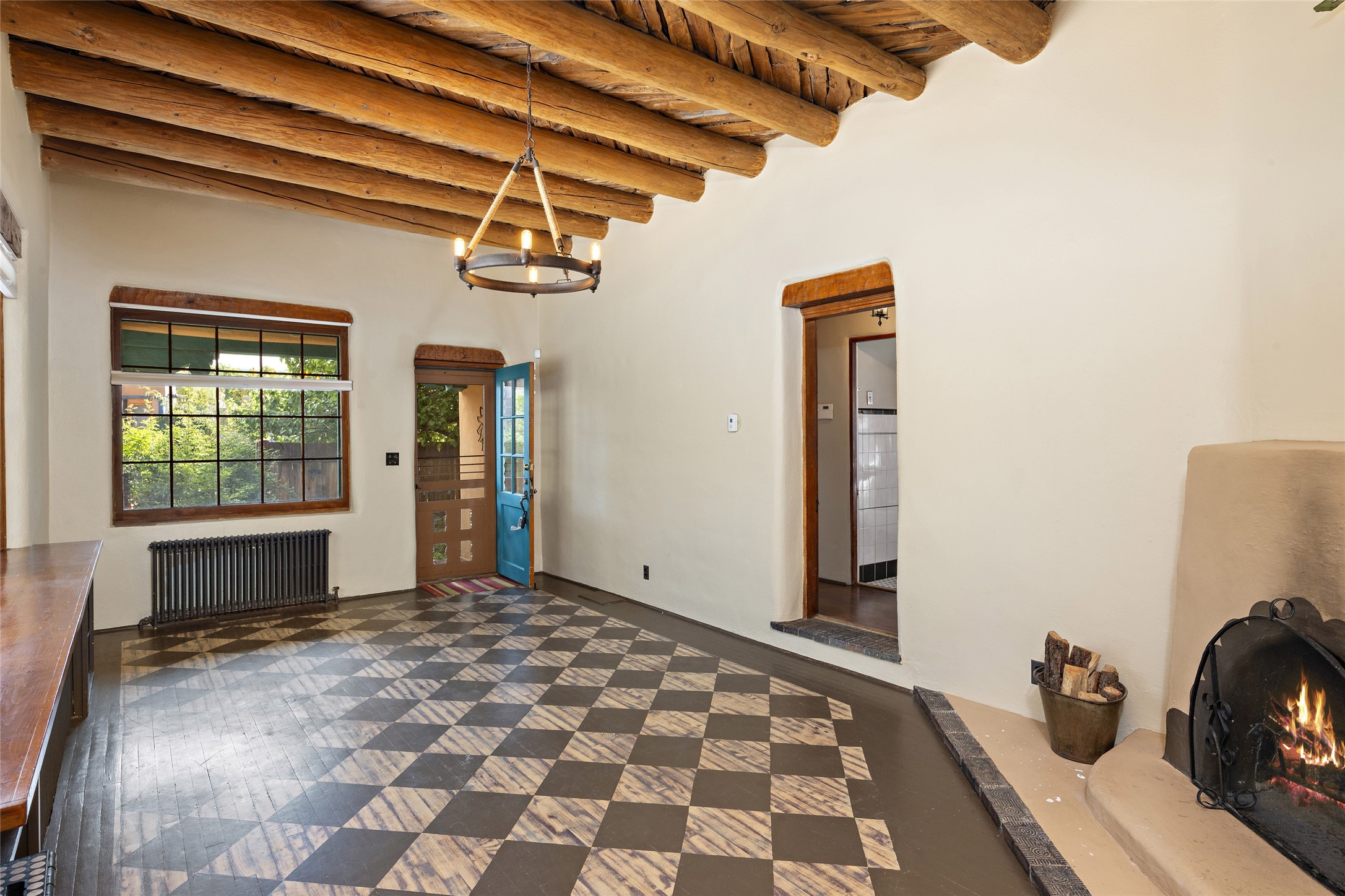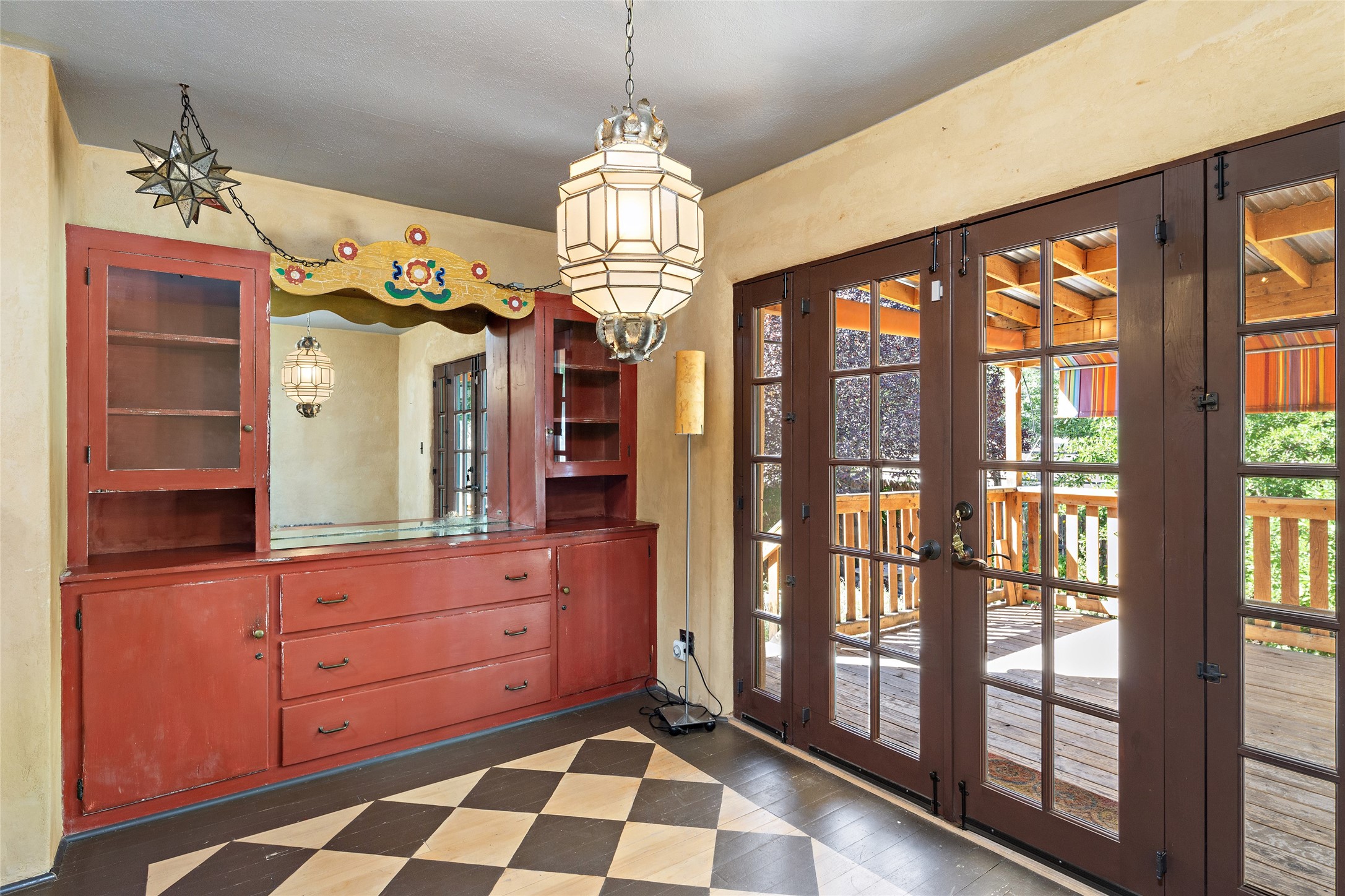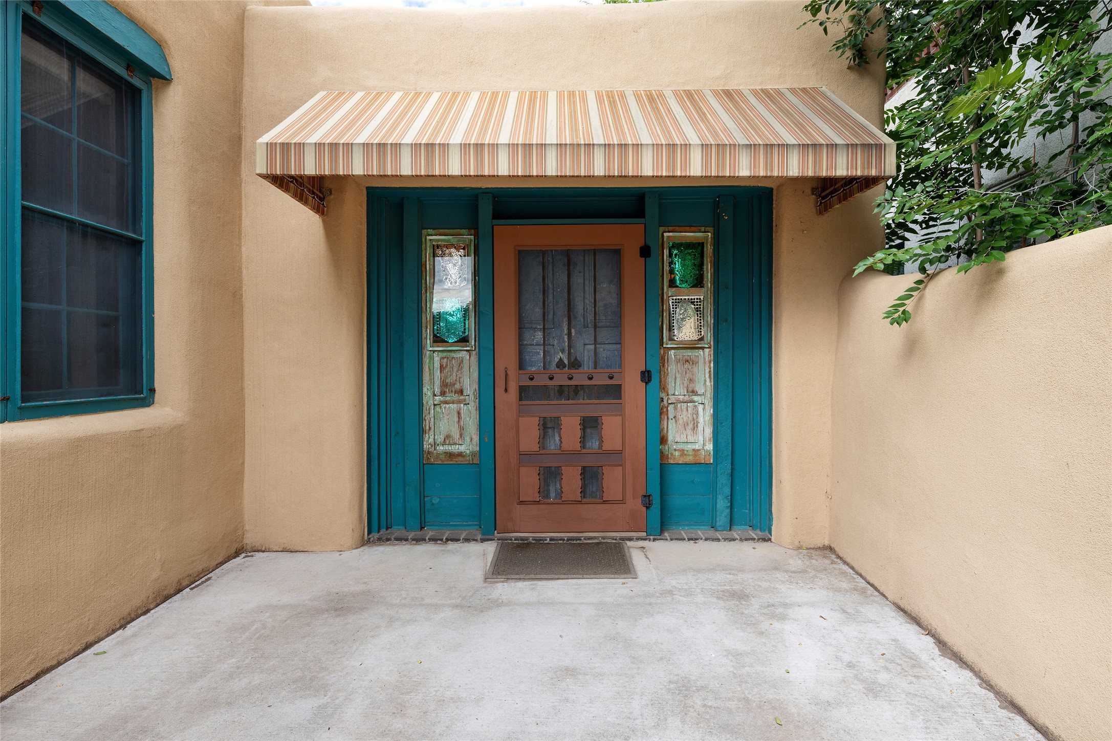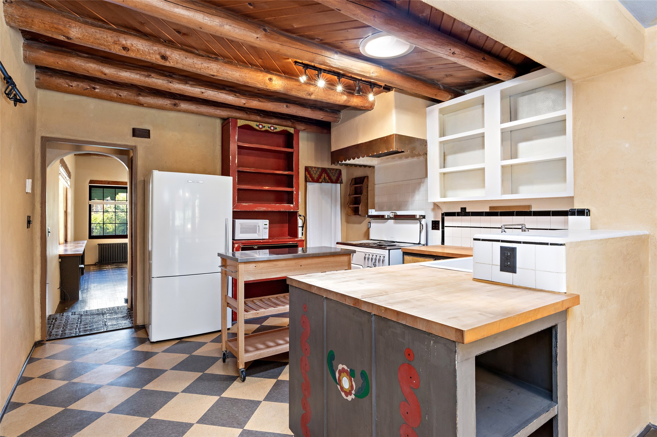 A hop and a skip to Clafoutis, Trader Joe's, Wholefoods around the corner, Santa Fe is on your doorstep. This delightful adobe home built in 1940 is a rare find, it exudes Santa Fe charm with vigas and beautiful, painted, wooden floors. Two of the bedrooms still have traditional cabinetry. The kitchen/dining area was plastered using American Clay, it has painted cabinetry and a genuine vintage Chambers range, just like Georgia O'Keefe's, with French doors leading out to the balcony and a glorious garden which is on drip. The attached garage was converted into a studio with a second bathroom. The studio can be used as a flex room or a third bedroom. The house was updated in 2014 forward, with a new bathroom, new water heater, galvanized pipes were replaced between 2016-2018. In 2020 it was re-stuccoed and a new roof put on with a transferable warranty until 2030. It has mini splits and a Whole House Water Filtration System was added. It has been loved and cared for and kept in good condition. The fireplace is non-functional.