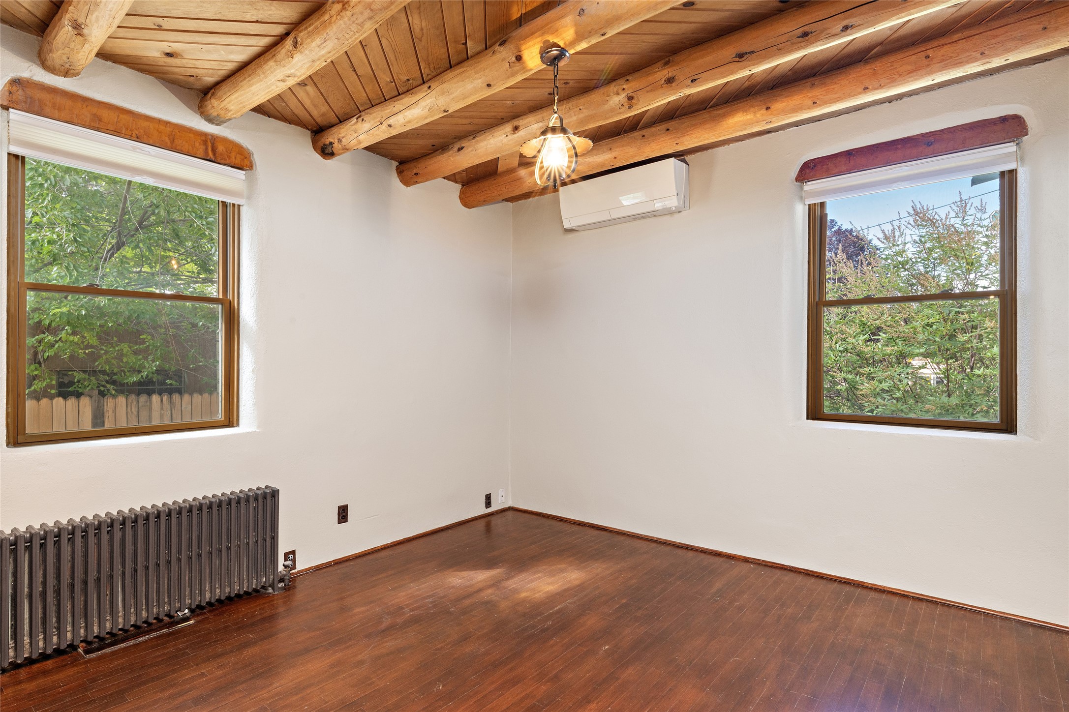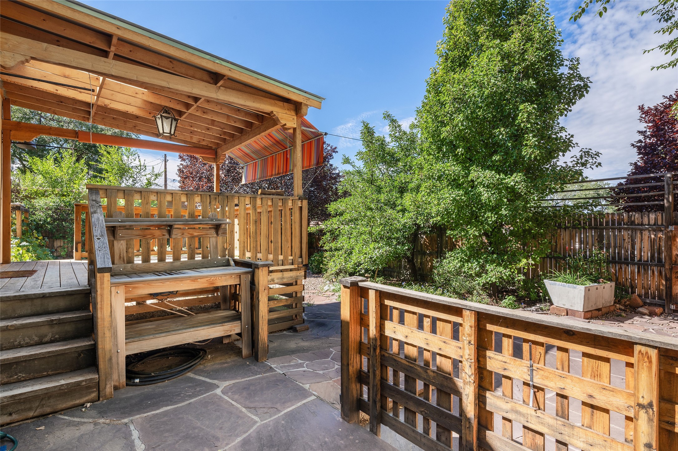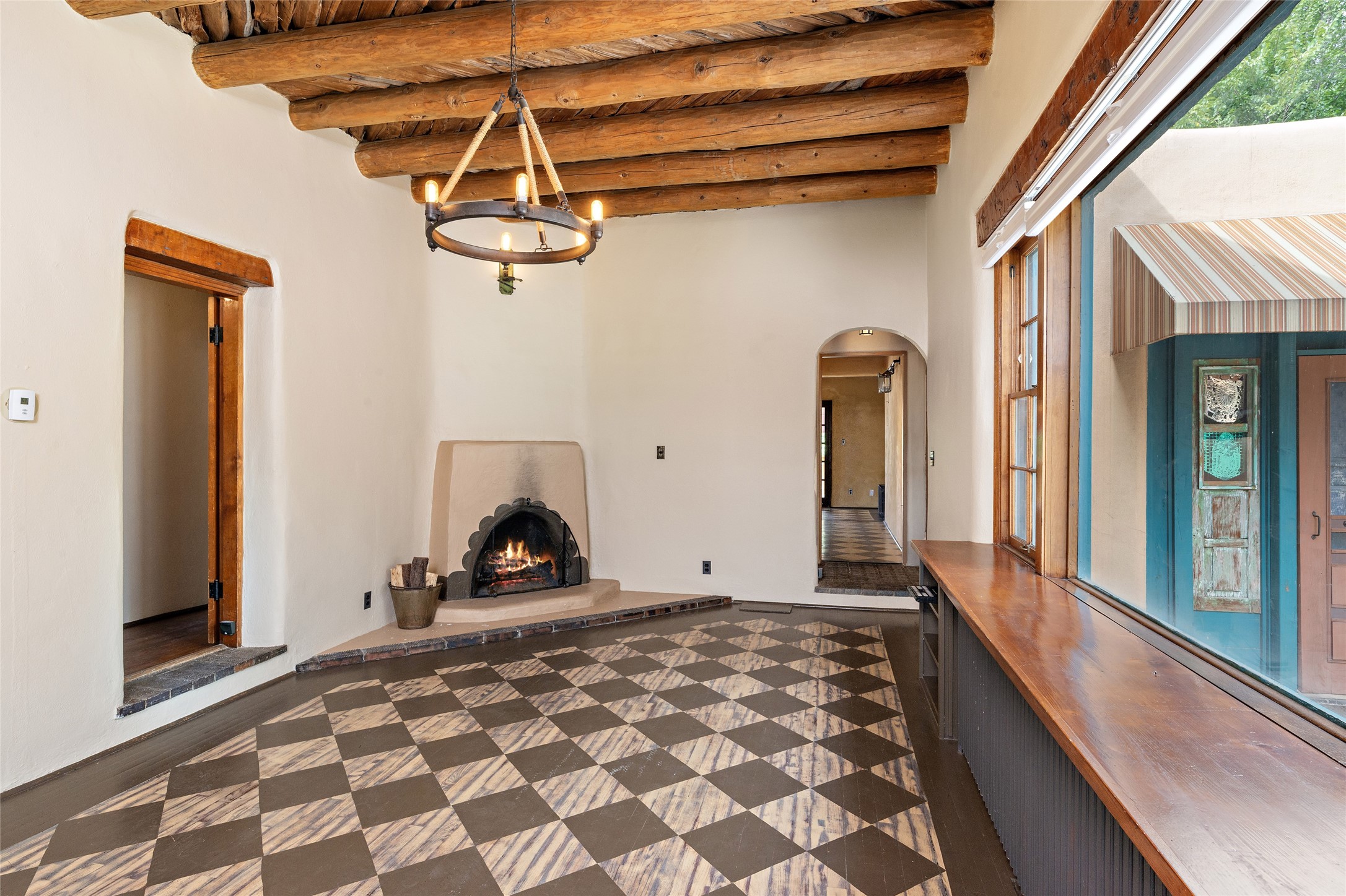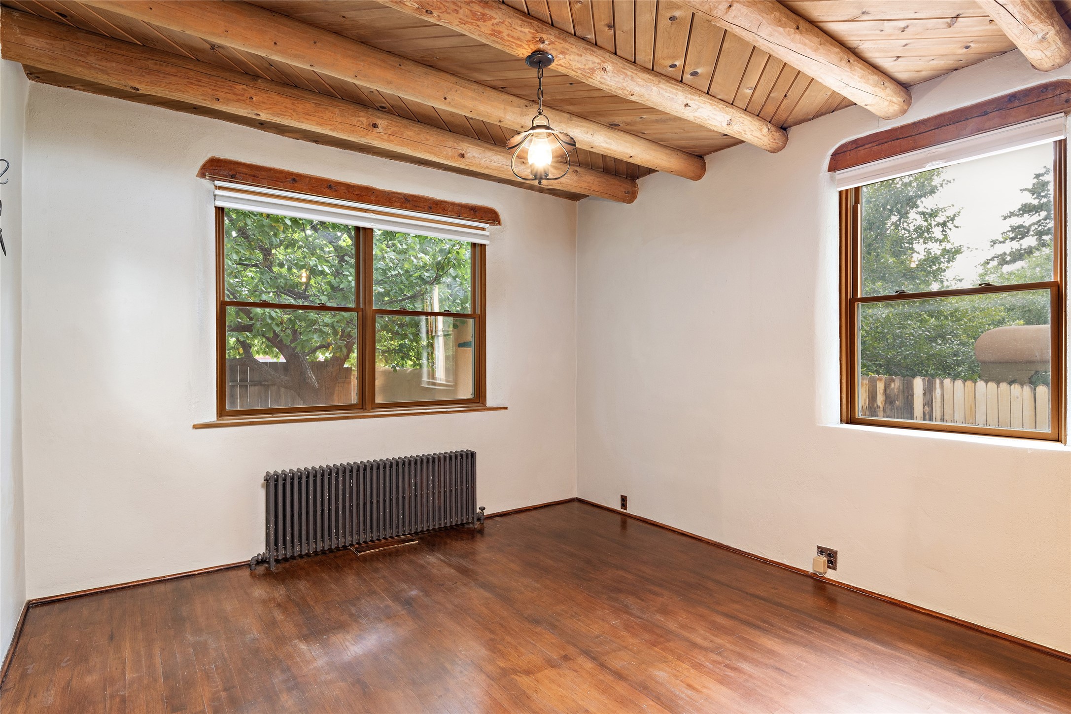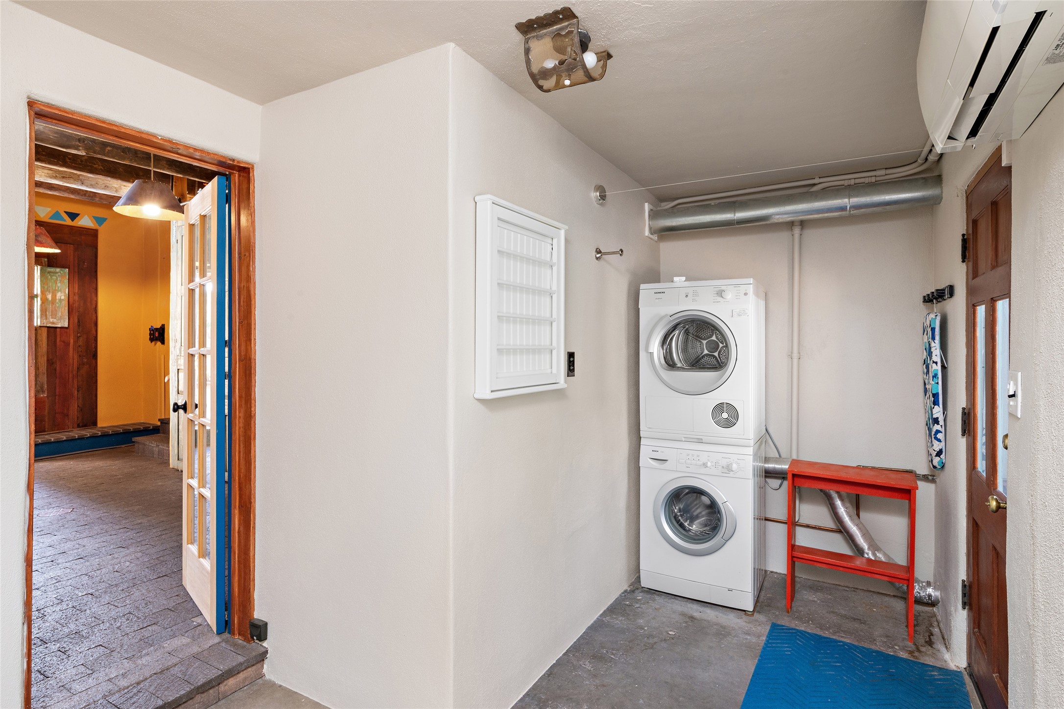 A hop and a skip to Clafoutis, Trader Joe's, Wholefoods around the corner, Santa Fe is on your doorstep. This delightful adobe home built in 1940 is a rare find, it exudes Santa Fe charm with vigas and beautiful, painted, wooden floors. Two of the bedrooms still have traditional cabinetry. The kitchen/dining area was plastered using American Clay, it has painted cabinetry and a genuine vintage Chambers range, just like Georgia O'Keefe's, with French doors leading out to the balcony and a glorious garden which is on drip. The attached garage was converted into a studio with a second bathroom. The studio can be used as a flex room or a third bedroom. The house was updated in 2014 forward, with a new bathroom, new water heater, galvanized pipes were replaced between 2016-2018. In 2020 it was re-stuccoed and a new roof put on with a transferable warranty until 2030. It has mini splits and a Whole House Water Filtration System was added. It has been loved and cared for and kept in good condition. The fireplace is non-functional.