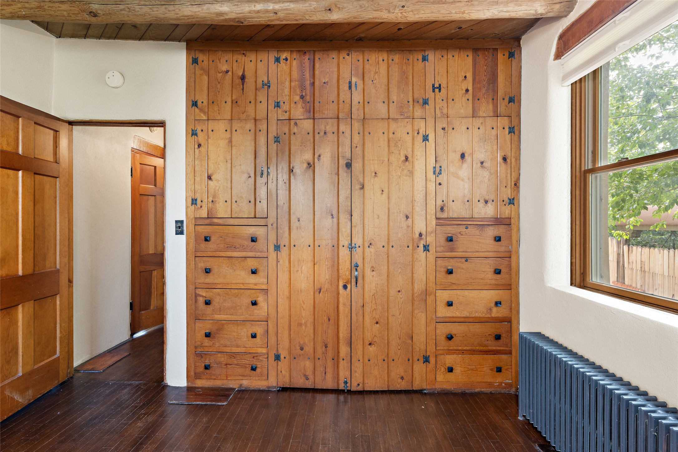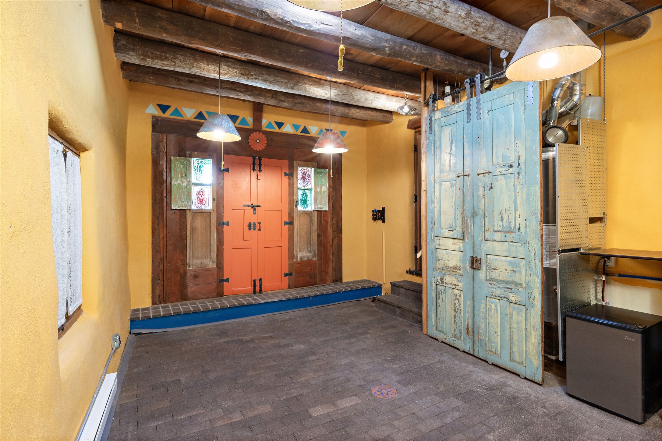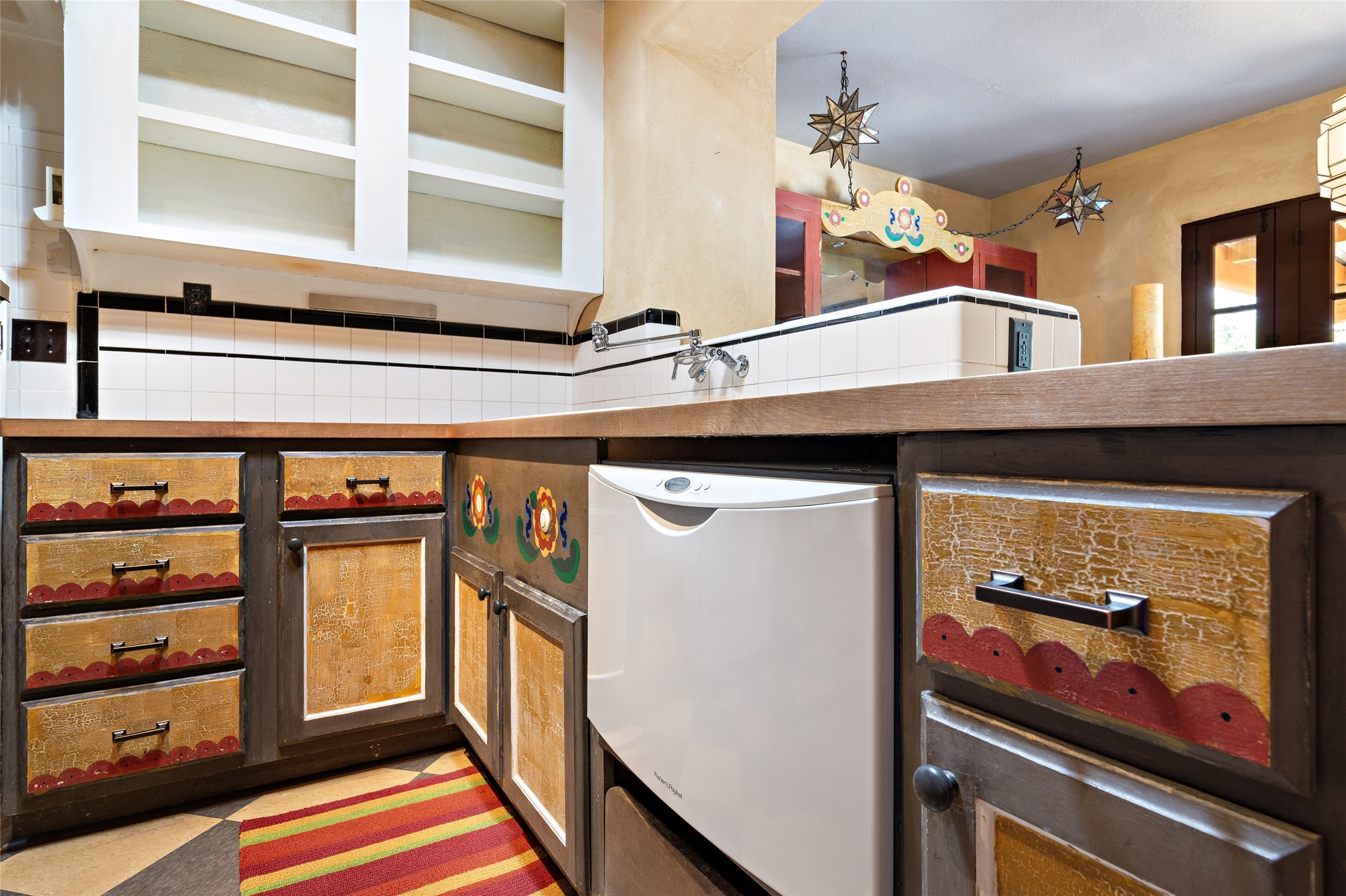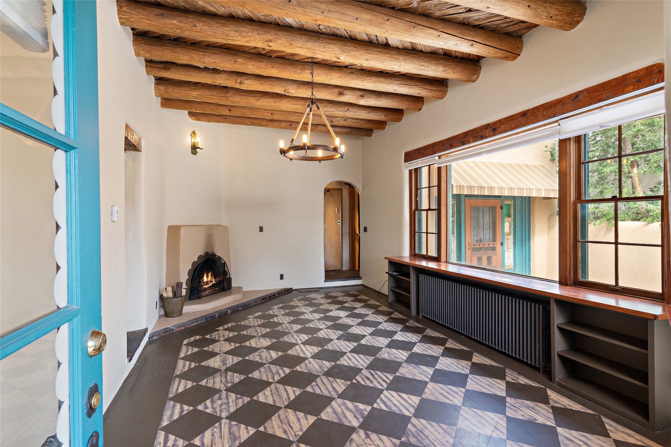 A hop and a skip to Clafoutis, Trader Joe's, Wholefoods around the corner, Santa Fe is on your doorstep. This delightful adobe home built in 1940 is a rare find, it exudes Santa Fe charm with vigas and beautiful, painted, wooden floors. Two of the bedrooms still have traditional cabinetry. The kitchen/dining area was plastered using American Clay, it has painted cabinetry and a genuine vintage Chambers range, just like Georgia O'Keefe's, with French doors leading out to the balcony and a glorious garden which is on drip. The attached garage was converted into a studio with a second bathroom. The studio can be used as a flex room or a third bedroom. The house was updated in 2014 forward, with a new bathroom, new water heater, galvanized pipes were replaced between 2016-2018. In 2020 it was re-stuccoed and a new roof put on with a transferable warranty until 2030. It has mini splits and a Whole House Water Filtration System was added. It has been loved and cared for and kept in good condition. The fireplace is non-functional.