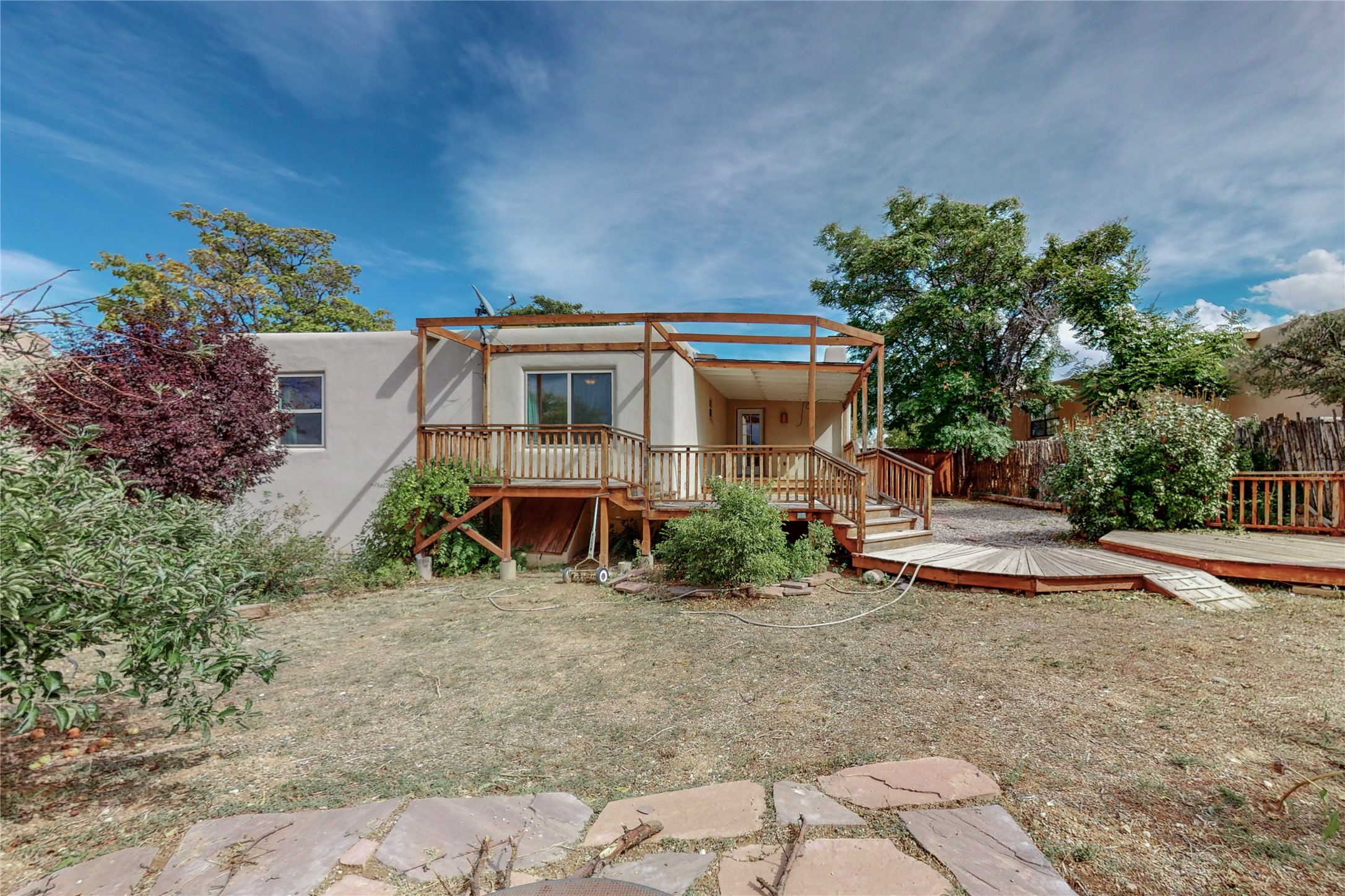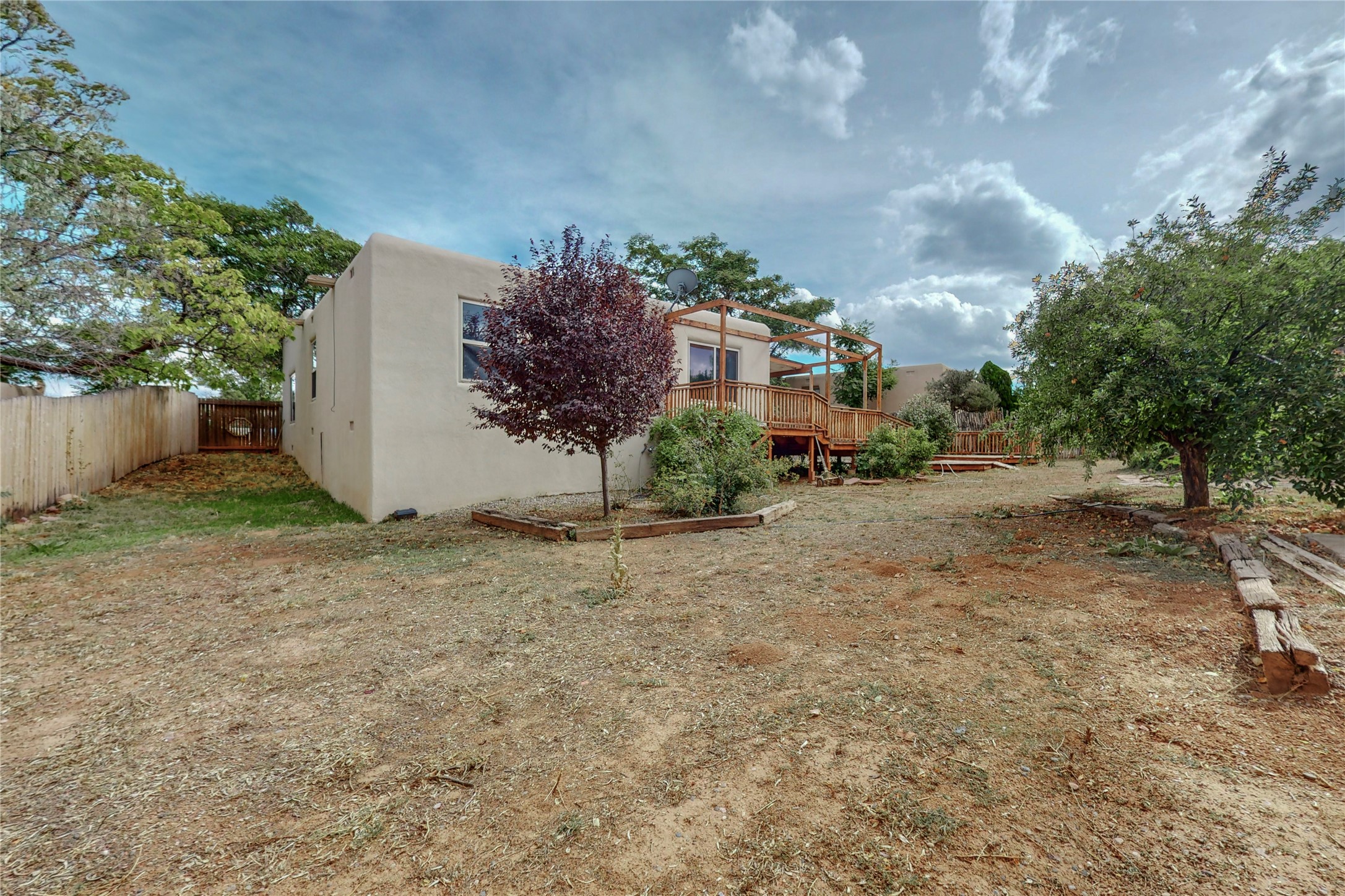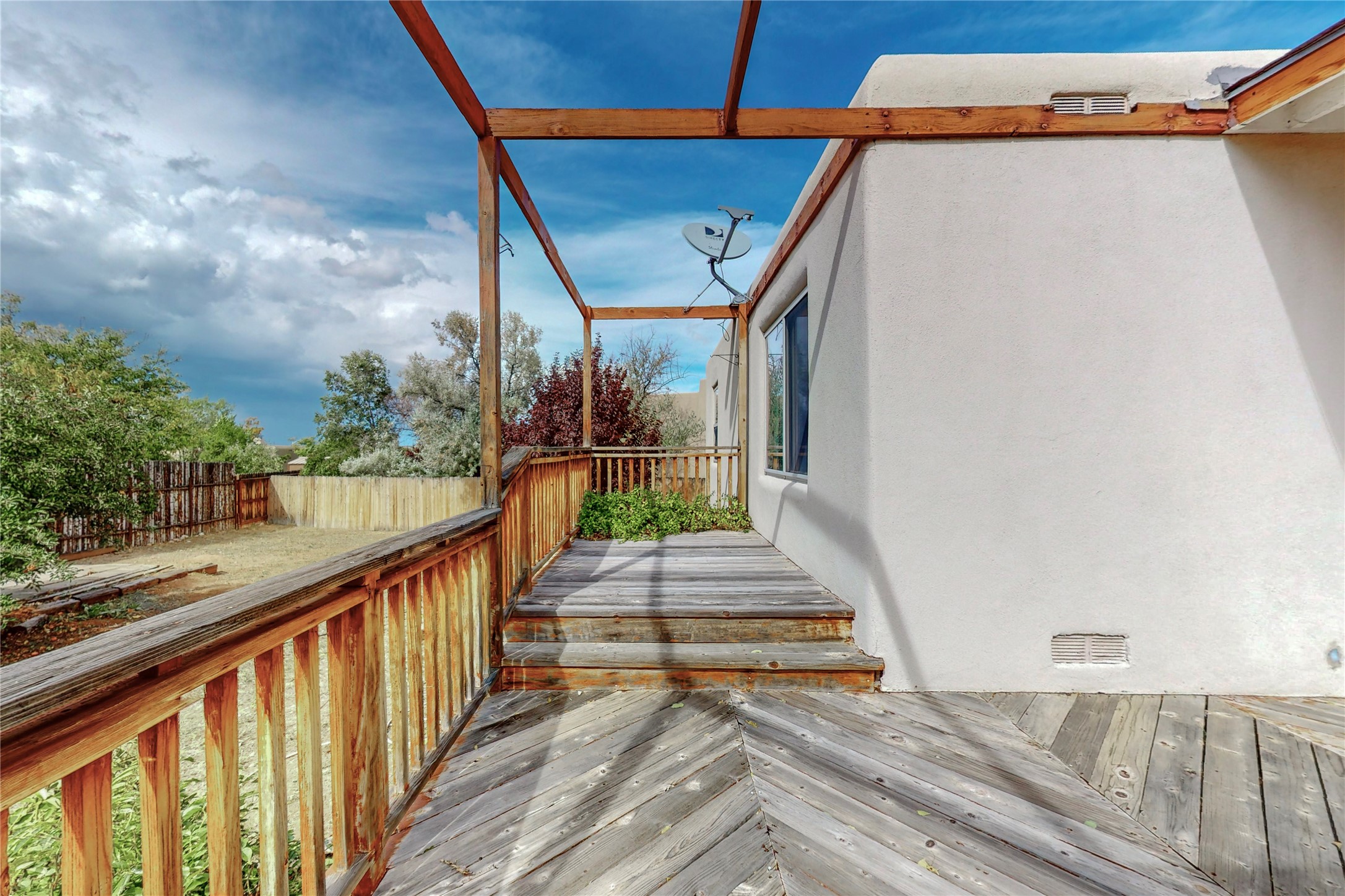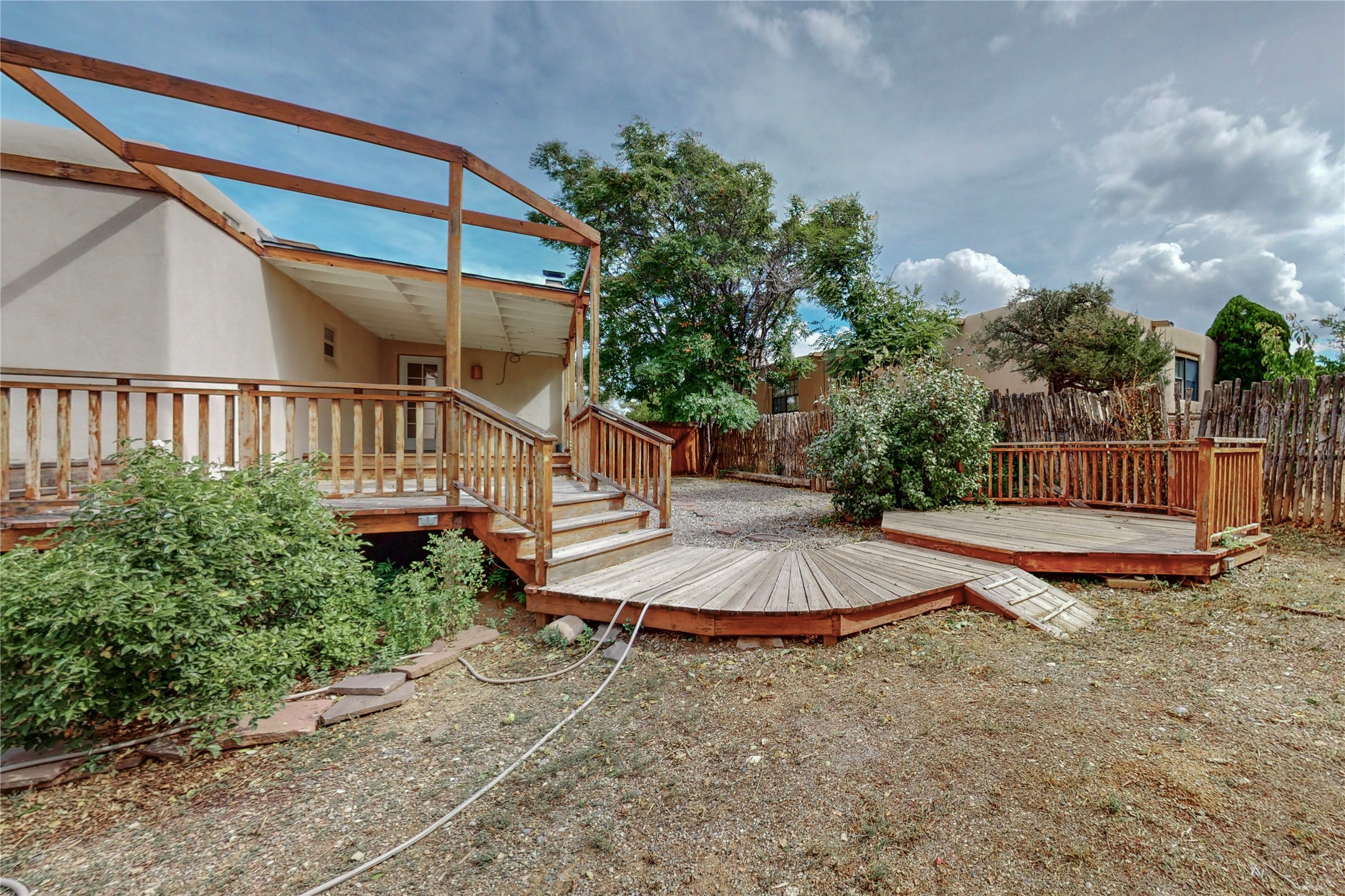 Surprisingly private location in Pueblos de Rodeo, a quiet backwater subdivision of Santa Fe. This lovely light home shaded by tall trees, has three bedrooms, two full baths with tile floors and lots of windows. There is a sunken den area separated from the main living area ideal for quiet meditation or reading. The family room with kiva fireplace for cheery winter nights is open to the kitchen and dining areas flows to an expansive deck and big privately fenced back yard. A large 2 car garage sits back off the road allowing for extra parking. It is conveniently close to recreation centers and lots of shopping areas, parks and trails.