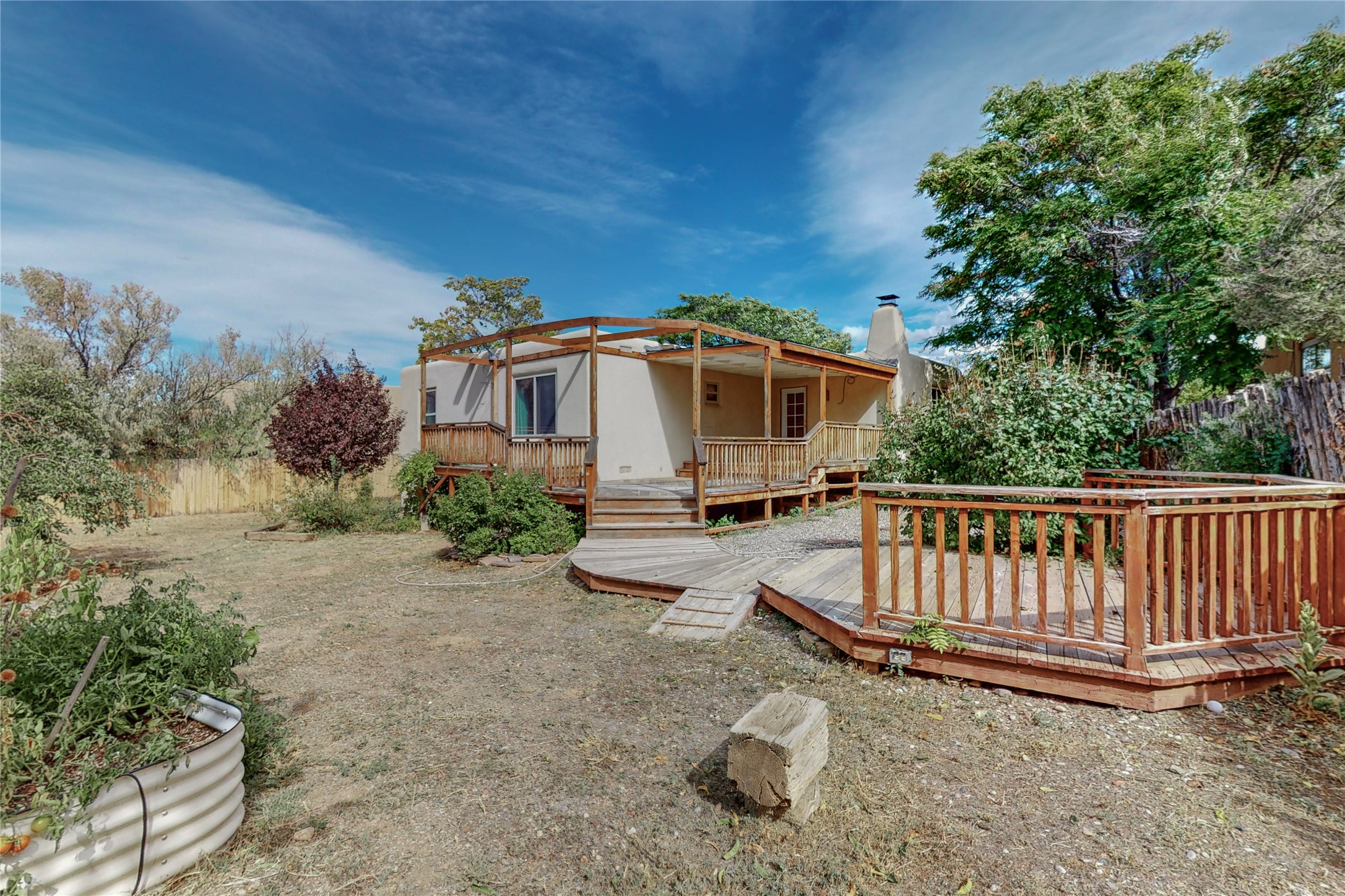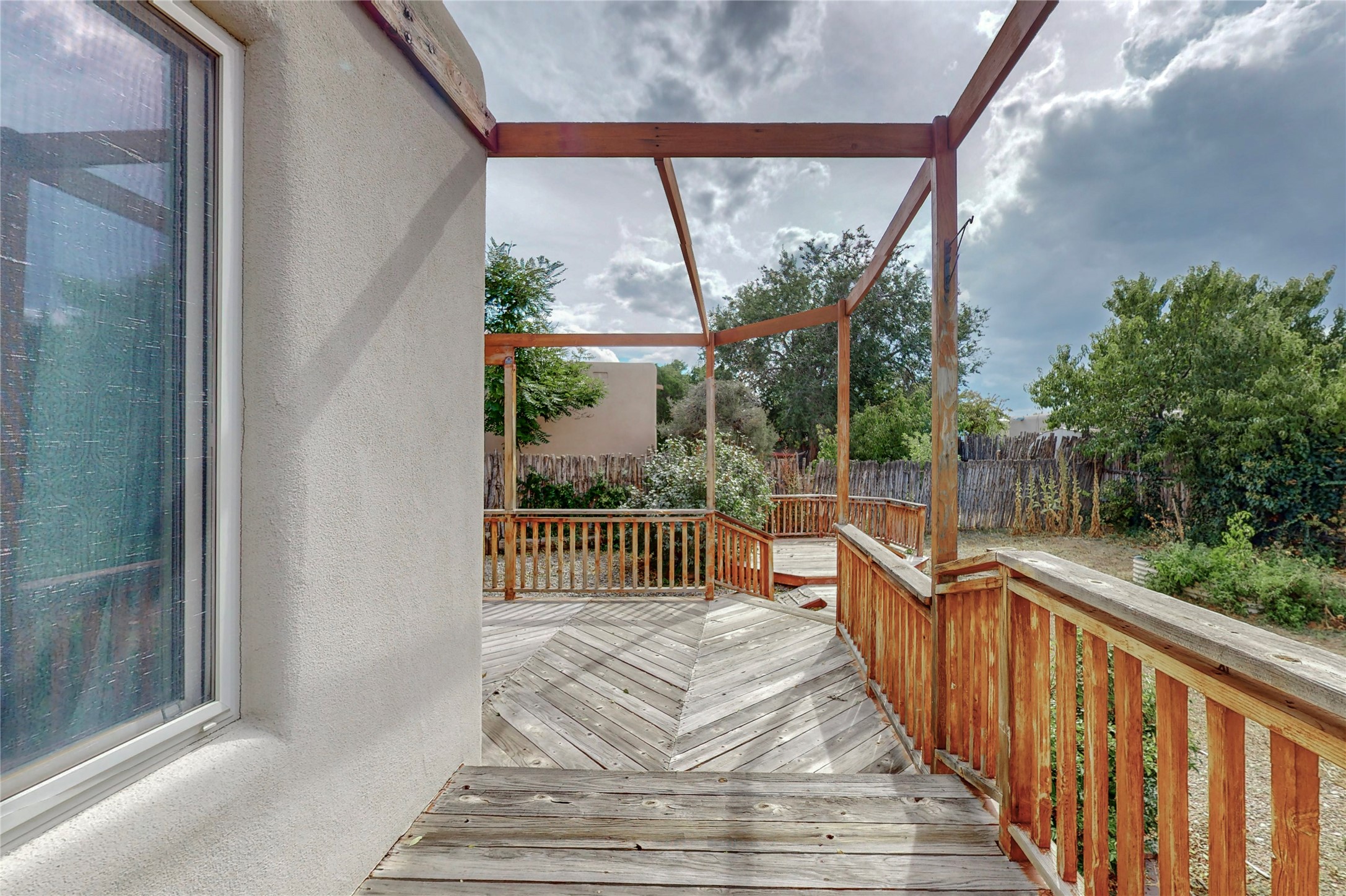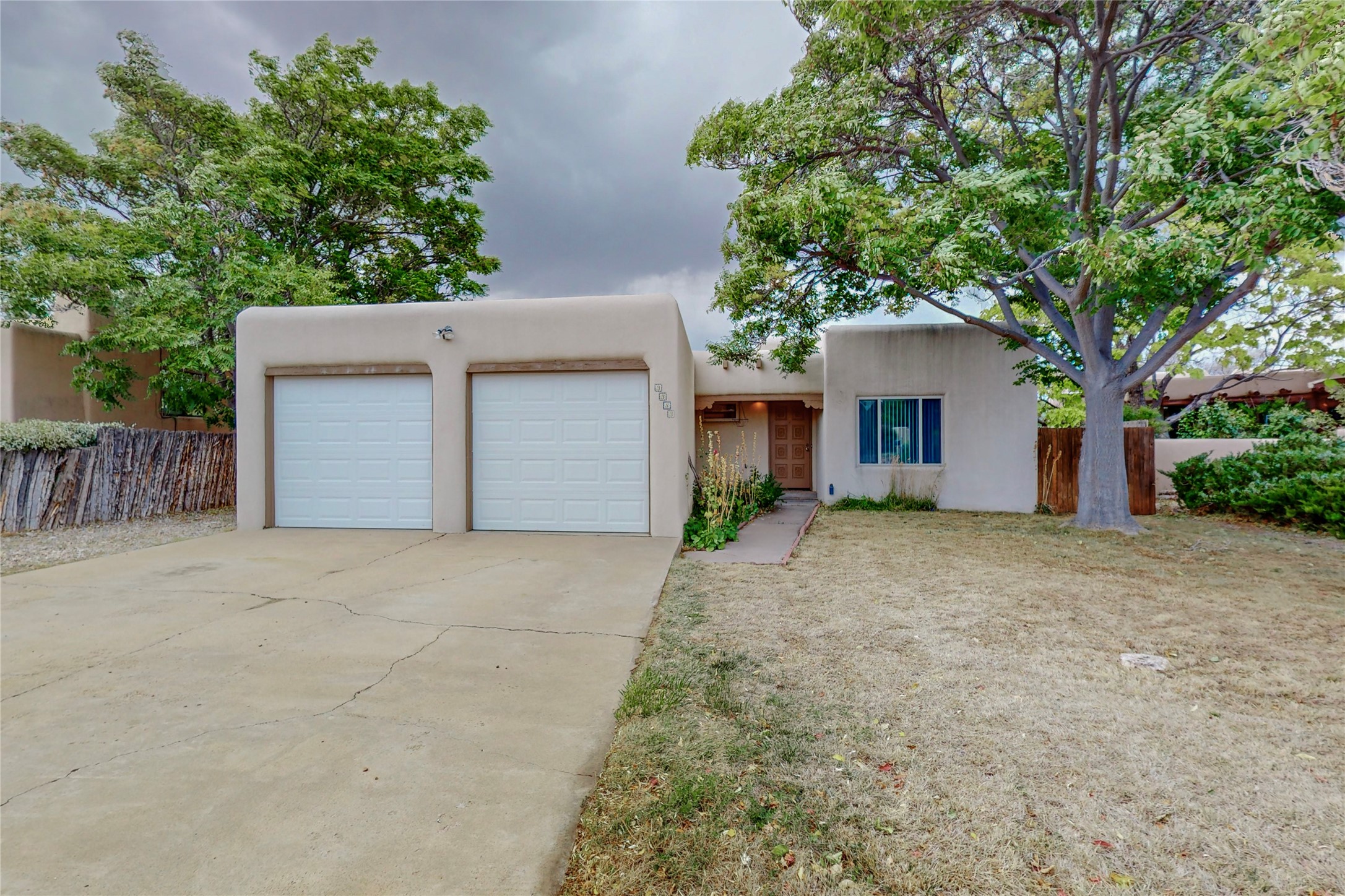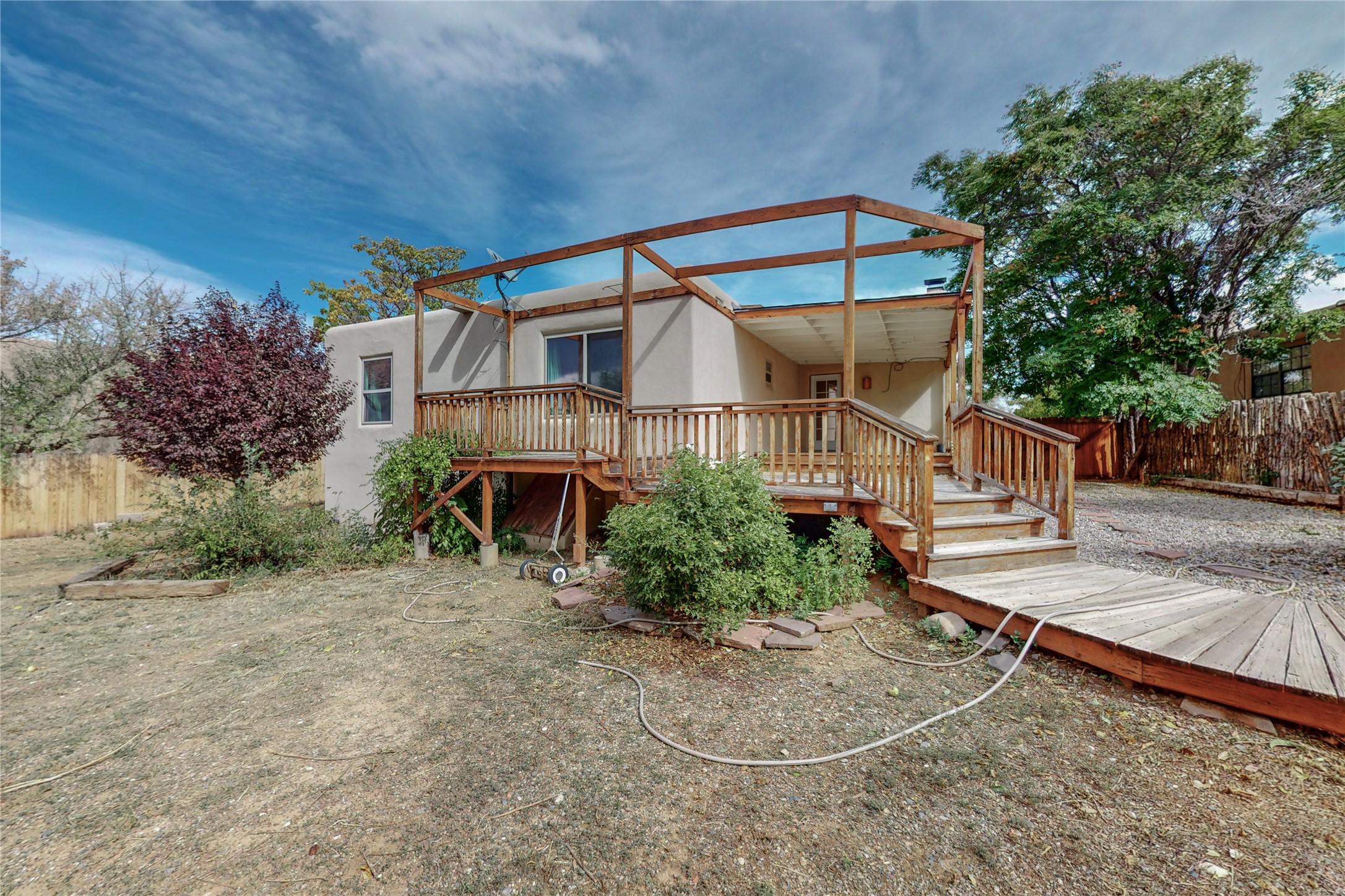 Surprisingly private location in Pueblos de Rodeo, a quiet backwater subdivision of Santa Fe. This lovely light home shaded by tall trees, has three bedrooms, two full baths with tile floors and lots of windows. There is a sunken den area separated from the main living area ideal for quiet meditation or reading. The family room with kiva fireplace for cheery winter nights is open to the kitchen and dining areas flows to an expansive deck and big privately fenced back yard. A large 2 car garage sits back off the road allowing for extra parking. It is conveniently close to recreation centers and lots of shopping areas, parks and trails.