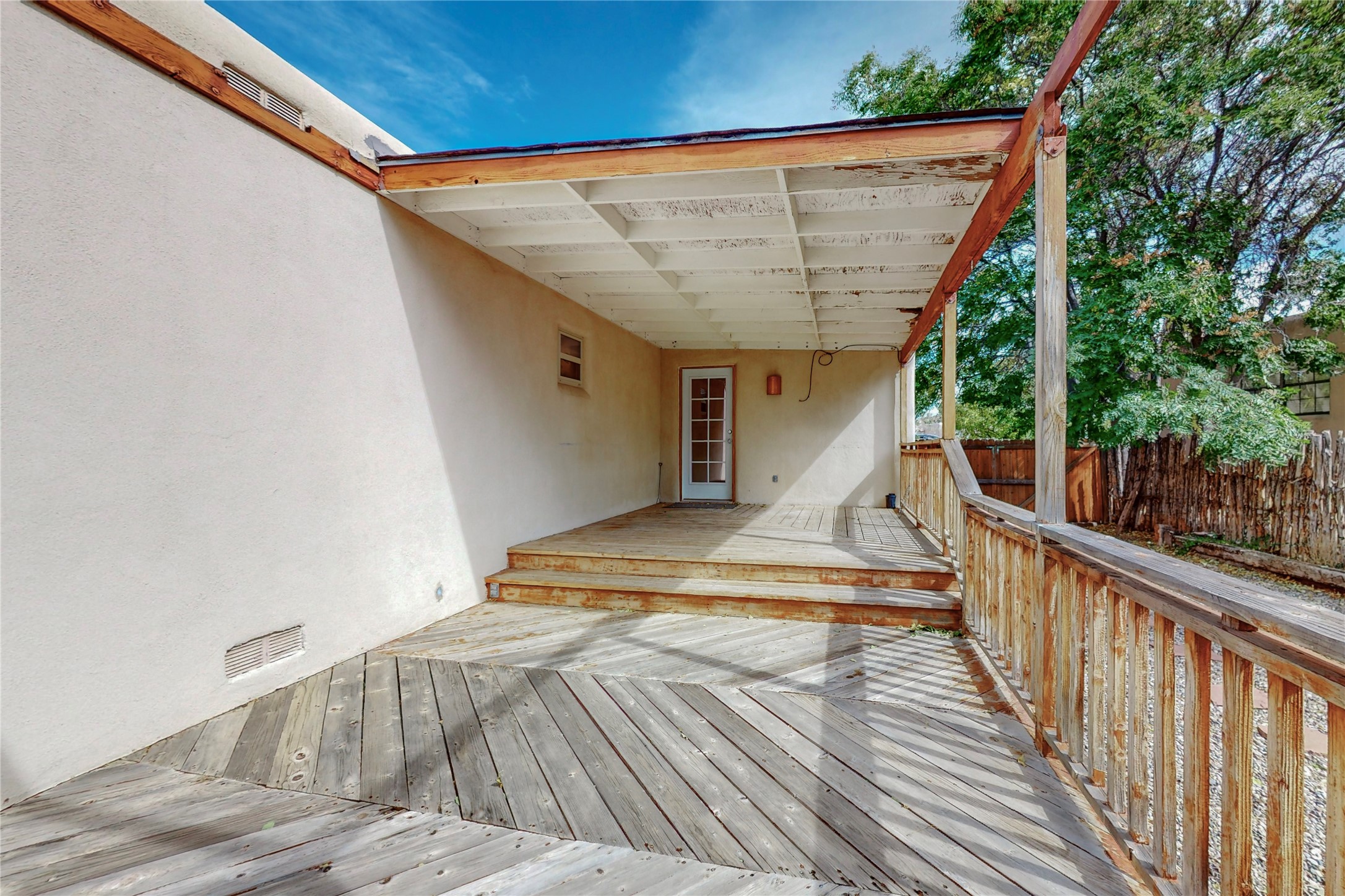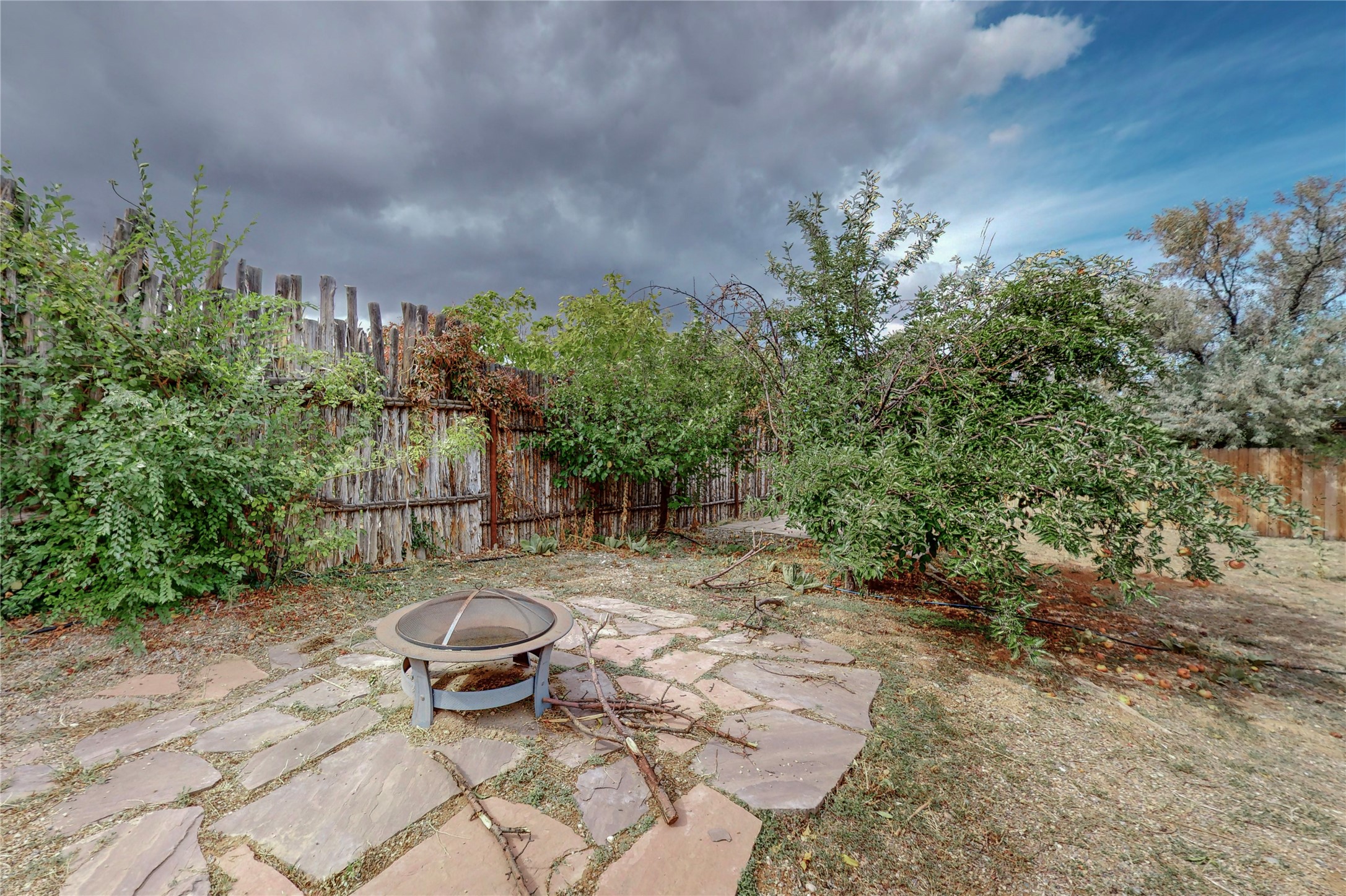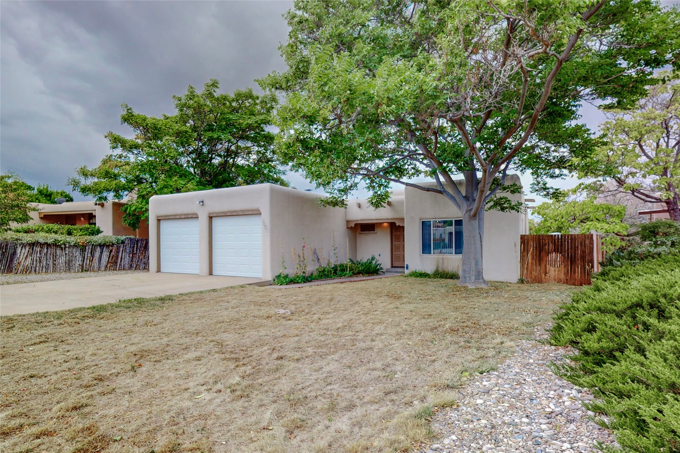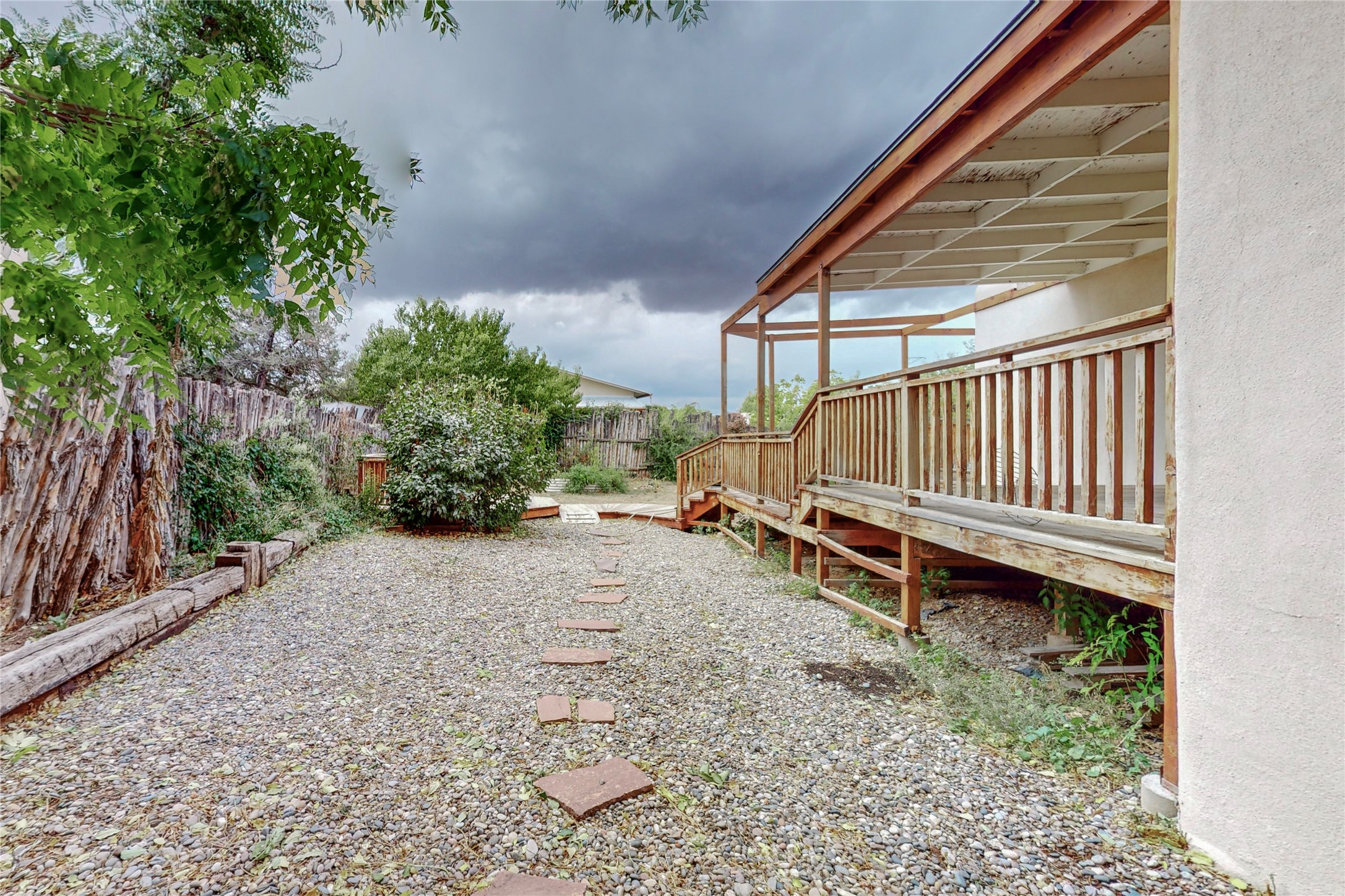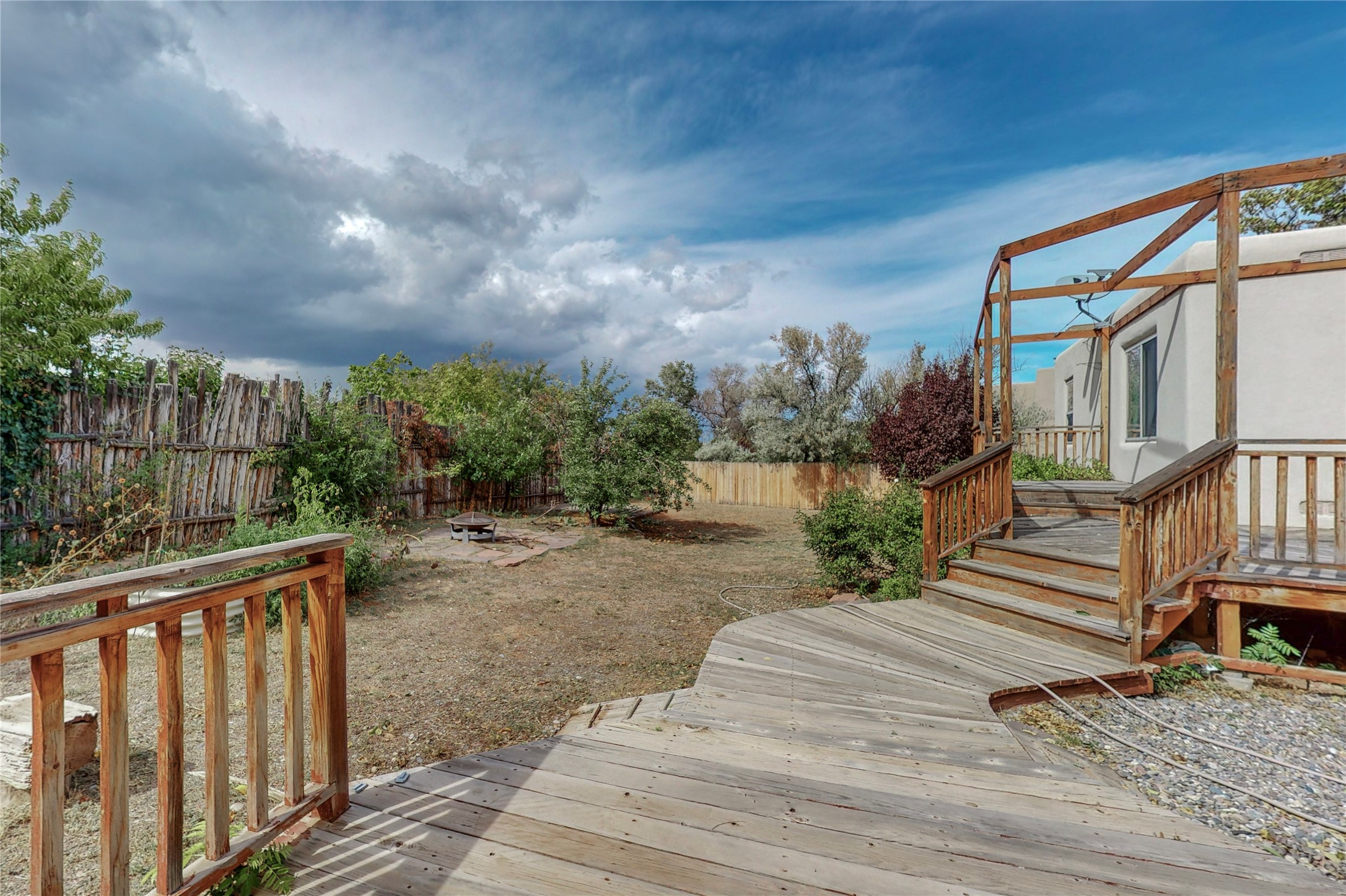Surprisingly private location in Pueblos de Rodeo, a quiet backwater subdivision of Santa Fe. This lovely light home shaded by tall trees, has three bedrooms, two full baths with tile floors and lots of windows. There is a sunken den area separated from the main living area ideal for quiet meditation or reading. The family room with kiva fireplace for cheery winter nights is open to the kitchen and dining areas flows to an expansive deck and big privately fenced back yard. A large 2 car garage sits back off the road allowing for extra parking. It is conveniently close to recreation centers and lots of shopping areas, parks and trails.