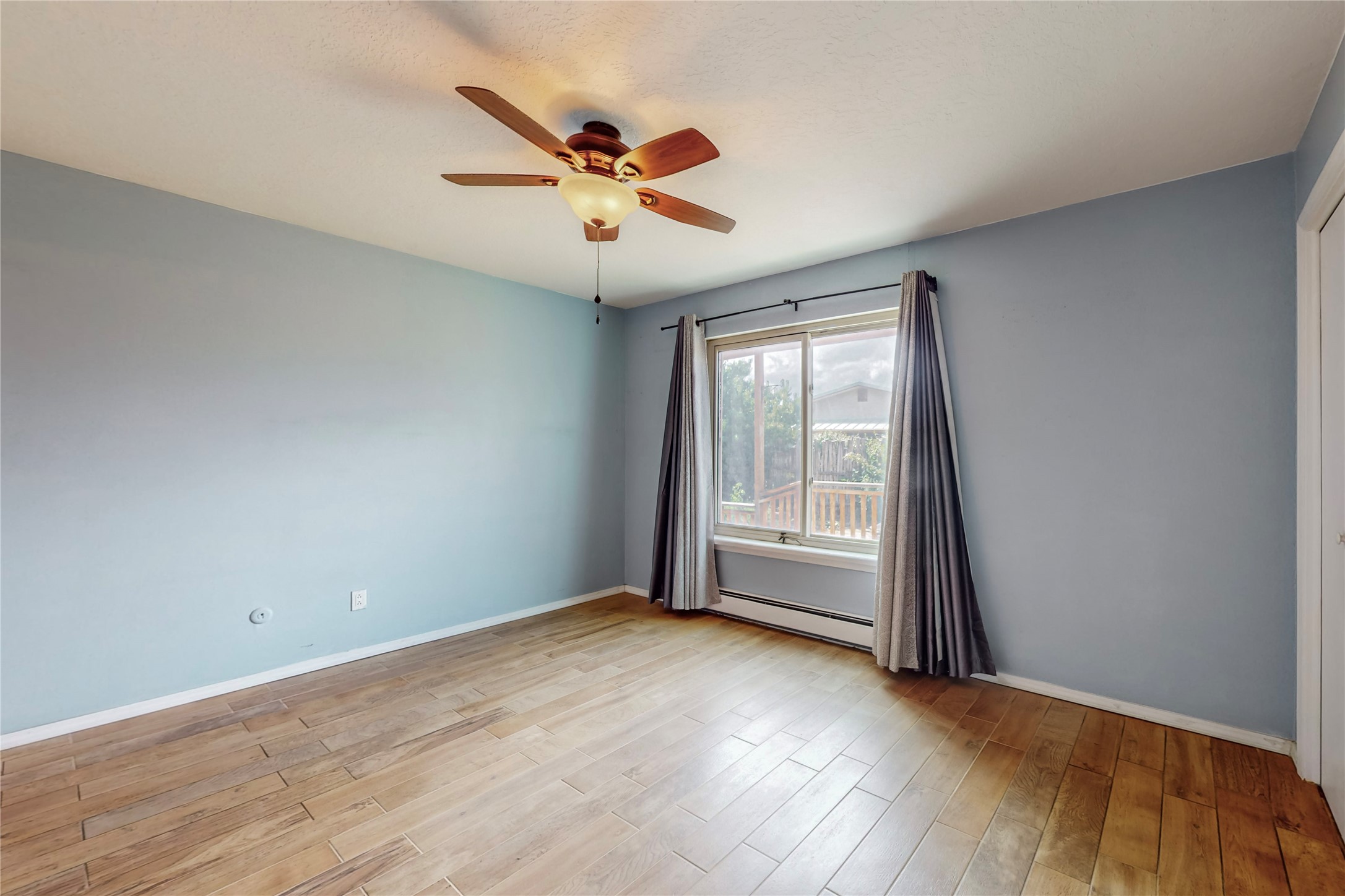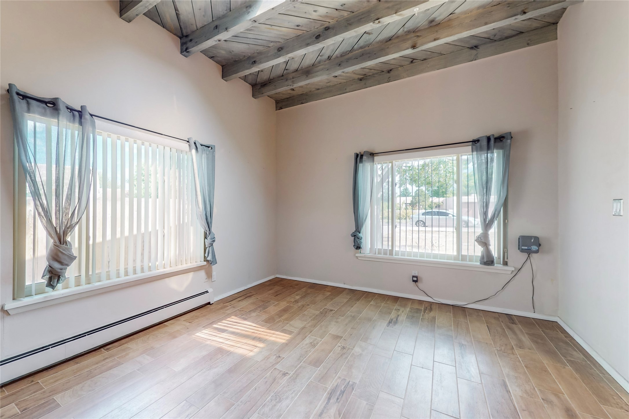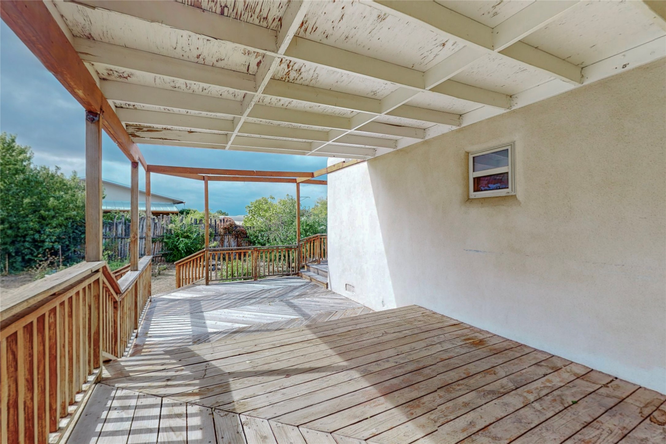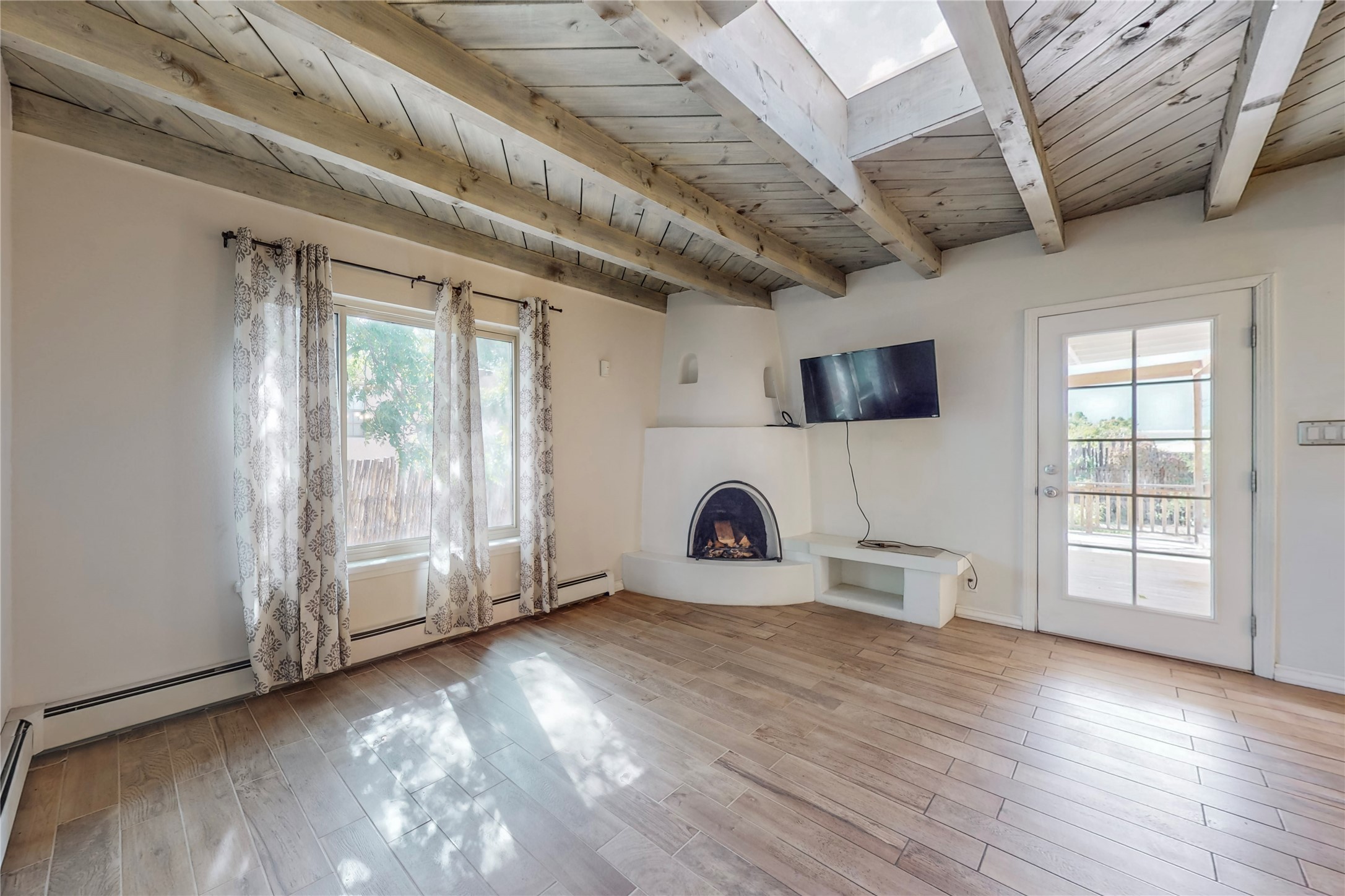Surprisingly private location in Pueblos de Rodeo, a quiet backwater subdivision of Santa Fe. This lovely light home shaded by tall trees, has three bedrooms, two full baths with tile floors and lots of windows. There is a sunken den area separated from the main living area ideal for quiet meditation or reading. The family room with kiva fireplace for cheery winter nights is open to the kitchen and dining areas flows to an expansive deck and big privately fenced back yard. A large 2 car garage sits back off the road allowing for extra parking. It is conveniently close to recreation centers and lots of shopping areas, parks and trails.