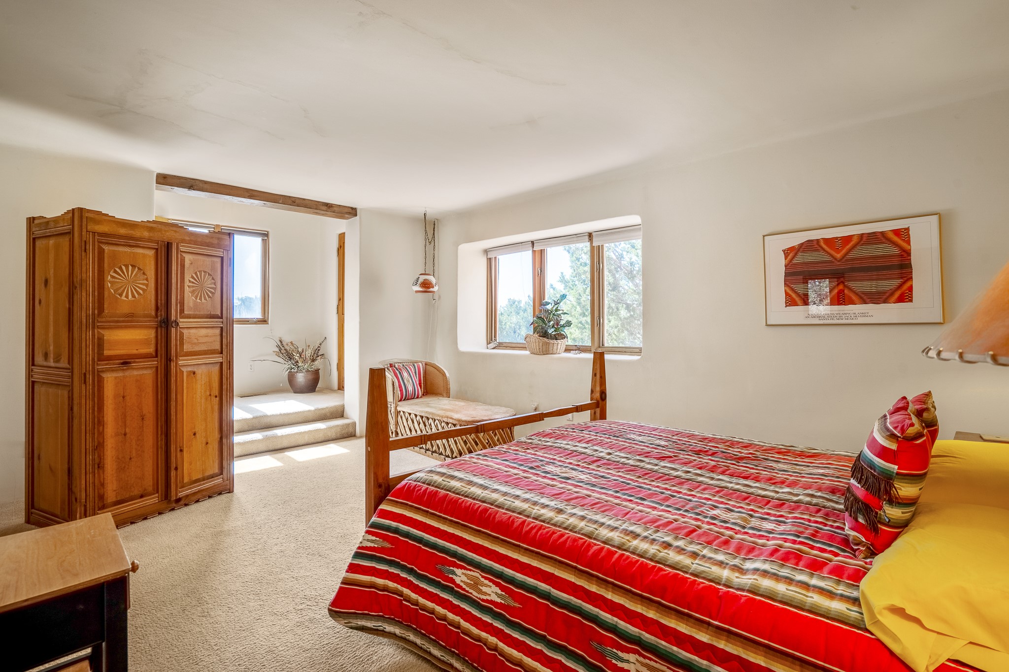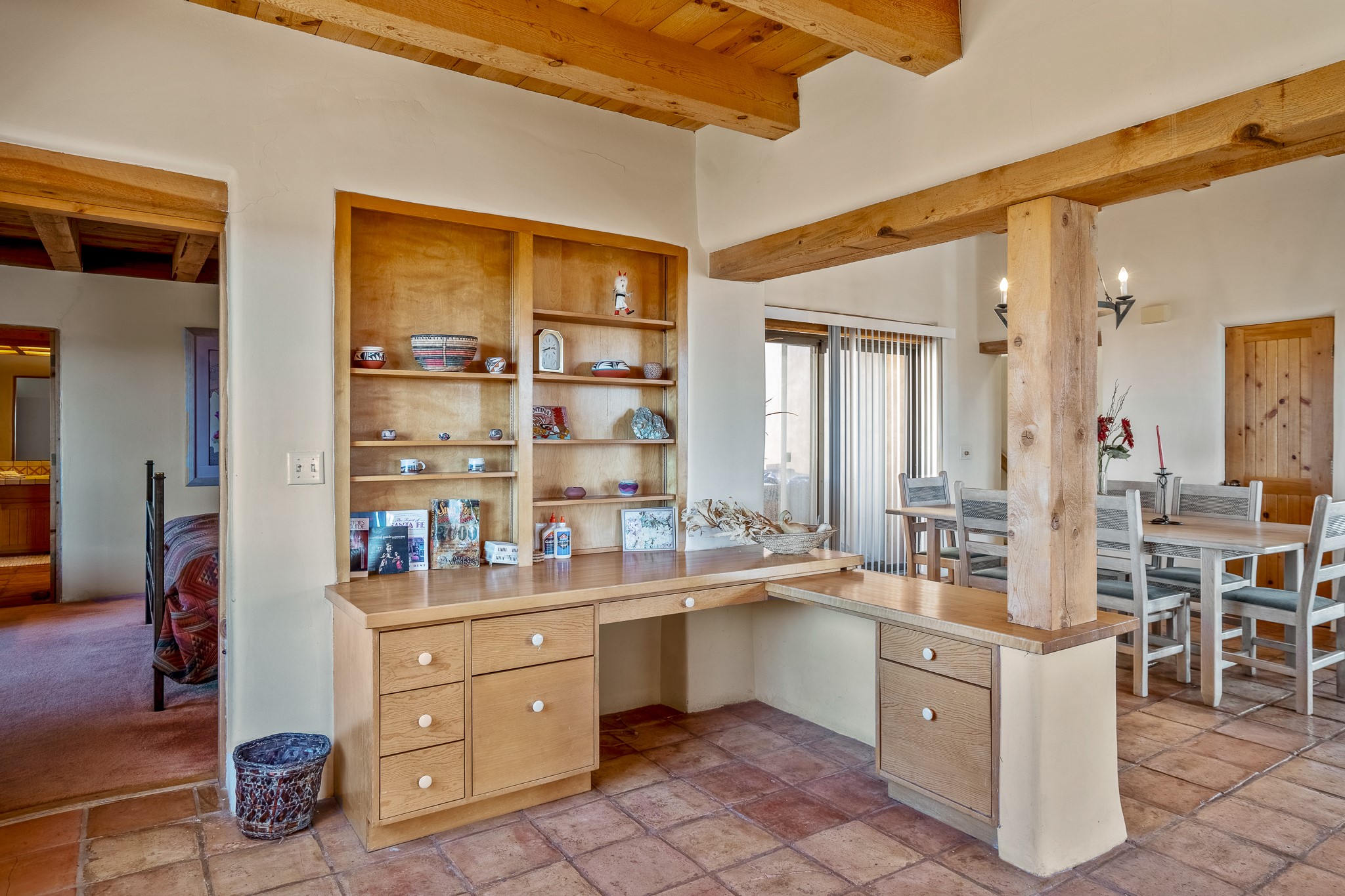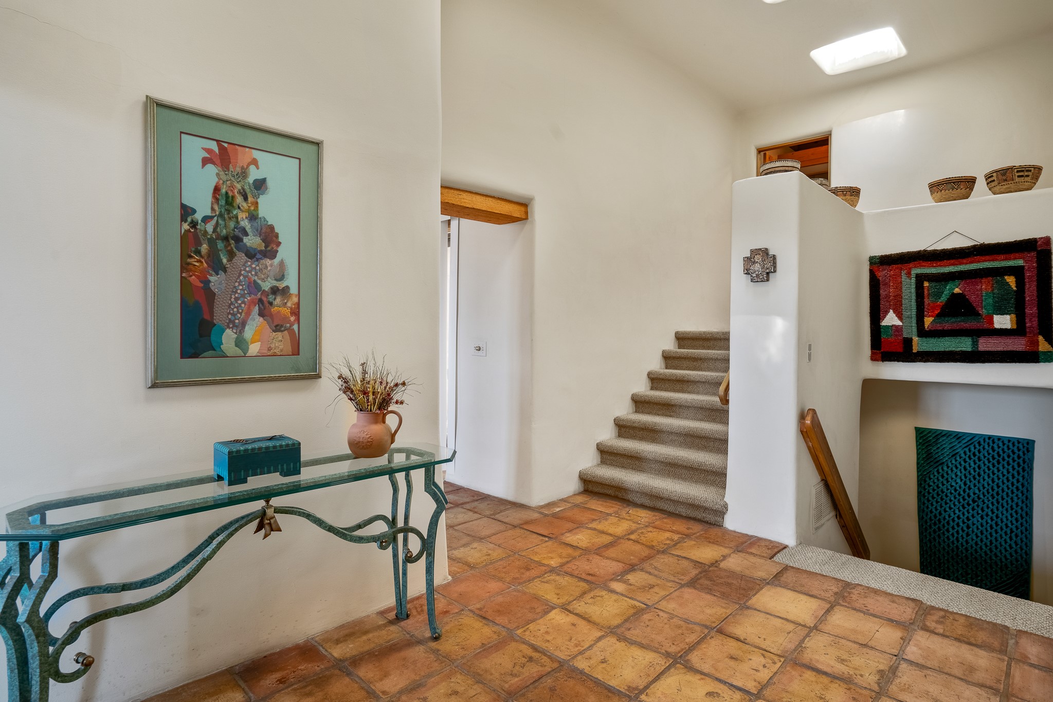 Just minutes from the plaza, this spacious home offers breathtaking views while providing unsurpassed comfort. High beamed ceilings and Saltillo tile floors, accented by abundant sunlight provide you with the warmth of the rich Santa Fe Culture. Over 3,100 square feet of floor space feature open living space on the main level with additional rooms, bathroom and den/play area for kids or entertaining guests. Two decks, one with a private courtyard and hot tub and the other offering fantastic views of the Sangre de Cristo mountains, expand upon the awe-inspiring living experience this condo offers. With a two-car garage, central A/C and heating, manicured grounds, and gated access, this property is an incredible opportunity for the discerning buyer.