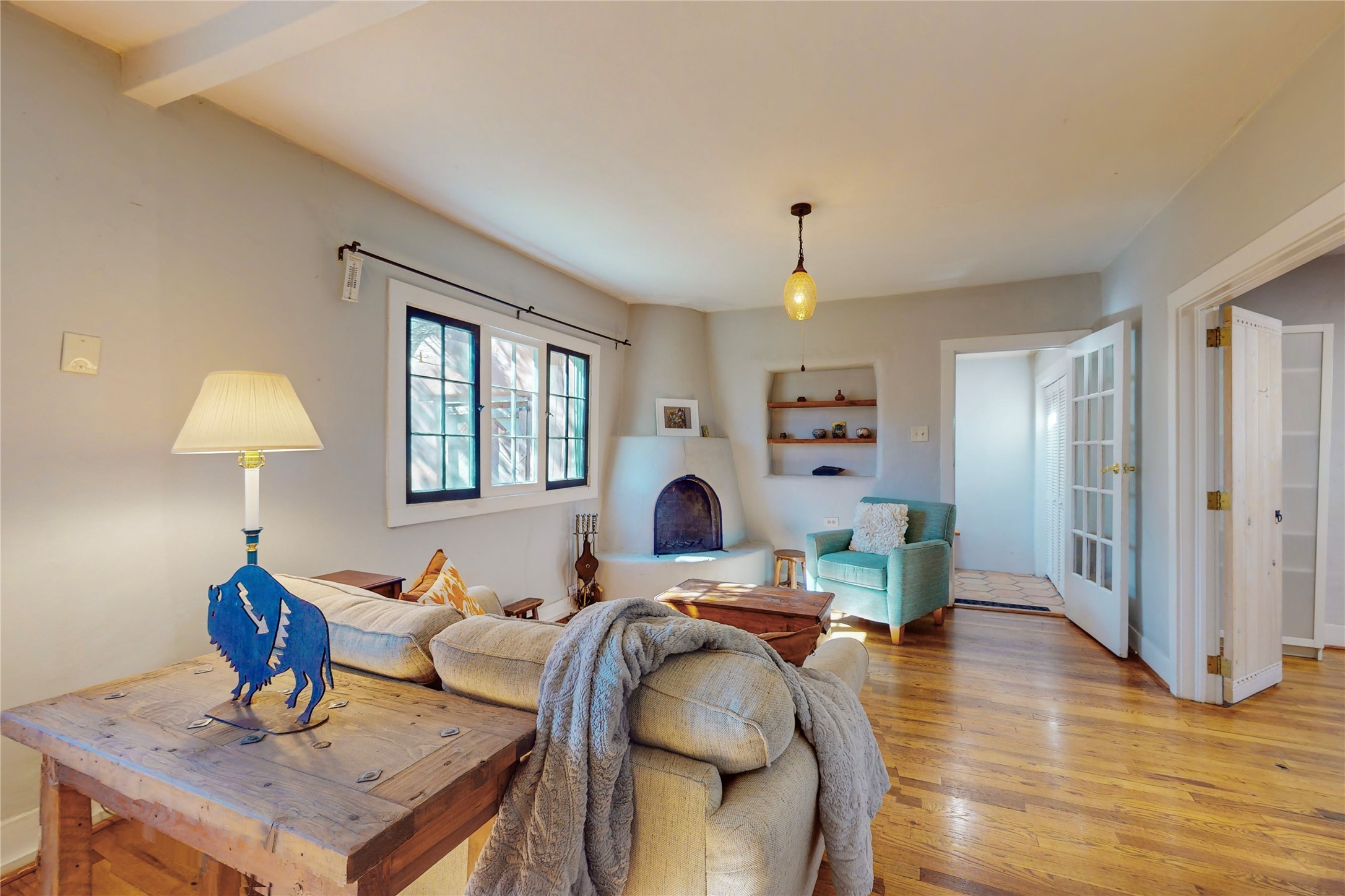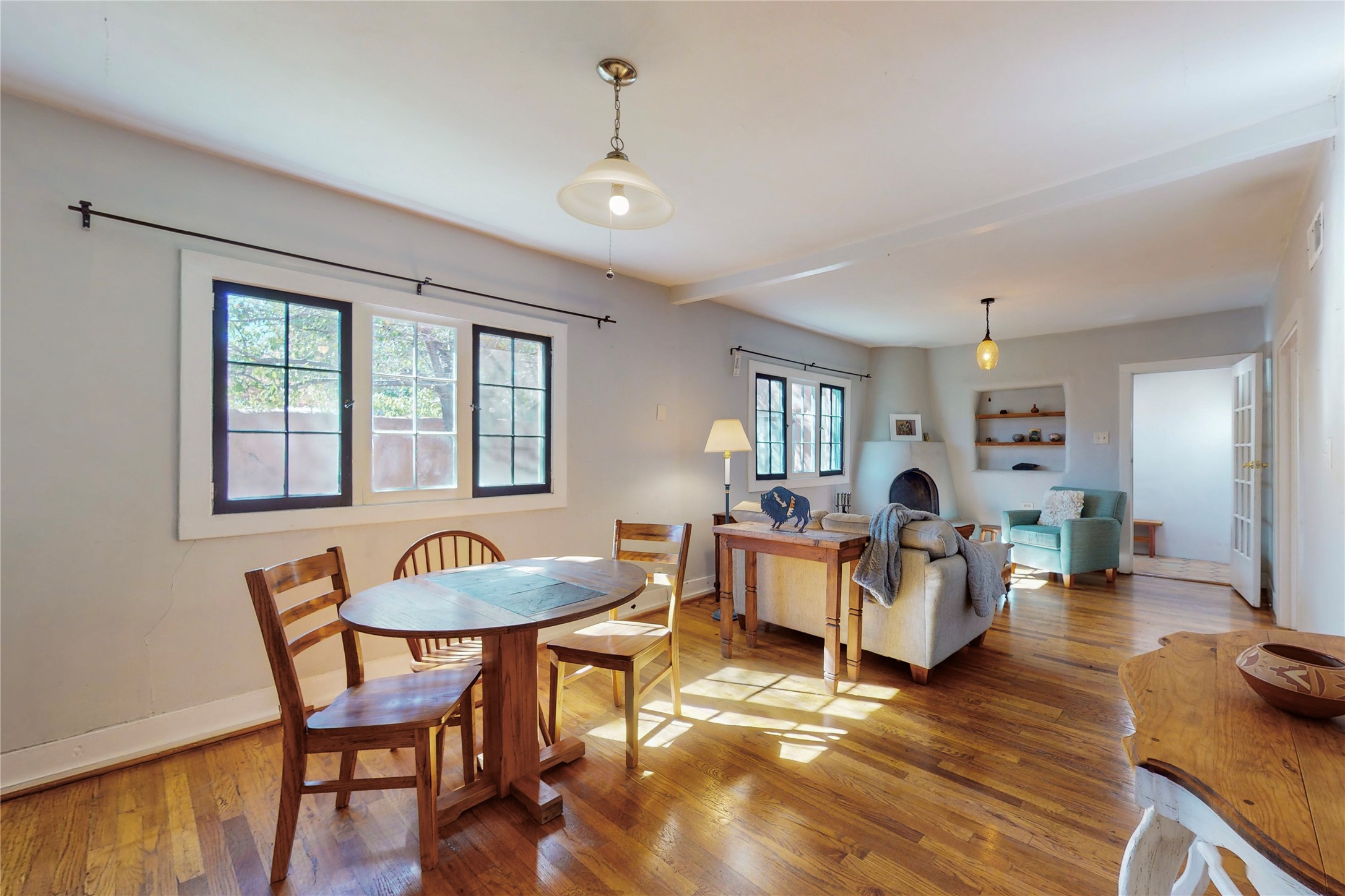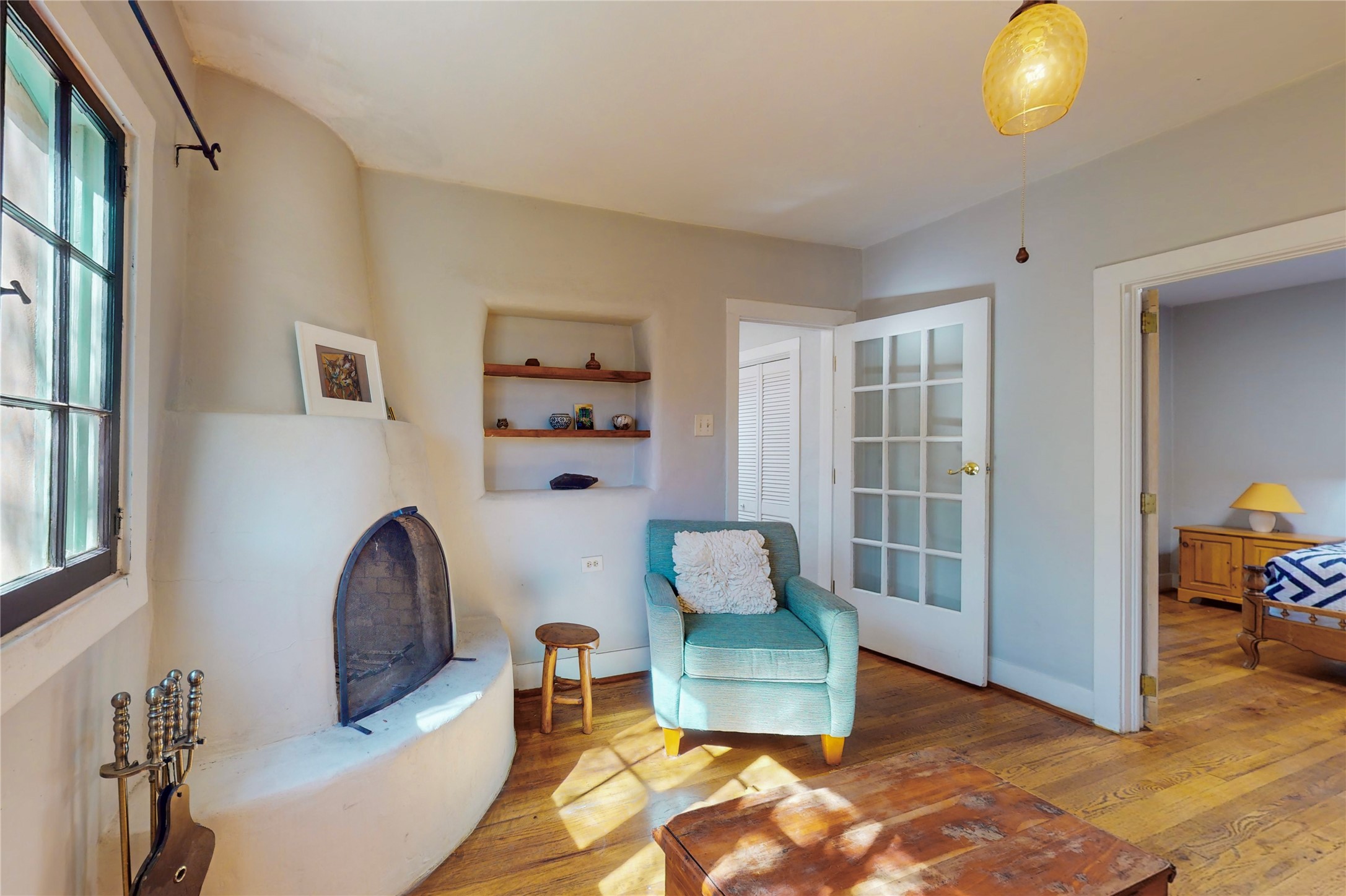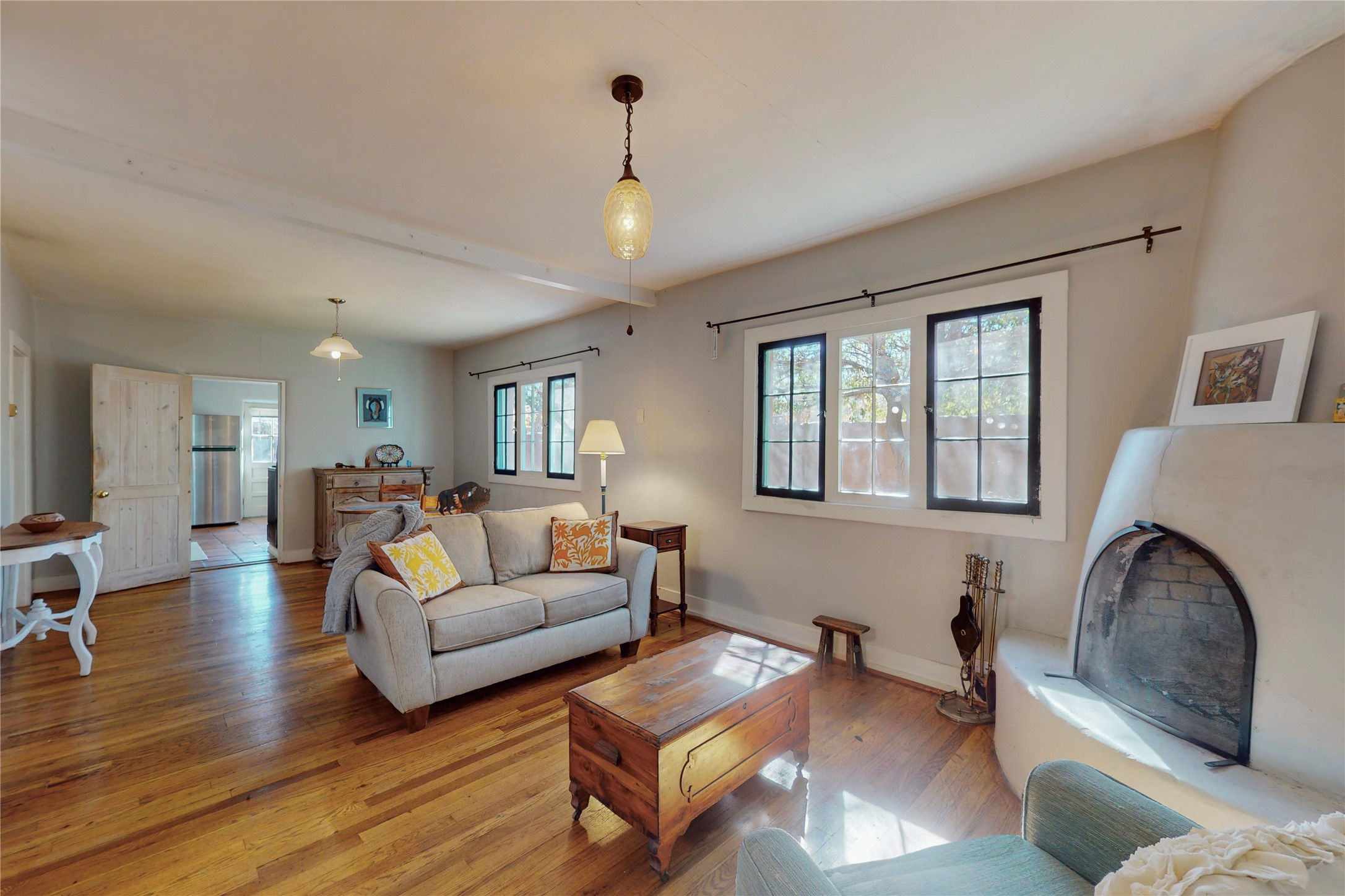 Nestled in Santa Fe's desirable South Capitol area, this 1940's bungalow captures the essence of Santa Fe living. With 1,433 square feet of space, original hardwood floors, and glass pane windows and doors, this home exudes historical charm. The stainless kitchen with a gas stove adds modern comfort while preserving its classic character. Two Kiva fireplaces, one in the primary bedroom with an ensuite bath, offer a cozy retreat. Two additional rooms and a guest bath ensure ample space for your needs. From the front of the house, you wouldn't realize just how expansive the backyard is. It's a hidden gem, offering so much room for your outdoor activities and landscaping dreams. While some updates are needed, this house presents an exceptional opportunity for expansion without sacrificing its historical allure. Tucked away within an enclave, it offers a private oasis in this central locale. Don't let this unique opportunity to shape your dream Santa Fe home, complete with these charming features and a huge backyard, pass you by. Your ideal living space awaits.