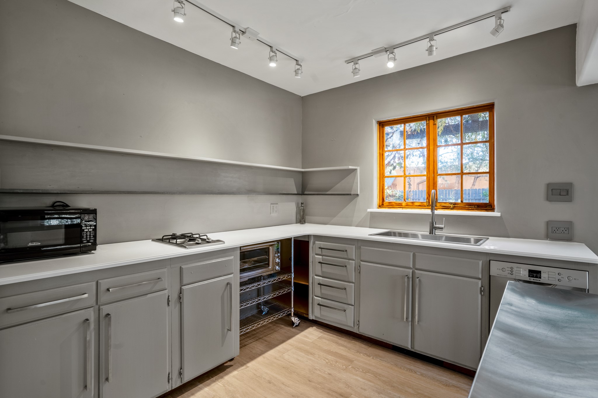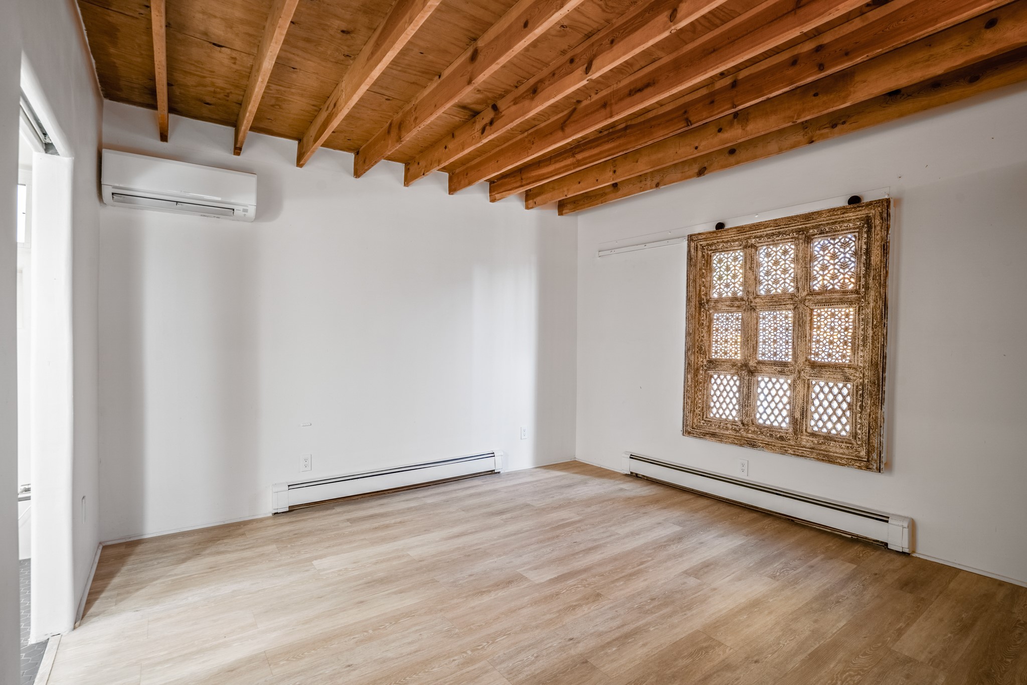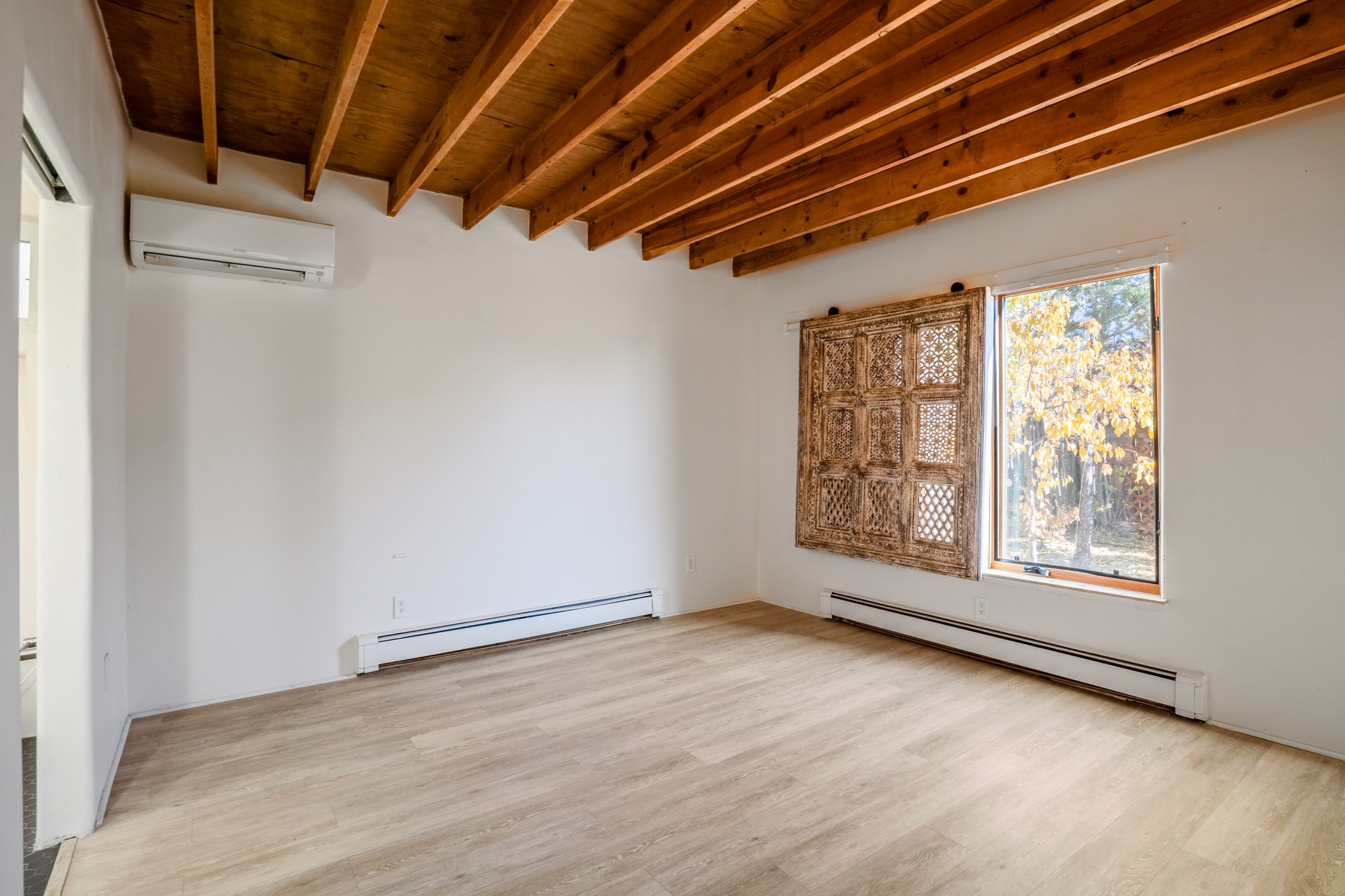 Step through the gate of this magical garden and discover a whimsical and comfortable home just minutes from town. This 2 bedroom, 2 bathroom home offers a great layout... with a living, dining and kitchen open floor plan, a kiva fireplace, and two bedrooms, one with a mini-split and a remodeled ensuite bath. The kitchen showcases updated cabinets, countertops, and new appliances. A pergola covered with mature Wisteria wraps around the front and side of the home overlooking the beautiful gardens. The property has an enclosed front courtyard, a drip irrigation system a storage shed and a driveway with a designated parking spot. Conveniently located near the Santa Fe River walking trail, a grocery store and shopping. Schedule your showing to see this great investment property or primary residence.