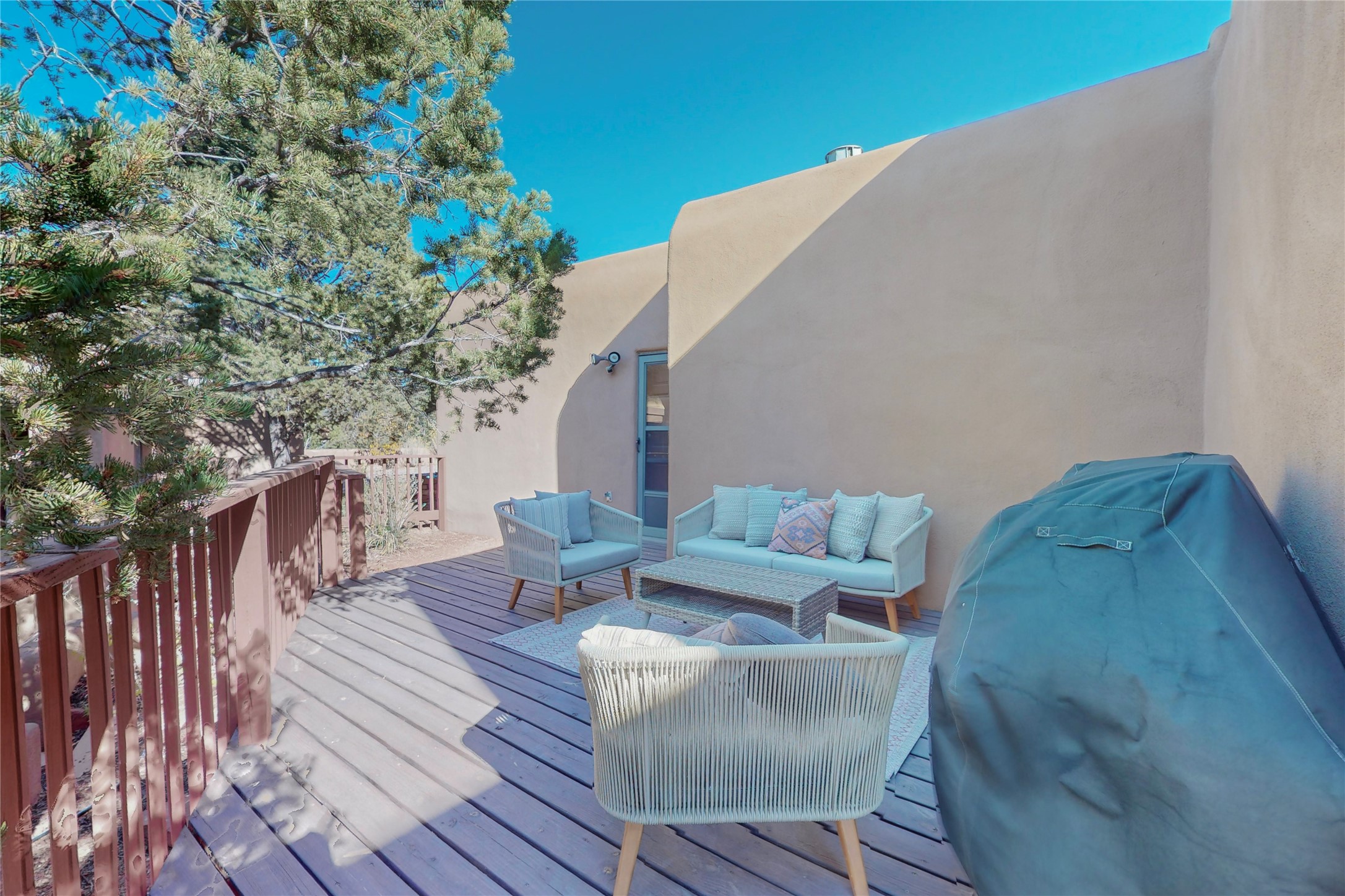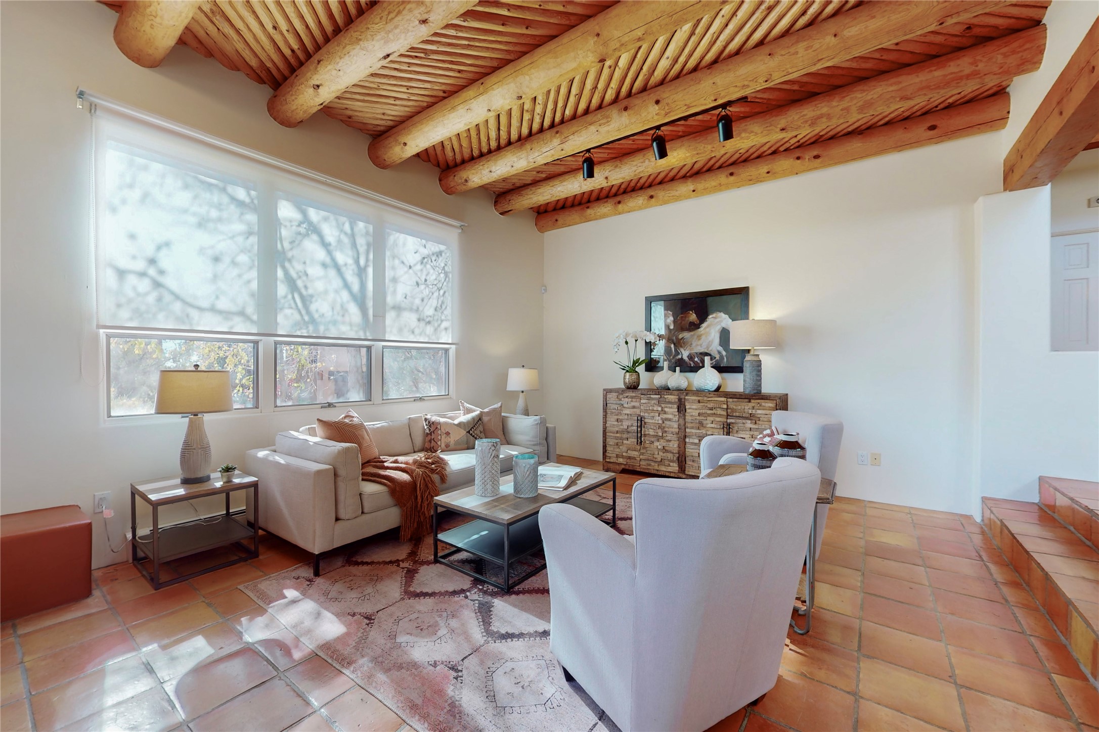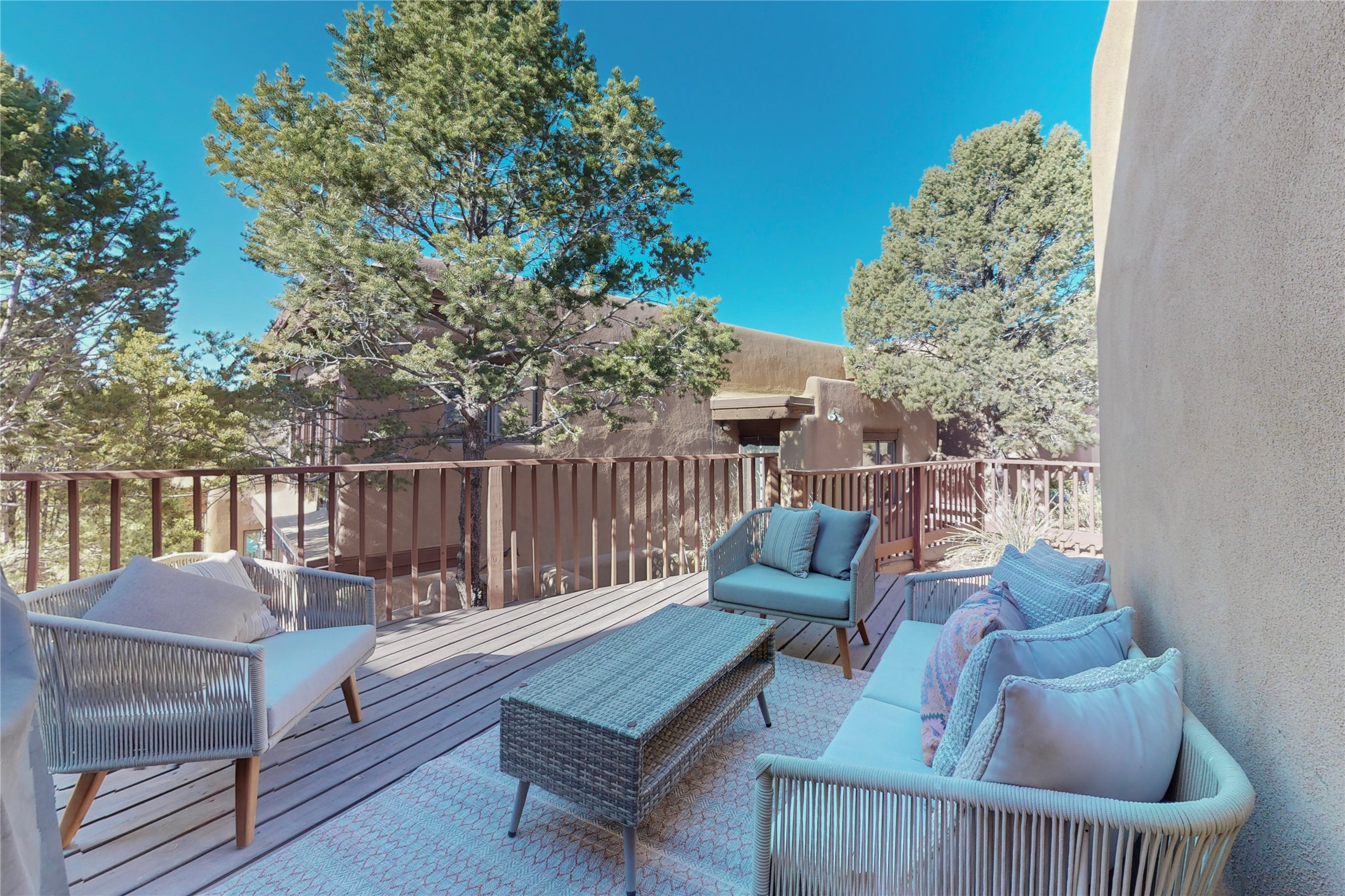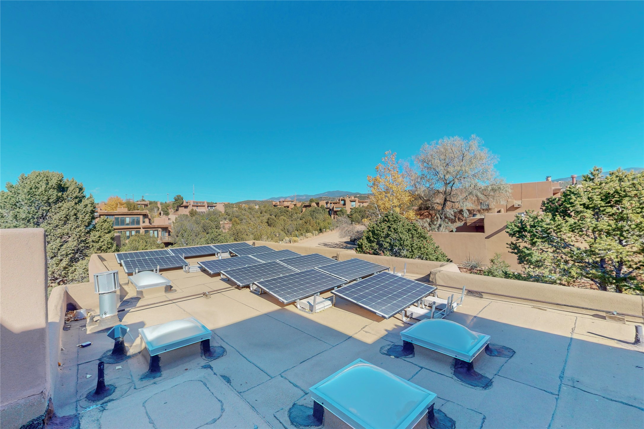 These homes are rarely available and so close to historic and downtown Santa Fe. This remodeled 2 story, 2 bedroom, 2 bath home has an open feeling with a lot of natural light. In keeping with the pueblo style, it has vigas, latillas and high ceilings. The home is on a cul-de-sac. Nice sunset views can be enjoyed from the back deck. There is formal and informal dining and a well-appointed spacious upgraded kitchen with a large pantry. An attached two car garage and Solar photovoltaic panels completes this offering. Estancia Primera has a clubhouse with a kitchen, an outdoor swimming pool, tennis and racquetball courts.