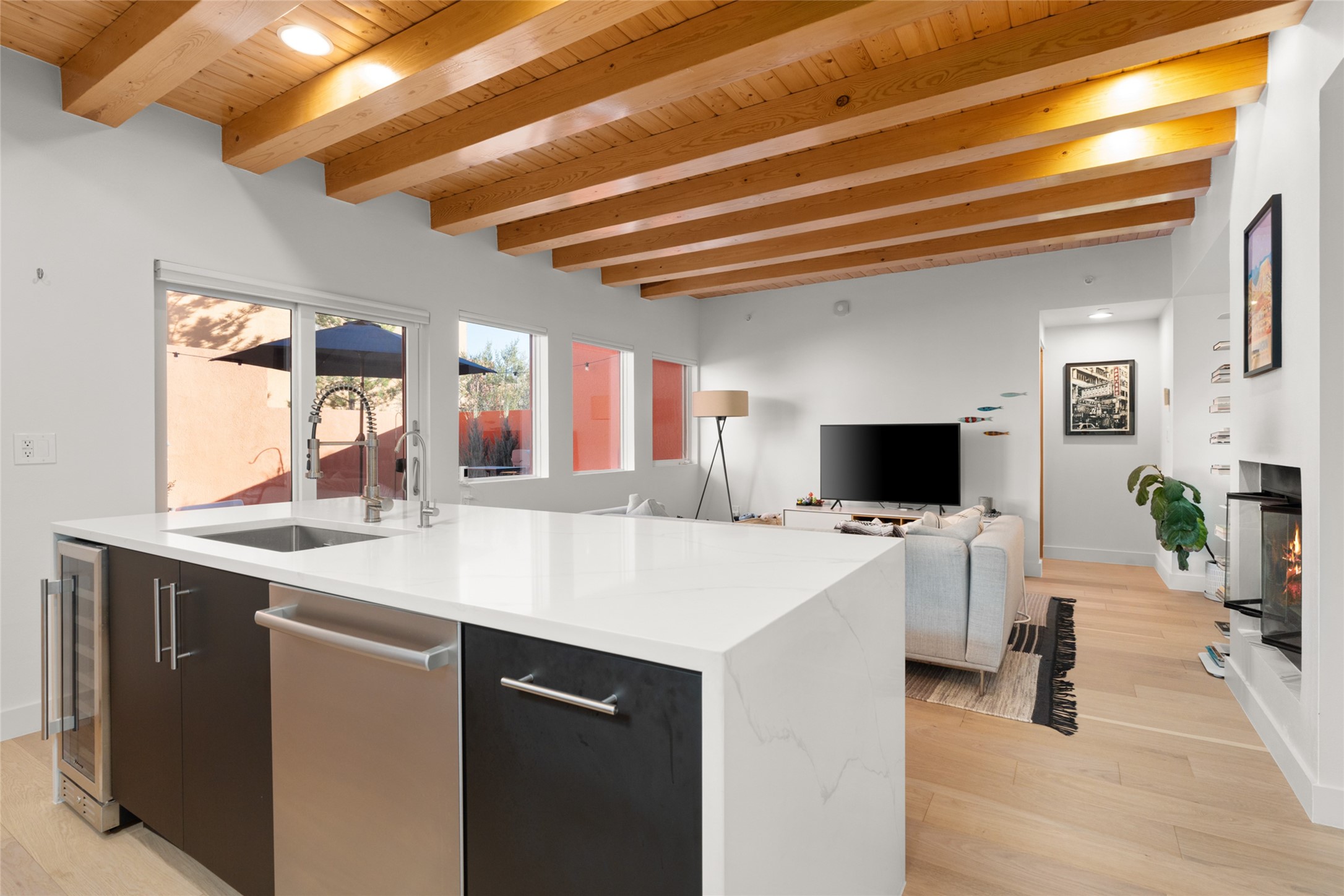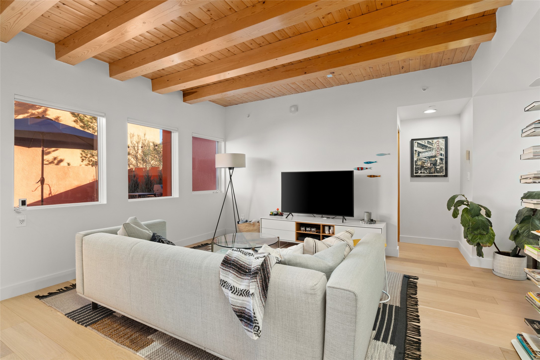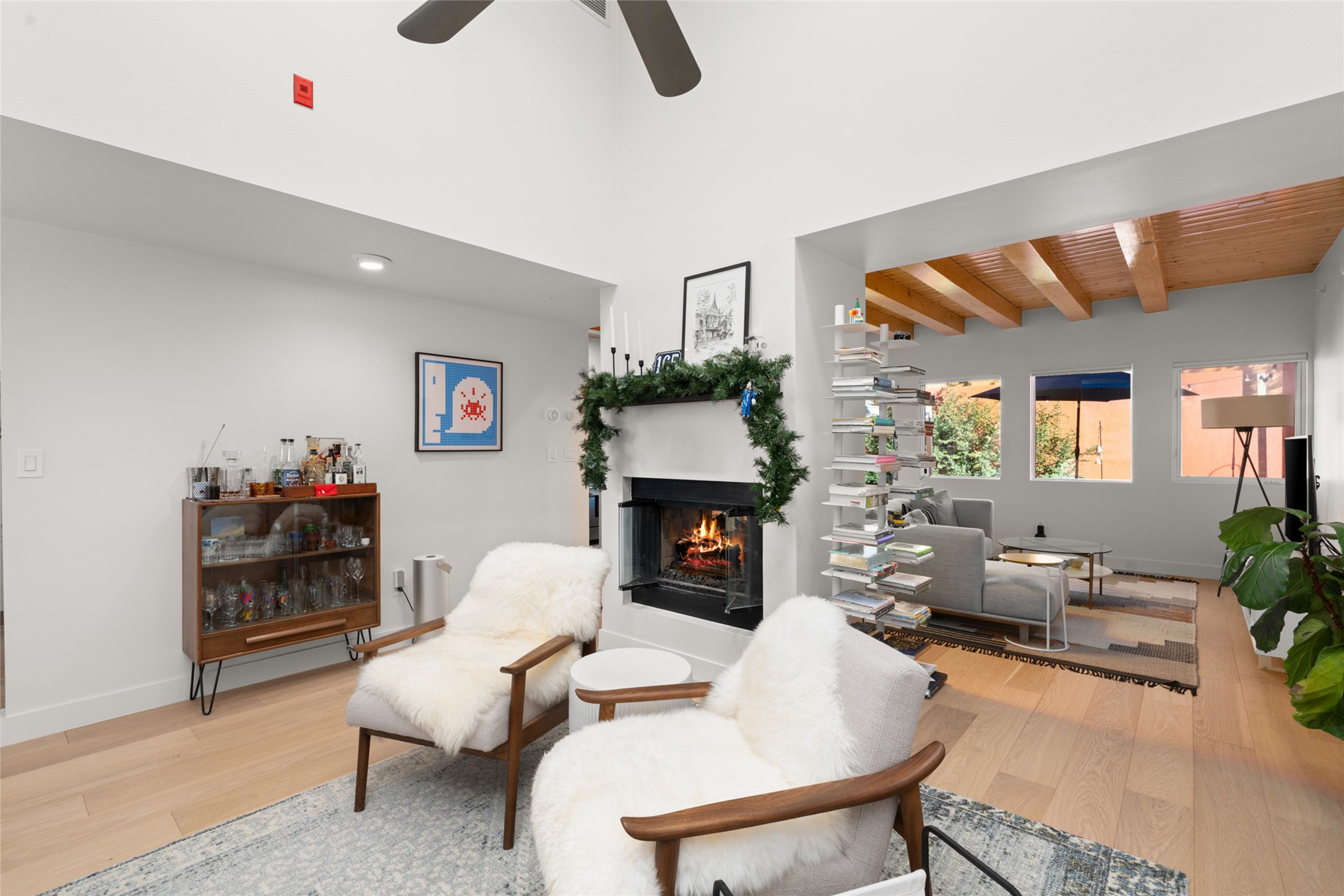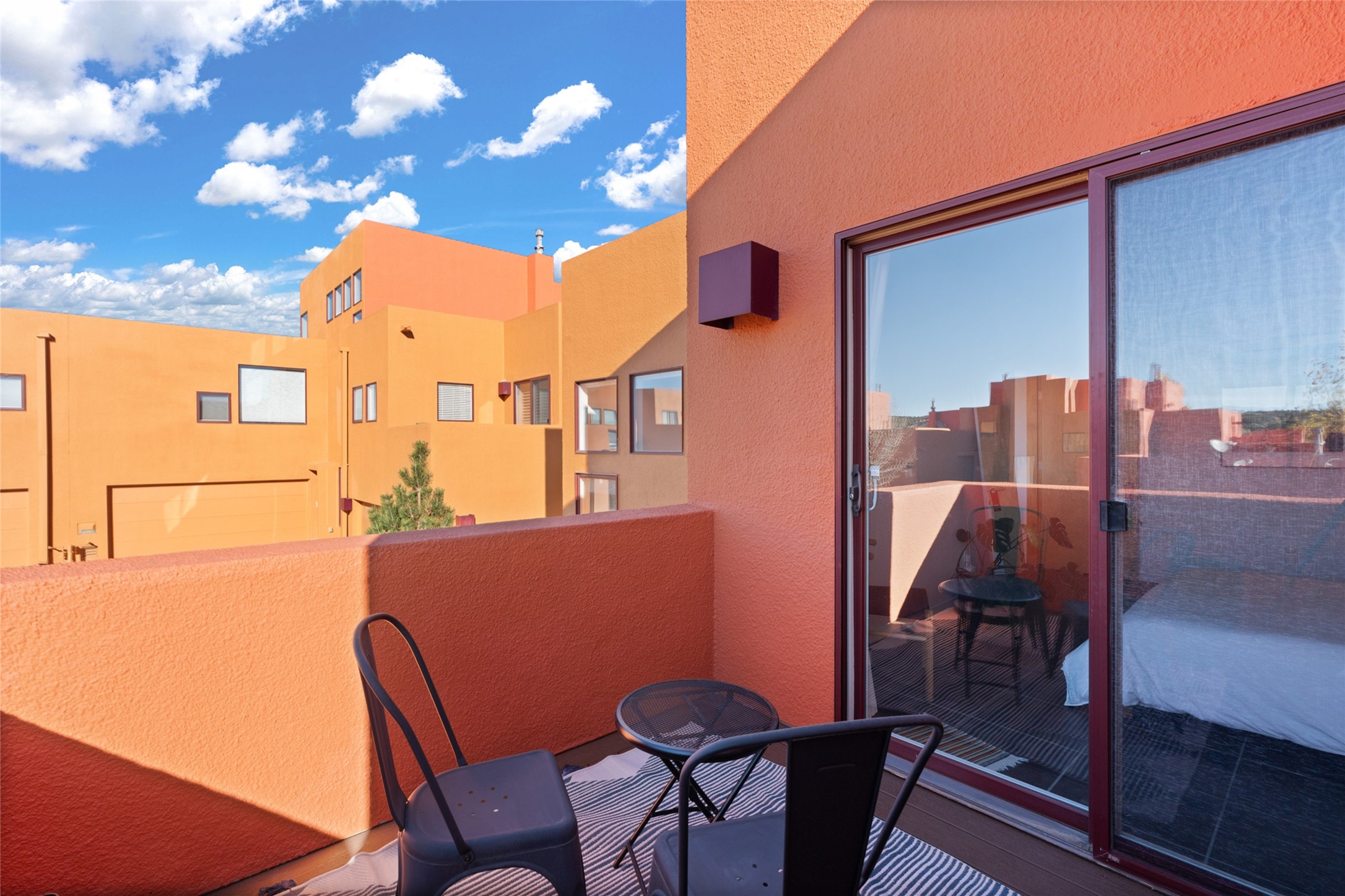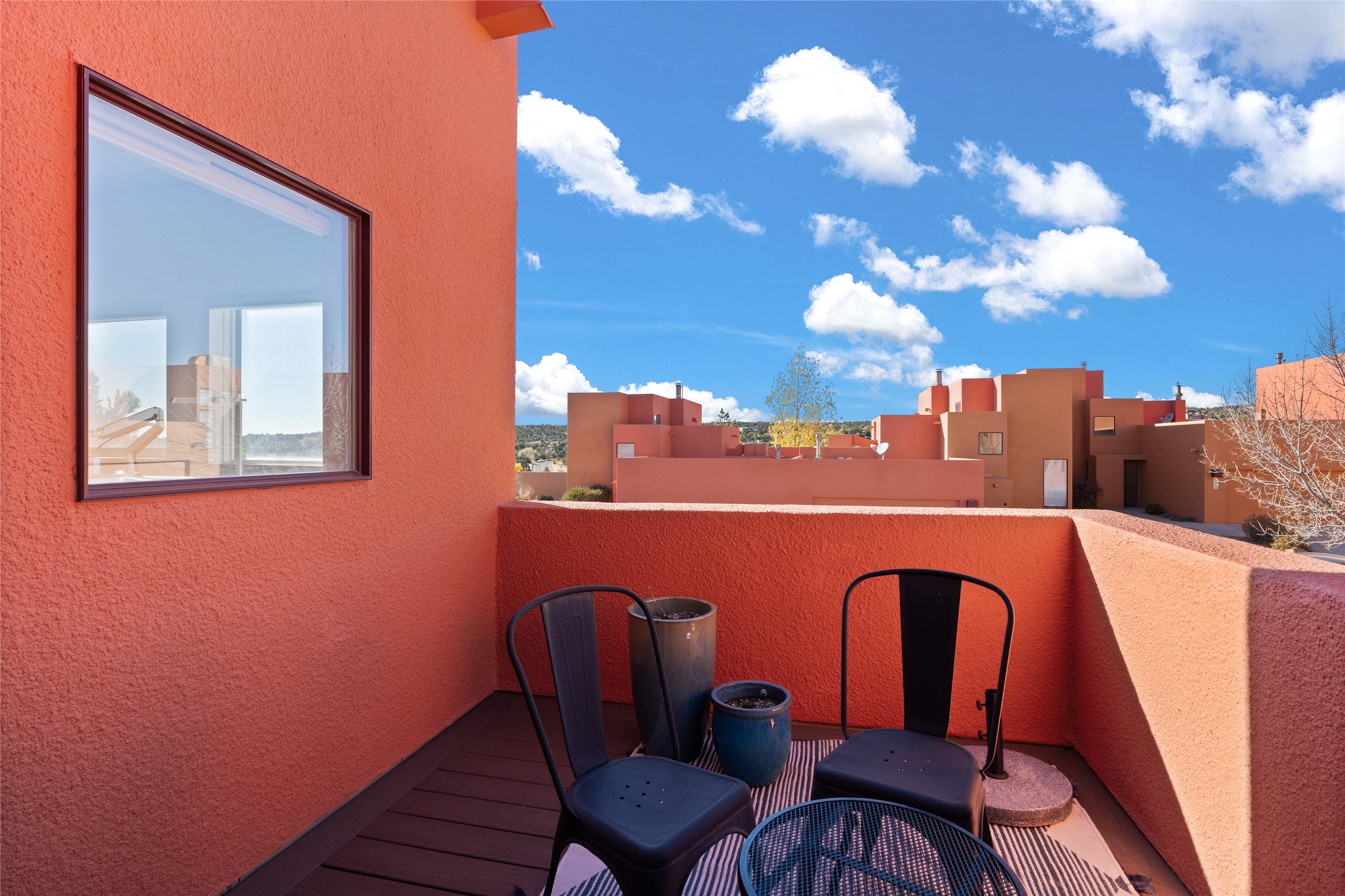 Your search is finally over! Recently remodeled kitchen and living area with stunning white oak wood floors! Architect Ricardo Leggoreta designed this exquisite two-bedroom, three-bathroom plus office in the desirable Zocalo subdivision with sophisticated contemporary design elements. The owner, a world-renowned designer, recently remodeled it with ease of living, functionality, and style considered in every detail. The bedrooms have excellent separation, each with a large closet, an en suite full bath, and a double vanity. The master includes a fully remodeled, California walk-in closet, plus a separate office with a charming deck for sunset viewing. The comfortable living room shares a double-sided fireplace, updated to gas for ease and comfort, and the dining room is open to the kitchen with plenty of storage and accesses an EXCEPTIONALLY spacious entertaining terrace, newly landscaped and on drip irrigation. The dramatic dining room features soaring ceilings and skylights. Zocalo amenities include two well-equipped gyms, An outdoor seasonal pool, A lovely community party room with a kitchen, and evening security patrol. Located less than 10 minutes from downtown Santa Fe's markets, restaurants & shops!