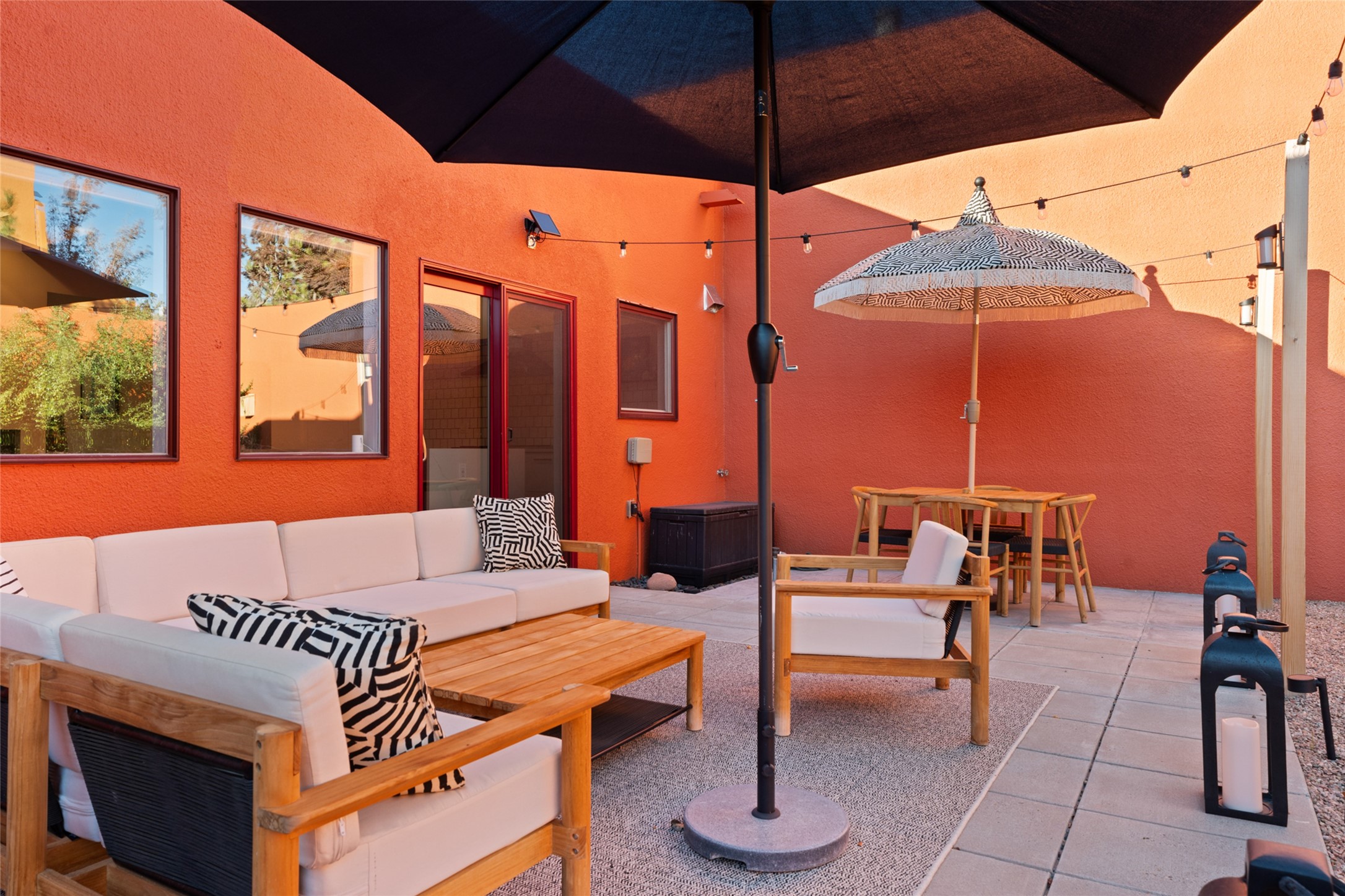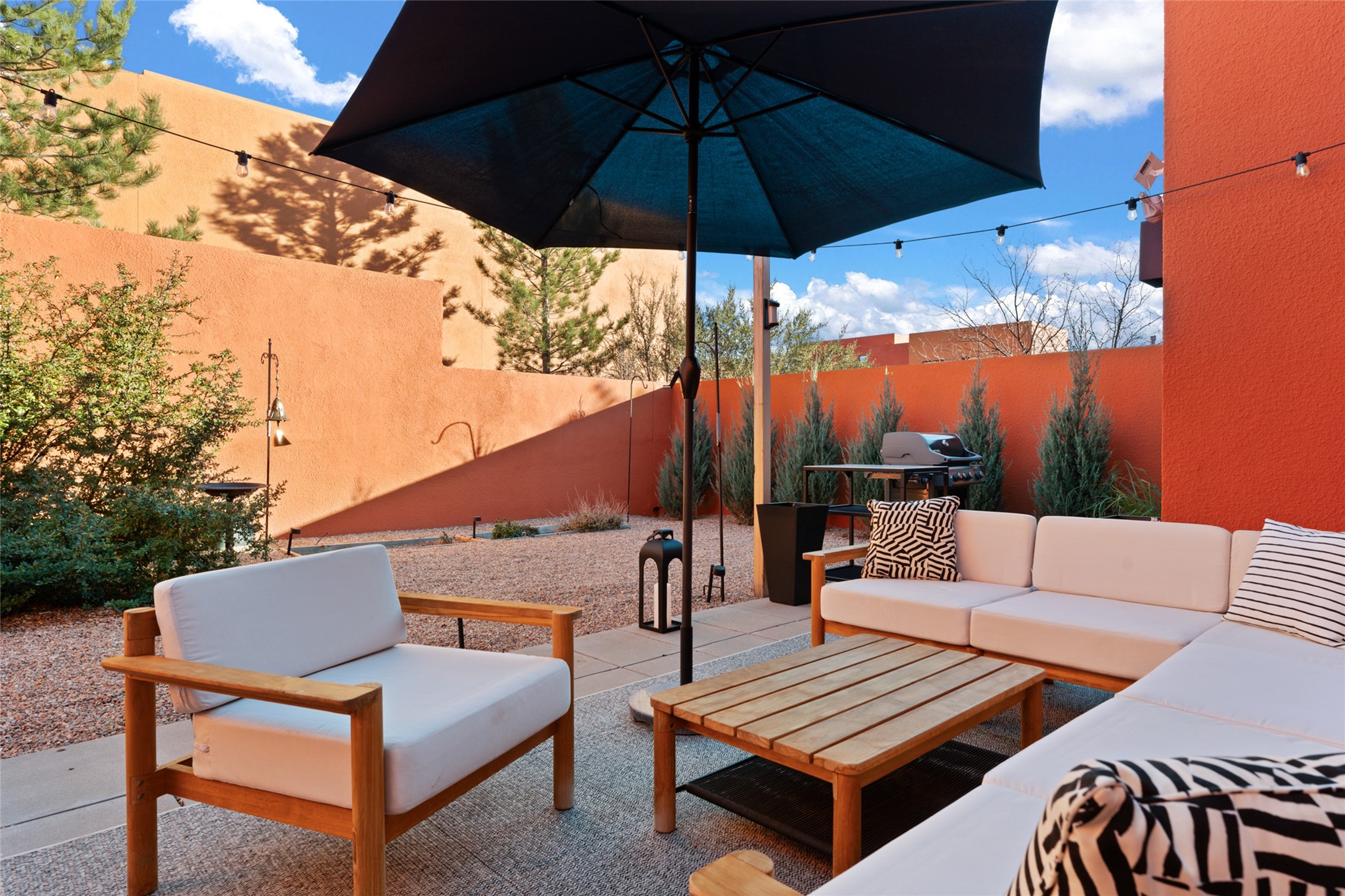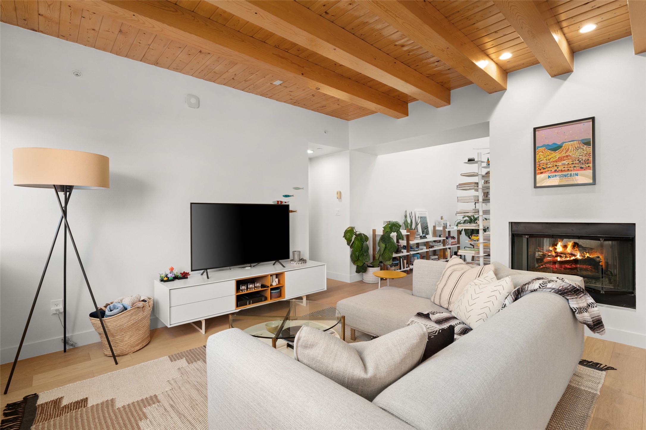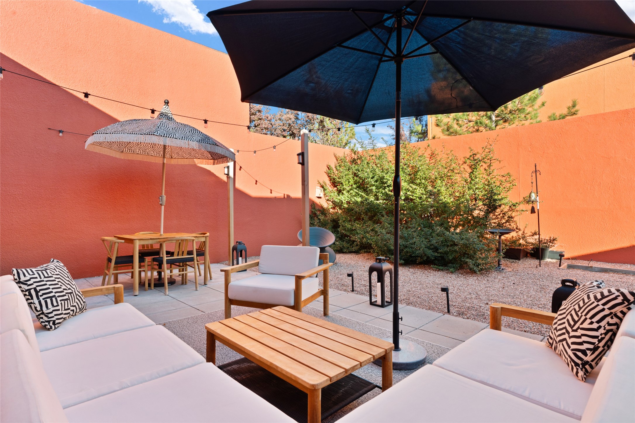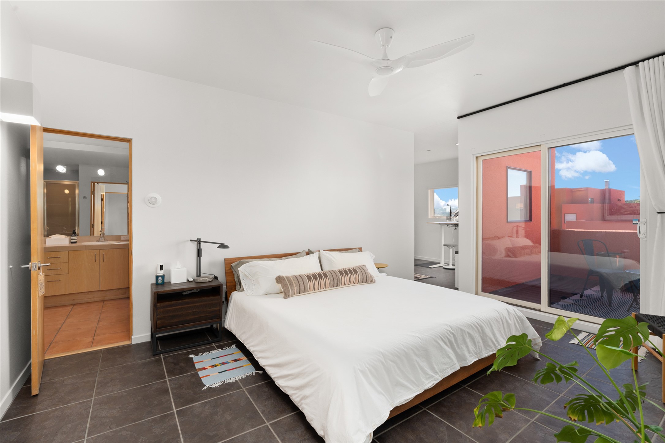 Your search is finally over! Recently remodeled kitchen and living area with stunning white oak wood floors! Architect Ricardo Leggoreta designed this exquisite two-bedroom, three-bathroom plus office in the desirable Zocalo subdivision with sophisticated contemporary design elements. The owner, a world-renowned designer, recently remodeled it with ease of living, functionality, and style considered in every detail. The bedrooms have excellent separation, each with a large closet, an en suite full bath, and a double vanity. The master includes a fully remodeled, California walk-in closet, plus a separate office with a charming deck for sunset viewing. The comfortable living room shares a double-sided fireplace, updated to gas for ease and comfort, and the dining room is open to the kitchen with plenty of storage and accesses an EXCEPTIONALLY spacious entertaining terrace, newly landscaped and on drip irrigation. The dramatic dining room features soaring ceilings and skylights. Zocalo amenities include two well-equipped gyms, An outdoor seasonal pool, A lovely community party room with a kitchen, and evening security patrol. Located less than 10 minutes from downtown Santa Fe's markets, restaurants & shops!