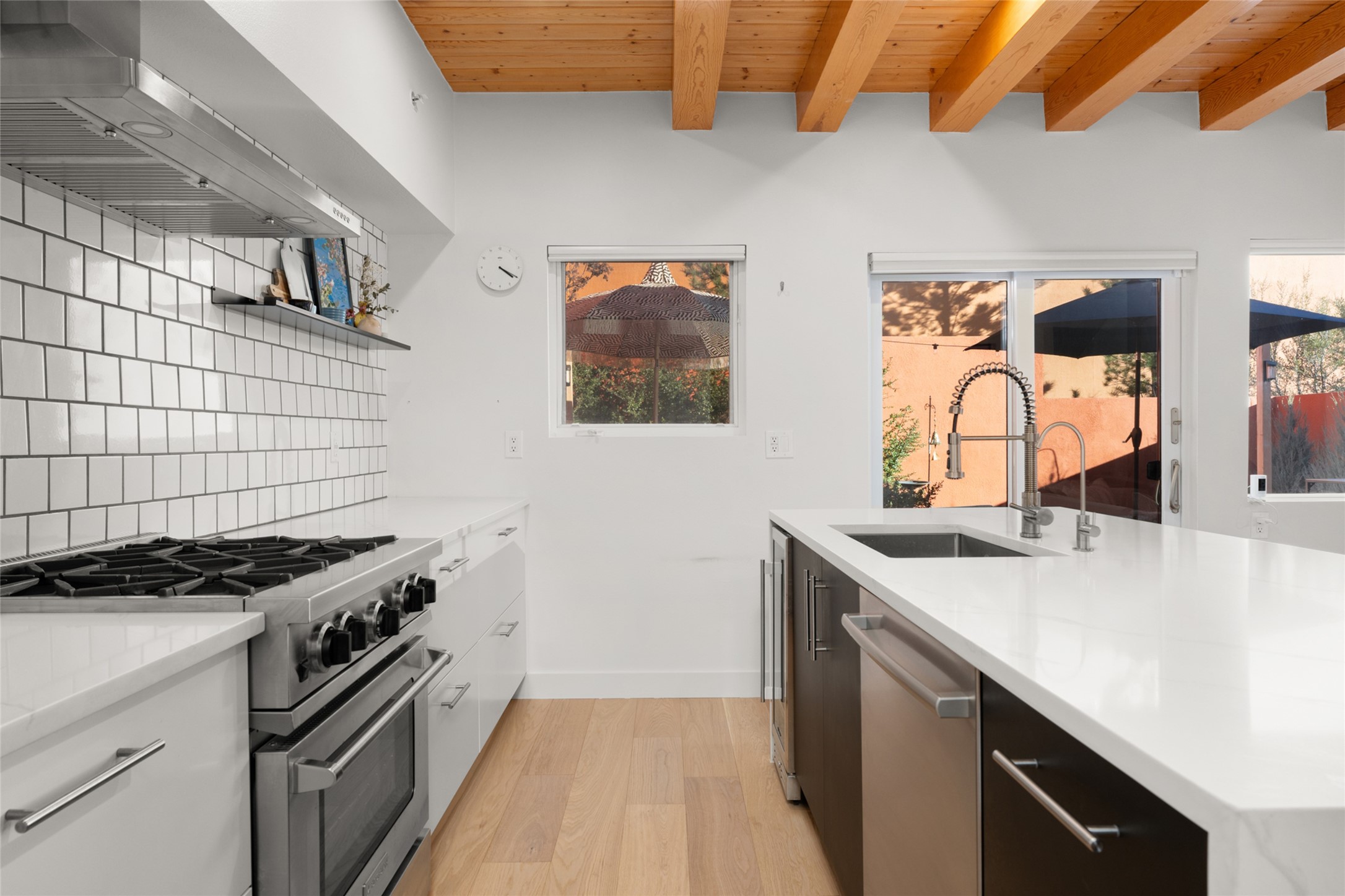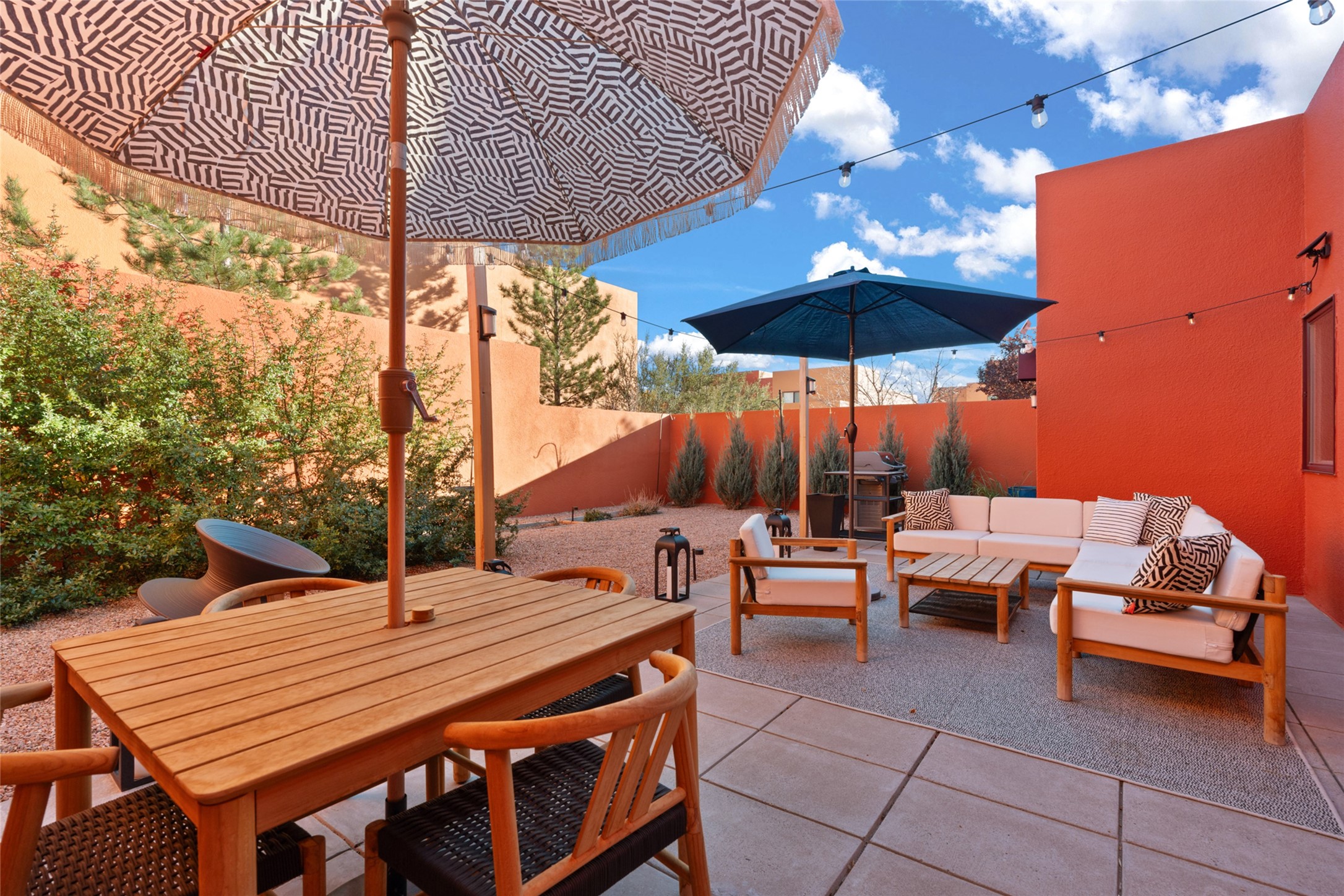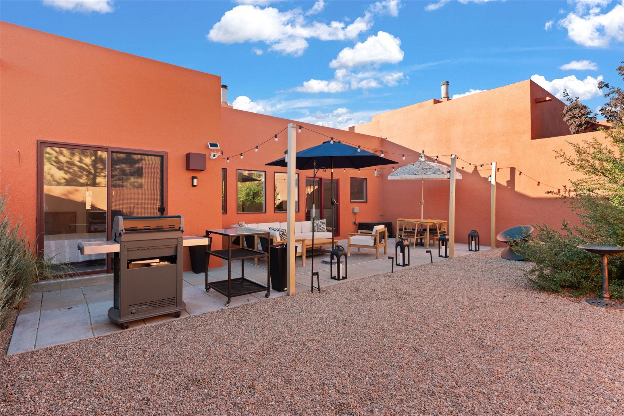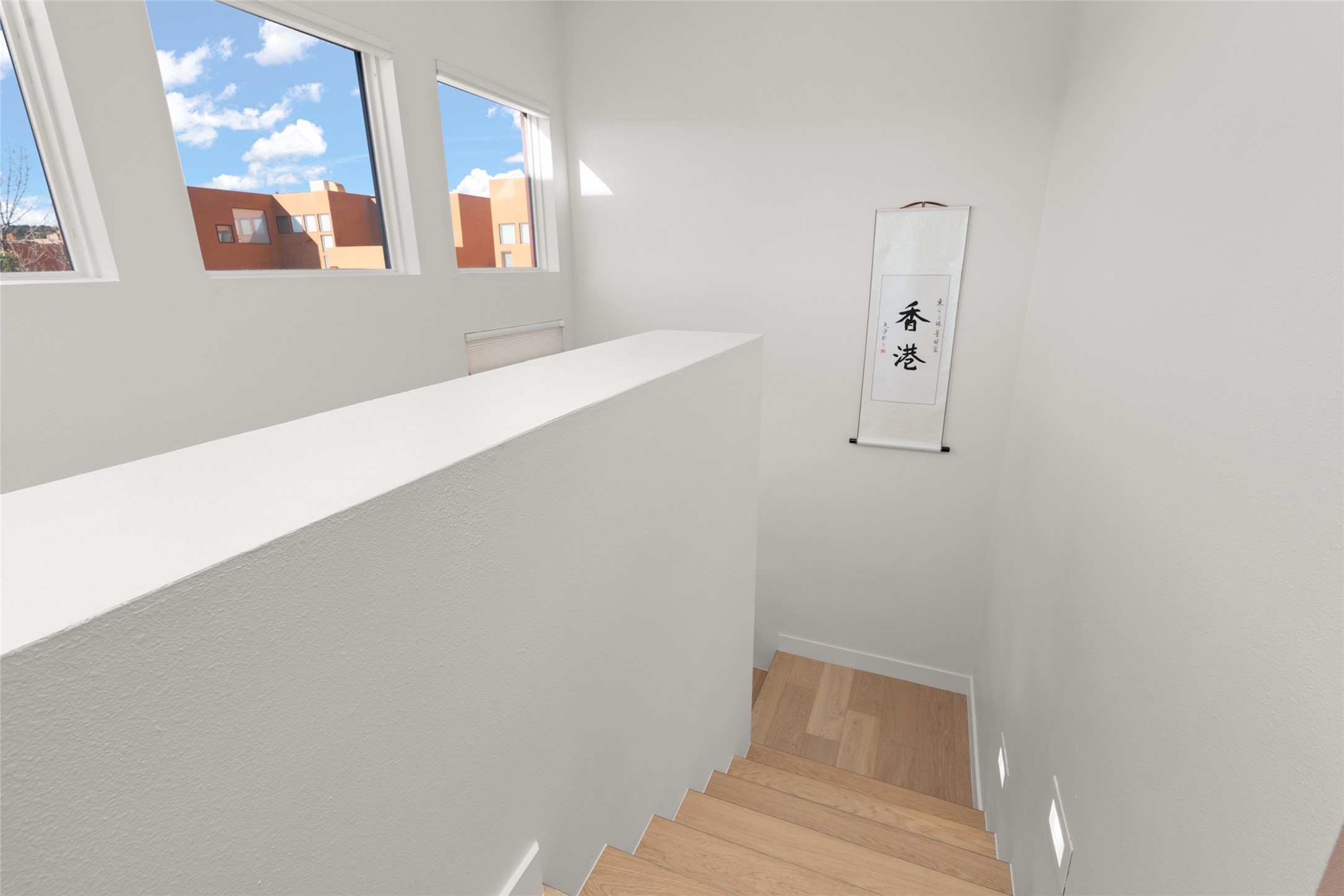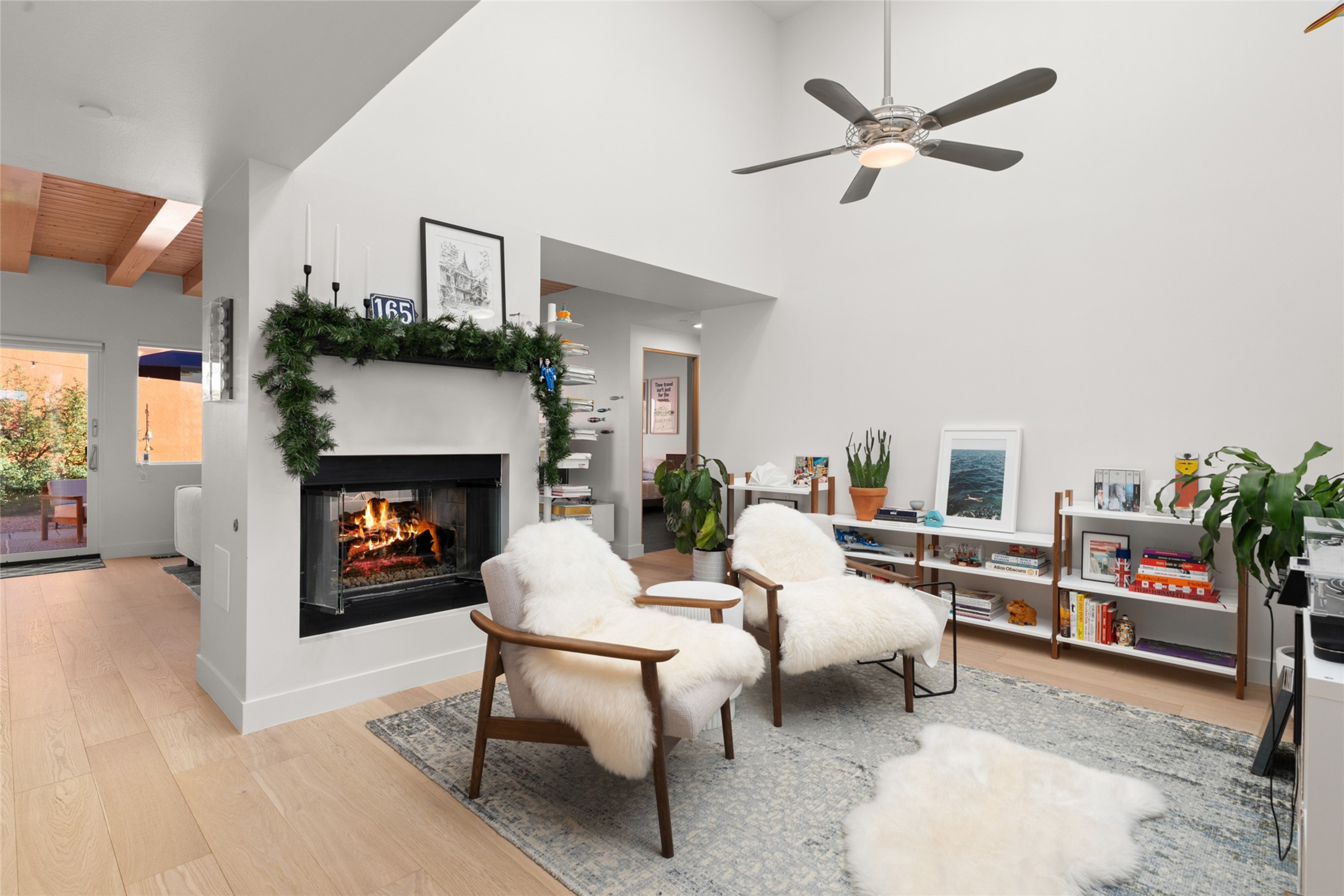 Your search is finally over! Recently remodeled kitchen and living area with stunning white oak wood floors! Architect Ricardo Leggoreta designed this exquisite two-bedroom, three-bathroom plus office in the desirable Zocalo subdivision with sophisticated contemporary design elements. The owner, a world-renowned designer, recently remodeled it with ease of living, functionality, and style considered in every detail. The bedrooms have excellent separation, each with a large closet, an en suite full bath, and a double vanity. The master includes a fully remodeled, California walk-in closet, plus a separate office with a charming deck for sunset viewing. The comfortable living room shares a double-sided fireplace, updated to gas for ease and comfort, and the dining room is open to the kitchen with plenty of storage and accesses an EXCEPTIONALLY spacious entertaining terrace, newly landscaped and on drip irrigation. The dramatic dining room features soaring ceilings and skylights. Zocalo amenities include two well-equipped gyms, An outdoor seasonal pool, A lovely community party room with a kitchen, and evening security patrol. Located less than 10 minutes from downtown Santa Fe's markets, restaurants & shops!