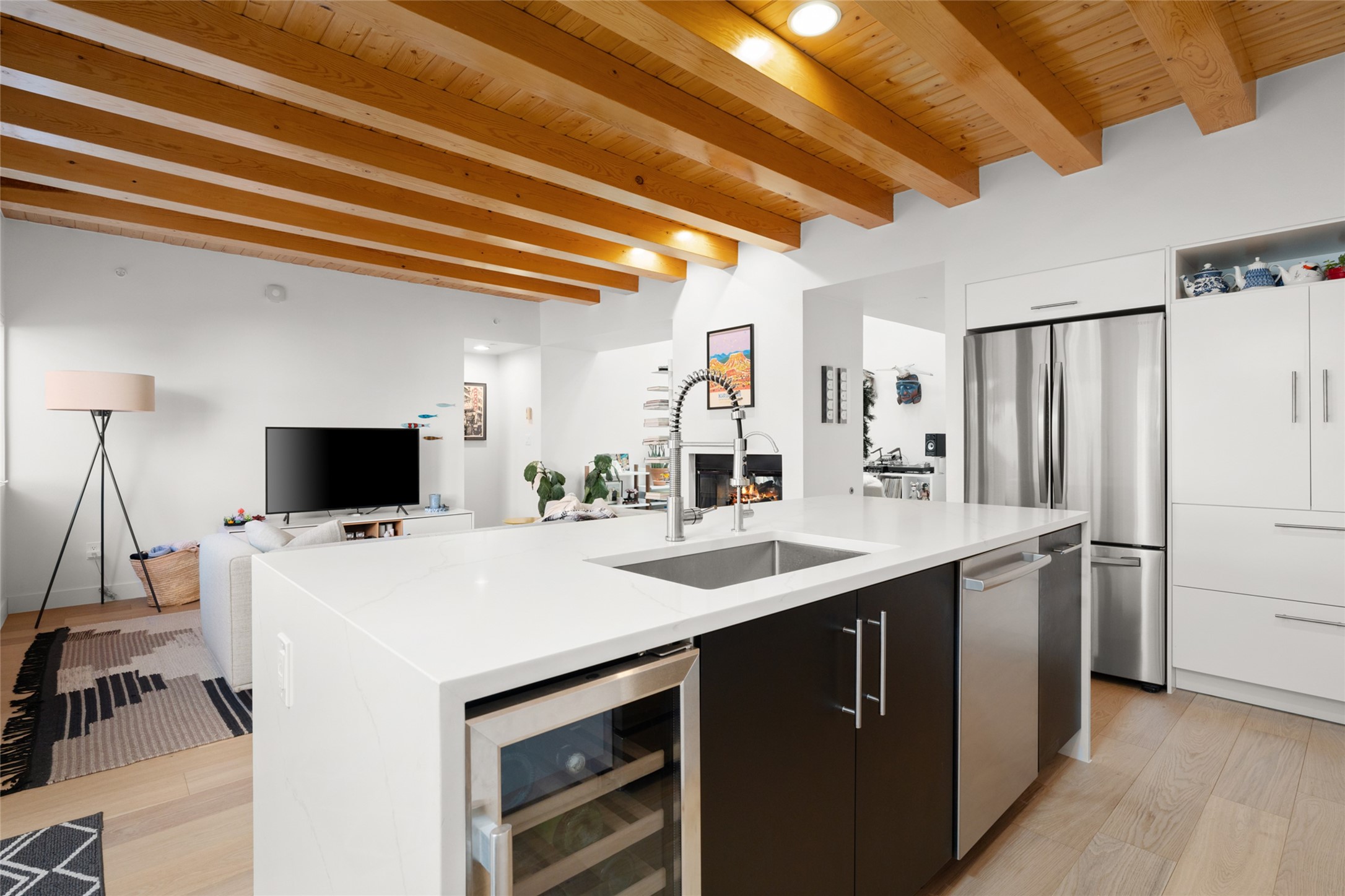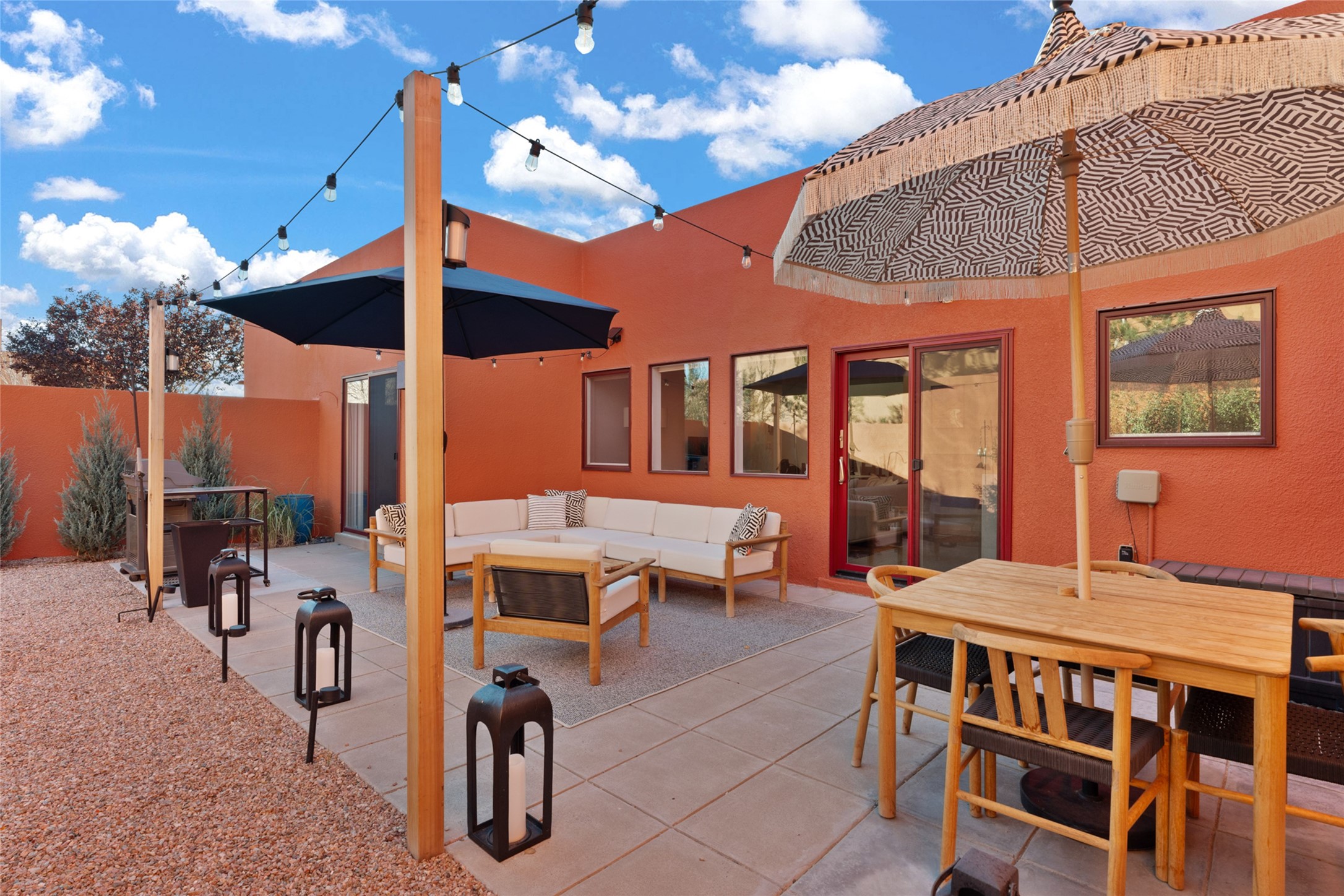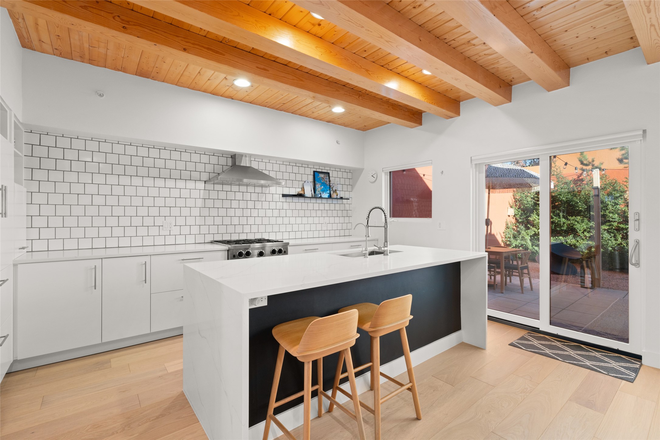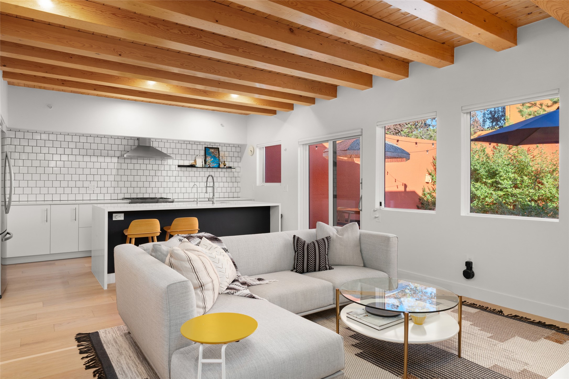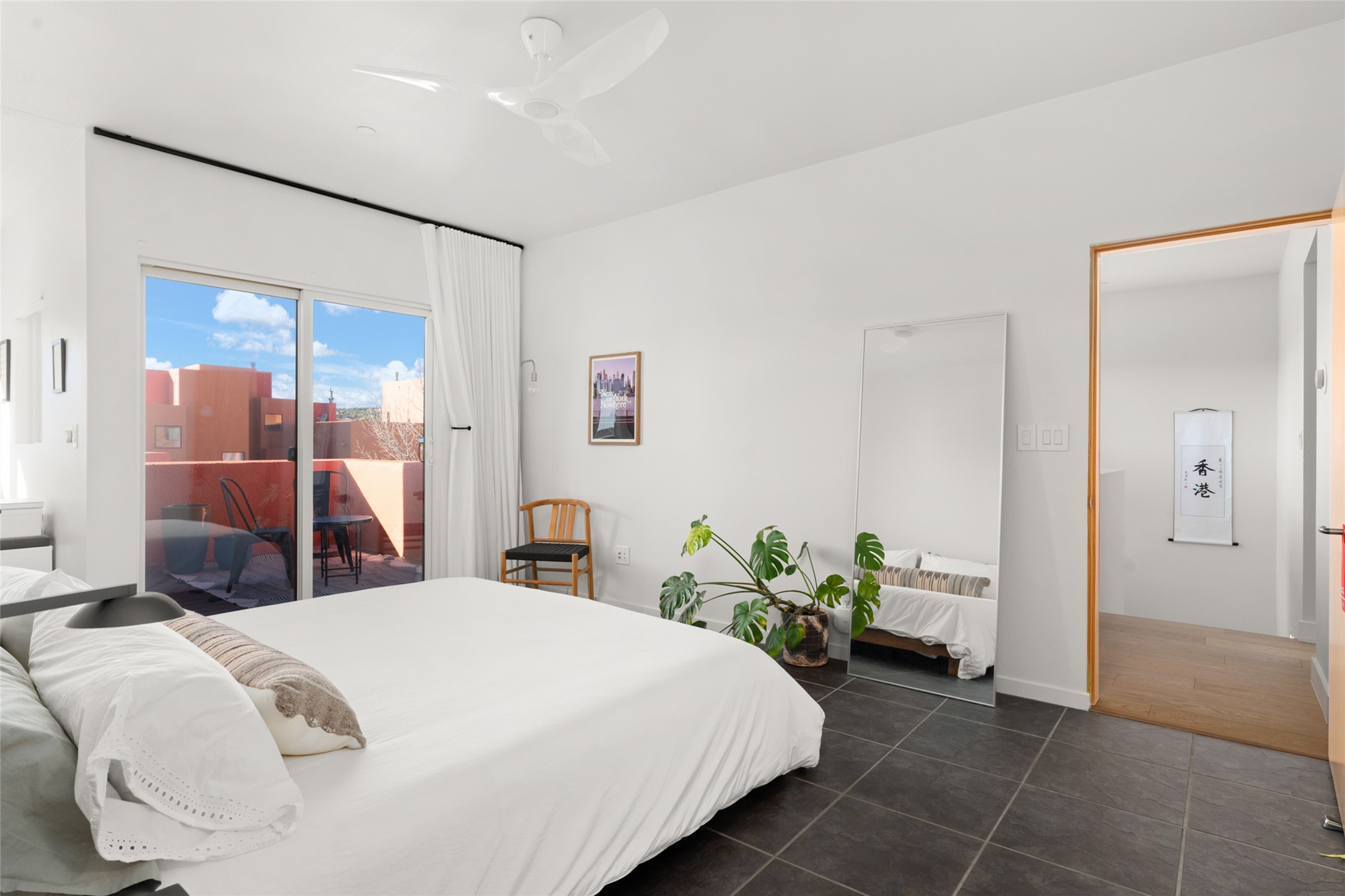 Your search is finally over! Recently remodeled kitchen and living area with stunning white oak wood floors! Architect Ricardo Leggoreta designed this exquisite two-bedroom, three-bathroom plus office in the desirable Zocalo subdivision with sophisticated contemporary design elements. The owner, a world-renowned designer, recently remodeled it with ease of living, functionality, and style considered in every detail. The bedrooms have excellent separation, each with a large closet, an en suite full bath, and a double vanity. The master includes a fully remodeled, California walk-in closet, plus a separate office with a charming deck for sunset viewing. The comfortable living room shares a double-sided fireplace, updated to gas for ease and comfort, and the dining room is open to the kitchen with plenty of storage and accesses an EXCEPTIONALLY spacious entertaining terrace, newly landscaped and on drip irrigation. The dramatic dining room features soaring ceilings and skylights. Zocalo amenities include two well-equipped gyms, An outdoor seasonal pool, A lovely community party room with a kitchen, and evening security patrol. Located less than 10 minutes from downtown Santa Fe's markets, restaurants & shops!