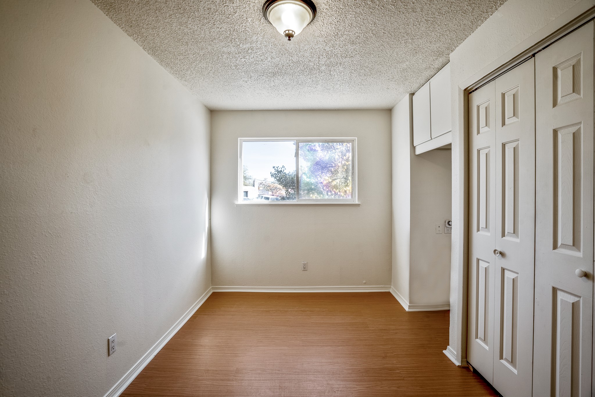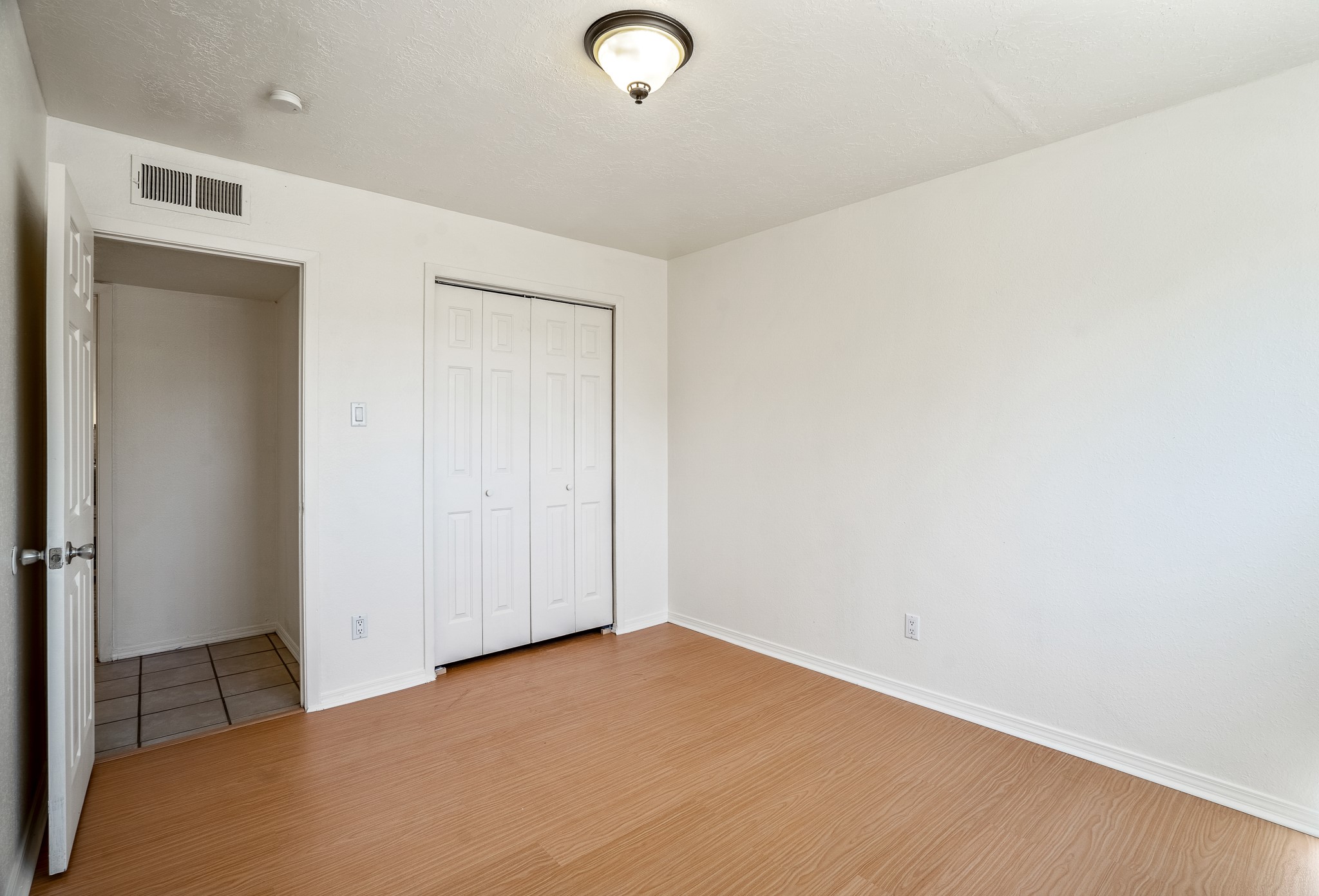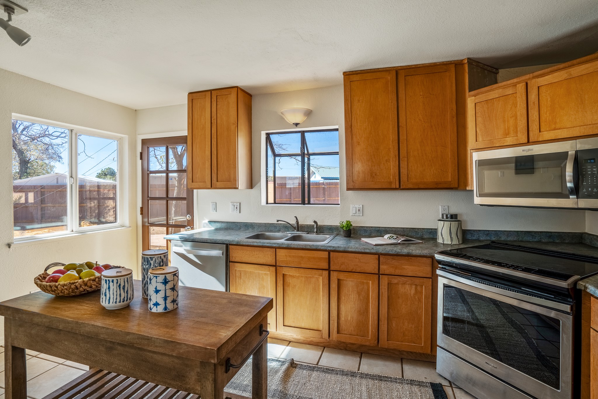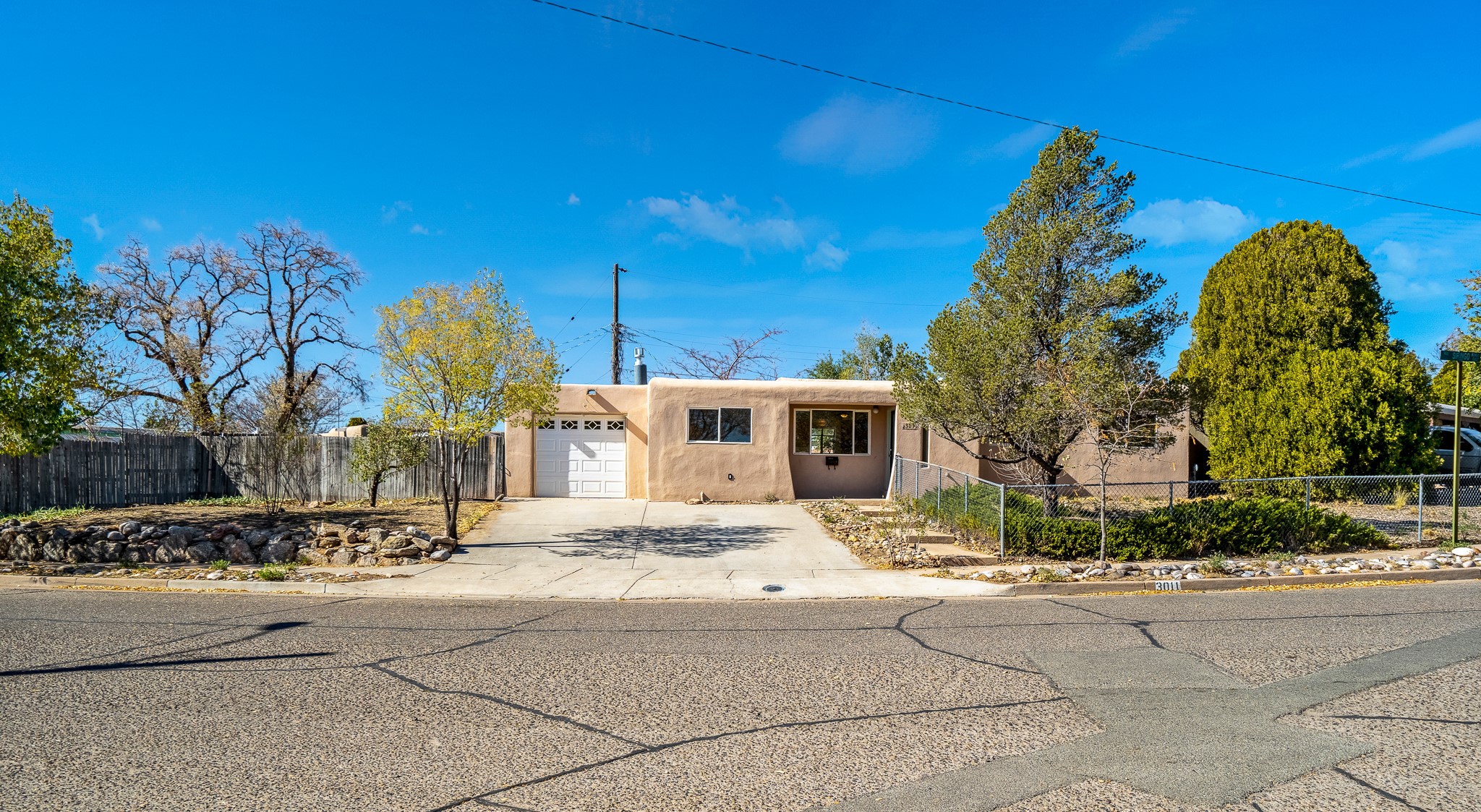 Open concept living/dining/kitchen welcomes you in to this well located 3 bedroom home. Tile floors throughout main areas and into bathroom. Stainless steel appliance package in kitchen is all 5 years old: includes refrigerator, dishwasher, electric oven, microwave, hot water heater- the garbage disposal has also been recently replaced. Lovely manufactured wood flooring has been added in the 3 bedrooms. Kitchen and bathroom have small bay windows above the sink in kitchen and tub in bath, which create extra light and lovely places for plants or decorations. Gas fireplace in living room. Single car attached garage makes for a great place for storage or another potential space if buyer wants to put in heating. The yard is very large - since the lot is on a curve of Siringo Rondo the size is .187 acres, or 8146 sq ft - much larger than the minimum lot size. Ample rear yard has lovely stamped concrete patio area with trees for shade and lots of room to plant. Western side yard is also deep and could easily be area for vegetable garden. When outdoors do not miss the shed that is out to the east side of the home - it is a great place to keep outdoor tools so they stay dry and out of the elements. Front yard has a lovely iris patch and another fenced in area that could work well for dogs . Home warranty provided by seller. Owner is New Mexico real estate broker.