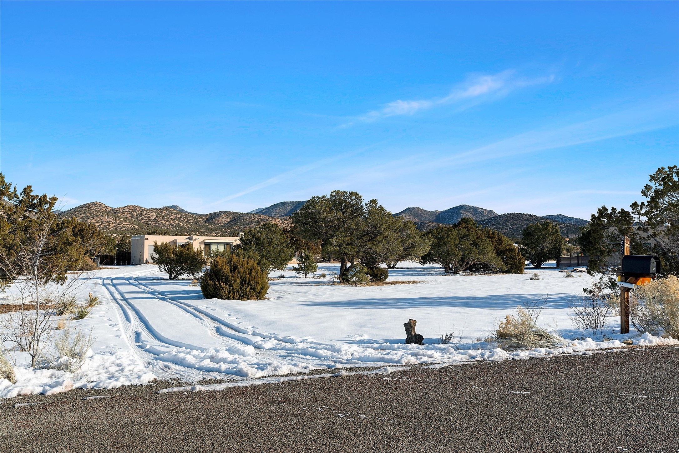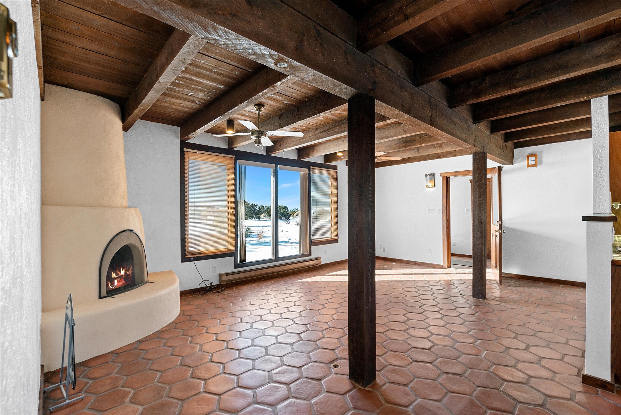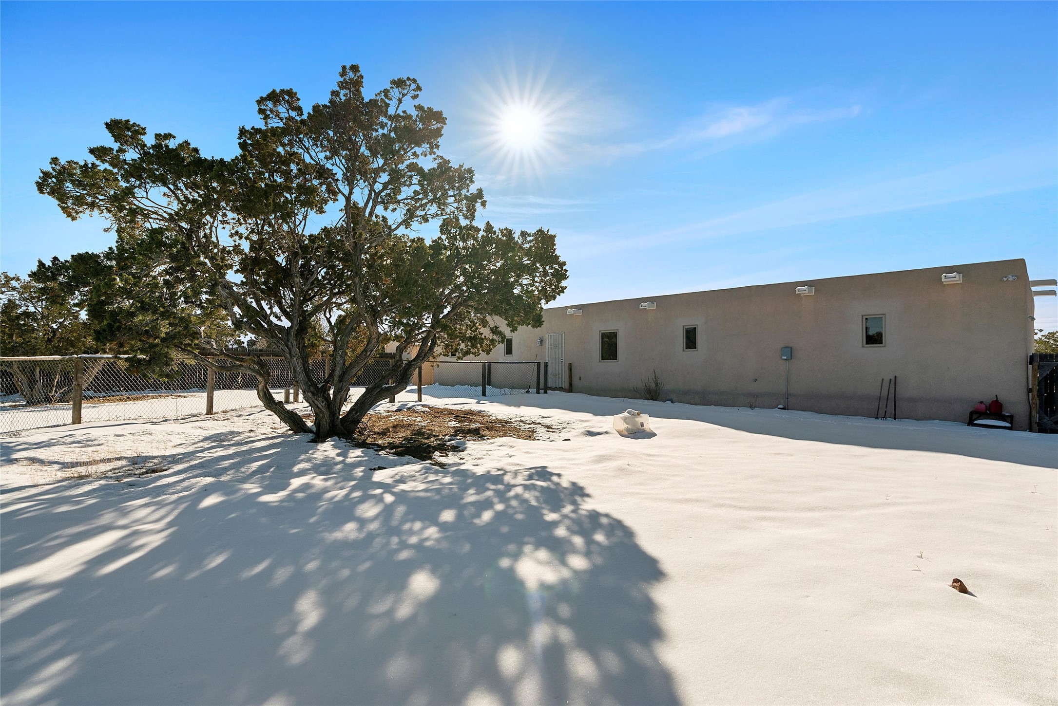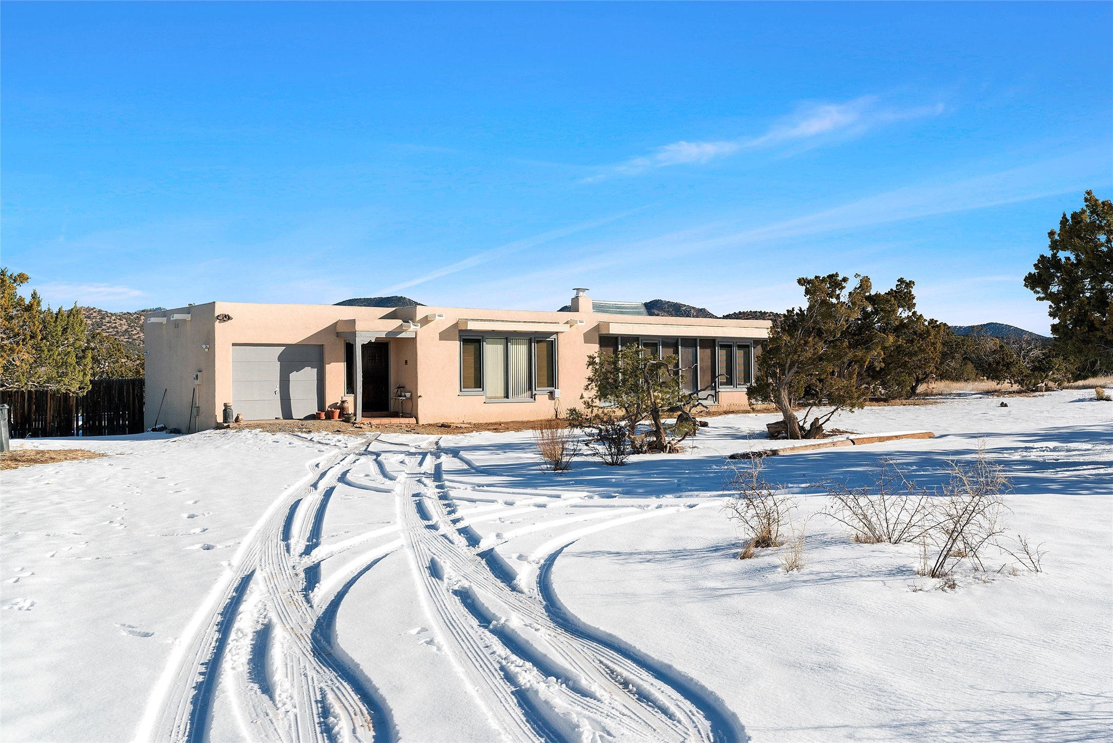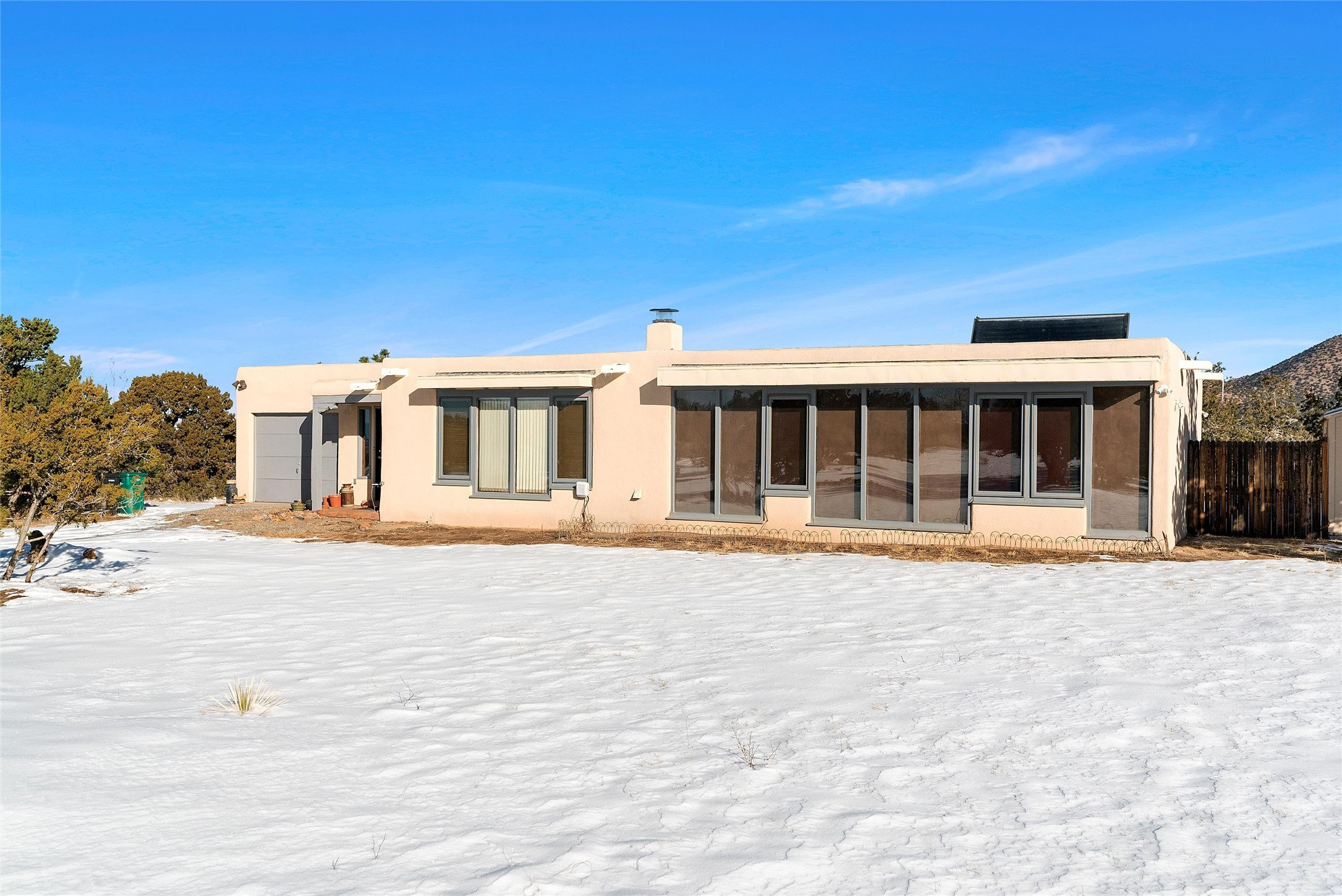 A lovely single-story home inside Eldorado Community. This spacious 1249 sq ft gem offers 2 bedrooms and a full bath with upgrades that include new Marvin windows, freshly painted interior, exterior trim & canales. Tile and carpet flooring throughout with Kiva wood-burning fireplace, vigas & beams ceiling, passive solar Trombe walls in both bedrooms & solar water heater. The exterior has a huge fenced backyard with a storage shed and offers unobstructed foothill views. The home is situated on 1.13 acres of land. Move-in ready and easy to show.