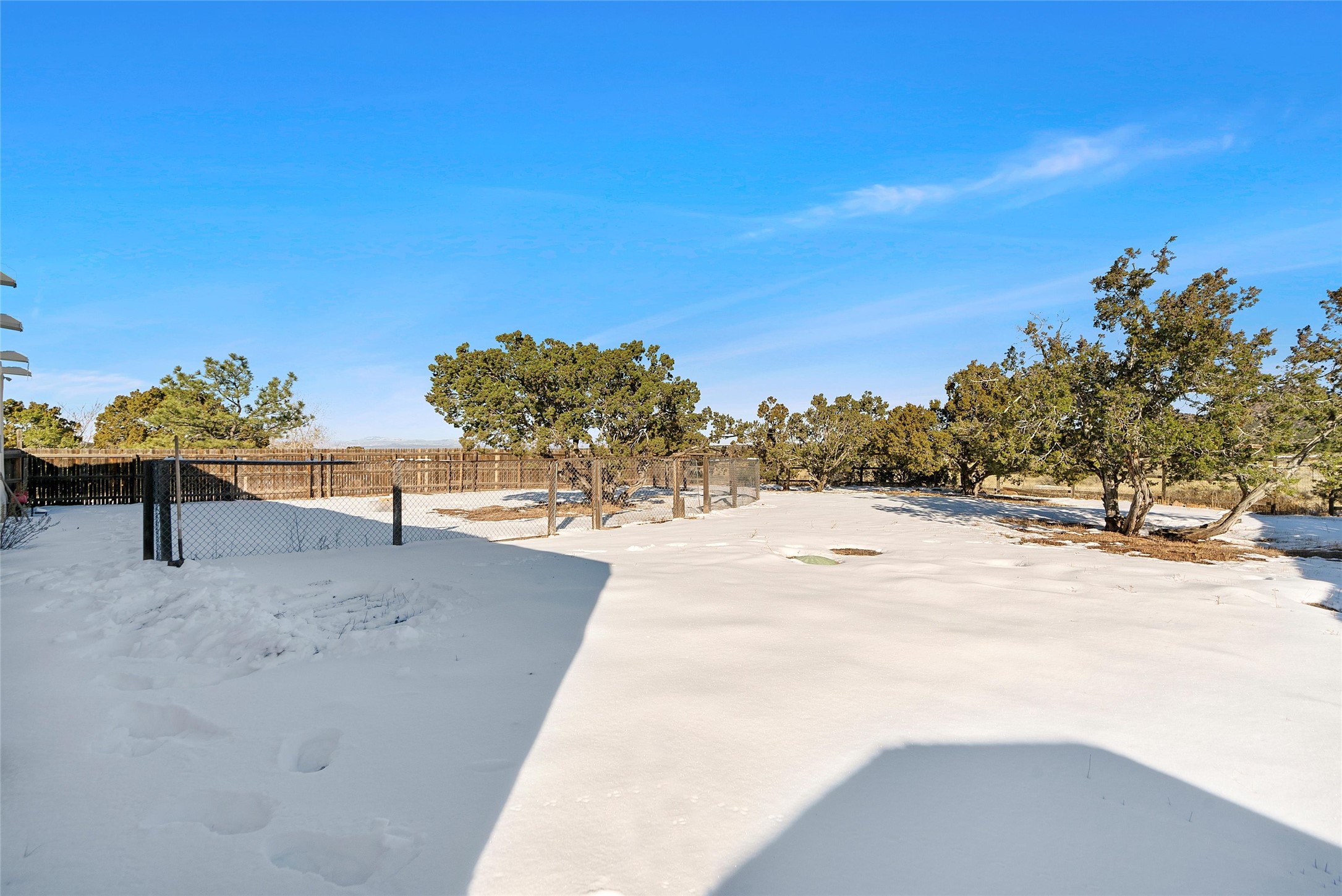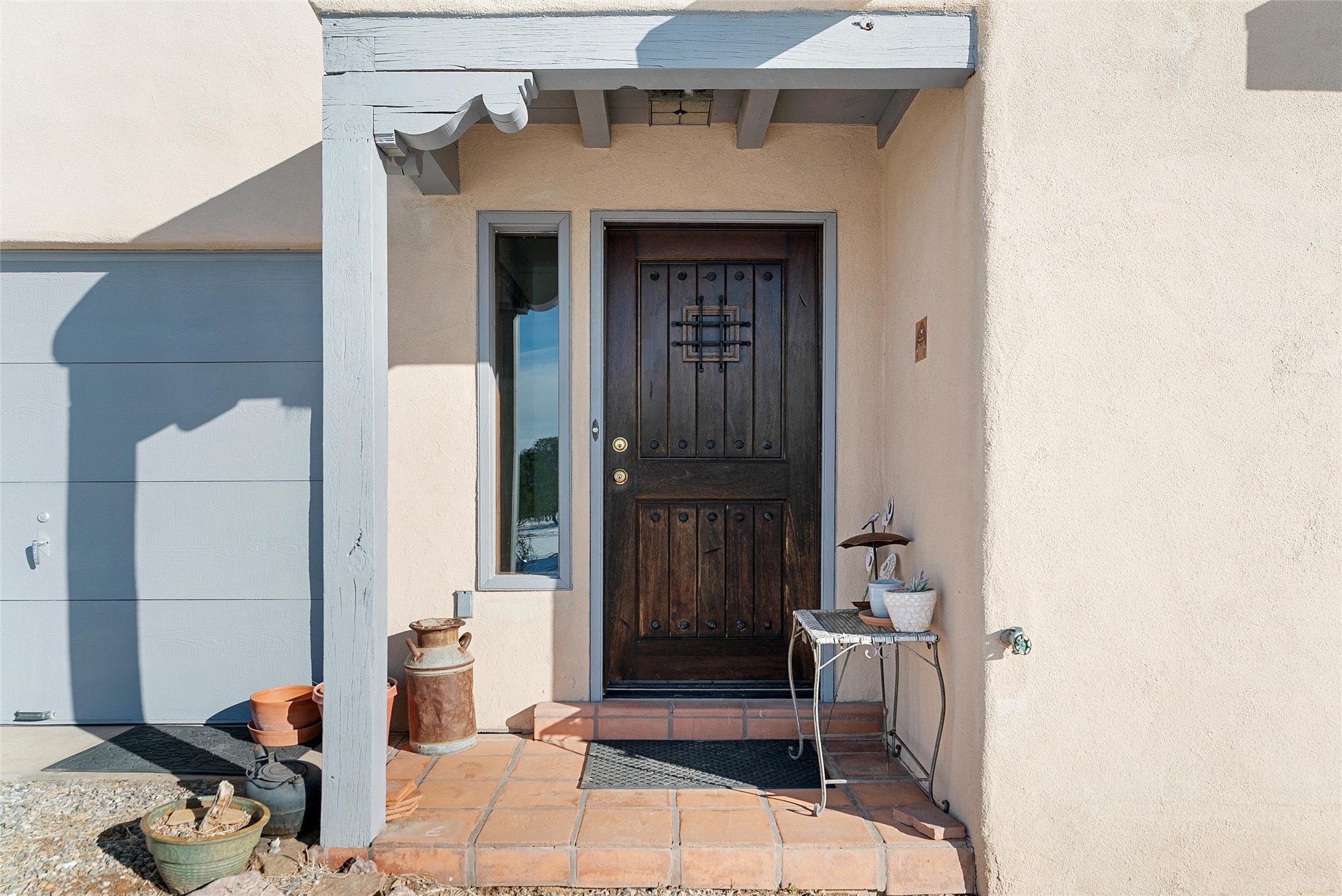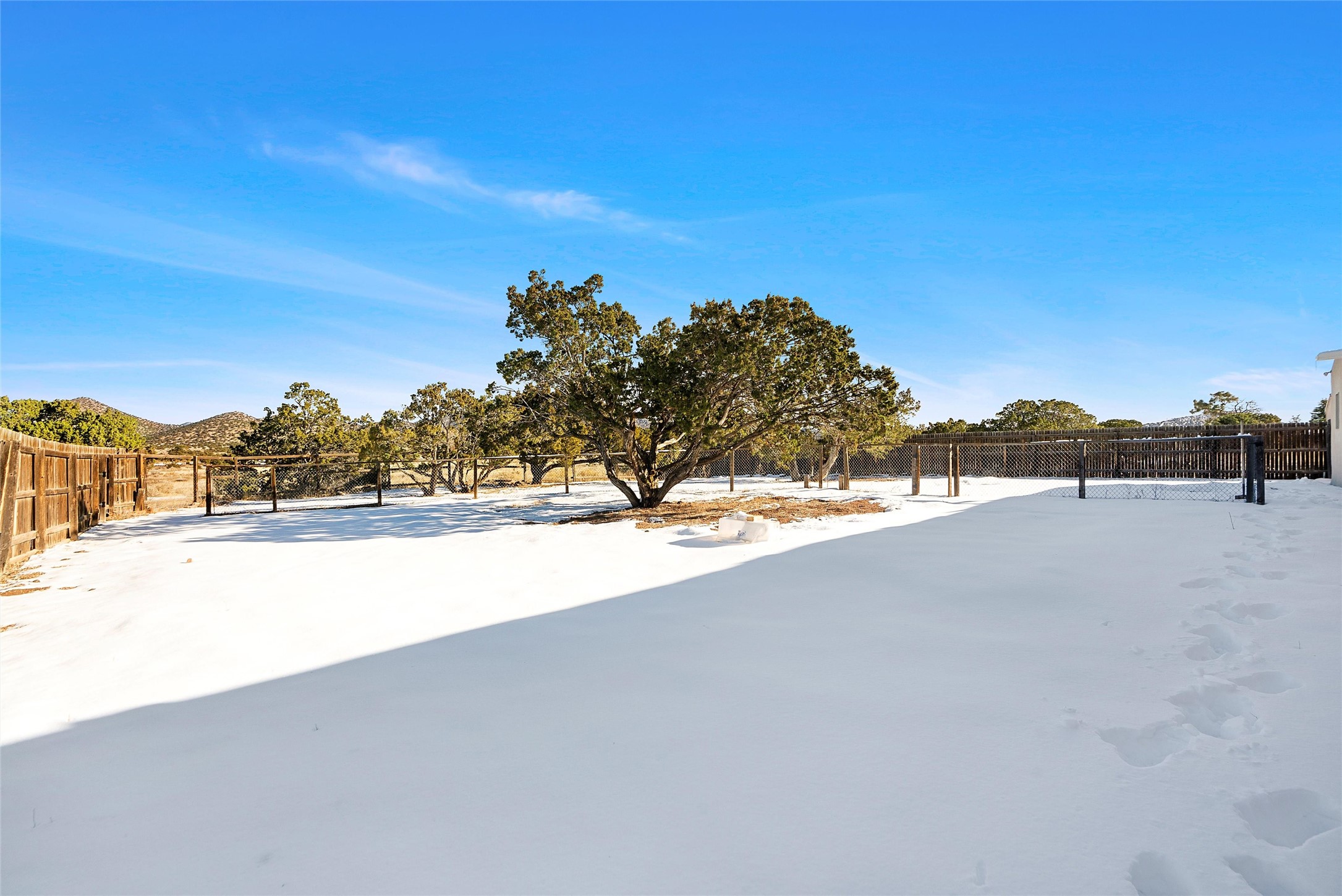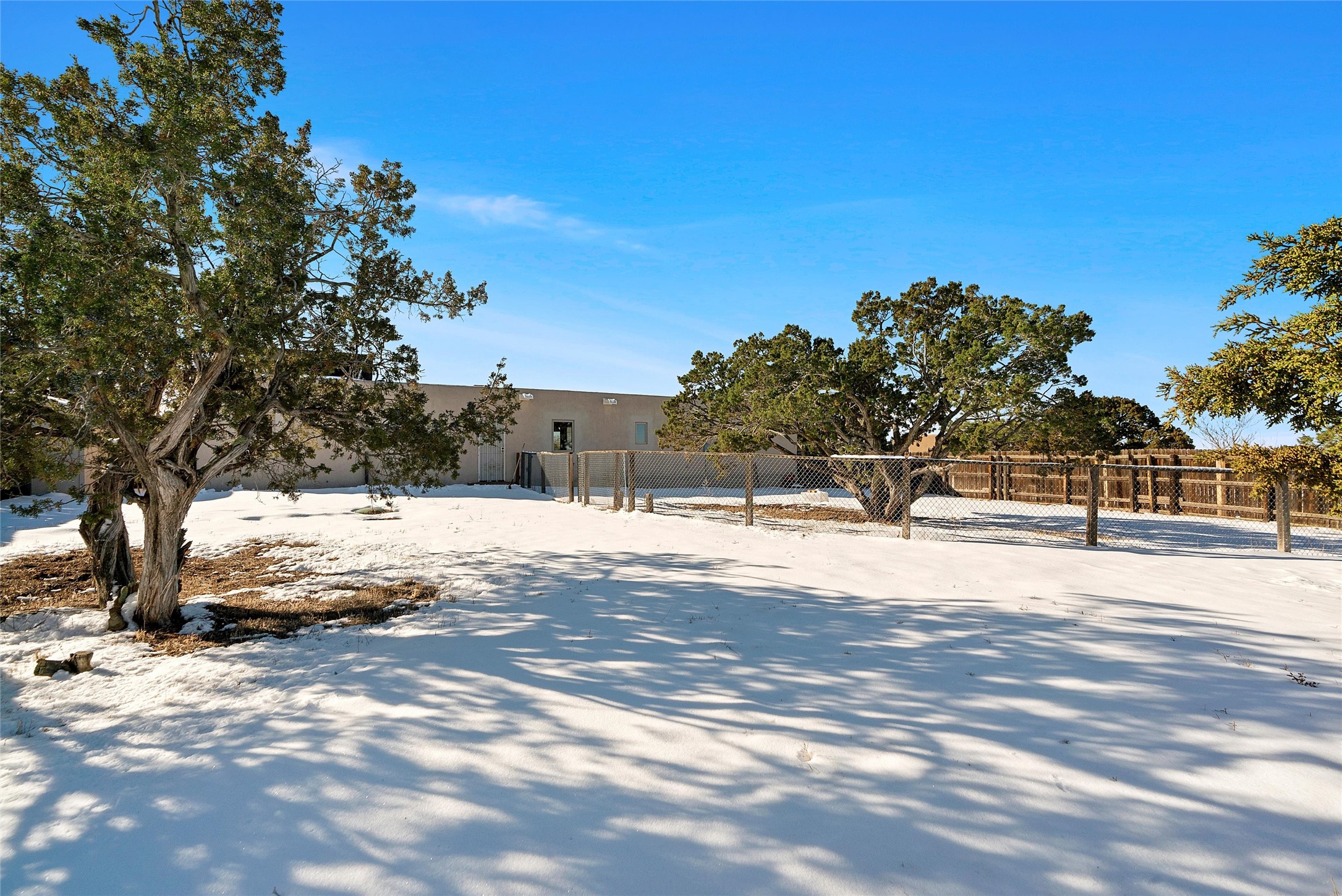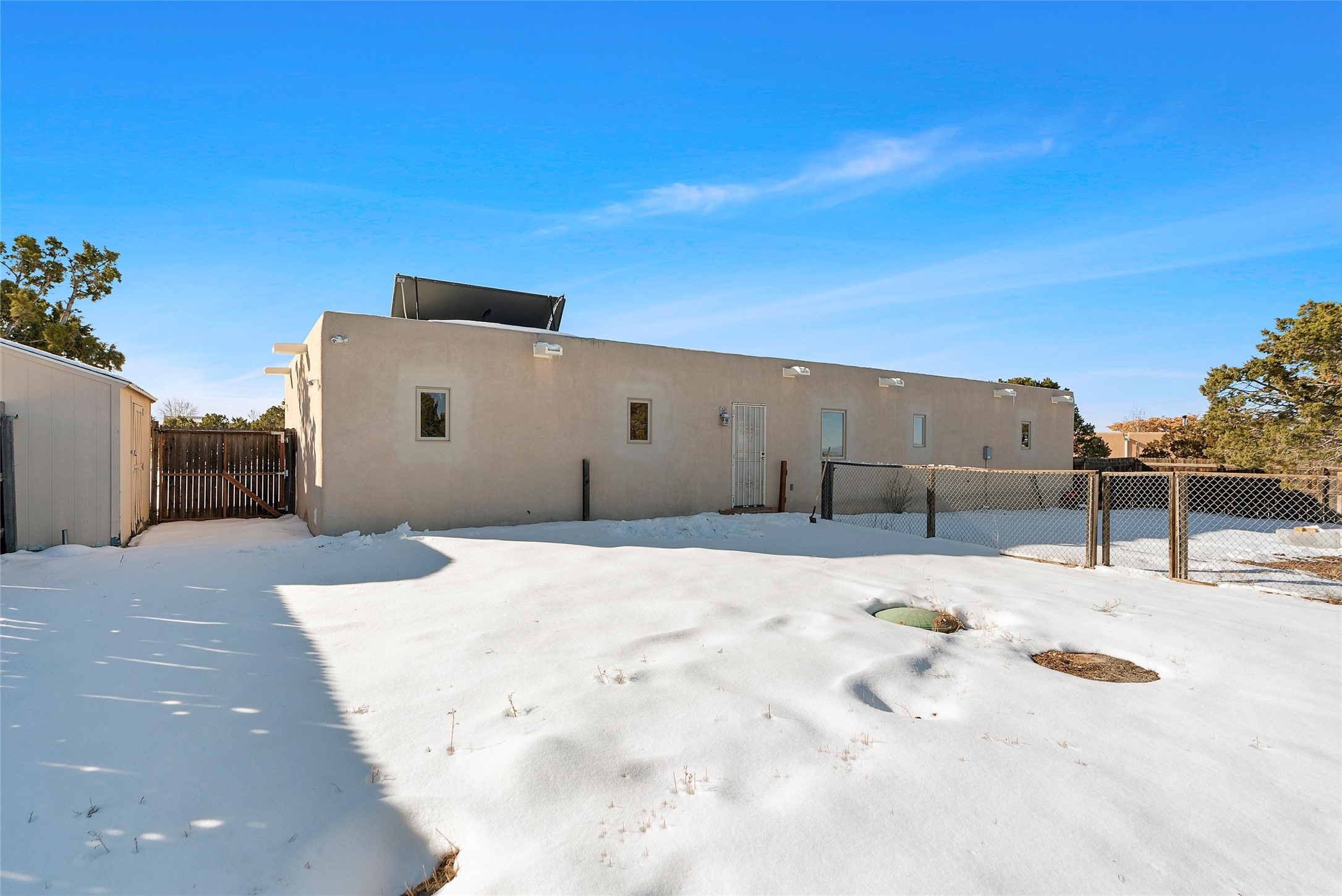 A lovely single-story home inside Eldorado Community. This spacious 1249 sq ft gem offers 2 bedrooms and a full bath with upgrades that include new Marvin windows, freshly painted interior, exterior trim & canales. Tile and carpet flooring throughout with Kiva wood-burning fireplace, vigas & beams ceiling, passive solar Trombe walls in both bedrooms & solar water heater. The exterior has a huge fenced backyard with a storage shed and offers unobstructed foothill views. The home is situated on 1.13 acres of land. Move-in ready and easy to show.