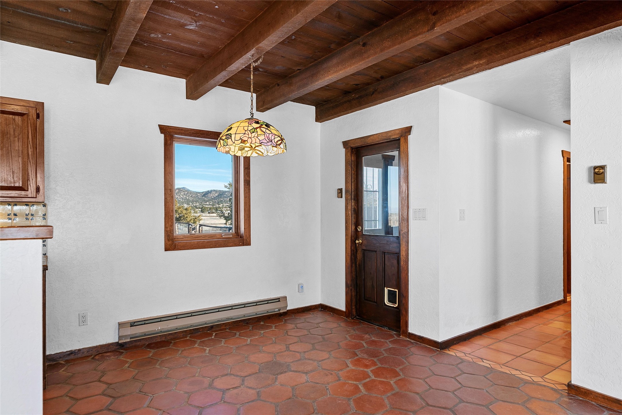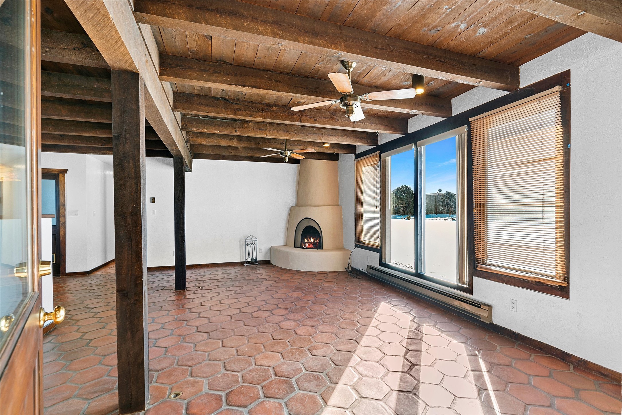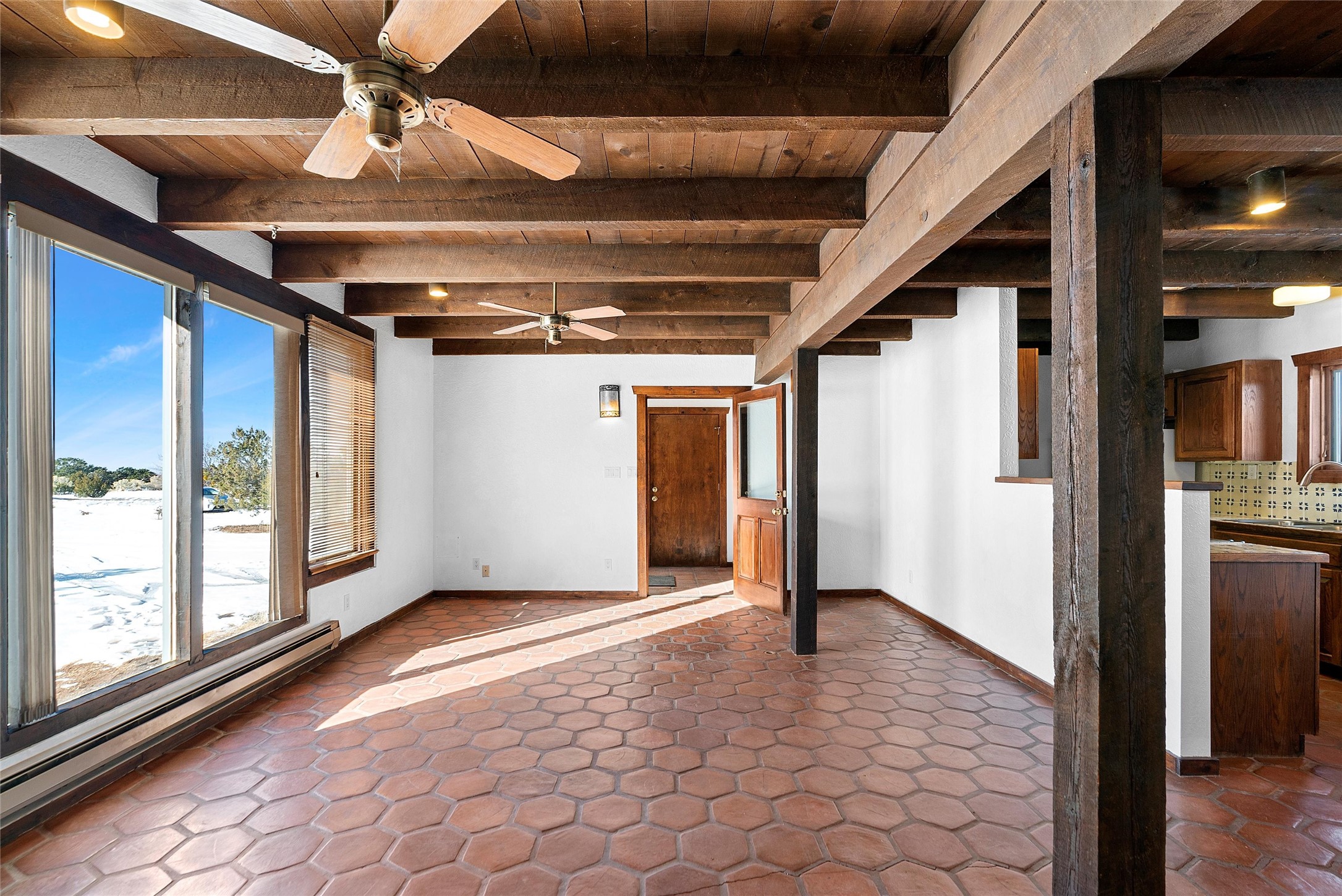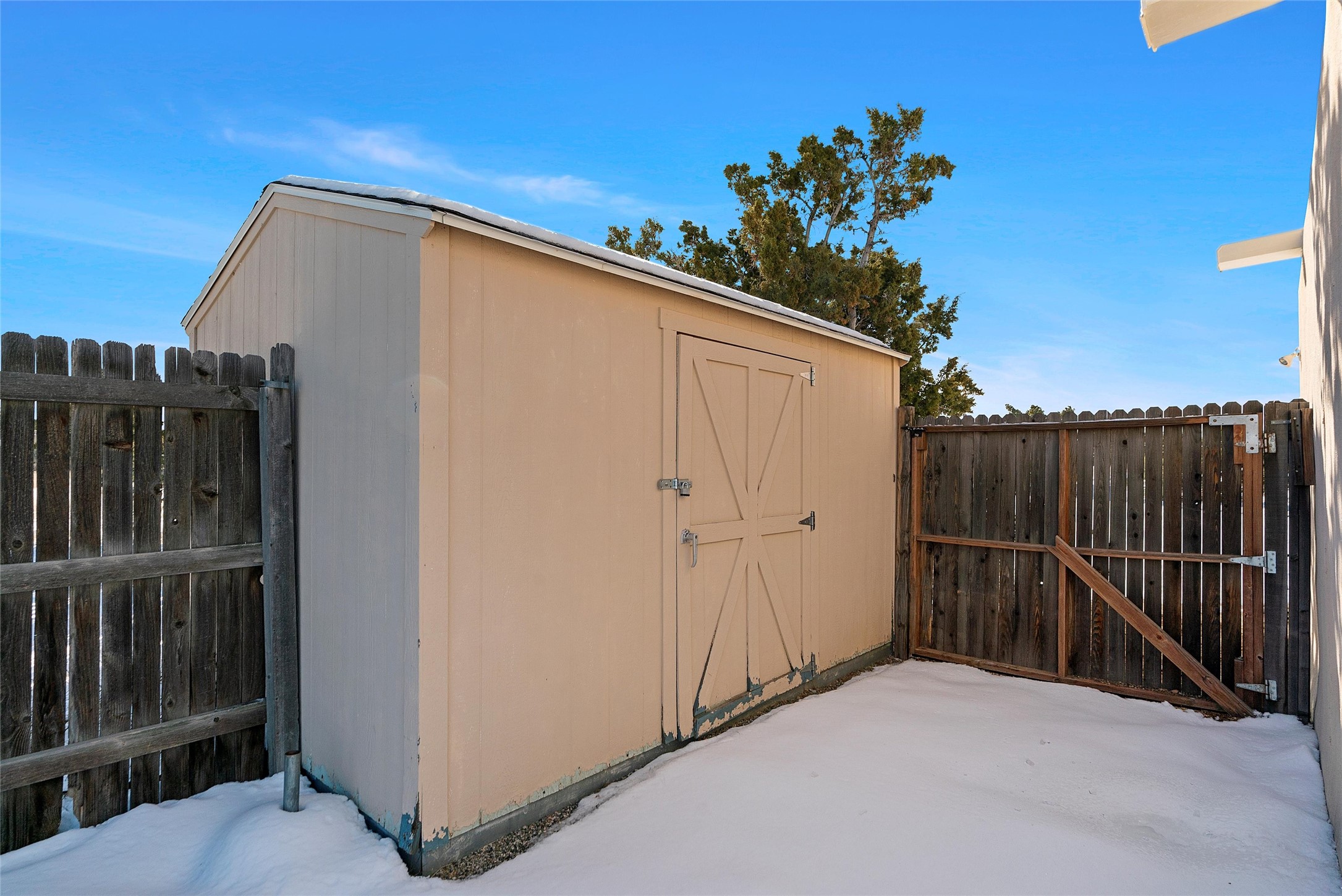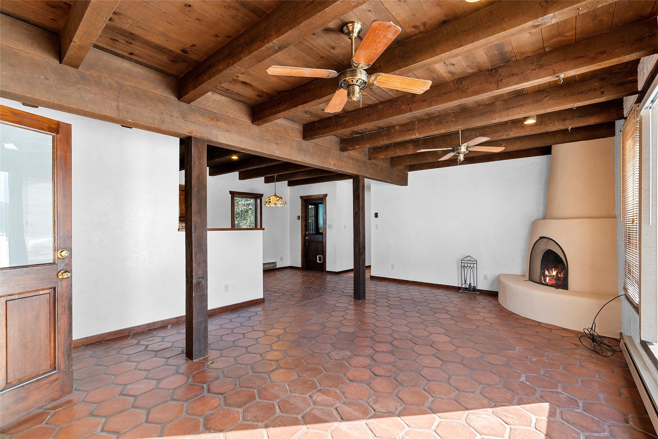 A lovely single-story home inside Eldorado Community. This spacious 1249 sq ft gem offers 2 bedrooms and a full bath with upgrades that include new Marvin windows, freshly painted interior, exterior trim & canales. Tile and carpet flooring throughout with Kiva wood-burning fireplace, vigas & beams ceiling, passive solar Trombe walls in both bedrooms & solar water heater. The exterior has a huge fenced backyard with a storage shed and offers unobstructed foothill views. The home is situated on 1.13 acres of land. Move-in ready and easy to show.