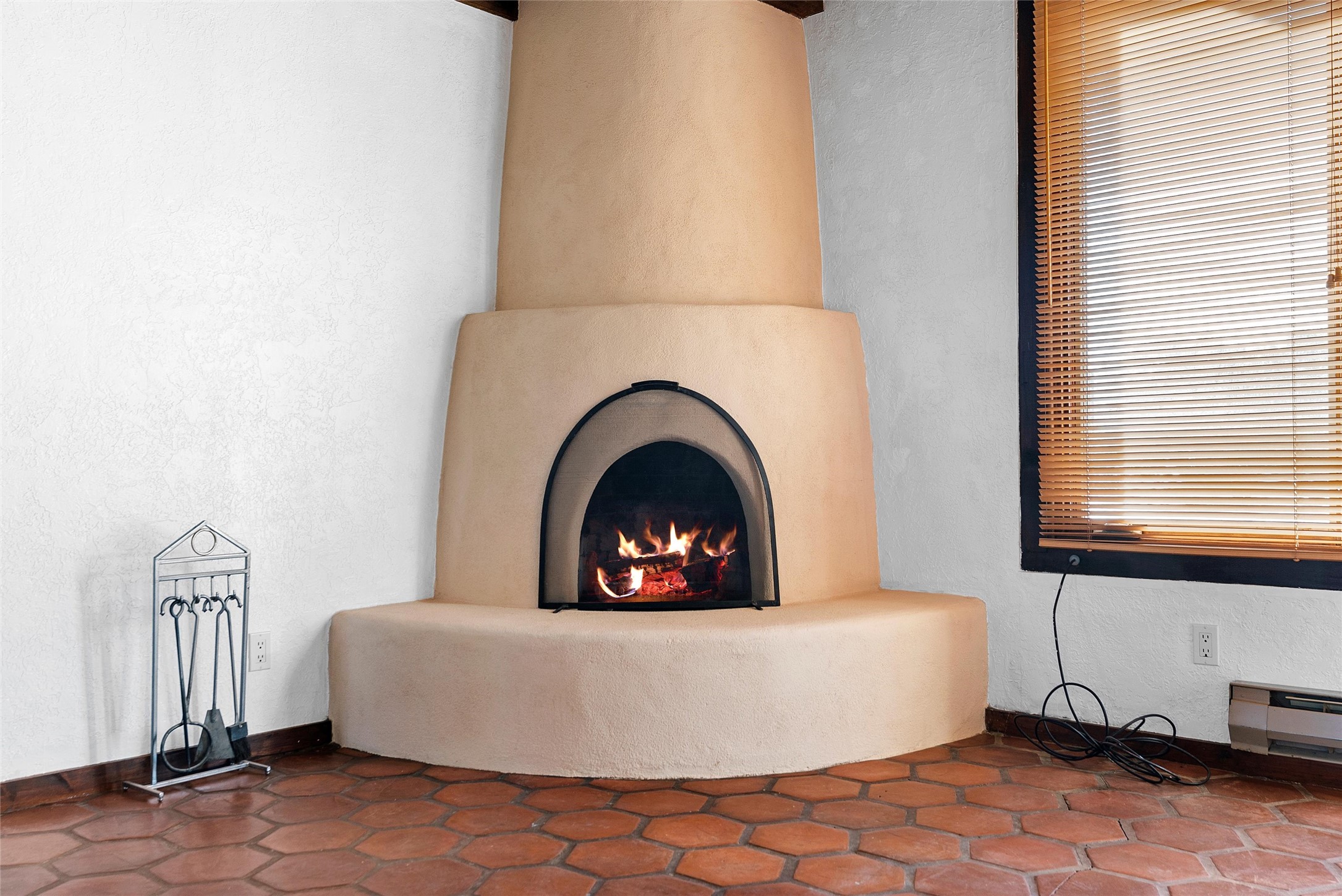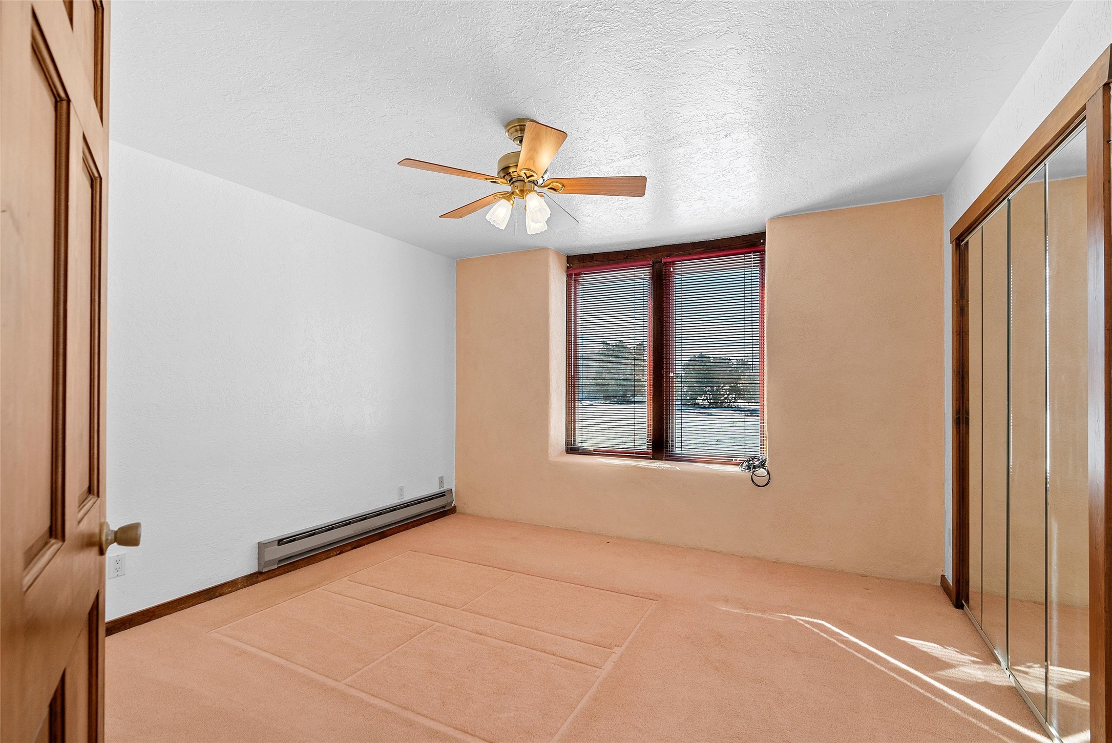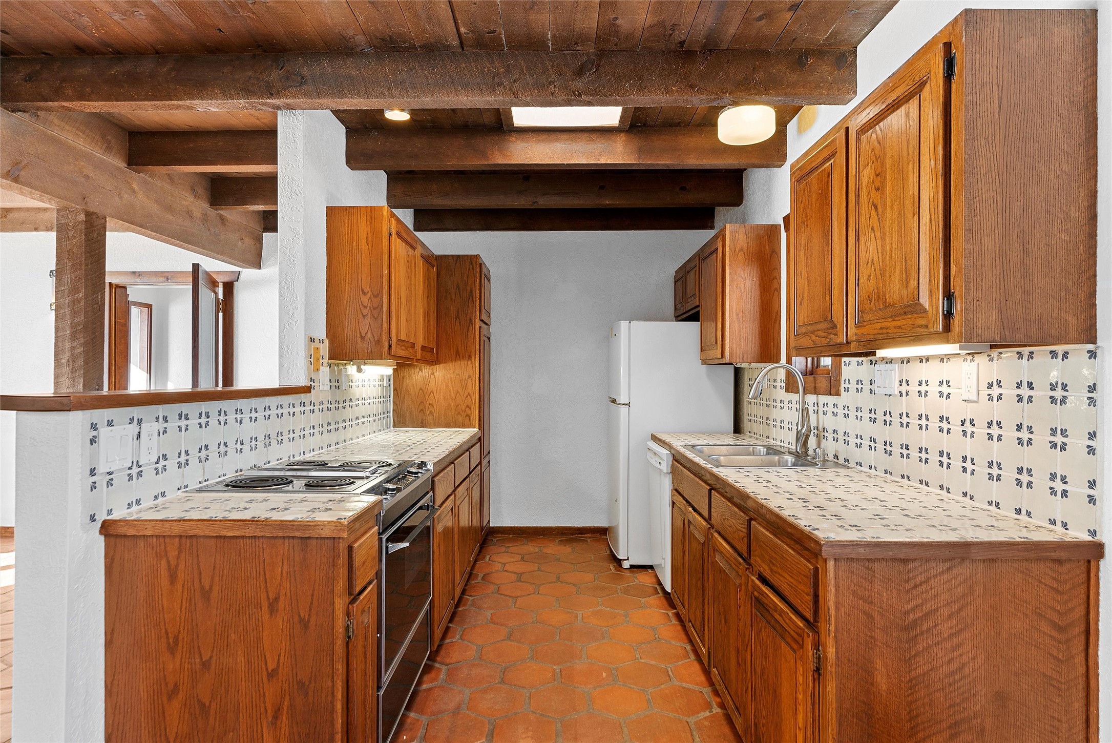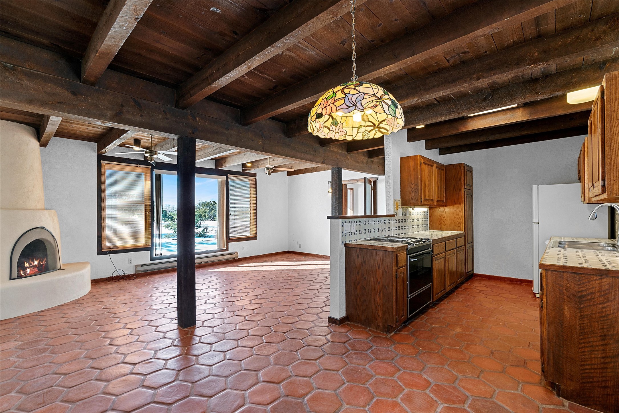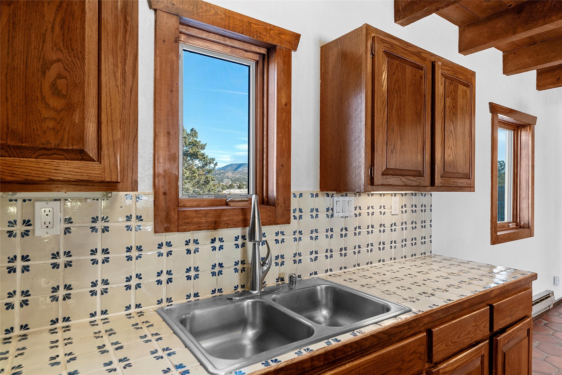 A lovely single-story home inside Eldorado Community. This spacious 1249 sq ft gem offers 2 bedrooms and a full bath with upgrades that include new Marvin windows, freshly painted interior, exterior trim & canales. Tile and carpet flooring throughout with Kiva wood-burning fireplace, vigas & beams ceiling, passive solar Trombe walls in both bedrooms & solar water heater. The exterior has a huge fenced backyard with a storage shed and offers unobstructed foothill views. The home is situated on 1.13 acres of land. Move-in ready and easy to show.