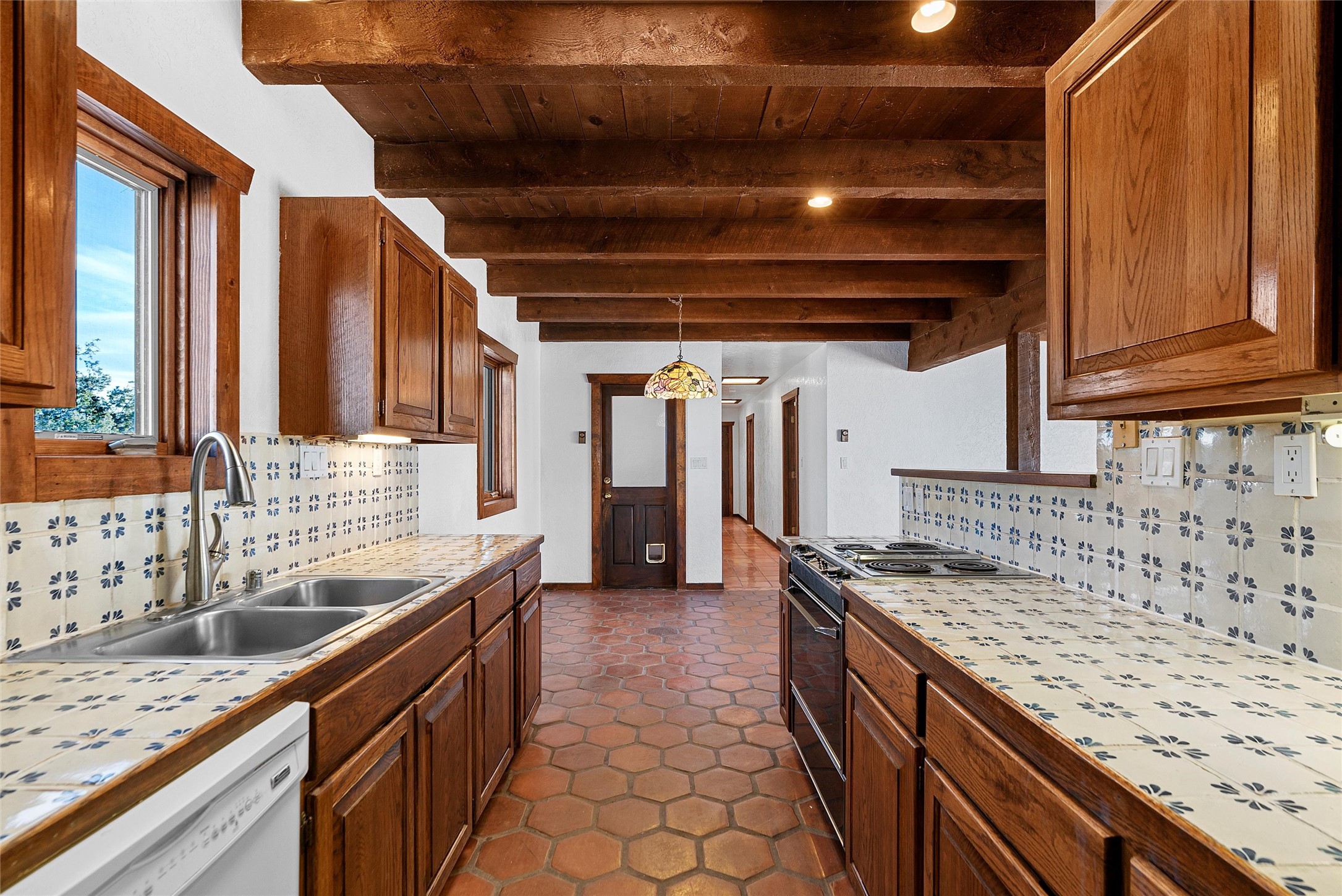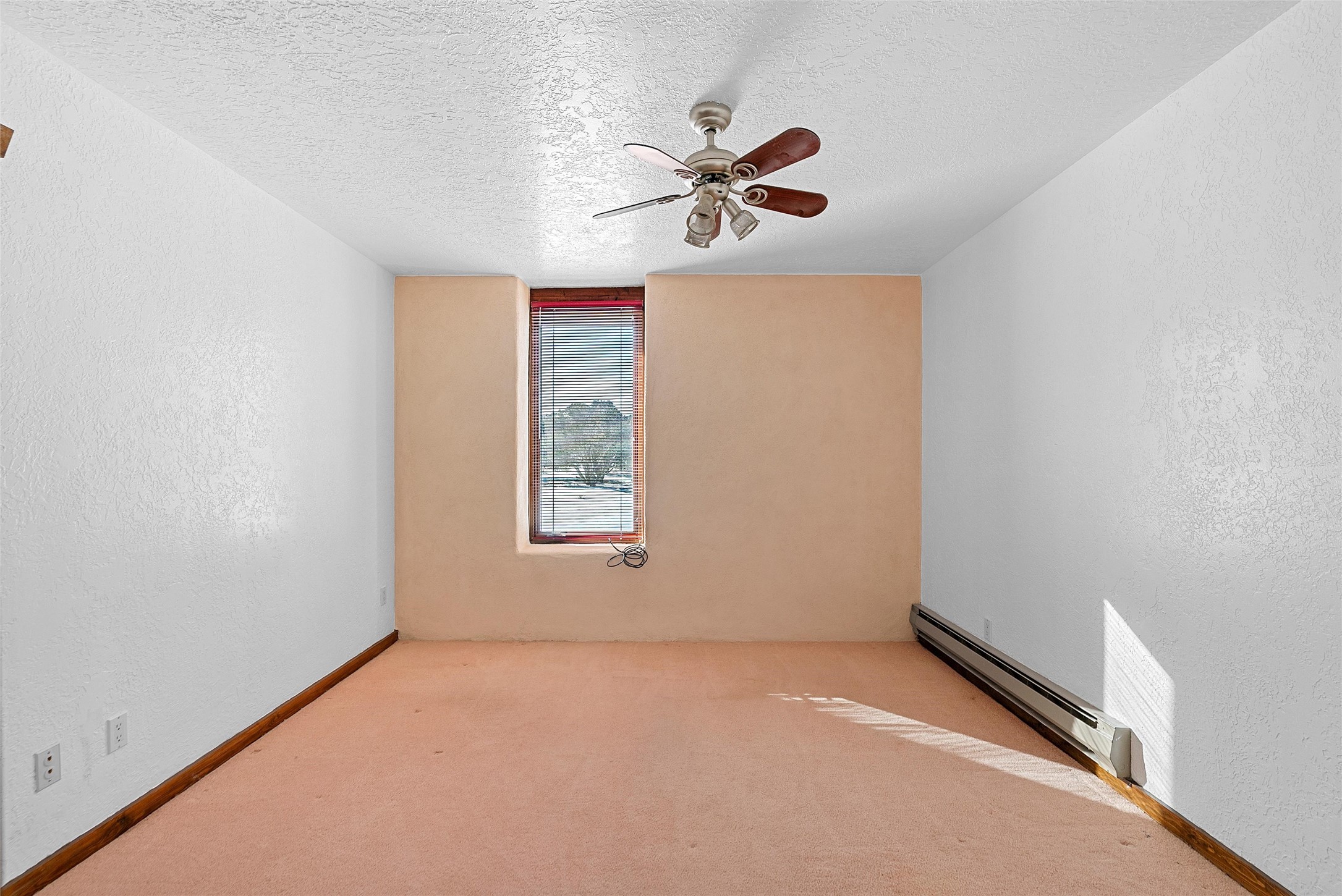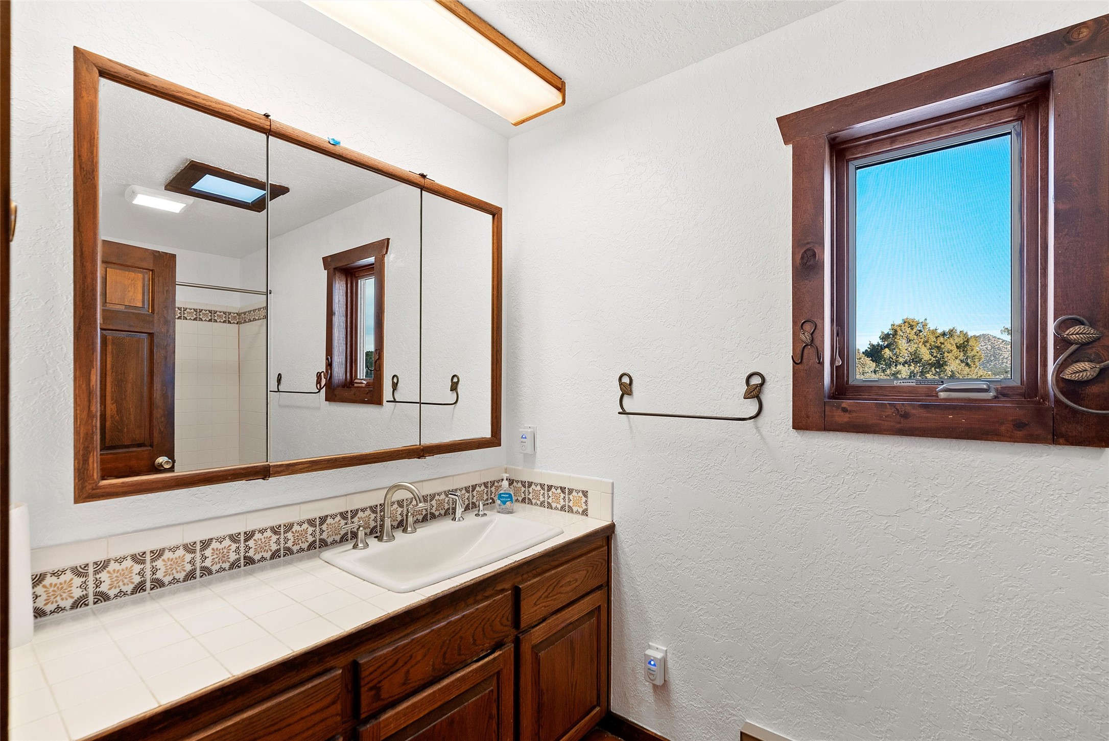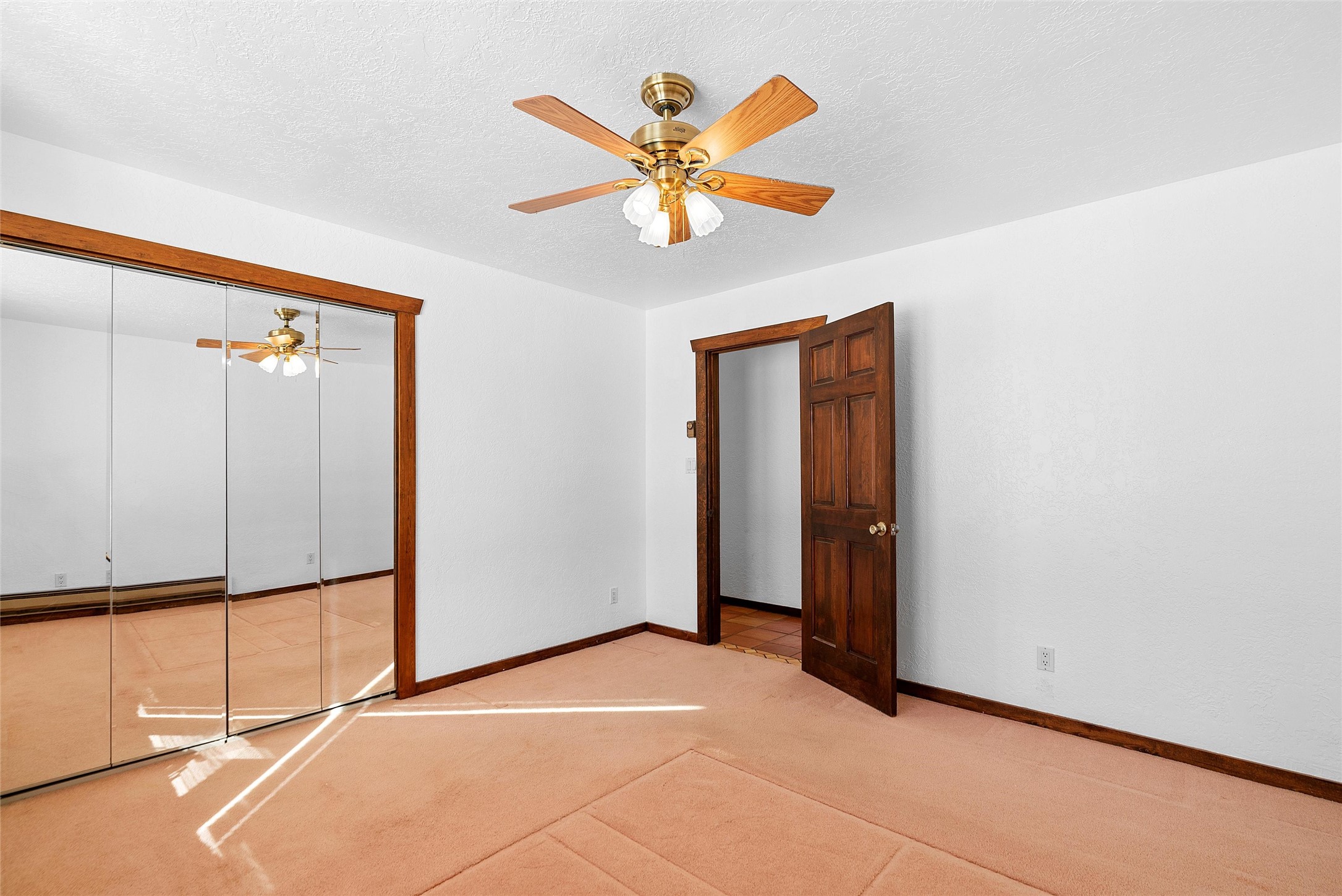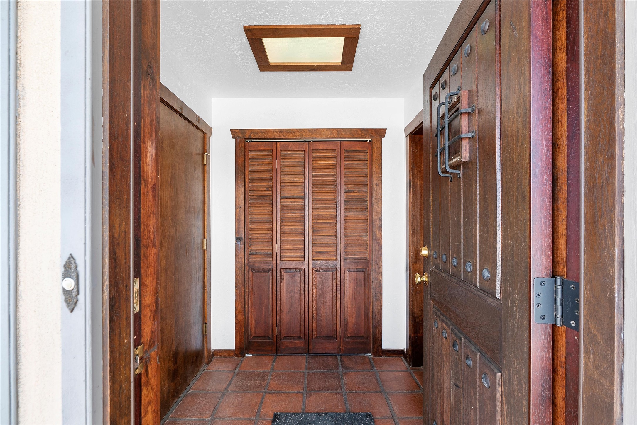 A lovely single-story home inside Eldorado Community. This spacious 1249 sq ft gem offers 2 bedrooms and a full bath with upgrades that include new Marvin windows, freshly painted interior, exterior trim & canales. Tile and carpet flooring throughout with Kiva wood-burning fireplace, vigas & beams ceiling, passive solar Trombe walls in both bedrooms & solar water heater. The exterior has a huge fenced backyard with a storage shed and offers unobstructed foothill views. The home is situated on 1.13 acres of land. Move-in ready and easy to show.