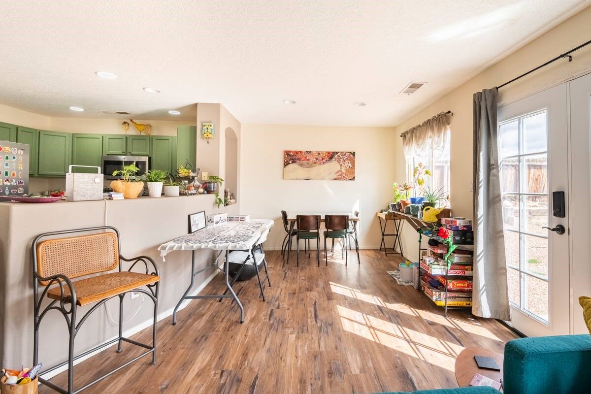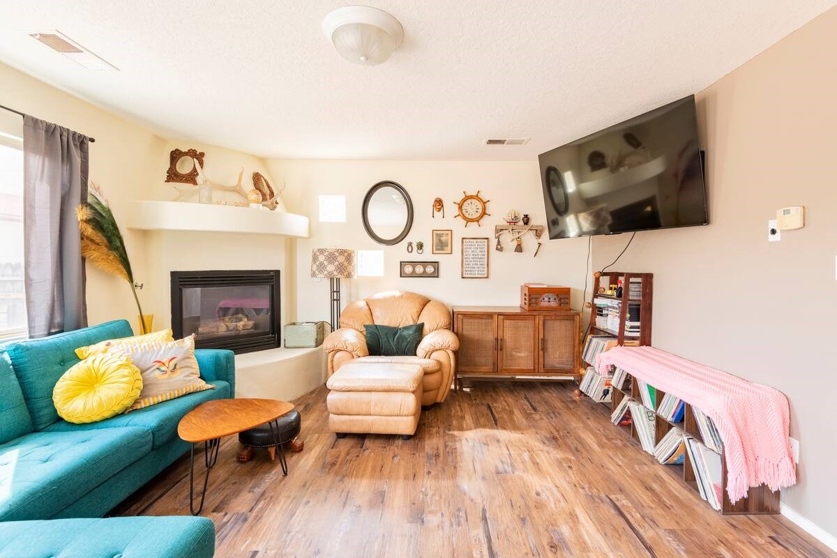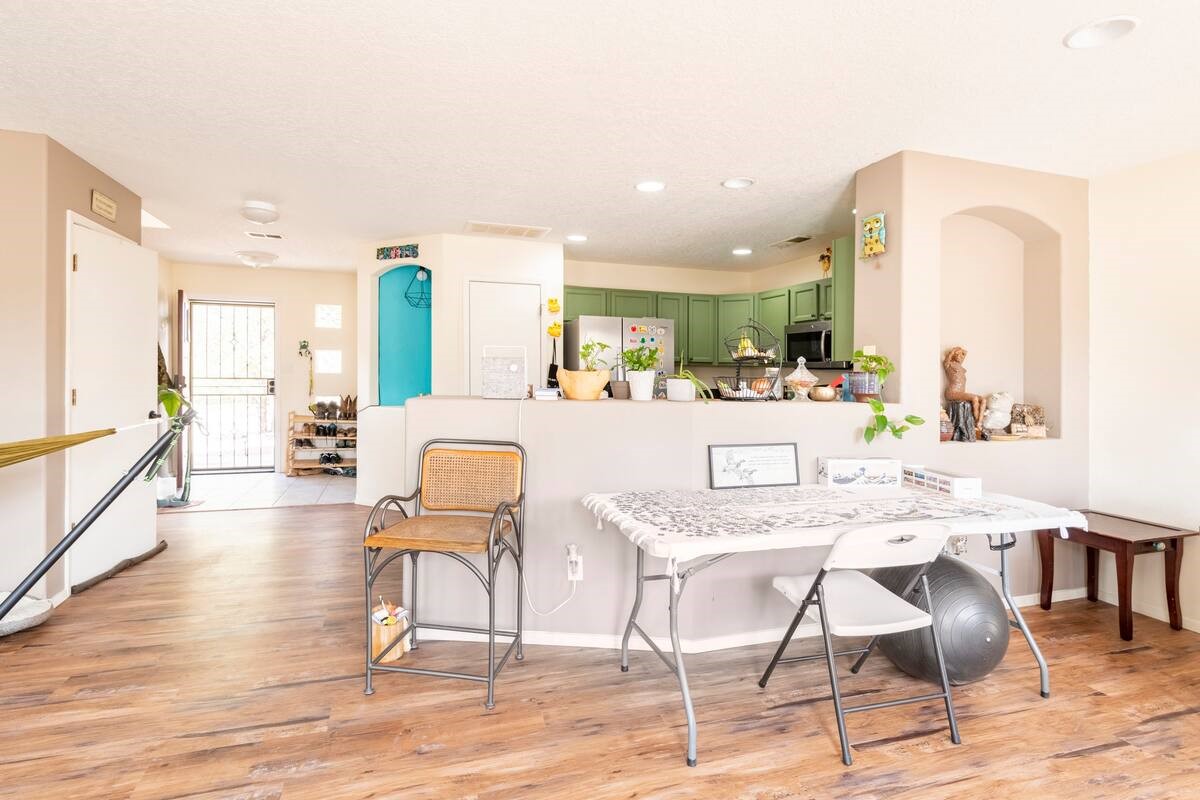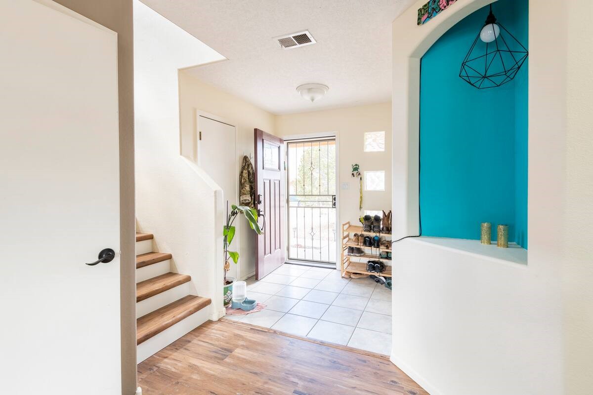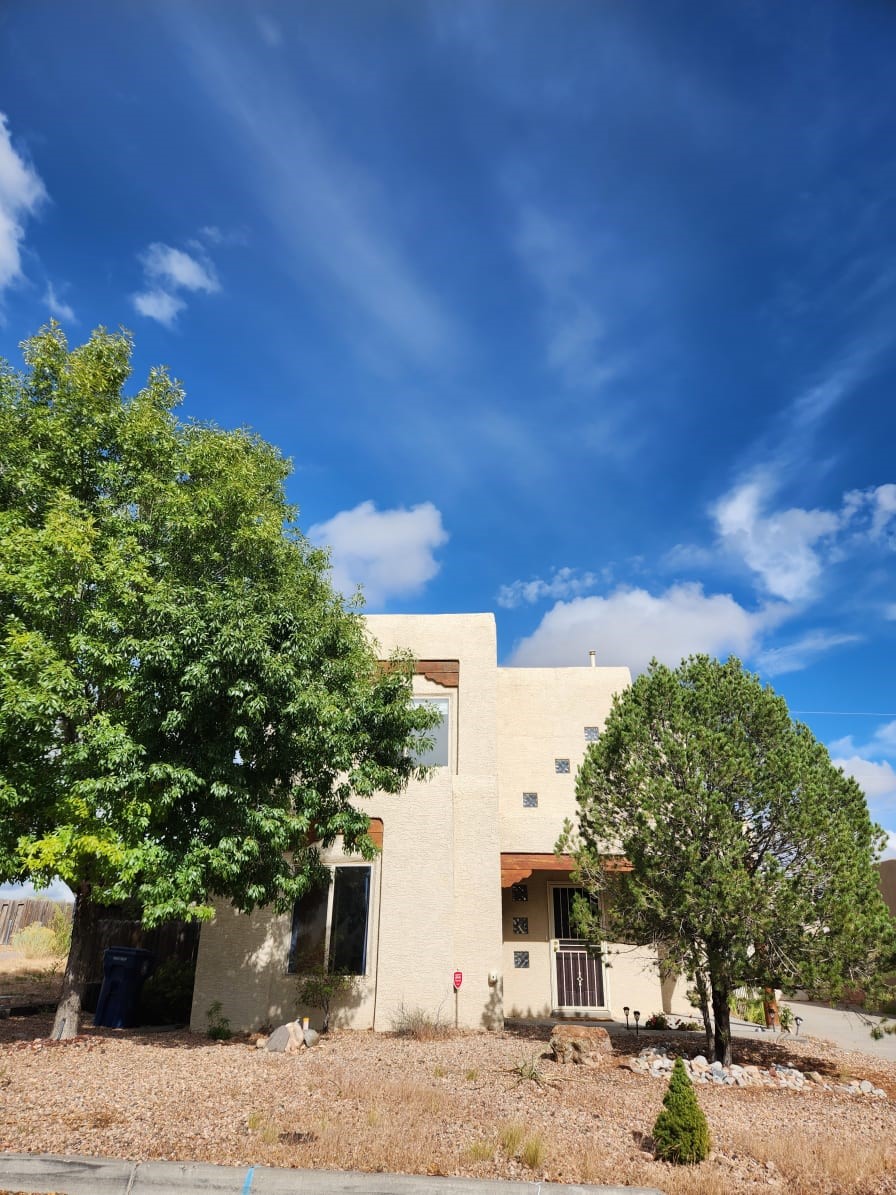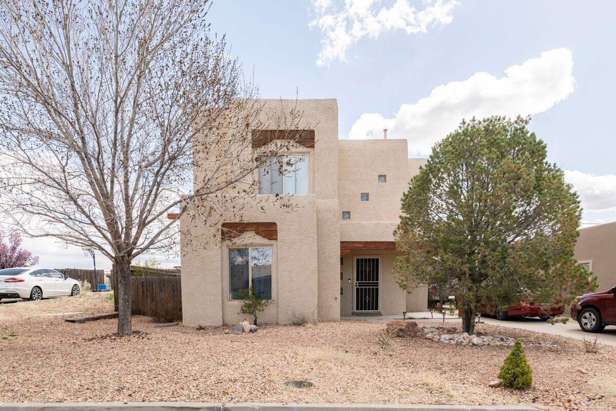 CHARMING SANTA FE pueblo style two-story on a desirable corner lot! Three bedrooms with a possible 4th for guests OR an office space for working at home in style! Special features like elegant nichos, a cozy gas fireplace and a fenced in dog run in your backyard make this one unique! The kitchen is a chef's dream with new Dekton counters and a deep farm sink. Recently installed life proof vinyl laminate flooring, 2023 water heater plus stylish fresh paint make the space feel modern and up to date. The open-concept floor plan seamlessly combines the living room with its inviting gas fireplace, a spacious kitchen, and a welcoming dining area - perfect for hosting gatherings and making lasting memories. All three bedrooms are thoughtfully positioned upstairs, ensuring privacy and tranquility. The primary bedroom has an ensuite bathroom and a convenient walk-in closet. Notably, this home is equipped with solar panels, contributing to remarkably affordable electric bills while promoting eco-friendliness. Keyless entry locks on both front and back doors, a fully fenced backyard and a detached two-car garage, ensure security and convenience. In the front yard, xeriscaping showcases low-maintenance landscaping, adding to the home's curb appeal. In addition, both front and back yards are equipped with a drip irrgation system making yard maintenance easy. Beyond the property's boundaries, wide-open spaces and nearby parks await, promising leisurely strolls and outdoor adventures for the whole family to enjoy. Enjoy the best of Santa Fe living today! Call now for a private tour and more info!