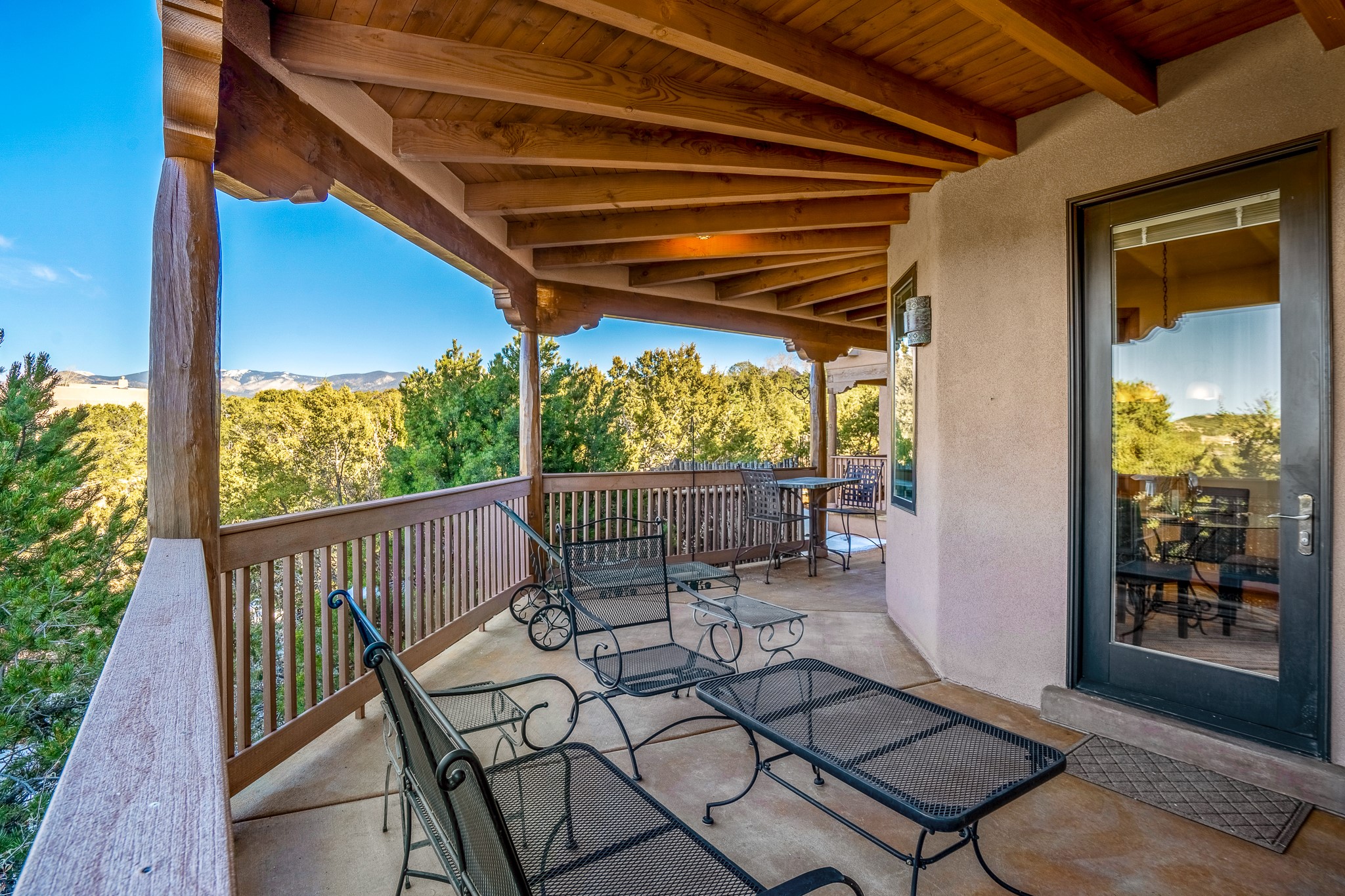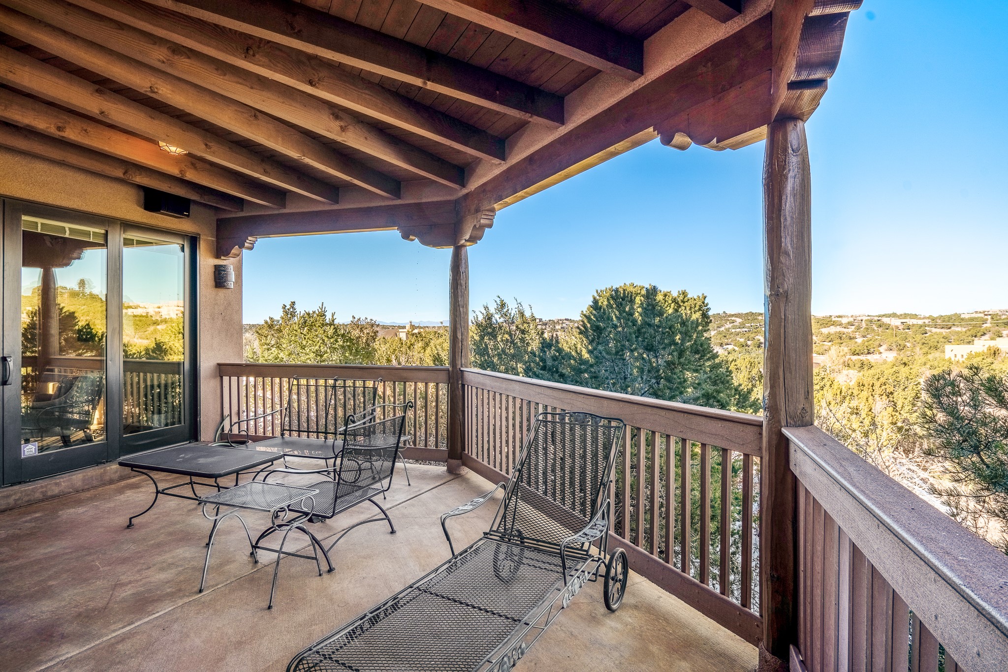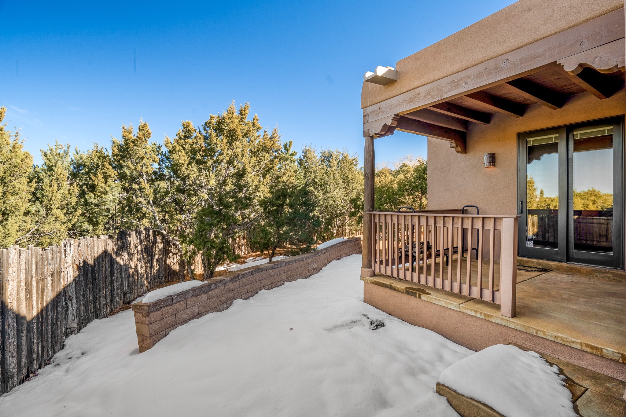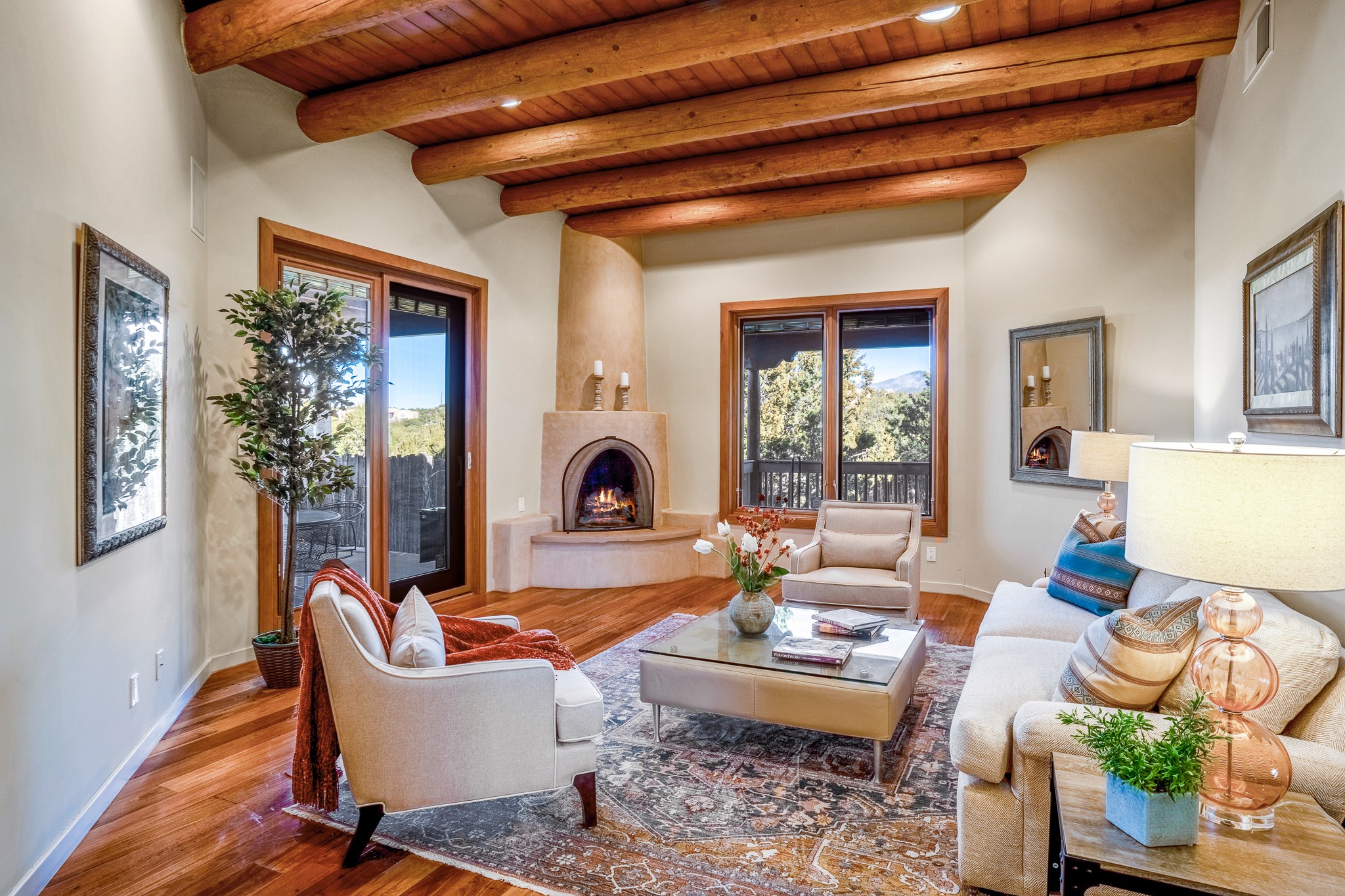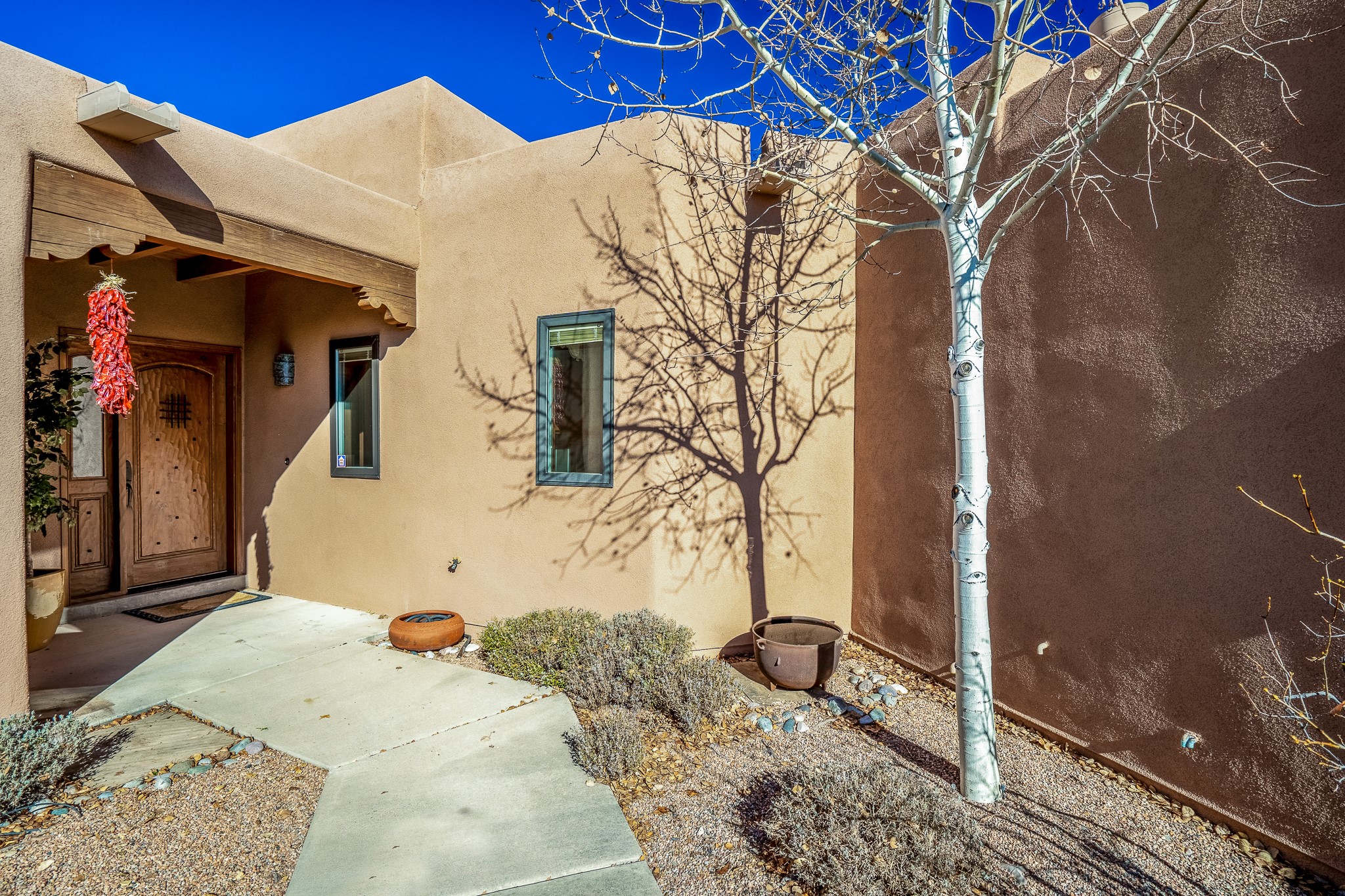 Elegant home on an almost 2 acre lot at the peak of the Las Estrellas with great views of the Sangre De Cristos and Jemez mountains. Just a few minutes from downtown Santa Fe, this is a warm and inviting home ready to move in and impeccably maintained by the original owner. Built in 2007 by Beverly Chapman, this three bedroom, three bath 2771 square foot home offers a spacious floor plan perfect for entertaining and comfortable living. The gourmet kitchen features high end appliances and granite countertops. With a private primary suite, two additional bedrooms and landscaped outdoor spaces, this home embodies the tranquility and elegance of Santa Fe living. The formal dining and living rooms and cozy den with kiva fireplace offer a variety of living spaces to share with your family and guests. The spacious three car garage has built in storage cabinets and ample workspace for projects. Whether you're sipping coffee in the morning or stargazing at night, this residence provides a front row seat to the natural beauty that defines Santa Fe. Embrace the serenity and awe inspiring vistas that make this property truly extraordinary.