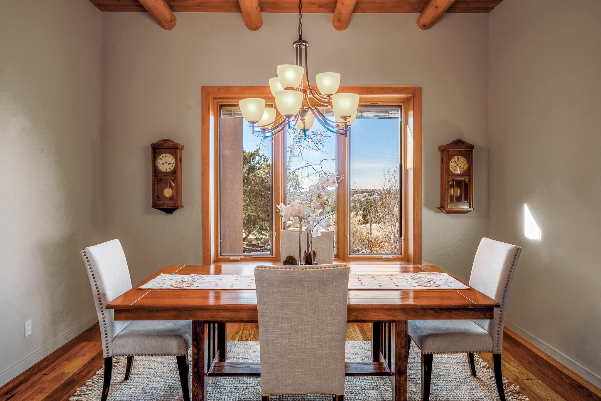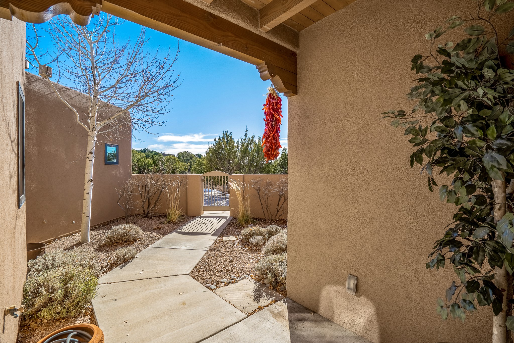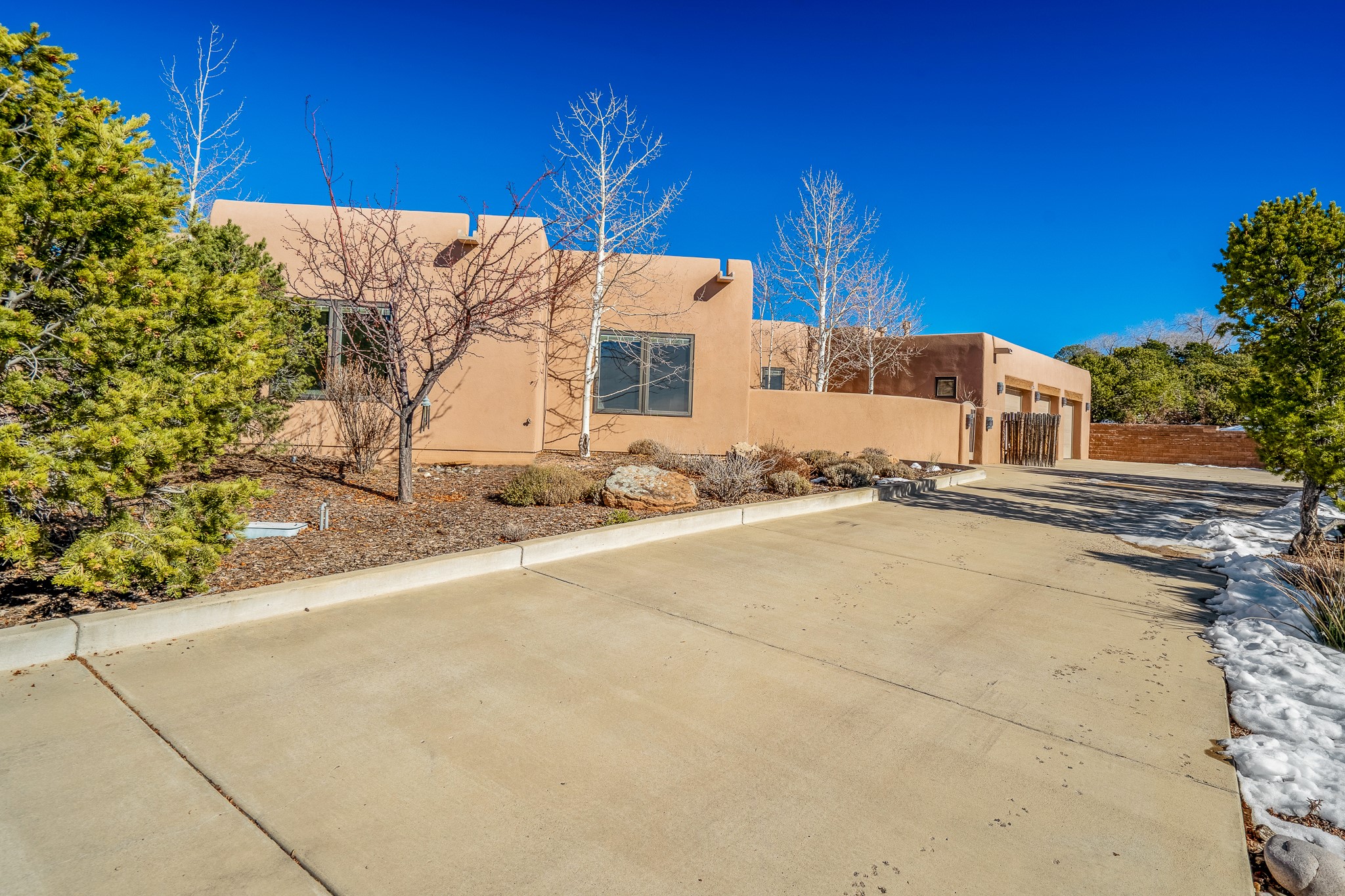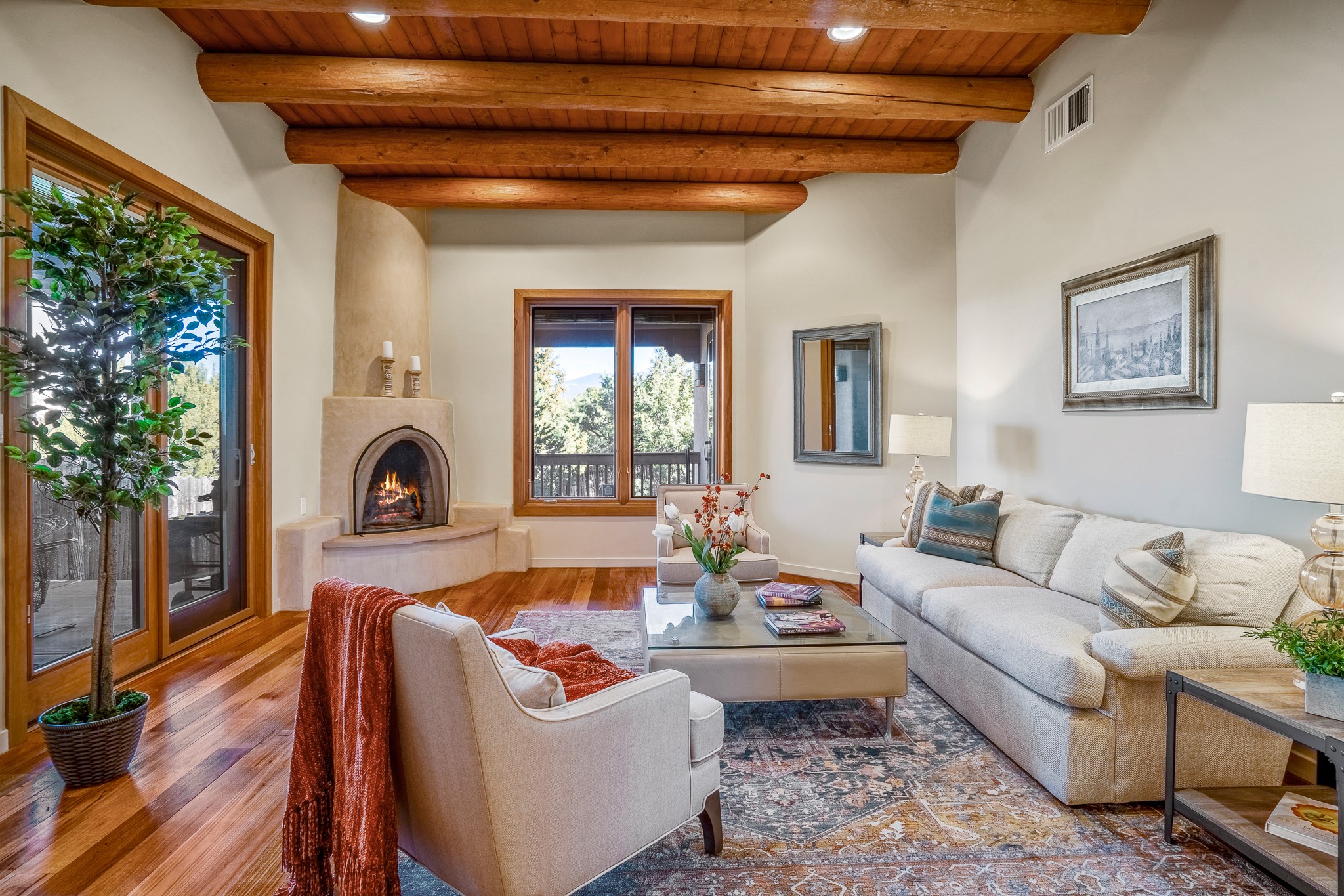 Elegant home on an almost 2 acre lot at the peak of the Las Estrellas with great views of the Sangre De Cristos and Jemez mountains. Just a few minutes from downtown Santa Fe, this is a warm and inviting home ready to move in and impeccably maintained by the original owner. Built in 2007 by Beverly Chapman, this three bedroom, three bath 2771 square foot home offers a spacious floor plan perfect for entertaining and comfortable living. The gourmet kitchen features high end appliances and granite countertops. With a private primary suite, two additional bedrooms and landscaped outdoor spaces, this home embodies the tranquility and elegance of Santa Fe living. The formal dining and living rooms and cozy den with kiva fireplace offer a variety of living spaces to share with your family and guests. The spacious three car garage has built in storage cabinets and ample workspace for projects. Whether you're sipping coffee in the morning or stargazing at night, this residence provides a front row seat to the natural beauty that defines Santa Fe. Embrace the serenity and awe inspiring vistas that make this property truly extraordinary.