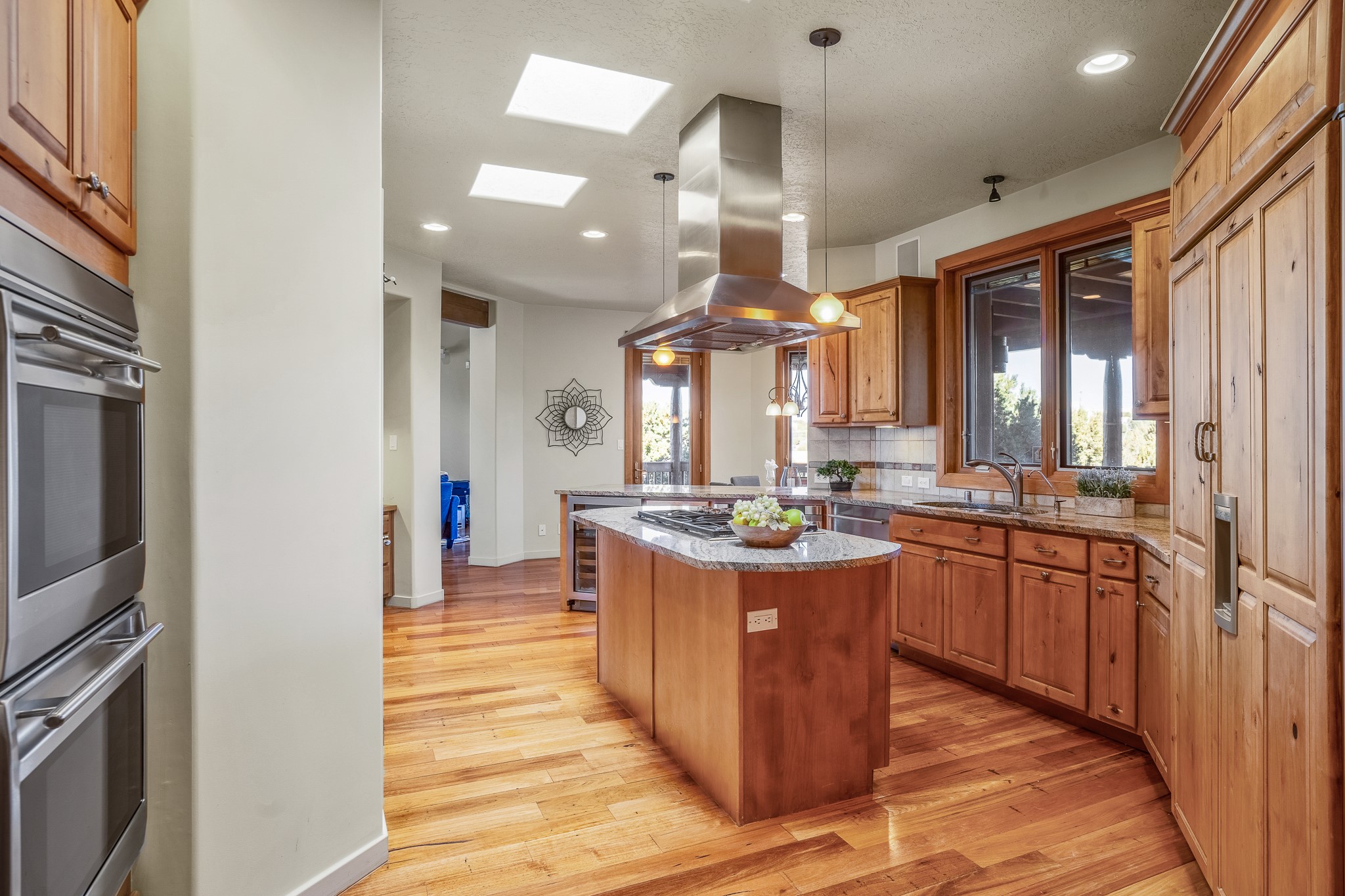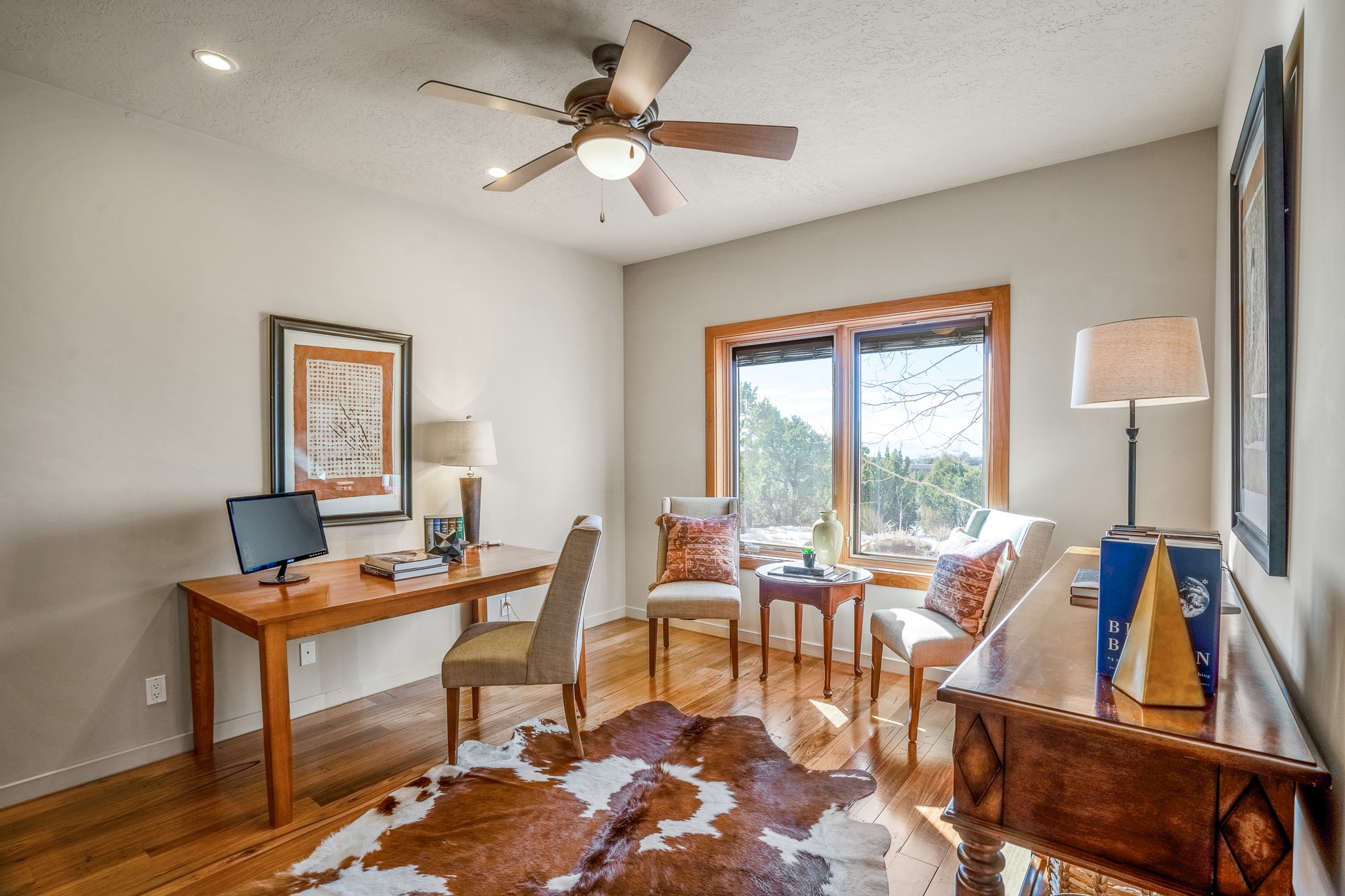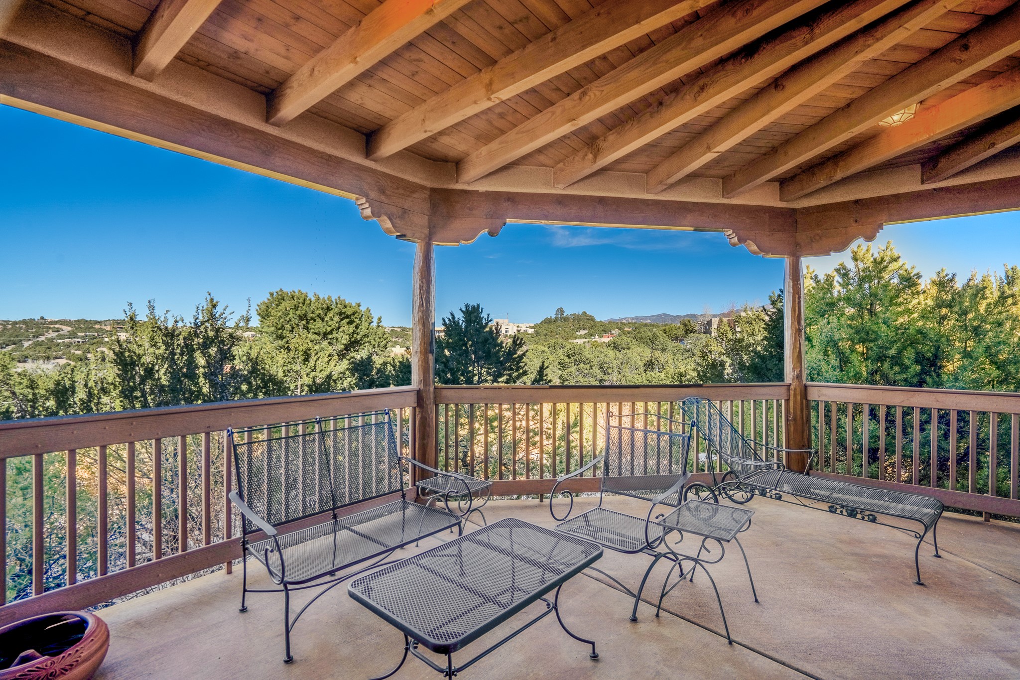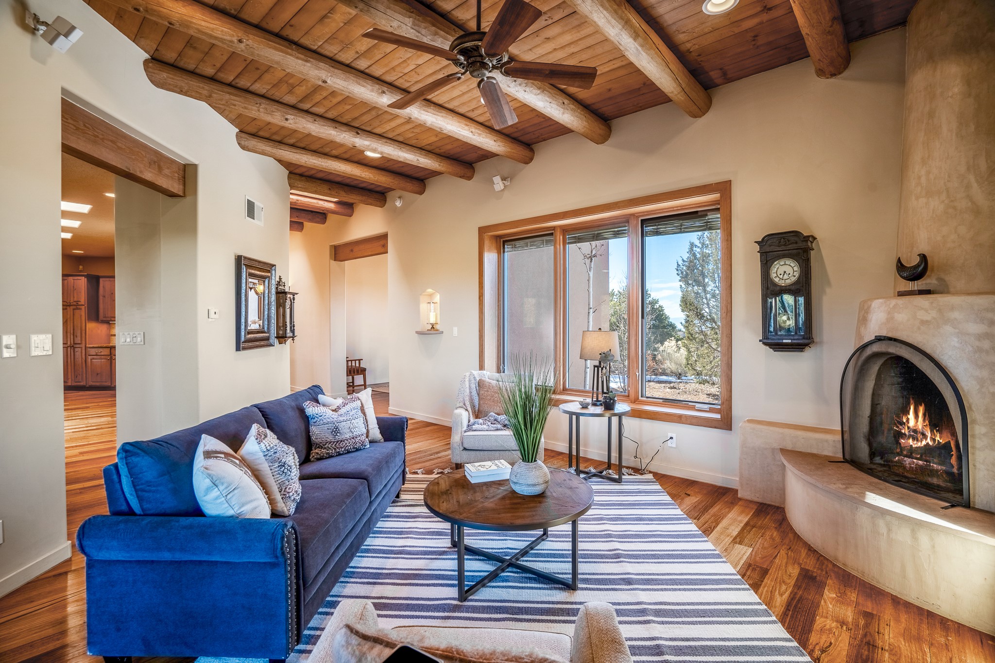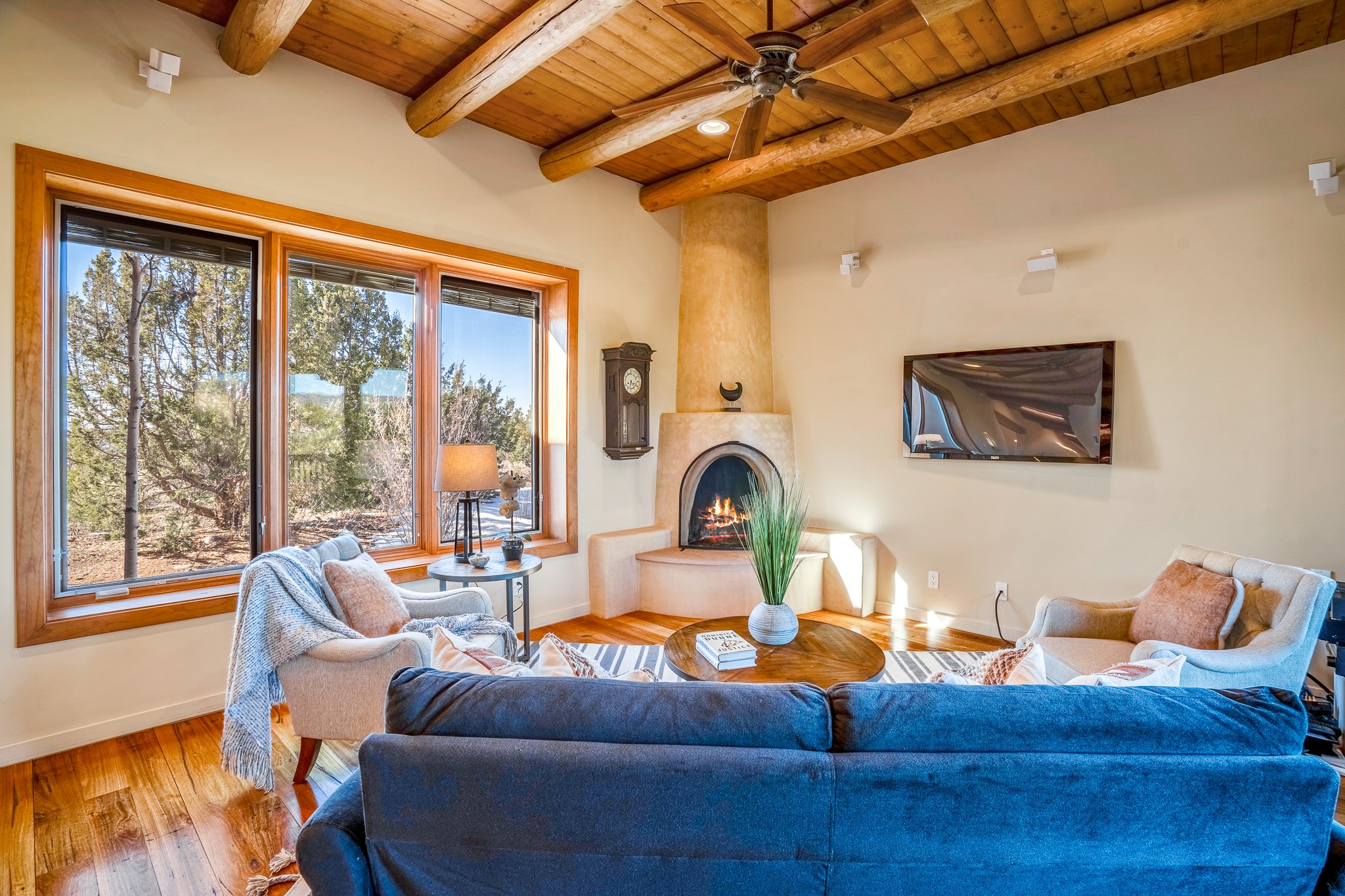 Elegant home on an almost 2 acre lot at the peak of the Las Estrellas with great views of the Sangre De Cristos and Jemez mountains. Just a few minutes from downtown Santa Fe, this is a warm and inviting home ready to move in and impeccably maintained by the original owner. Built in 2007 by Beverly Chapman, this three bedroom, three bath 2771 square foot home offers a spacious floor plan perfect for entertaining and comfortable living. The gourmet kitchen features high end appliances and granite countertops. With a private primary suite, two additional bedrooms and landscaped outdoor spaces, this home embodies the tranquility and elegance of Santa Fe living. The formal dining and living rooms and cozy den with kiva fireplace offer a variety of living spaces to share with your family and guests. The spacious three car garage has built in storage cabinets and ample workspace for projects. Whether you're sipping coffee in the morning or stargazing at night, this residence provides a front row seat to the natural beauty that defines Santa Fe. Embrace the serenity and awe inspiring vistas that make this property truly extraordinary.