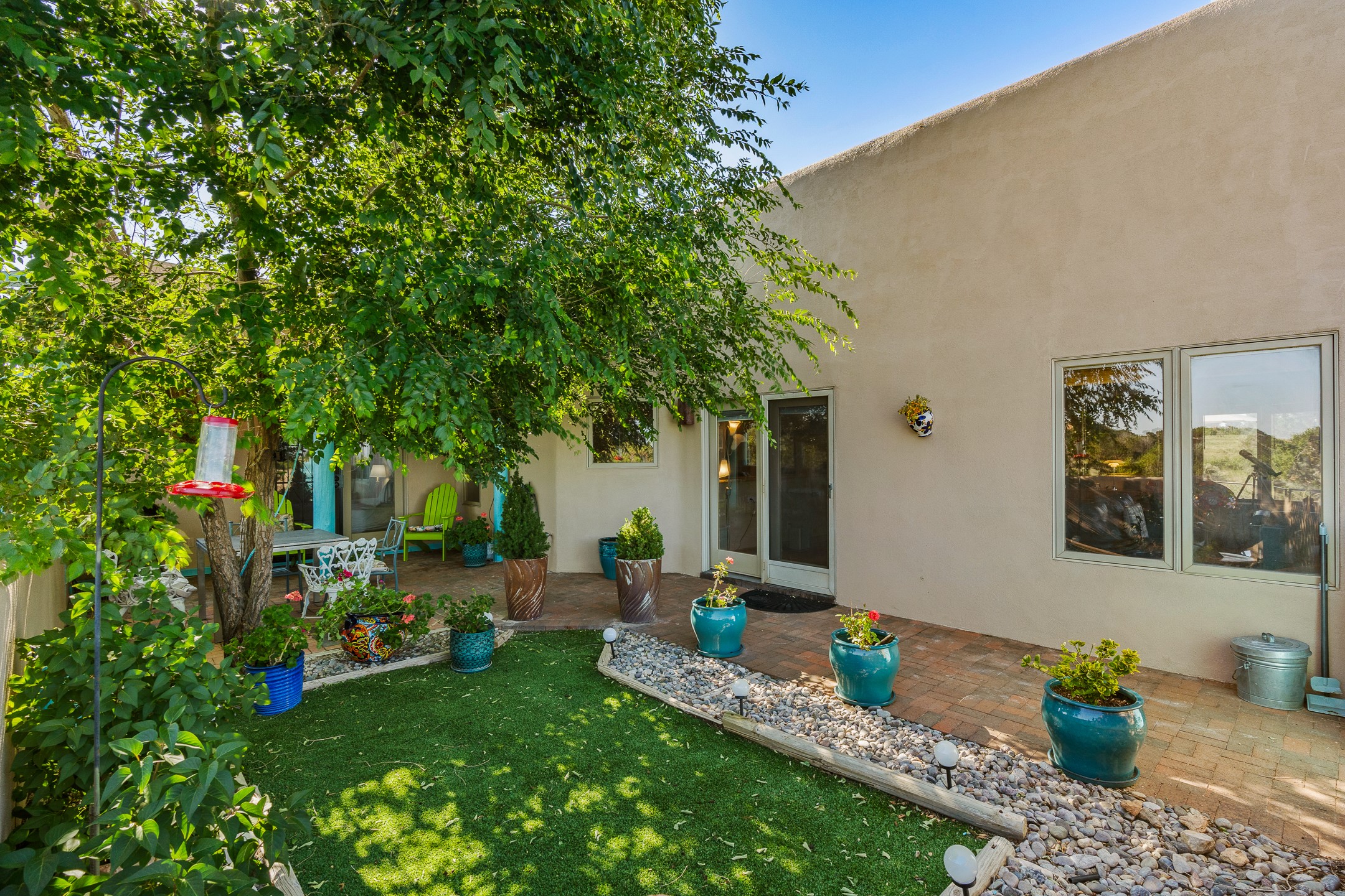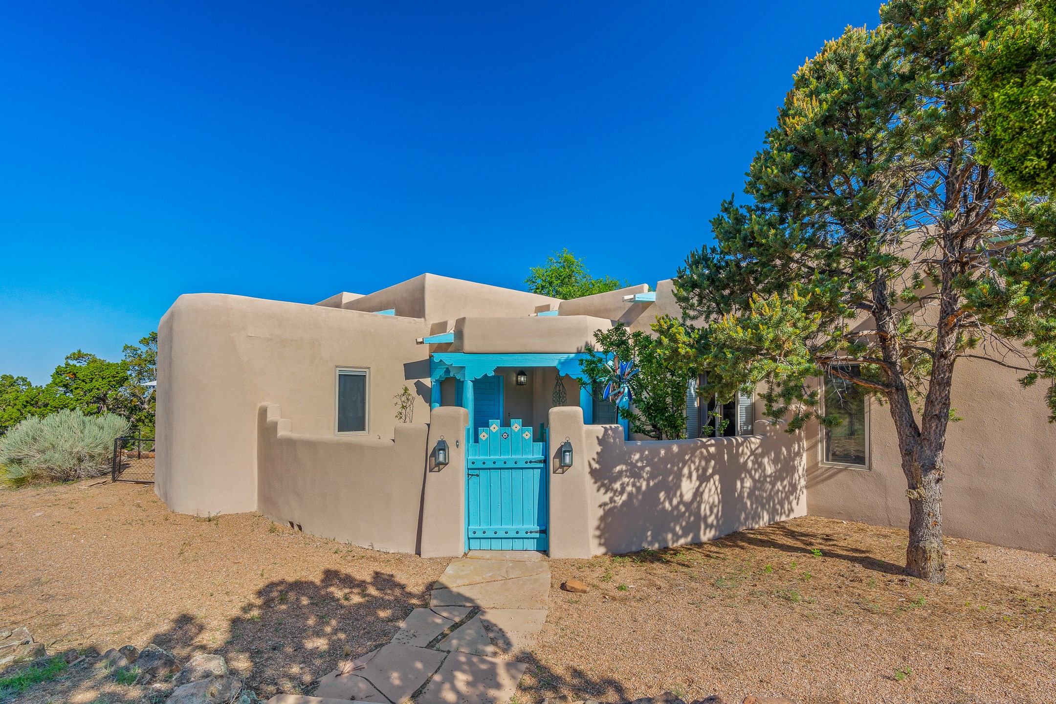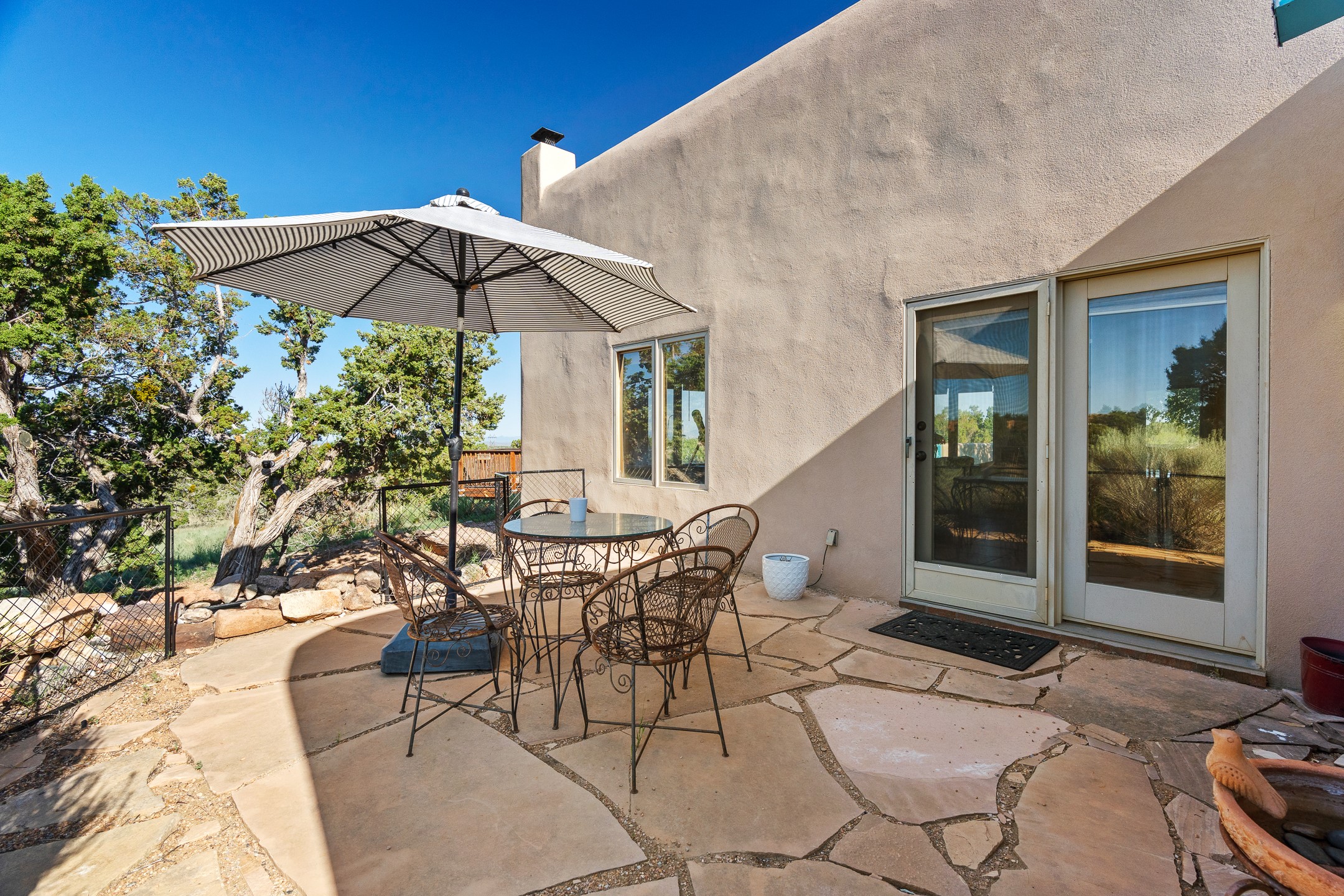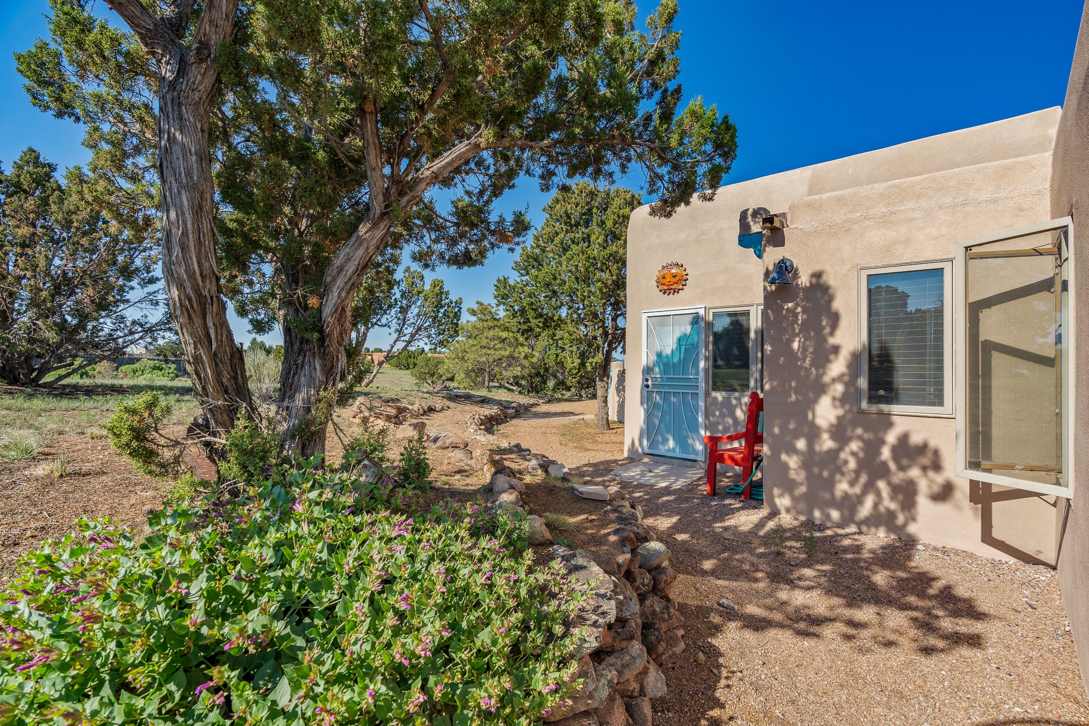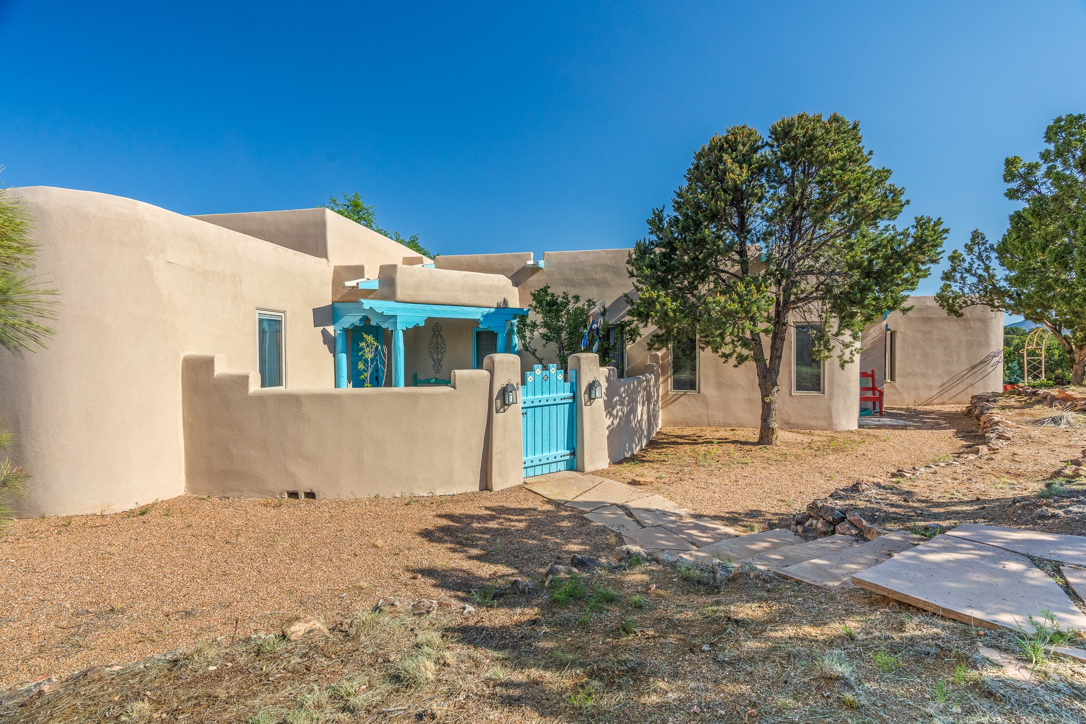 A hidden gem nestled at the end of the cul-de-sac! As soon as you walk in the door, you can feel the quality of craftsmanship and the care that has been put into this property. The formal entryway provides the perfect introduction to a large open concept living room with high ceilings, beautiful vigas and a view towards the chef's kitchen, which features granite countertops, custom pull-out drawers, and high end appliances. From the living room and primary bedroom windows, your eye travels to distant mountains. A unique and sensible floorplan, there are two guest bedrooms each with their own outdoor access. There is also an office space that is currently being used as a painting studio, with a newly added bathroom as well. The primary suite is large and cool, with wonderful closet space, and features "his" and "hers" sinks in the primary bathroom. This home would be ideal for anyone who had family members or guests coming to stay, as each would have their own entrance if desired. The meticulously manicured grounds will please even the most discerning buyers. The exterior wood and stucco have just been painted. The current sellers have pruned the trees and underbrush throughout the property. There is even a viewing deck that showcases the surrounding mountain ranges! Don't miss this absolute gem of a property. Schedule a showing today!