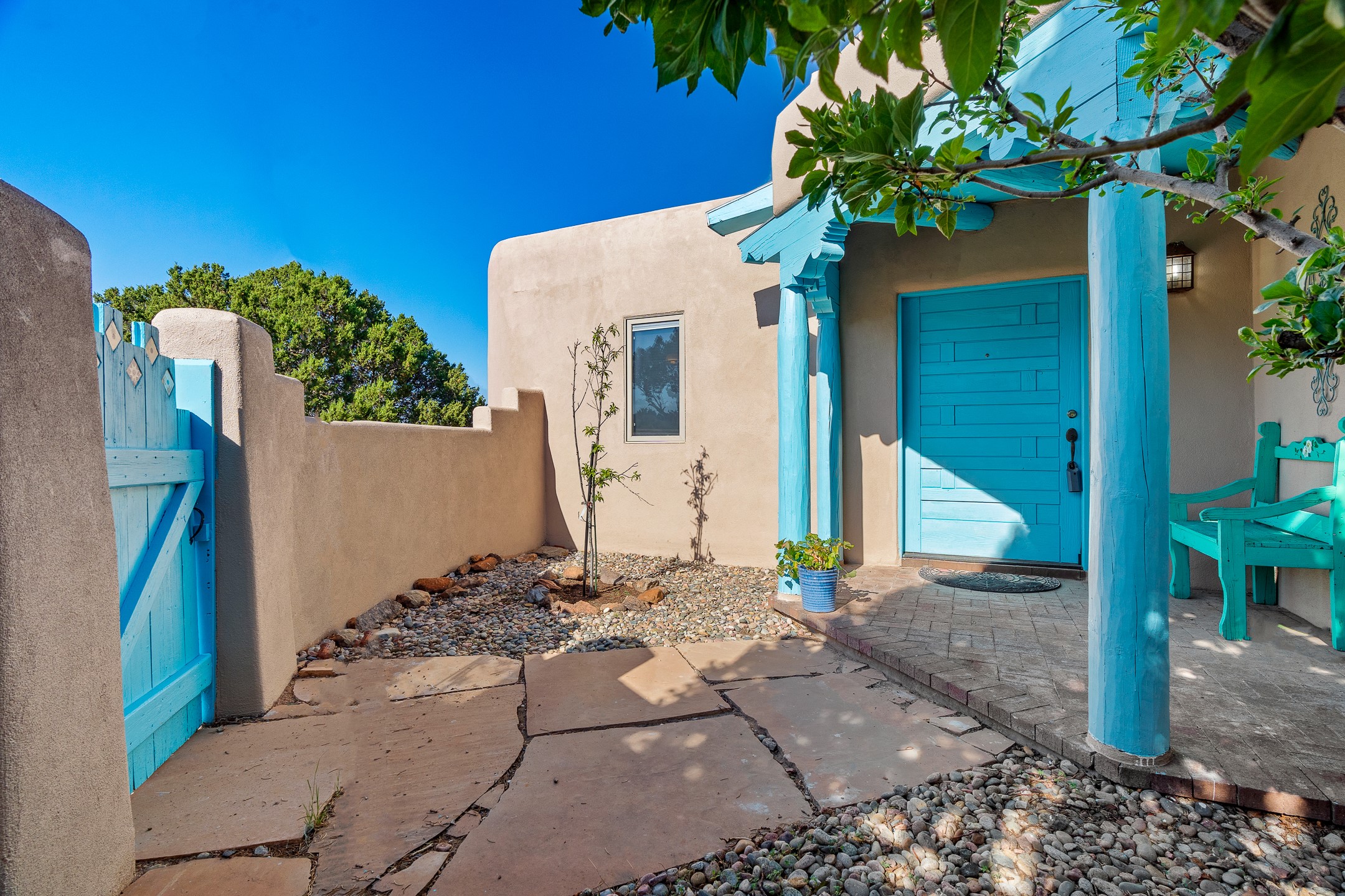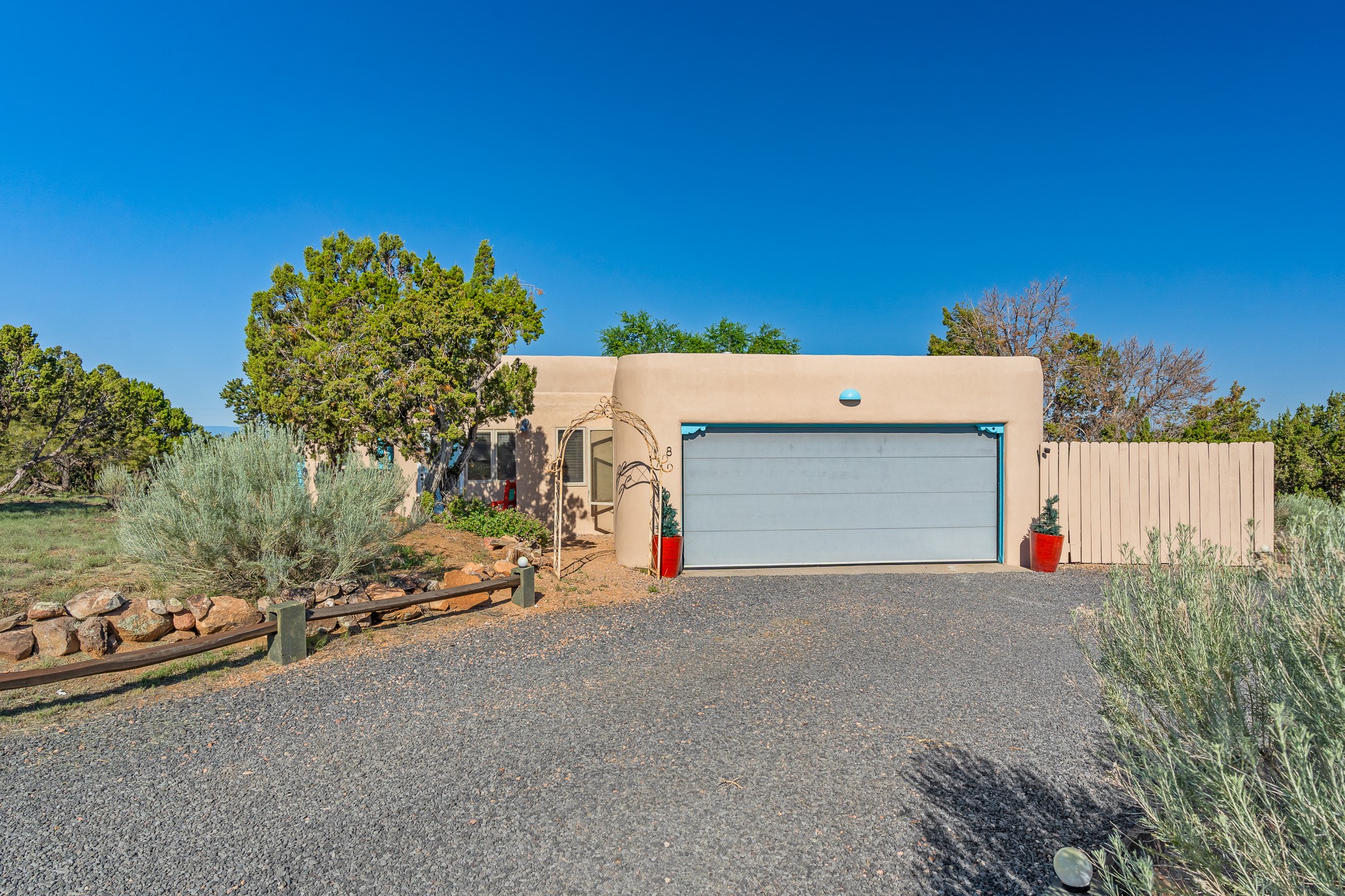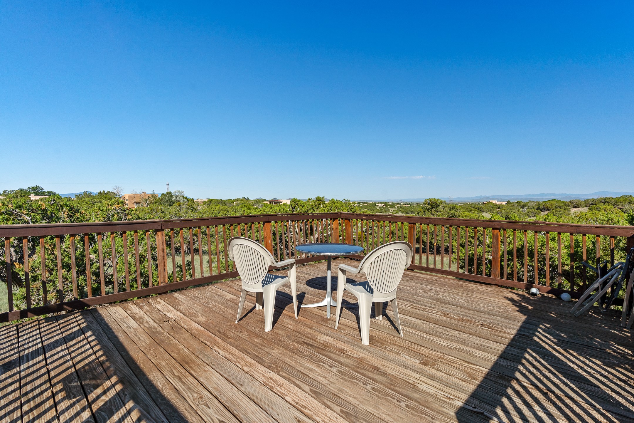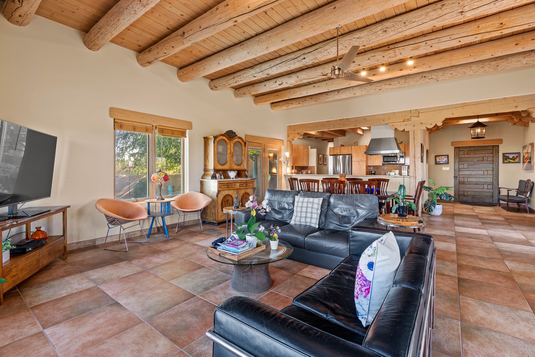 A hidden gem nestled at the end of the cul-de-sac! As soon as you walk in the door, you can feel the quality of craftsmanship and the care that has been put into this property. The formal entryway provides the perfect introduction to a large open concept living room with high ceilings, beautiful vigas and a view towards the chef's kitchen, which features granite countertops, custom pull-out drawers, and high end appliances. From the living room and primary bedroom windows, your eye travels to distant mountains. A unique and sensible floorplan, there are two guest bedrooms each with their own outdoor access. There is also an office space that is currently being used as a painting studio, with a newly added bathroom as well. The primary suite is large and cool, with wonderful closet space, and features "his" and "hers" sinks in the primary bathroom. This home would be ideal for anyone who had family members or guests coming to stay, as each would have their own entrance if desired. The meticulously manicured grounds will please even the most discerning buyers. The exterior wood and stucco have just been painted. The current sellers have pruned the trees and underbrush throughout the property. There is even a viewing deck that showcases the surrounding mountain ranges! Don't miss this absolute gem of a property. Schedule a showing today!