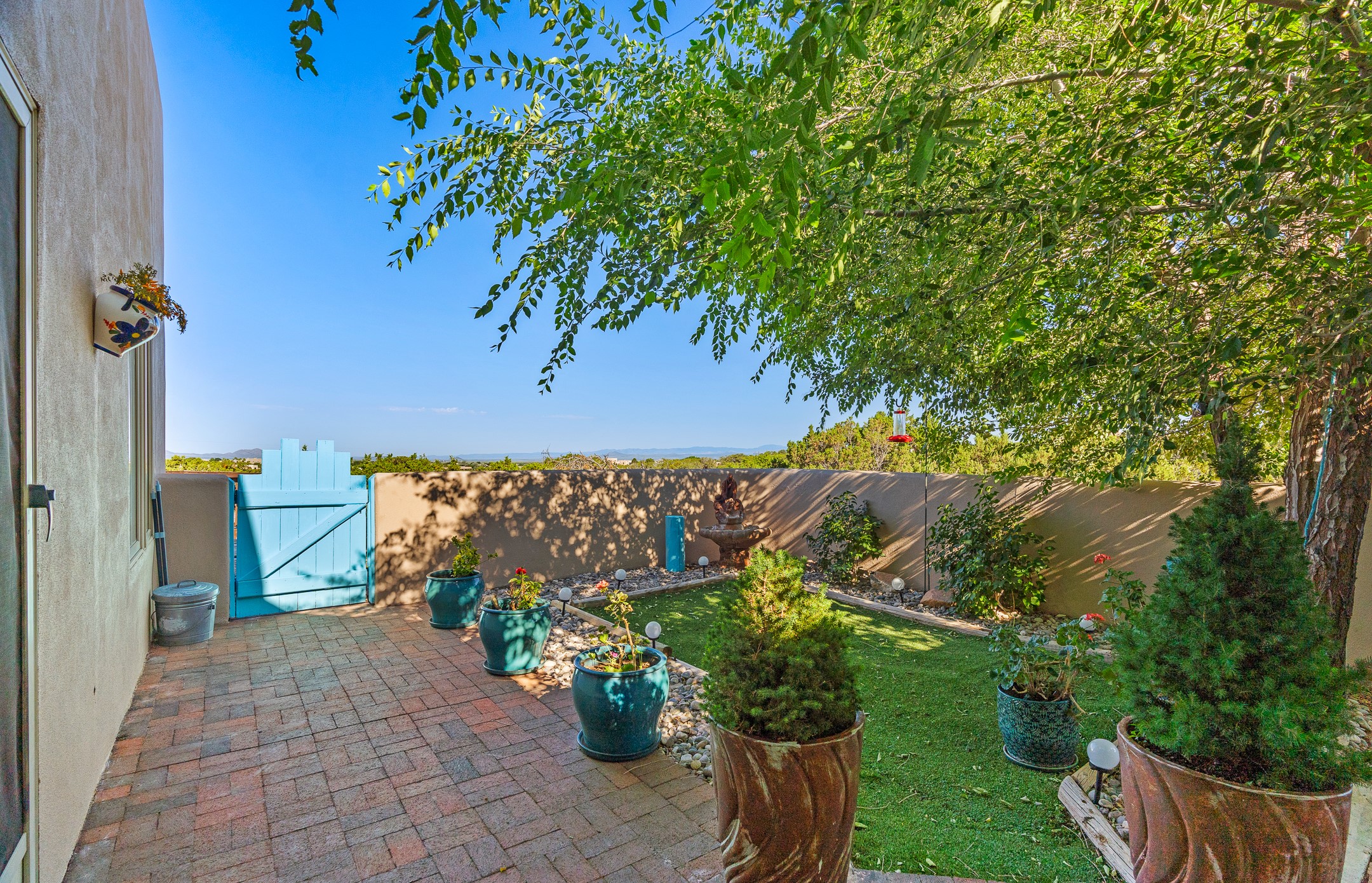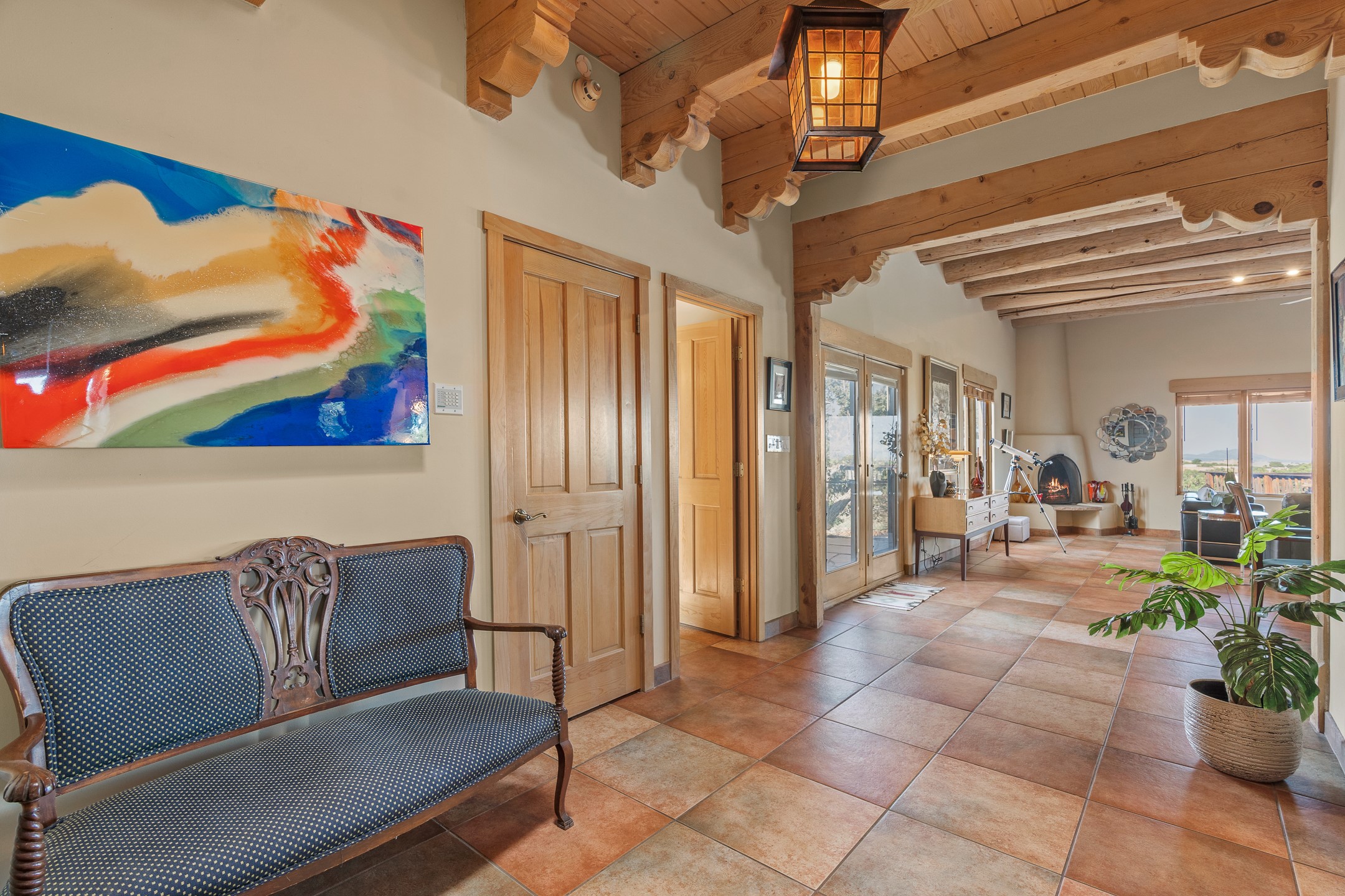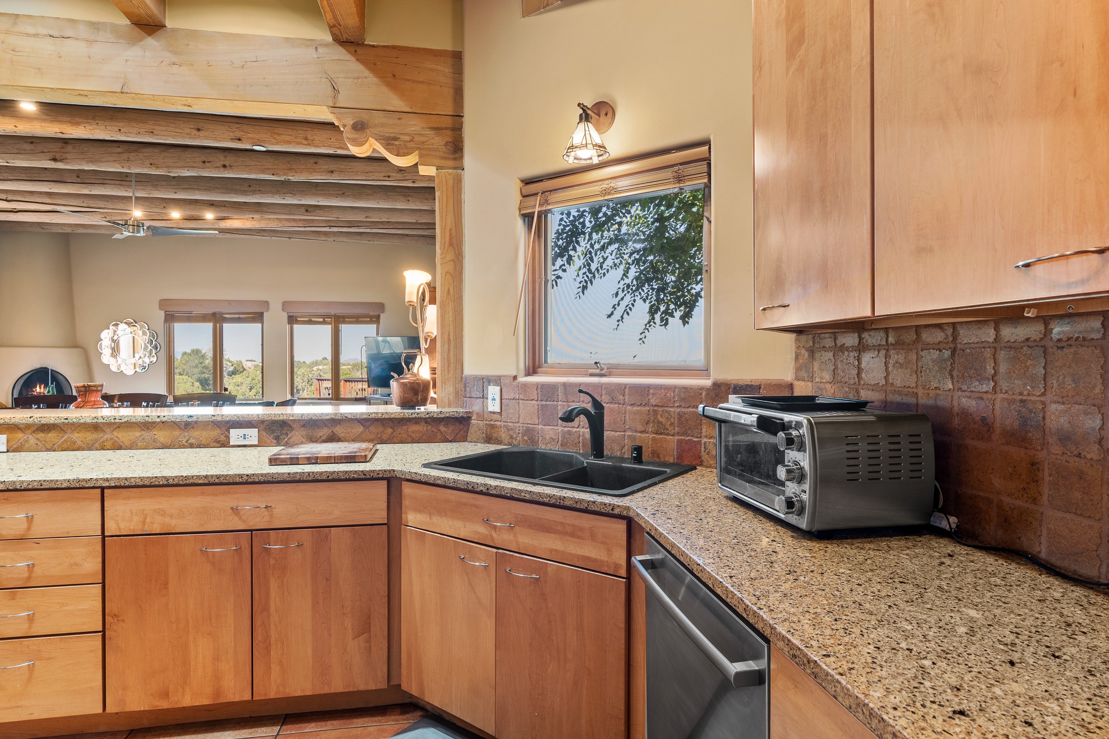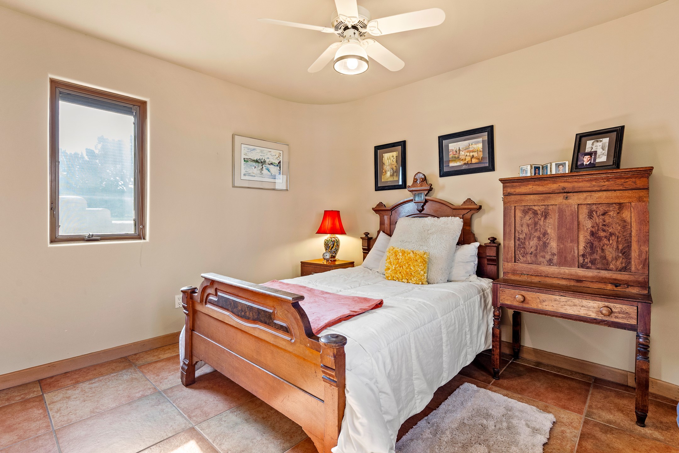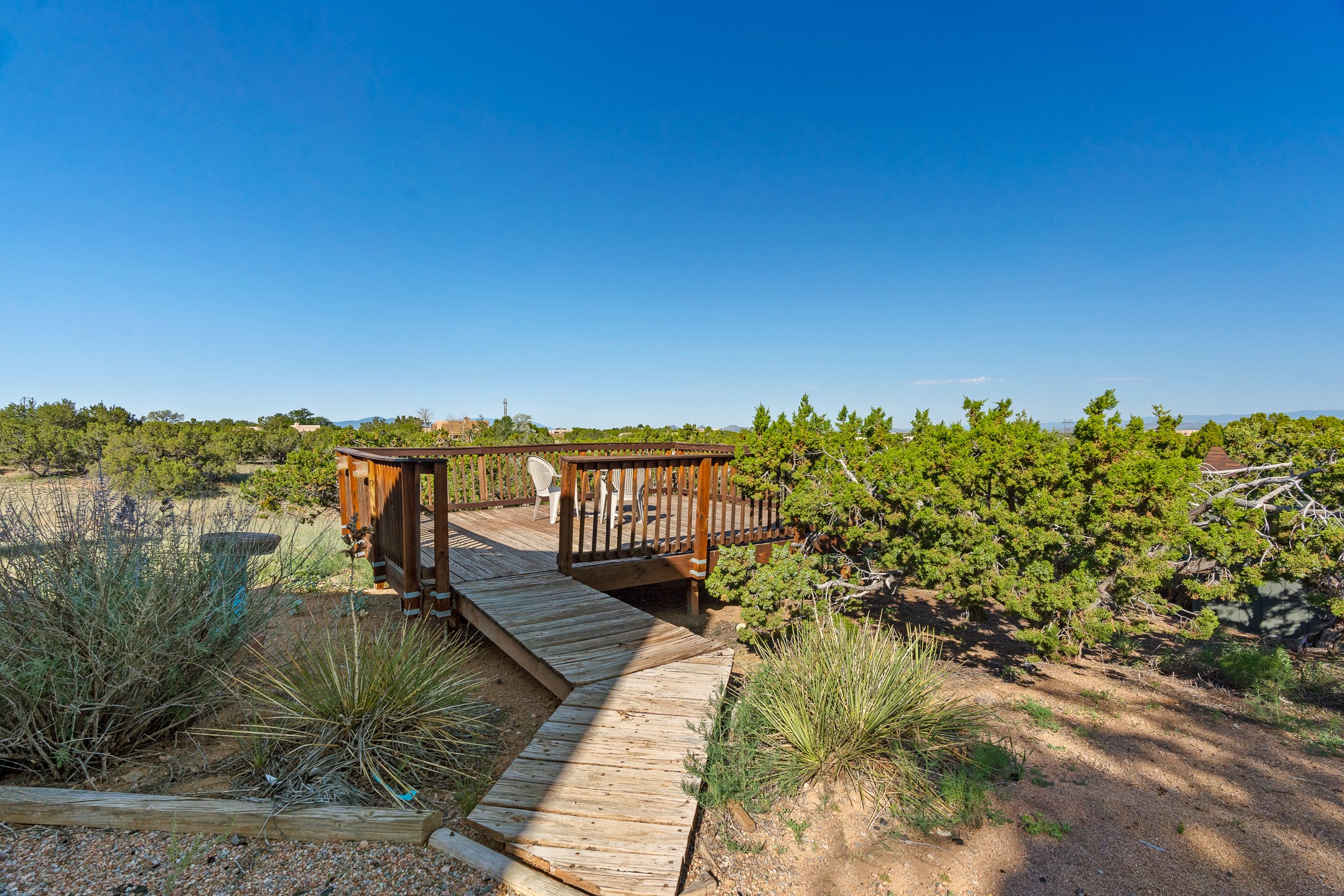 A hidden gem nestled at the end of the cul-de-sac! As soon as you walk in the door, you can feel the quality of craftsmanship and the care that has been put into this property. The formal entryway provides the perfect introduction to a large open concept living room with high ceilings, beautiful vigas and a view towards the chef's kitchen, which features granite countertops, custom pull-out drawers, and high end appliances. From the living room and primary bedroom windows, your eye travels to distant mountains. A unique and sensible floorplan, there are two guest bedrooms each with their own outdoor access. There is also an office space that is currently being used as a painting studio, with a newly added bathroom as well. The primary suite is large and cool, with wonderful closet space, and features "his" and "hers" sinks in the primary bathroom. This home would be ideal for anyone who had family members or guests coming to stay, as each would have their own entrance if desired. The meticulously manicured grounds will please even the most discerning buyers. The exterior wood and stucco have just been painted. The current sellers have pruned the trees and underbrush throughout the property. There is even a viewing deck that showcases the surrounding mountain ranges! Don't miss this absolute gem of a property. Schedule a showing today!