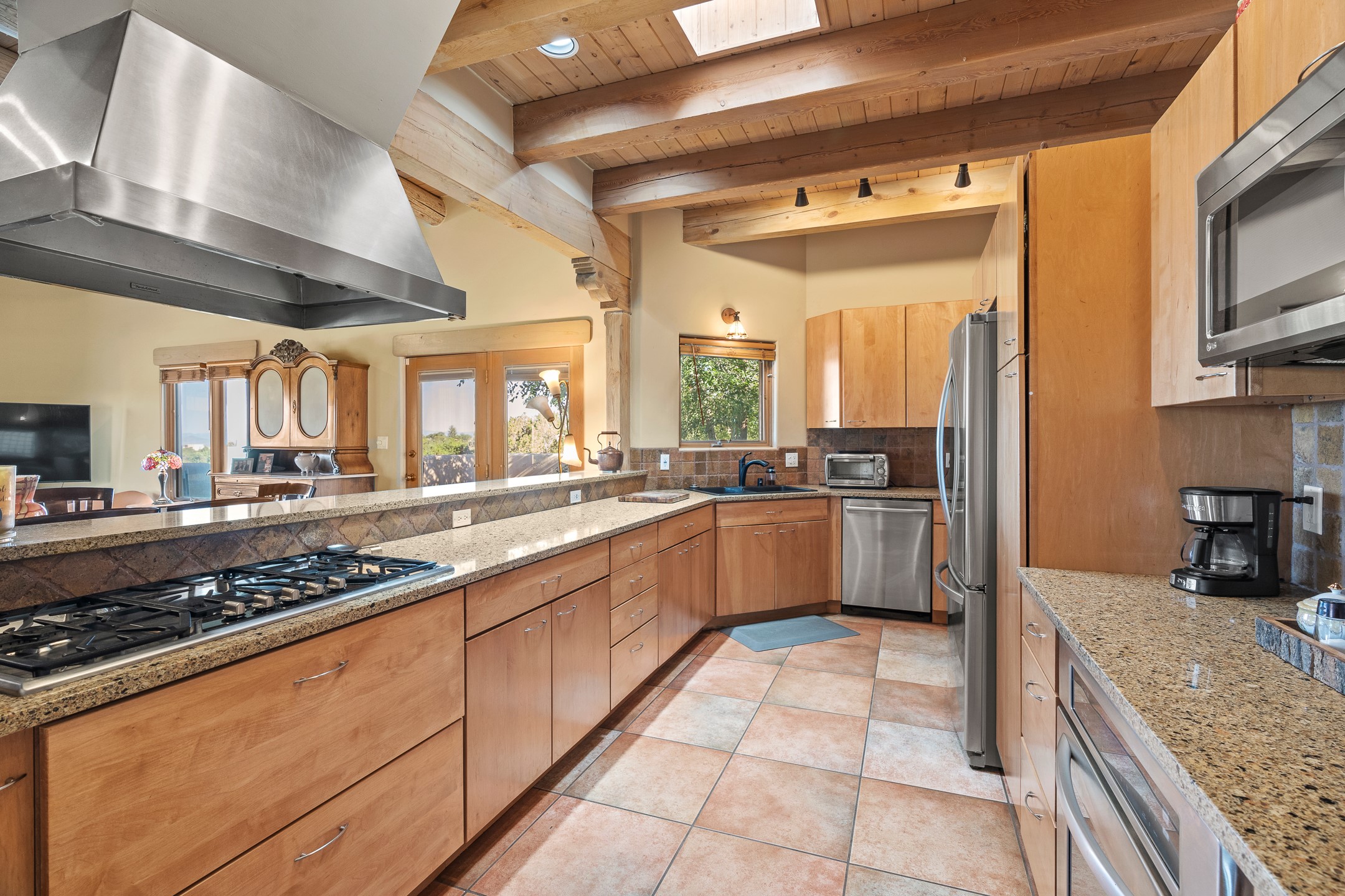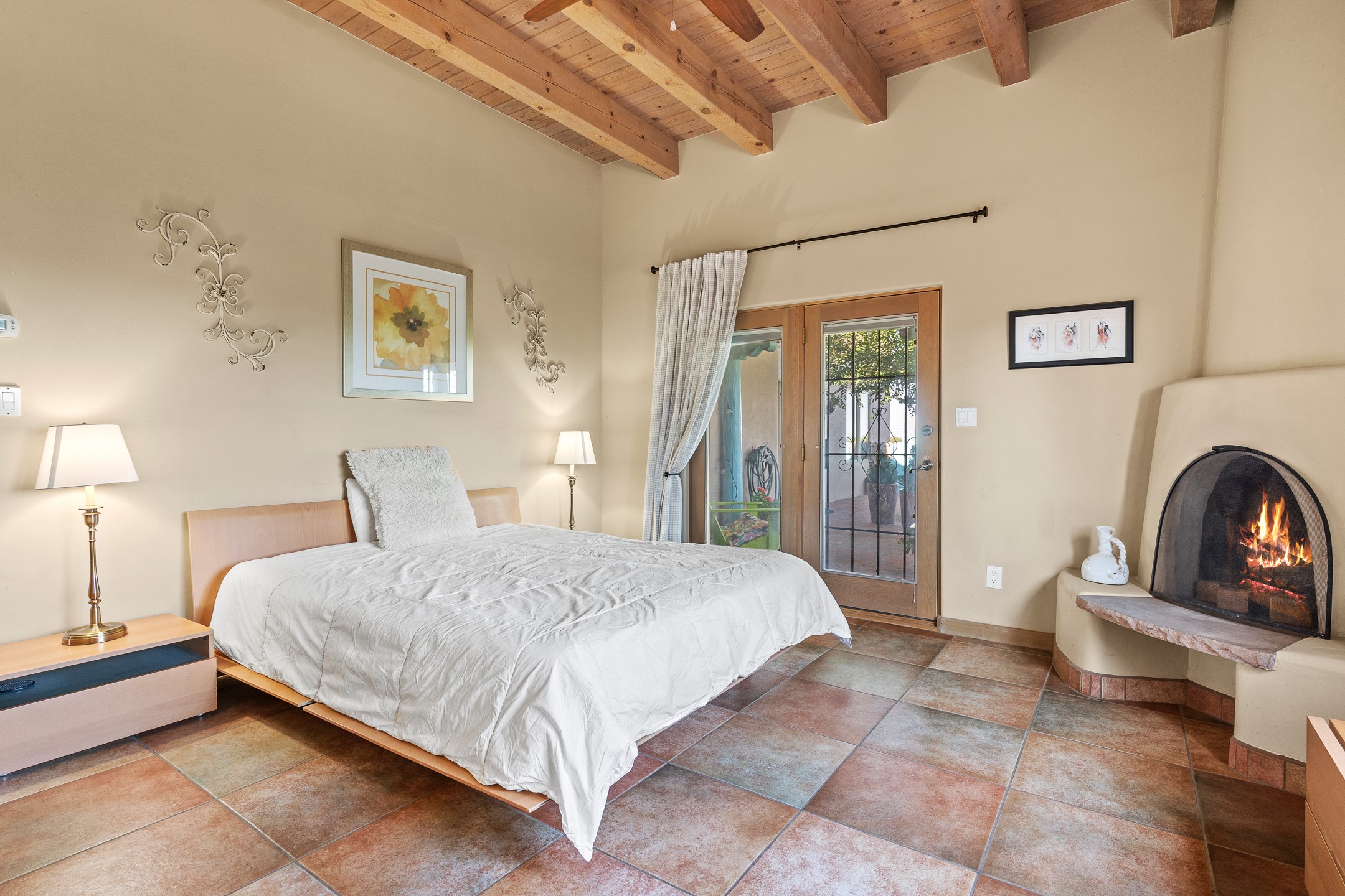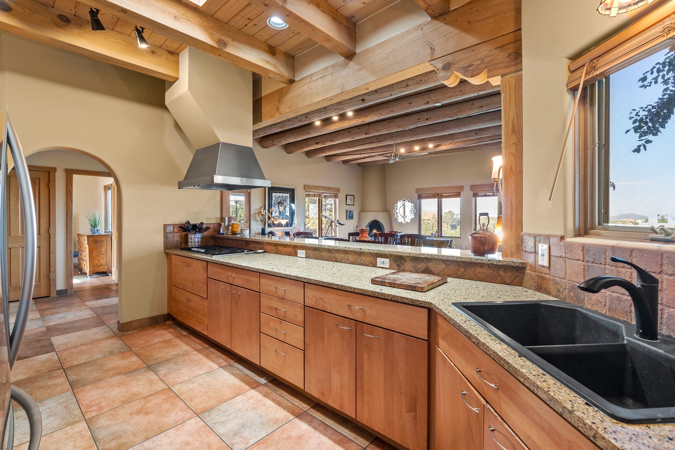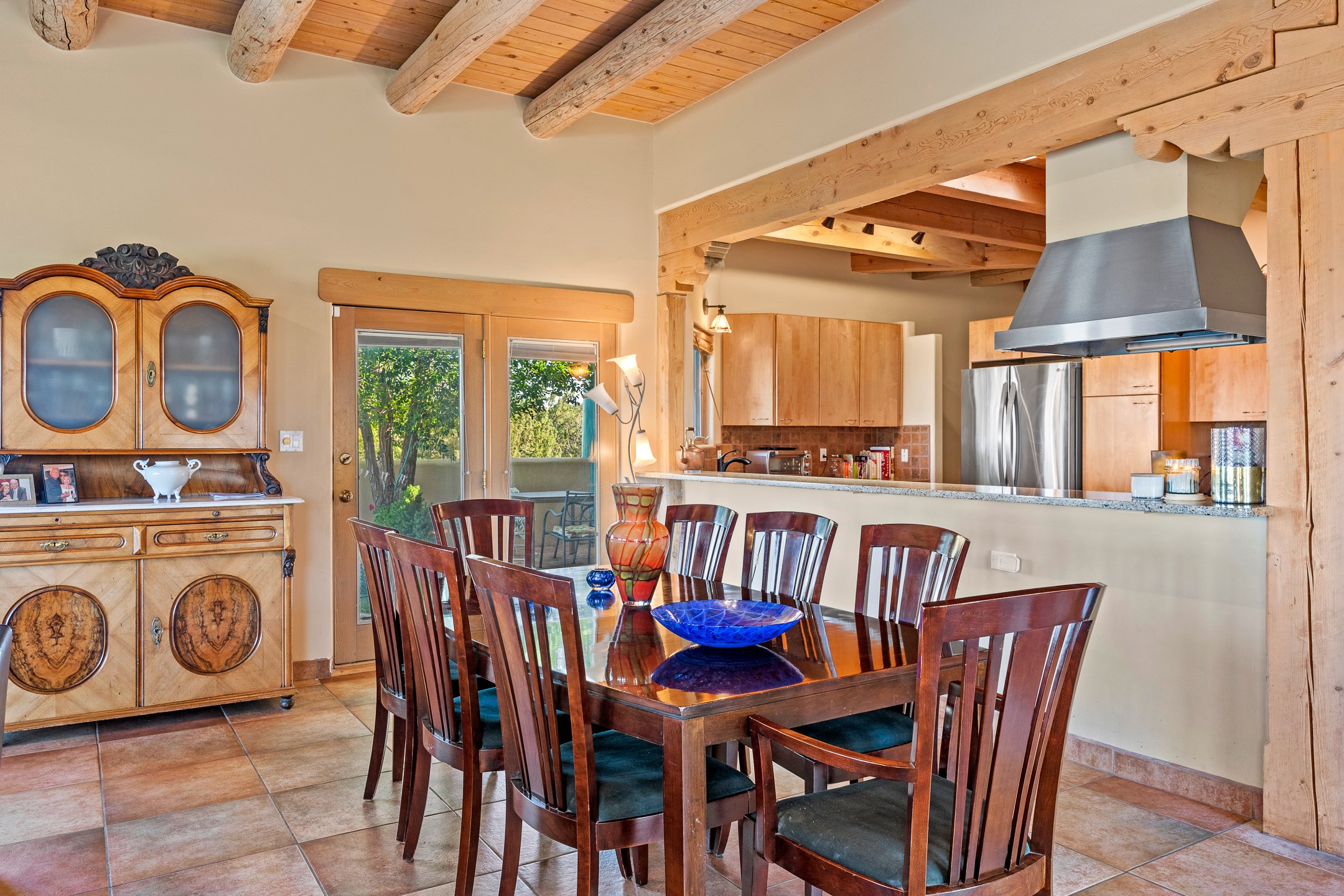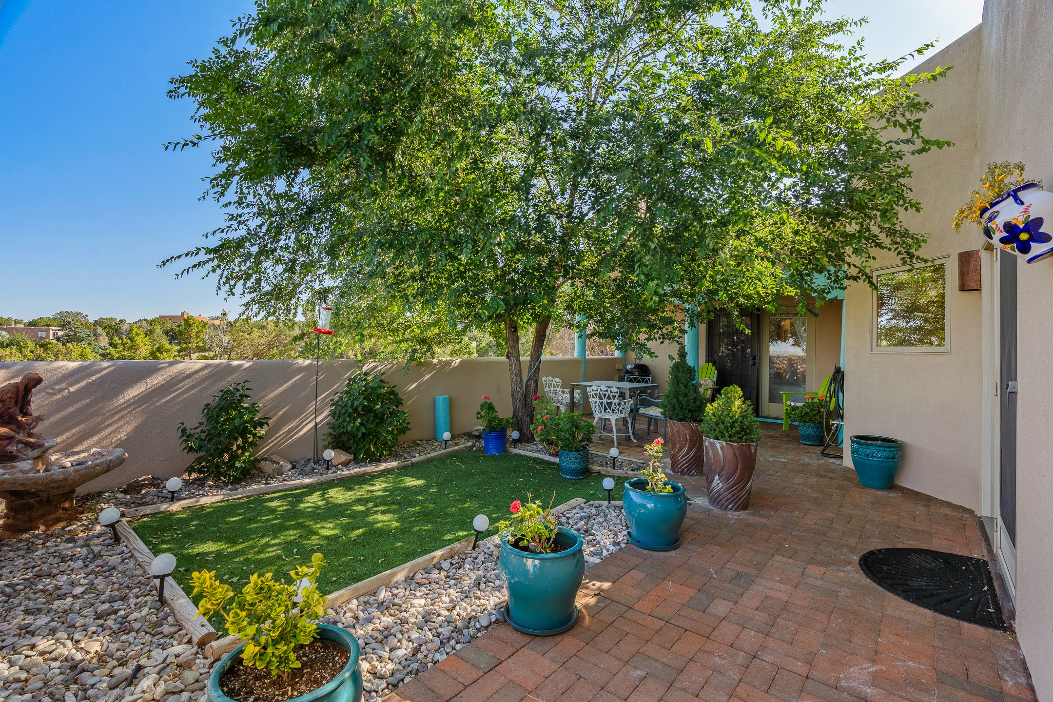 A hidden gem nestled at the end of the cul-de-sac! As soon as you walk in the door, you can feel the quality of craftsmanship and the care that has been put into this property. The formal entryway provides the perfect introduction to a large open concept living room with high ceilings, beautiful vigas and a view towards the chef's kitchen, which features granite countertops, custom pull-out drawers, and high end appliances. From the living room and primary bedroom windows, your eye travels to distant mountains. A unique and sensible floorplan, there are two guest bedrooms each with their own outdoor access. There is also an office space that is currently being used as a painting studio, with a newly added bathroom as well. The primary suite is large and cool, with wonderful closet space, and features "his" and "hers" sinks in the primary bathroom. This home would be ideal for anyone who had family members or guests coming to stay, as each would have their own entrance if desired. The meticulously manicured grounds will please even the most discerning buyers. The exterior wood and stucco have just been painted. The current sellers have pruned the trees and underbrush throughout the property. There is even a viewing deck that showcases the surrounding mountain ranges! Don't miss this absolute gem of a property. Schedule a showing today!