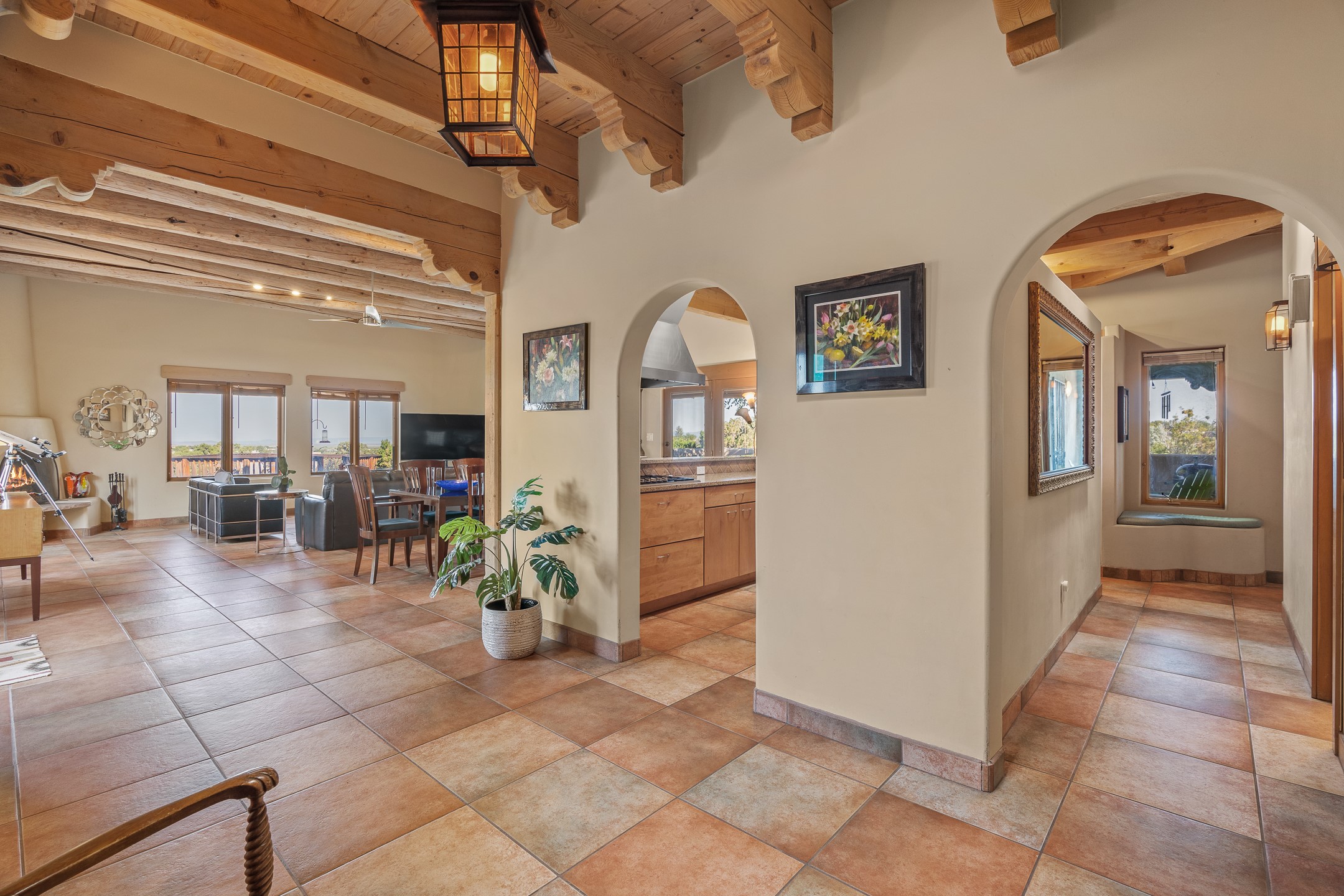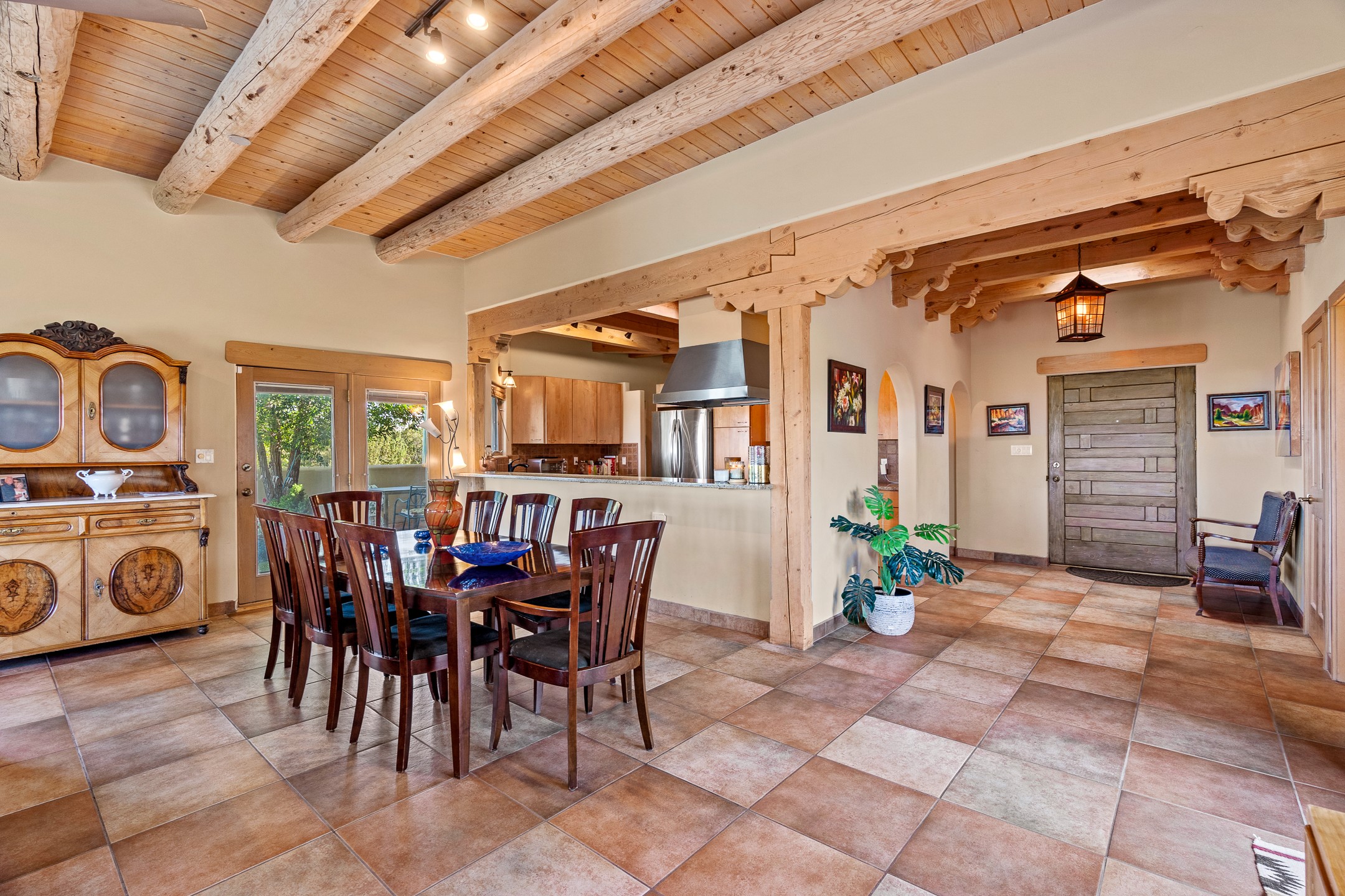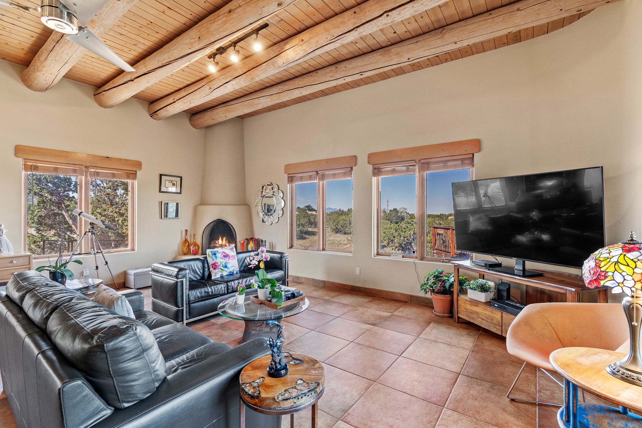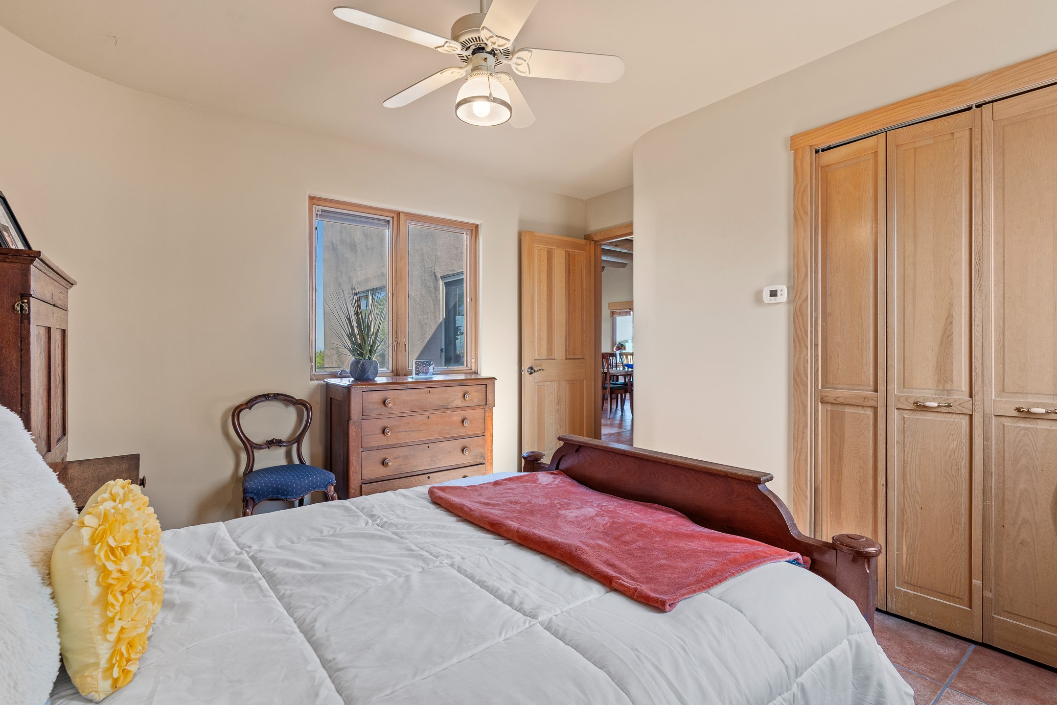 A hidden gem nestled at the end of the cul-de-sac! As soon as you walk in the door, you can feel the quality of craftsmanship and the care that has been put into this property. The formal entryway provides the perfect introduction to a large open concept living room with high ceilings, beautiful vigas and a view towards the chef's kitchen, which features granite countertops, custom pull-out drawers, and high end appliances. From the living room and primary bedroom windows, your eye travels to distant mountains. A unique and sensible floorplan, there are two guest bedrooms each with their own outdoor access. There is also an office space that is currently being used as a painting studio, with a newly added bathroom as well. The primary suite is large and cool, with wonderful closet space, and features "his" and "hers" sinks in the primary bathroom. This home would be ideal for anyone who had family members or guests coming to stay, as each would have their own entrance if desired. The meticulously manicured grounds will please even the most discerning buyers. The exterior wood and stucco have just been painted. The current sellers have pruned the trees and underbrush throughout the property. There is even a viewing deck that showcases the surrounding mountain ranges! Don't miss this absolute gem of a property. Schedule a showing today!