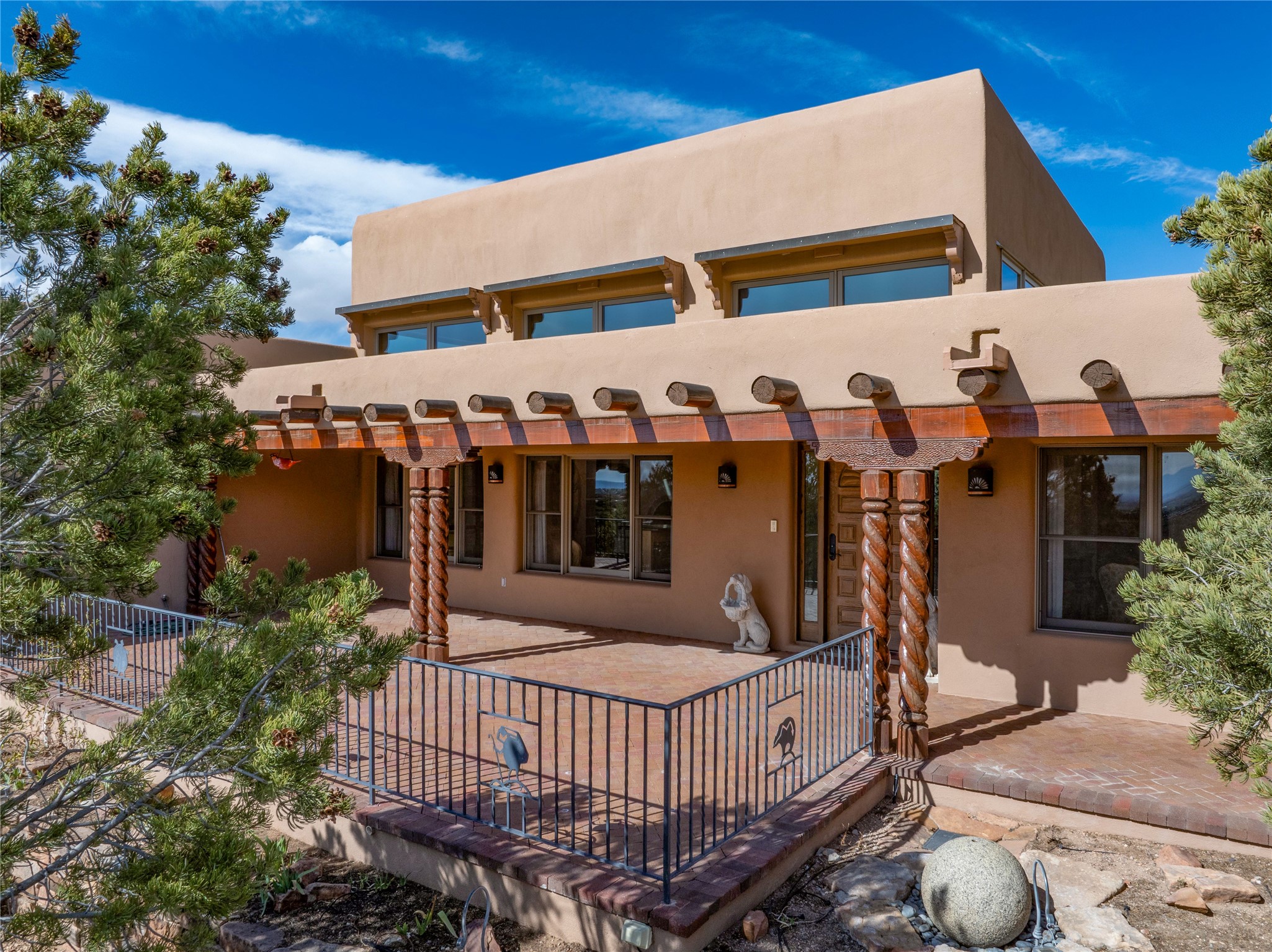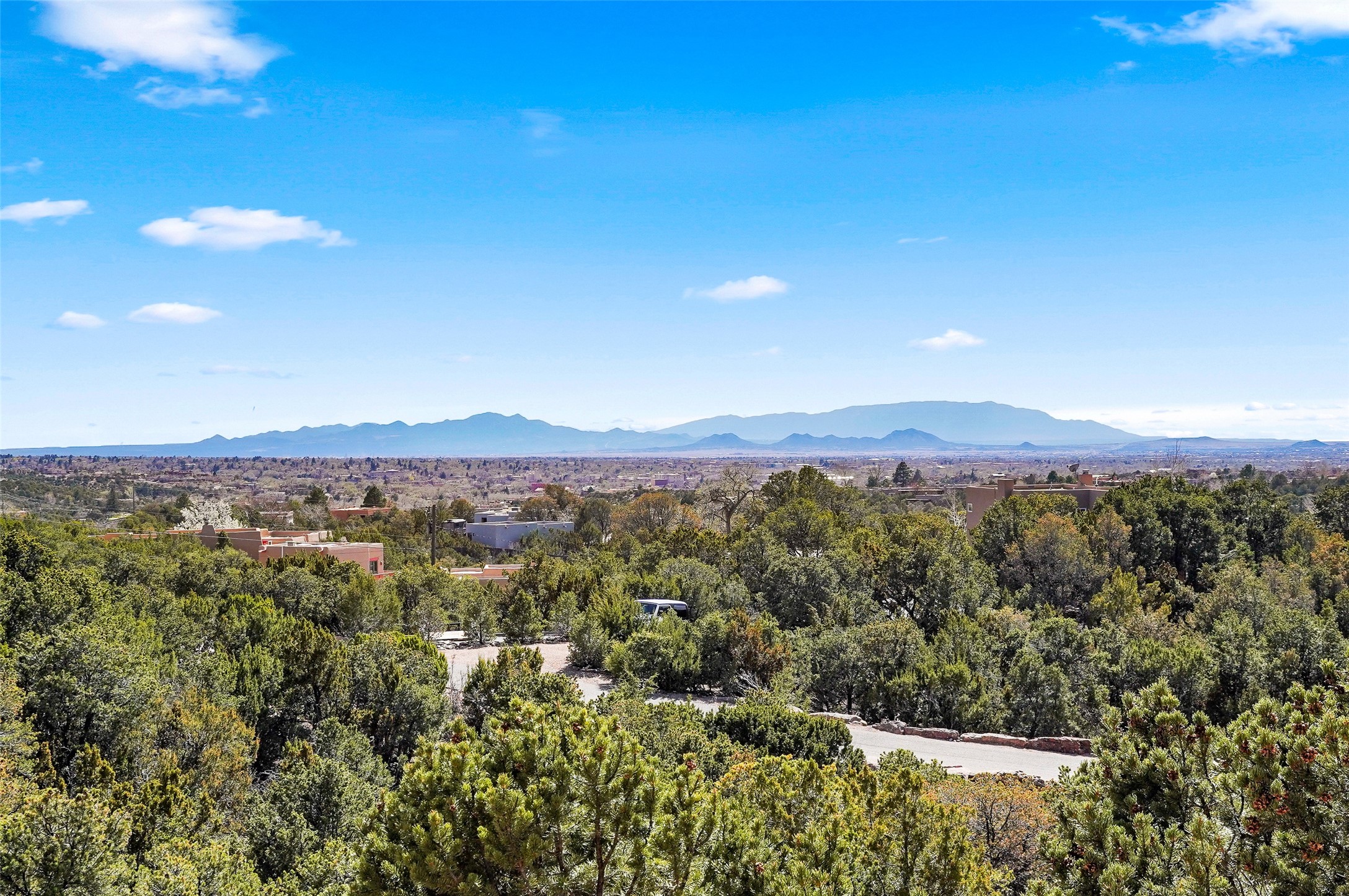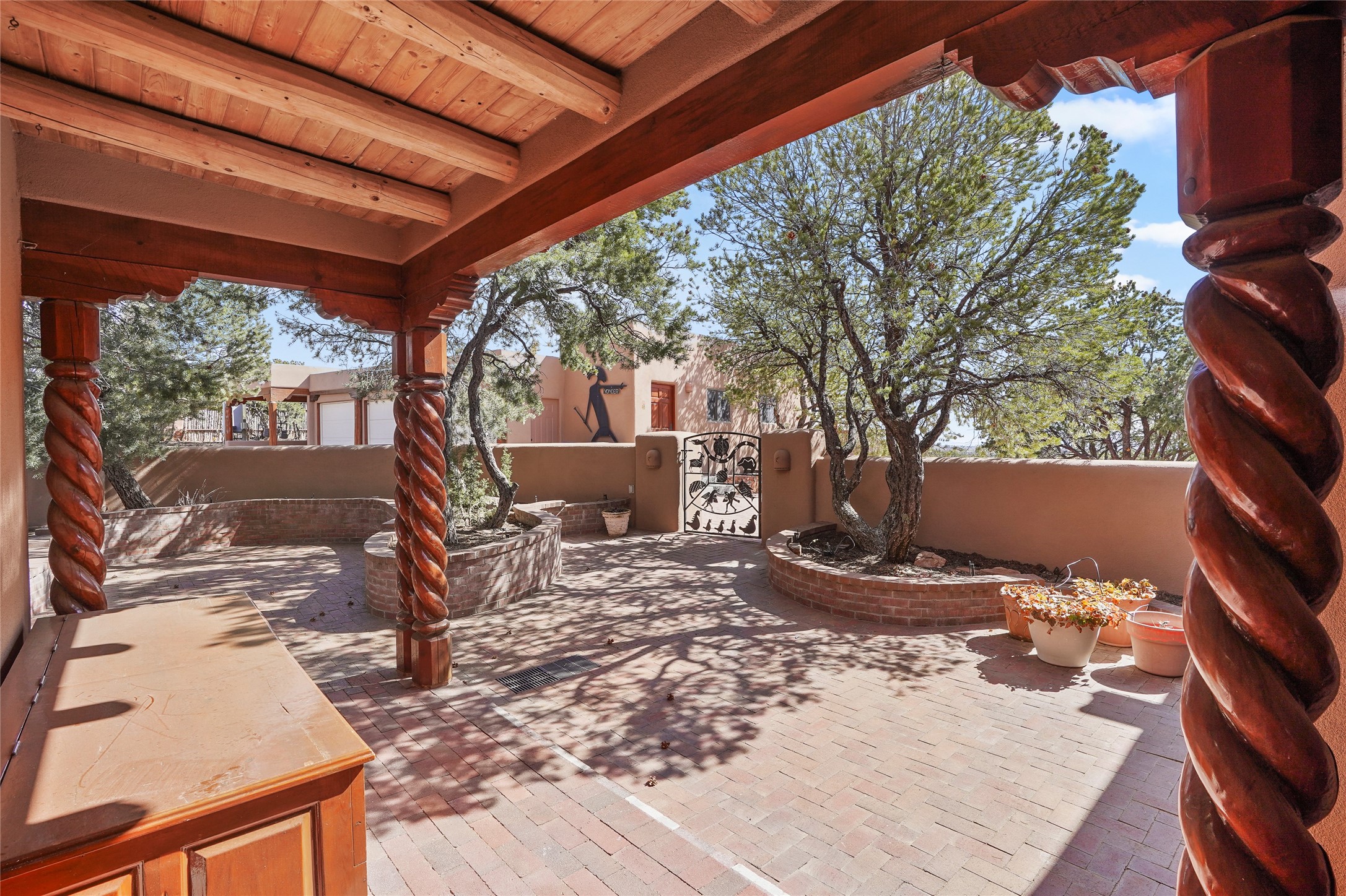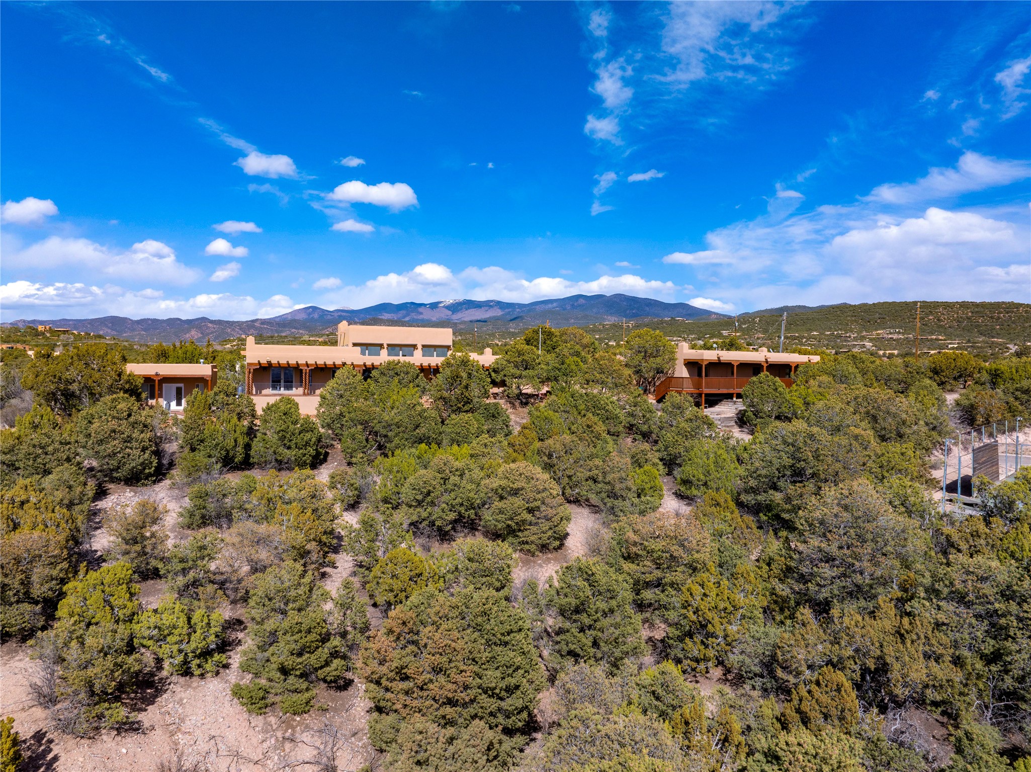 A very special estate offering approximately 1.5 miles to the Historic Santa Fe Plaza. Convenient to Highway 285, Tesuque Village, Ski Santa Fe and The Santa Fe Opera. The single level main house commands exquisite views of Downtown Santa Fe, the Jemez Mountains and a gorgeous, nestled view of the Sangre de Cristo Mountains. The gorgeous Kitchen is well designed and equipped. The guest casita has two fireplaces and also has a great view to Downtown from the large south facing veranda. The beautiful art studio is a perfect workspace with a kitchenette (partial kitchen: Sink, counter, cabinets. No appliances) and 1/2 bath. A 3- car garage is a great addition to this estate compound. There is also a tennis court included with this offering. The tennis court needs work, though it is thoughtfully located on the property with views of Downtown. The Great Room has 14' high ceilings with hand carved beams. The ceiling also has viga and cedar latillas. A wet bar is also located in the Great Room. This is an extremely well-designed home as well as are the additional structures. This property is coyote fenced and gated with many security features.