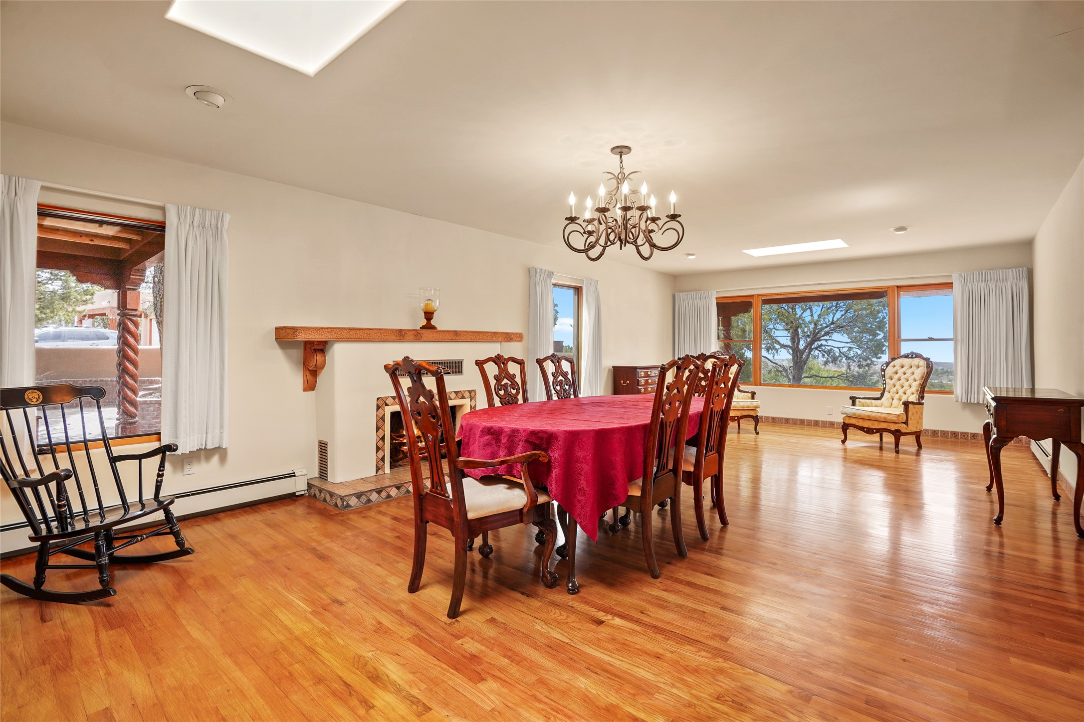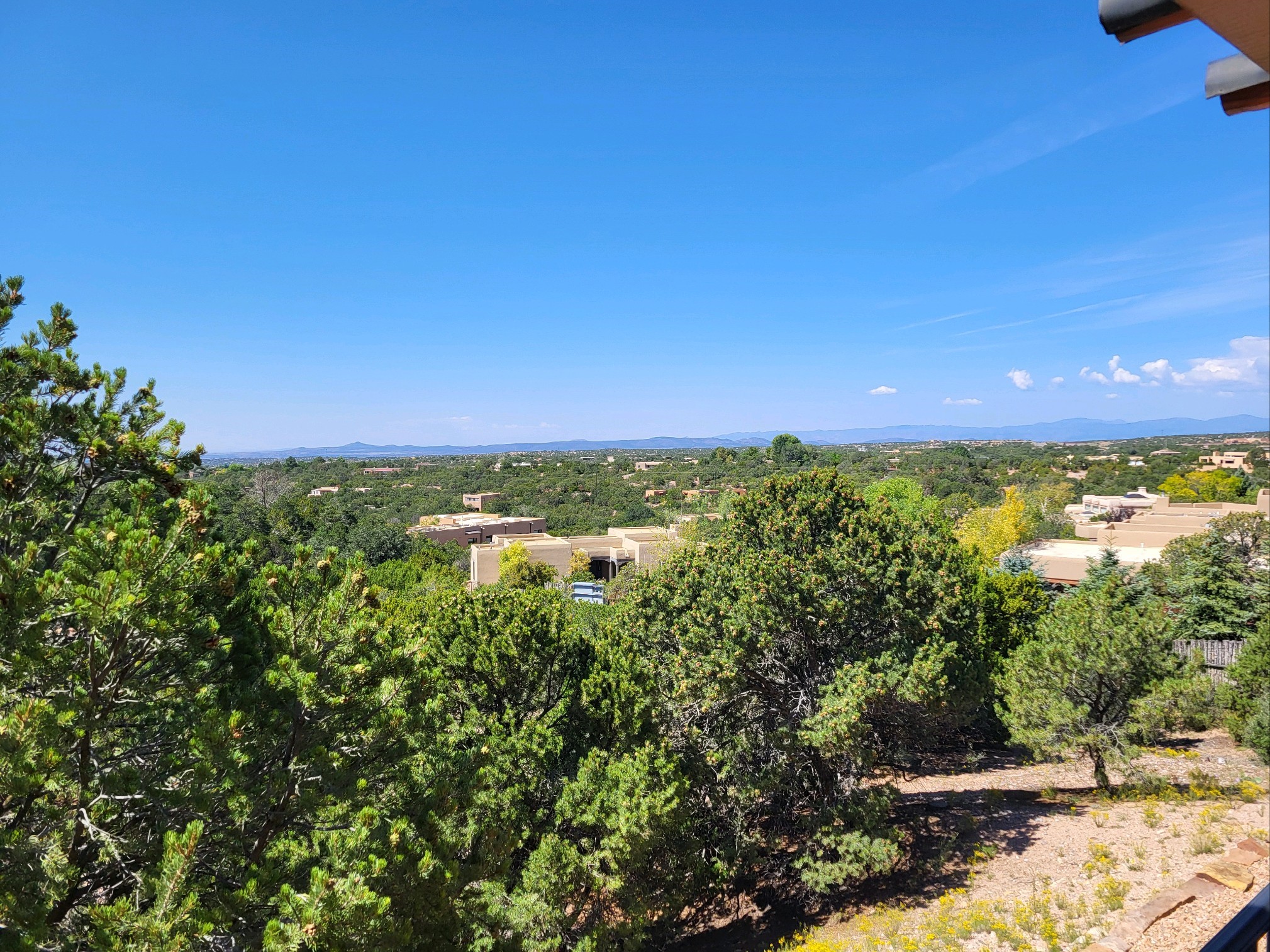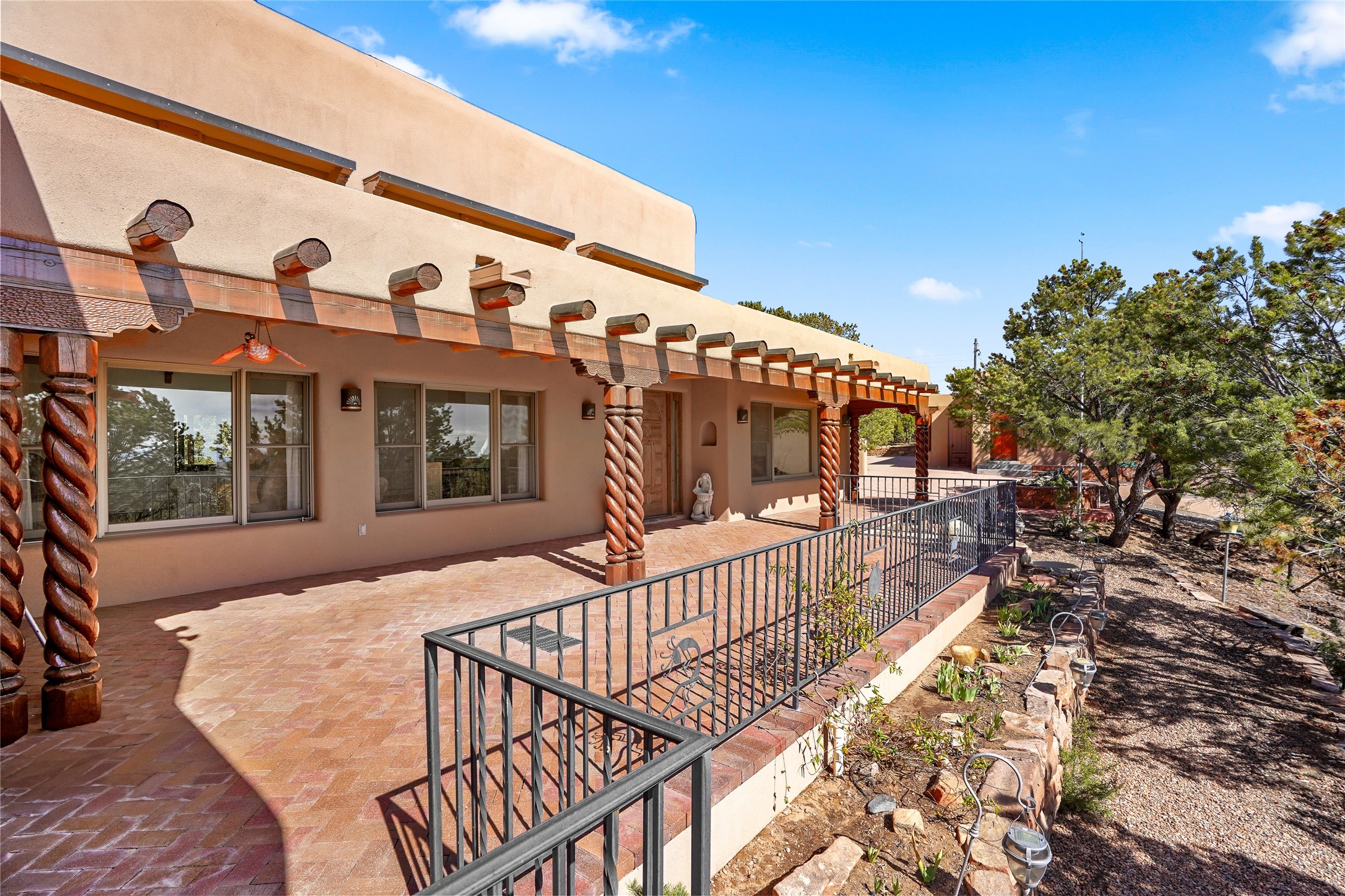 A very special estate offering approximately 1.5 miles to the Historic Santa Fe Plaza. Convenient to Highway 285, Tesuque Village, Ski Santa Fe and The Santa Fe Opera. The single level main house commands exquisite views of Downtown Santa Fe, the Jemez Mountains and a gorgeous, nestled view of the Sangre de Cristo Mountains. The gorgeous Kitchen is well designed and equipped. The guest casita has two fireplaces and also has a great view to Downtown from the large south facing veranda. The beautiful art studio is a perfect workspace with a kitchenette (partial kitchen: Sink, counter, cabinets. No appliances) and 1/2 bath. A 3- car garage is a great addition to this estate compound. There is also a tennis court included with this offering. The tennis court needs work, though it is thoughtfully located on the property with views of Downtown. The Great Room has 14' high ceilings with hand carved beams. The ceiling also has viga and cedar latillas. A wet bar is also located in the Great Room. This is an extremely well-designed home as well as are the additional structures. This property is coyote fenced and gated with many security features.