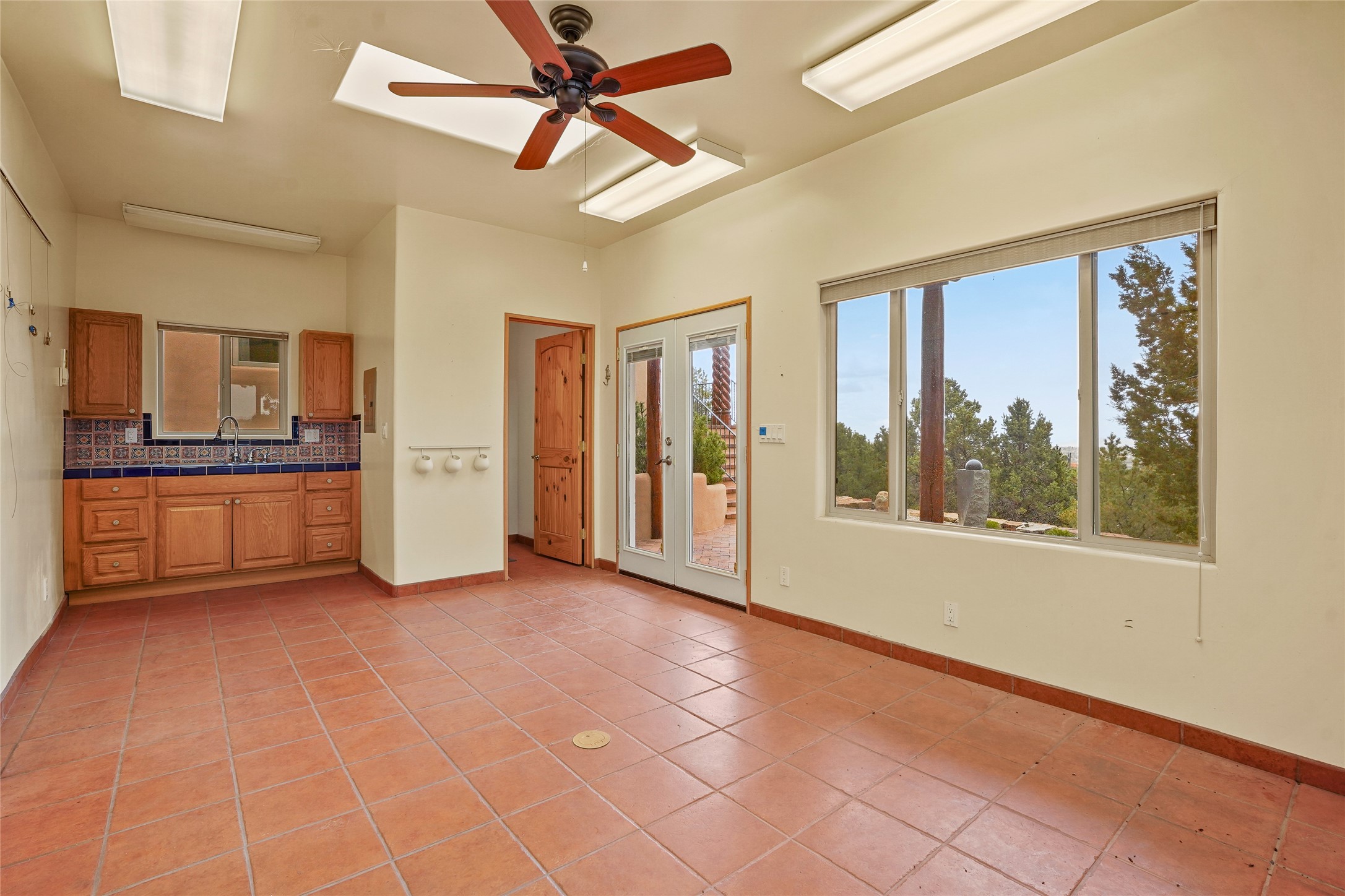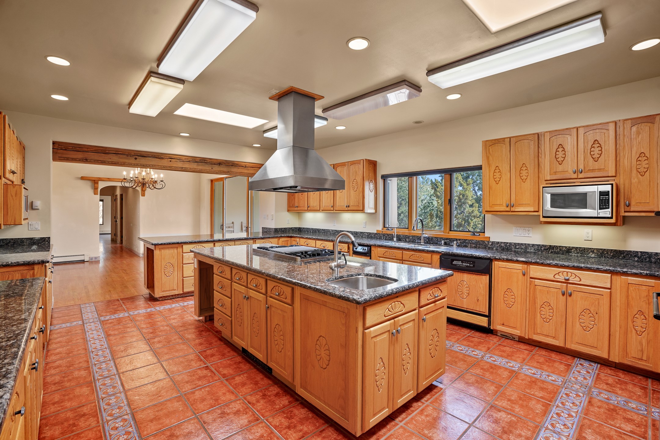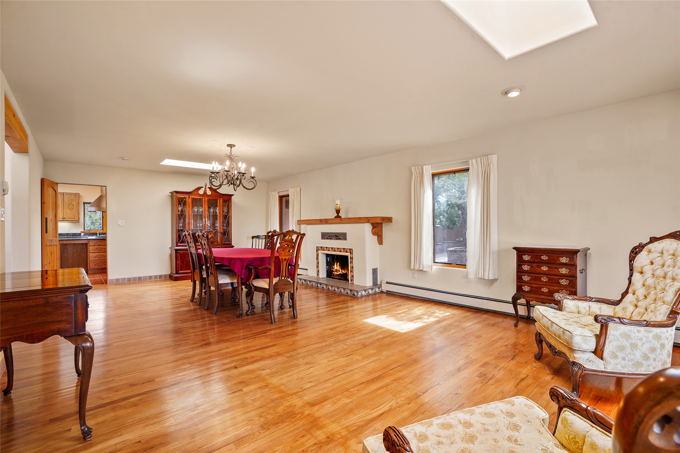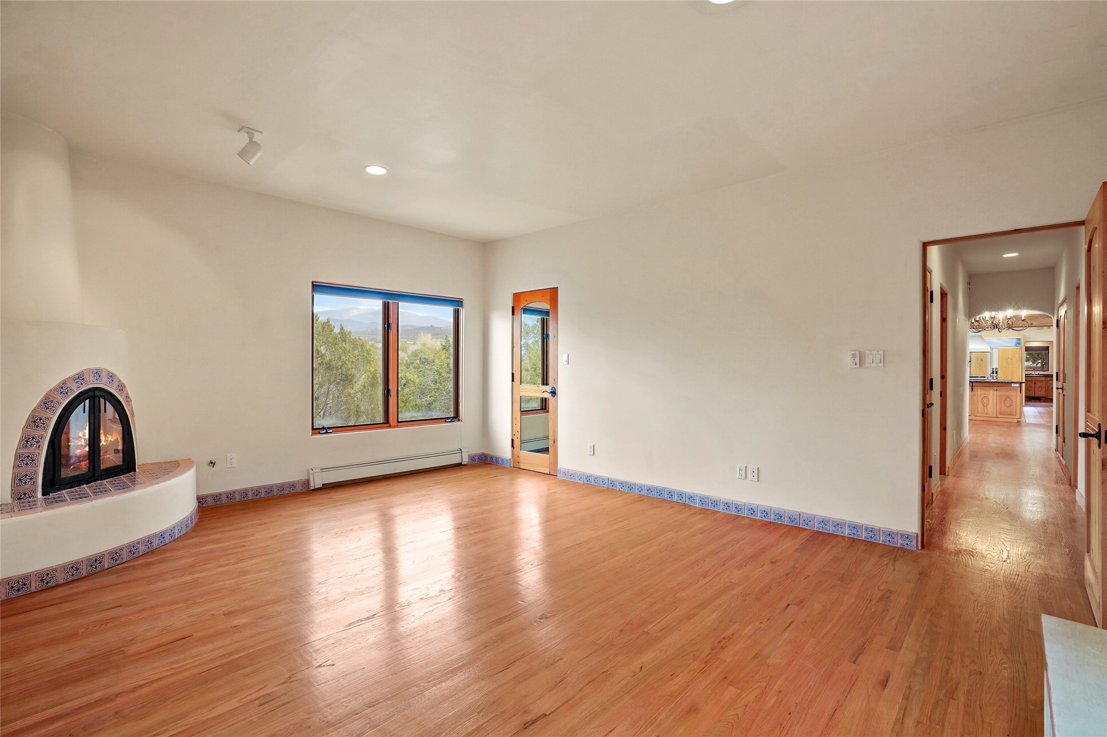 A very special estate offering approximately 1.5 miles to the Historic Santa Fe Plaza. Convenient to Highway 285, Tesuque Village, Ski Santa Fe and The Santa Fe Opera. The single level main house commands exquisite views of Downtown Santa Fe, the Jemez Mountains and a gorgeous, nestled view of the Sangre de Cristo Mountains. The gorgeous Kitchen is well designed and equipped. The guest casita has two fireplaces and also has a great view to Downtown from the large south facing veranda. The beautiful art studio is a perfect workspace with a kitchenette (partial kitchen: Sink, counter, cabinets. No appliances) and 1/2 bath. A 3- car garage is a great addition to this estate compound. There is also a tennis court included with this offering. The tennis court needs work, though it is thoughtfully located on the property with views of Downtown. The Great Room has 14' high ceilings with hand carved beams. The ceiling also has viga and cedar latillas. A wet bar is also located in the Great Room. This is an extremely well-designed home as well as are the additional structures. This property is coyote fenced and gated with many security features.