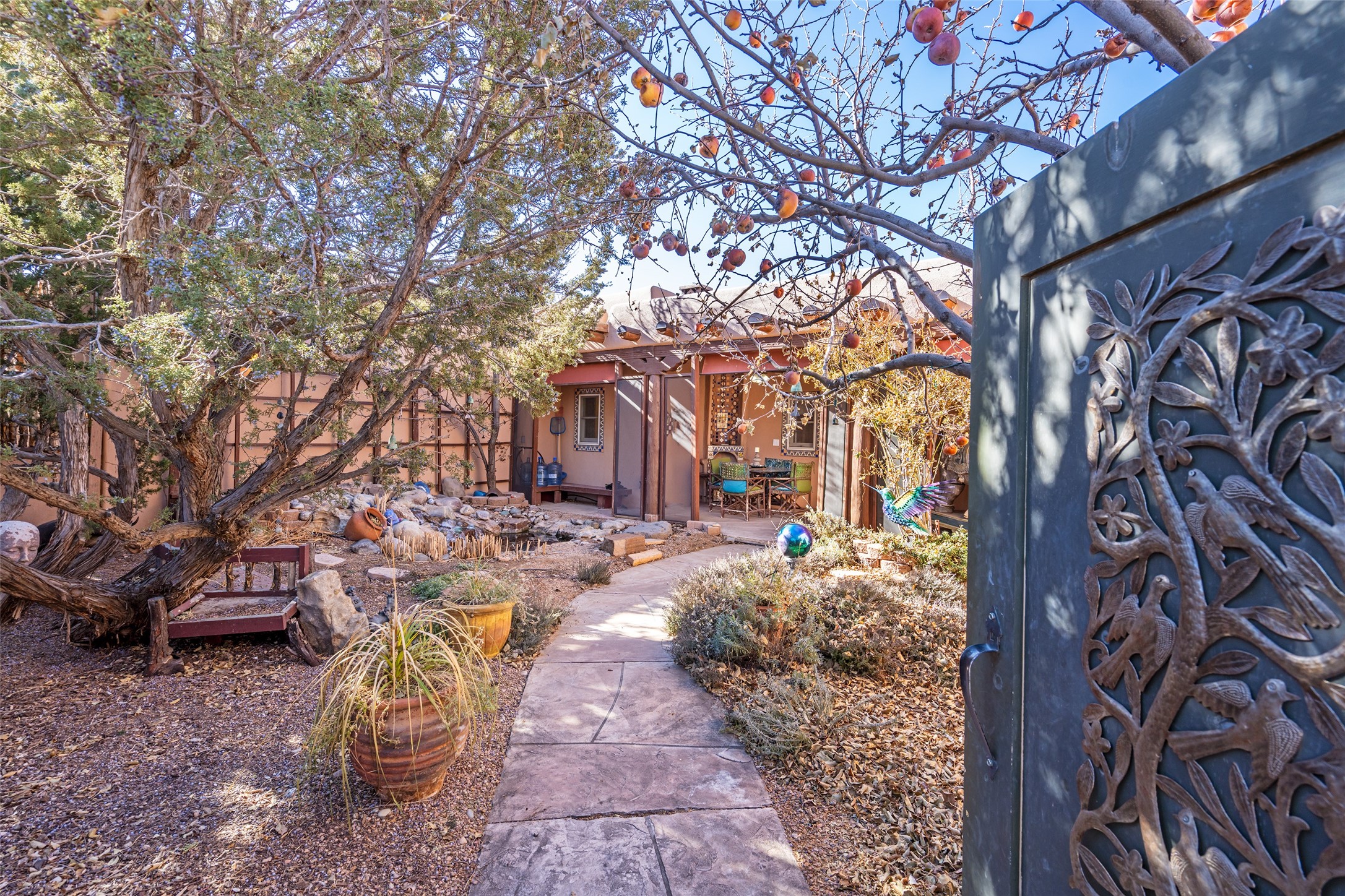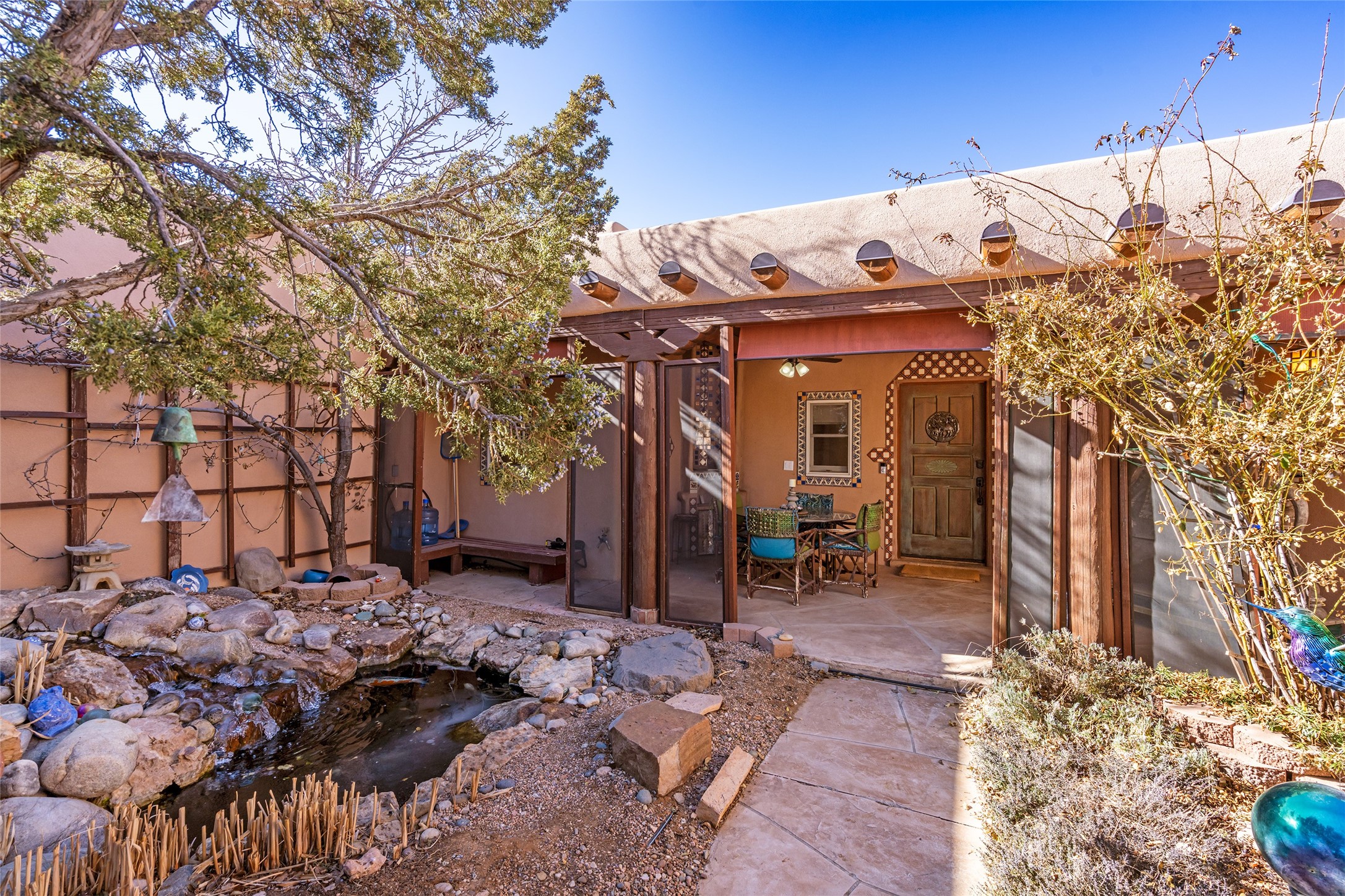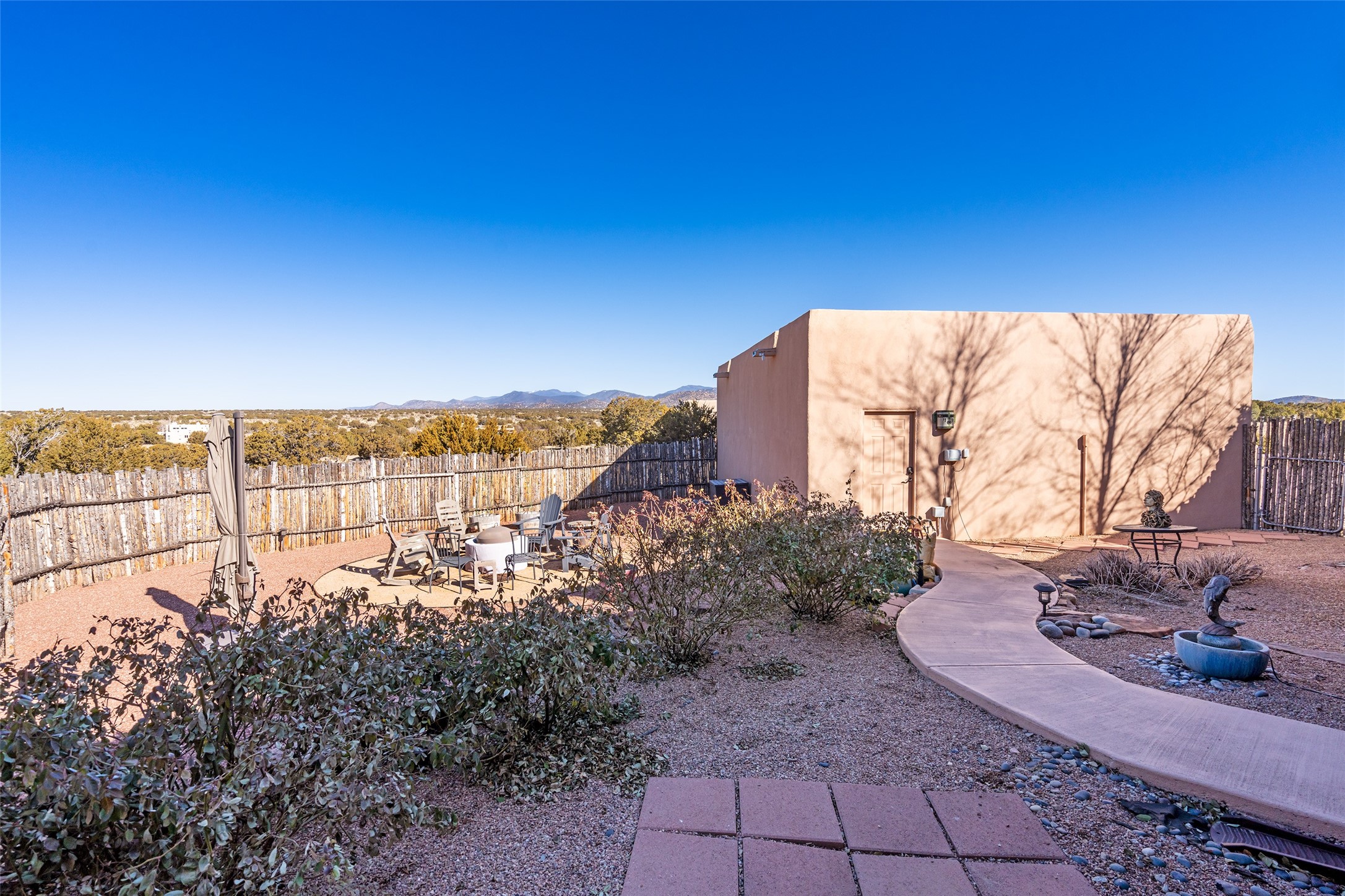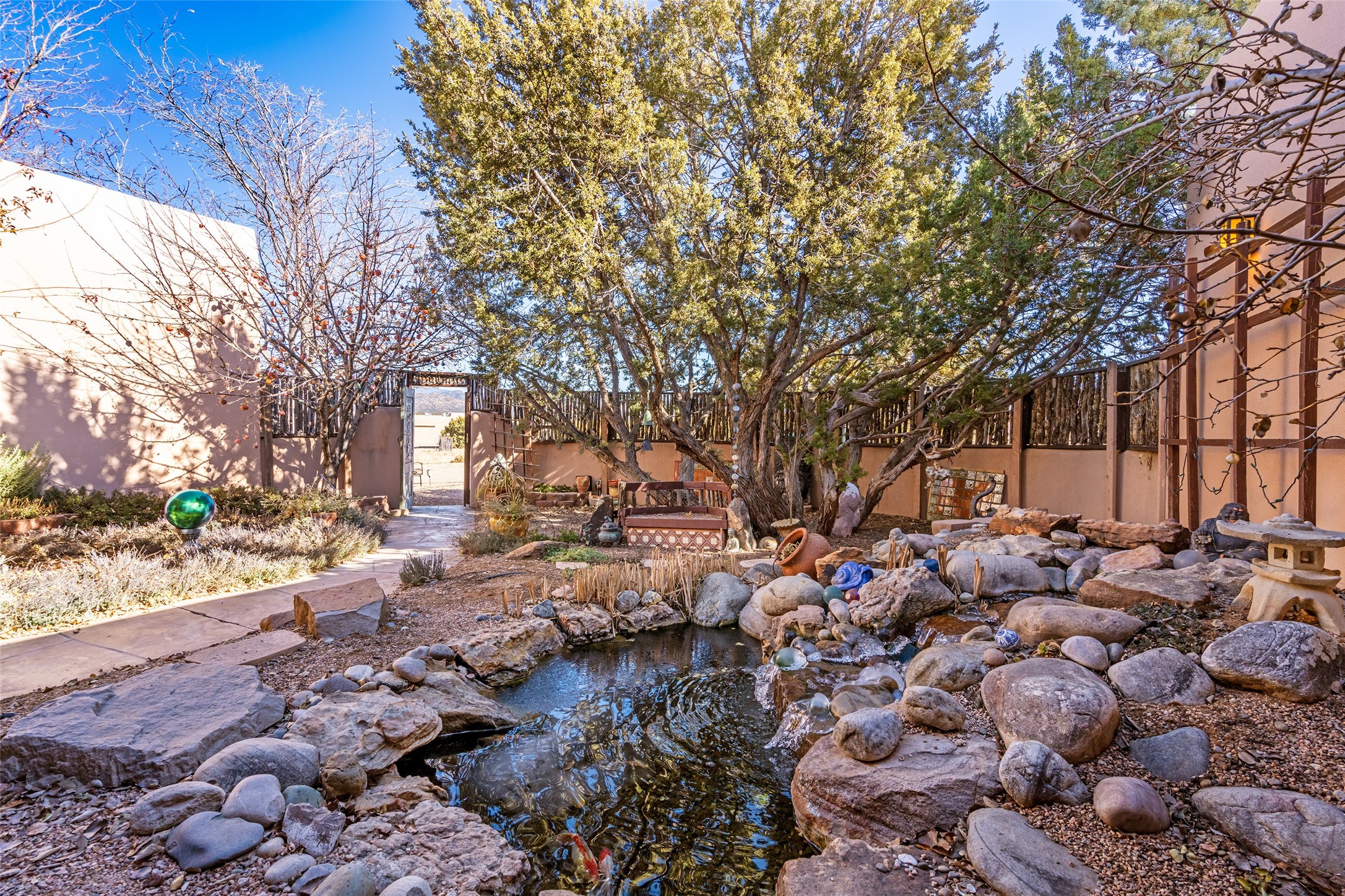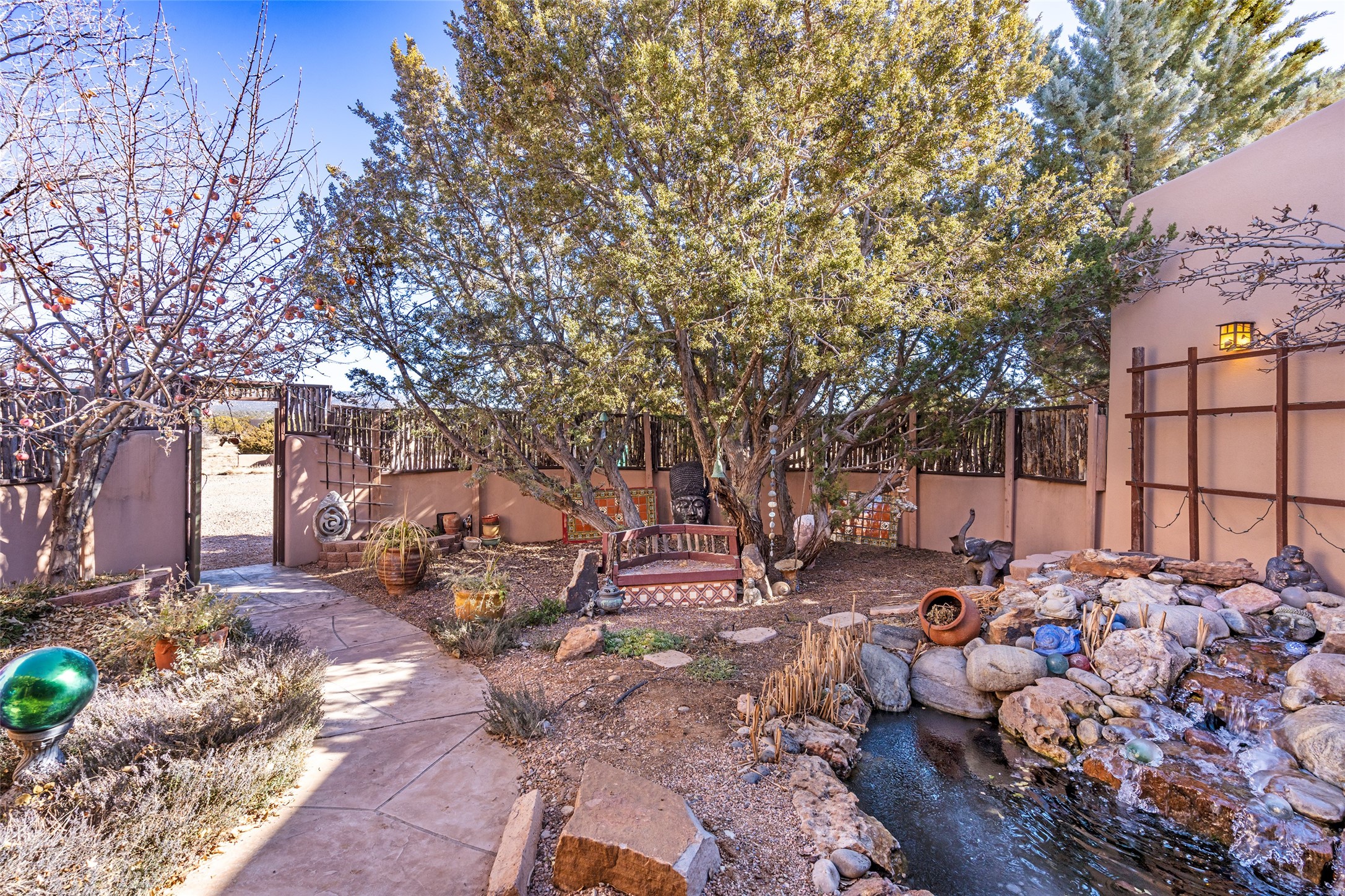 Lovely Eldorado home on 1.61 acres with views! Walled in entry courtyard with a Koi pond plus several outdoor portals with a green belt bordering the property in the back area. 3 bedrooms, 2 1/2 baths with an attached artist studio with a sink and upgraded 220 electric. There is a heated office area off the laundry room which is next to the heated studio. Three Kiva fireplaces and many colorful Santa Fe touches with an Asian twist! Vigas, Latilla ceilings, nichos, built-in bancos, vivid tile murals and 17" x 17" ceramic tile flooring throughout most of the home. New Weil McClain boiler installed in February 2025. Kitchen features stainless appliances with a newer Wolf induction cooktop, new LG refrigerator, Asko dishwasher, and new heavy duty Speed Queen washer/dryer. The kitchen cabinets have animated, hand painted tin motif panels. One step down to the Living area plus there is a den right by the kitchen. A bookshelf features a secret door that goes from the den to the entryway. Four mini-splits installed about 4 years ago. Roof redone by Santa Fe Roofing and Stucco; transferrable warranty until 11/2034. A heated walk way to the detached 3 car garage (874 square feet) was added in 2018 with built in California Closets cabinets. The garage also has epoxy painted floors and 2 skylights for natural light; with one skylight that can manually open. Mature landscaping with inground irrigation plus many apple, cherry and pear trees. Don't miss this delightful property; a peaceful oasis with plenty of Southwest charm.