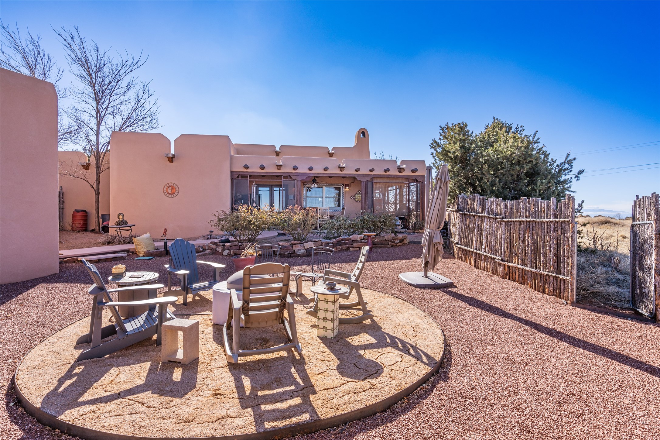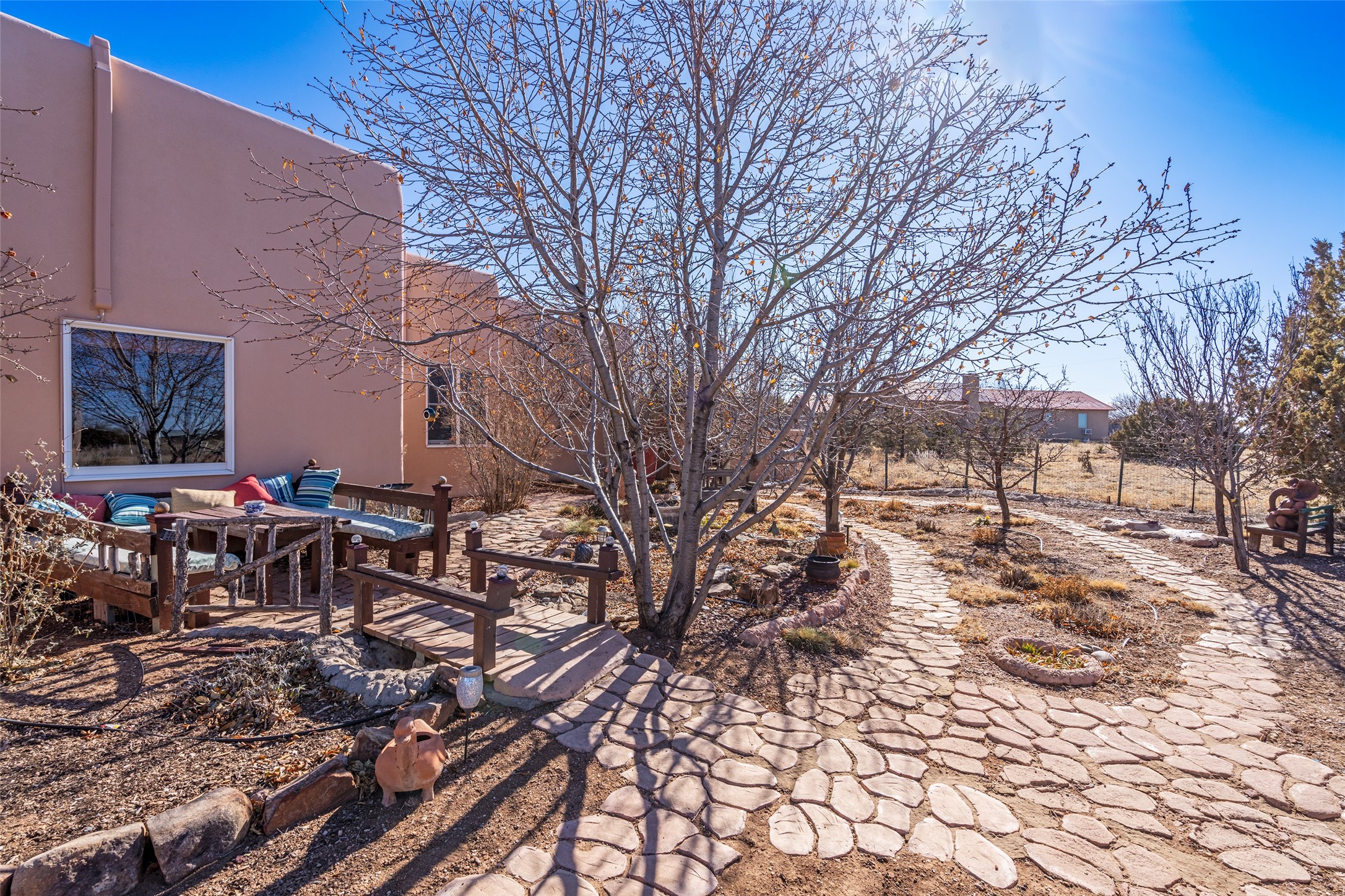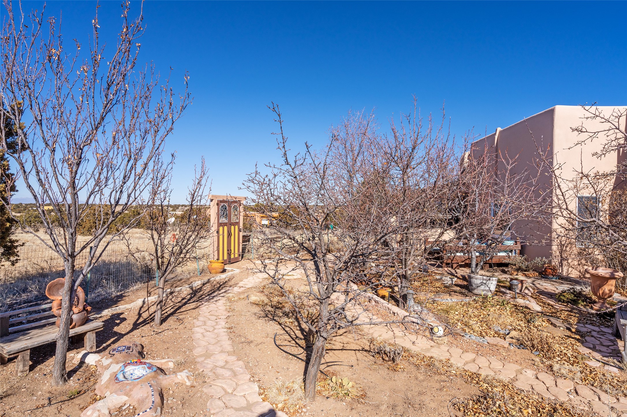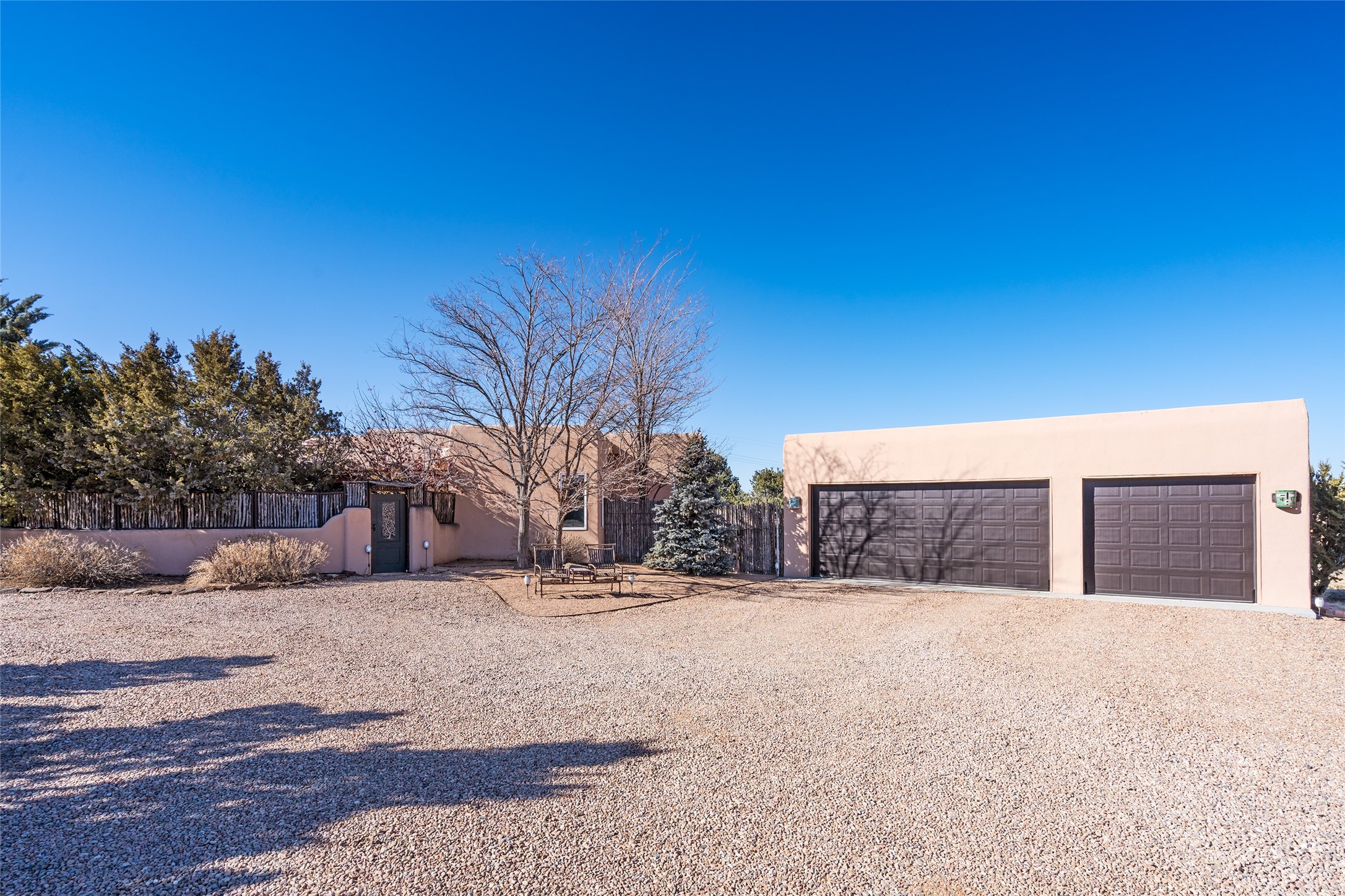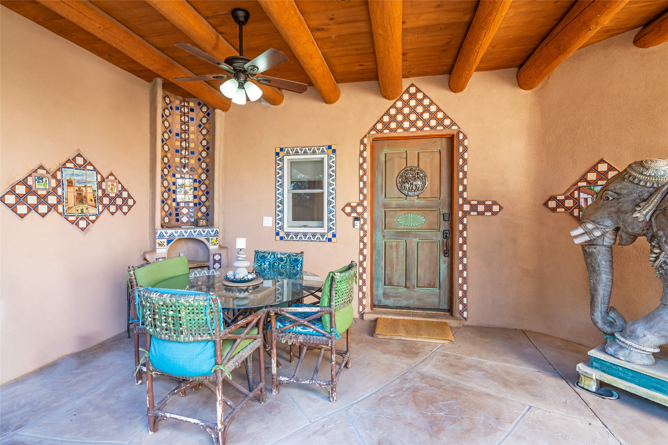 Lovely Eldorado home on 1.61 acres with views! Walled in entry courtyard with a Koi pond plus several outdoor portals with a green belt bordering the property in the back area. 3 bedrooms, 2 1/2 baths with an attached artist studio with a sink and upgraded 220 electric. There is a heated office area off the laundry room which is next to the heated studio. Three Kiva fireplaces and many colorful Santa Fe touches with an Asian twist! Vigas, Latilla ceilings, nichos, built-in bancos, vivid tile murals and 17" x 17" ceramic tile flooring throughout most of the home. New Weil McClain boiler installed in February 2025. Kitchen features stainless appliances with a newer Wolf induction cooktop, new LG refrigerator, Asko dishwasher, and new heavy duty Speed Queen washer/dryer. The kitchen cabinets have animated, hand painted tin motif panels. One step down to the Living area plus there is a den right by the kitchen. A bookshelf features a secret door that goes from the den to the entryway. Four mini-splits installed about 4 years ago. Roof redone by Santa Fe Roofing and Stucco; transferrable warranty until 11/2034. A heated walk way to the detached 3 car garage (874 square feet) was added in 2018 with built in California Closets cabinets. The garage also has epoxy painted floors and 2 skylights for natural light; with one skylight that can manually open. Mature landscaping with inground irrigation plus many apple, cherry and pear trees. Don't miss this delightful property; a peaceful oasis with plenty of Southwest charm.