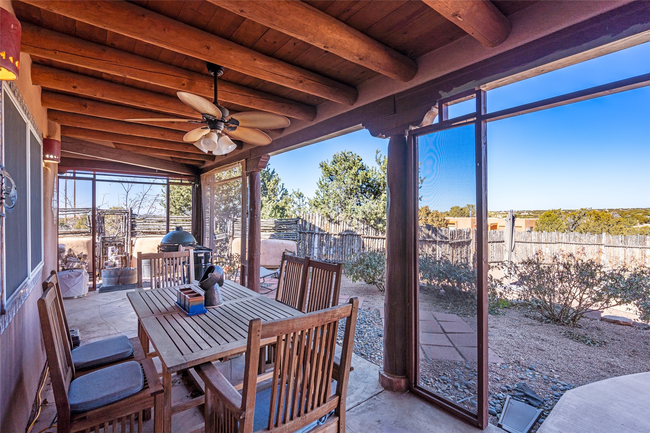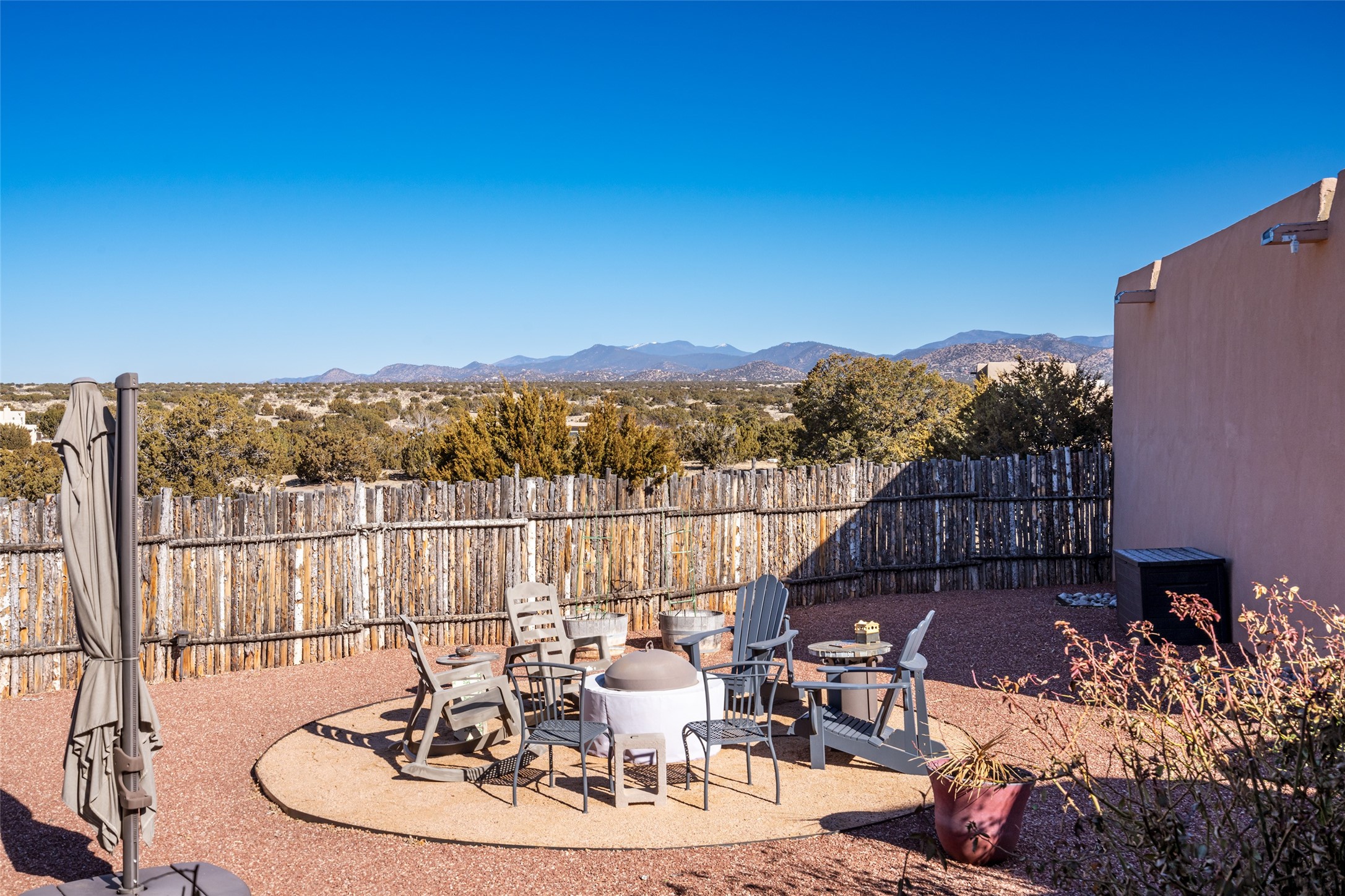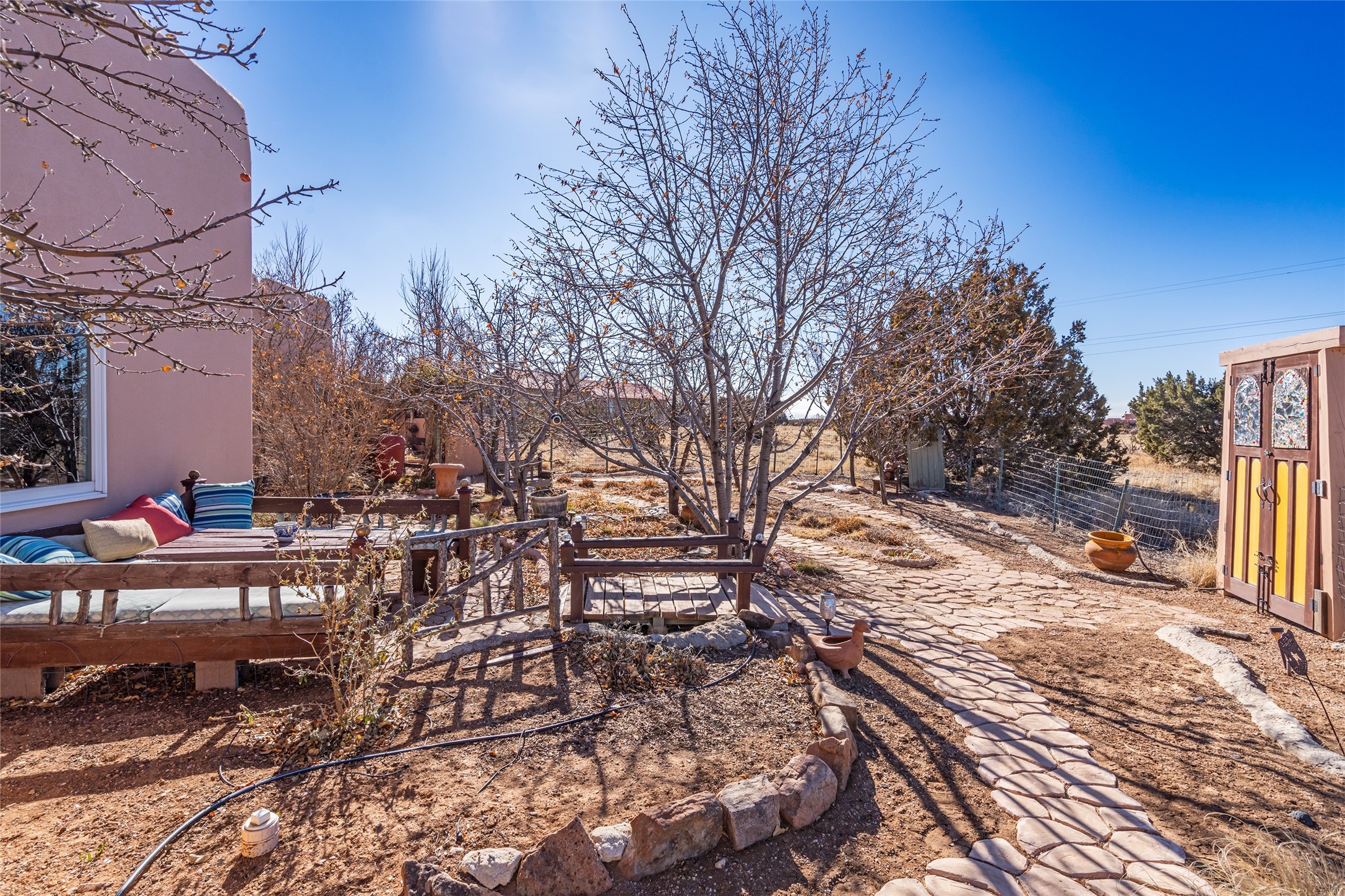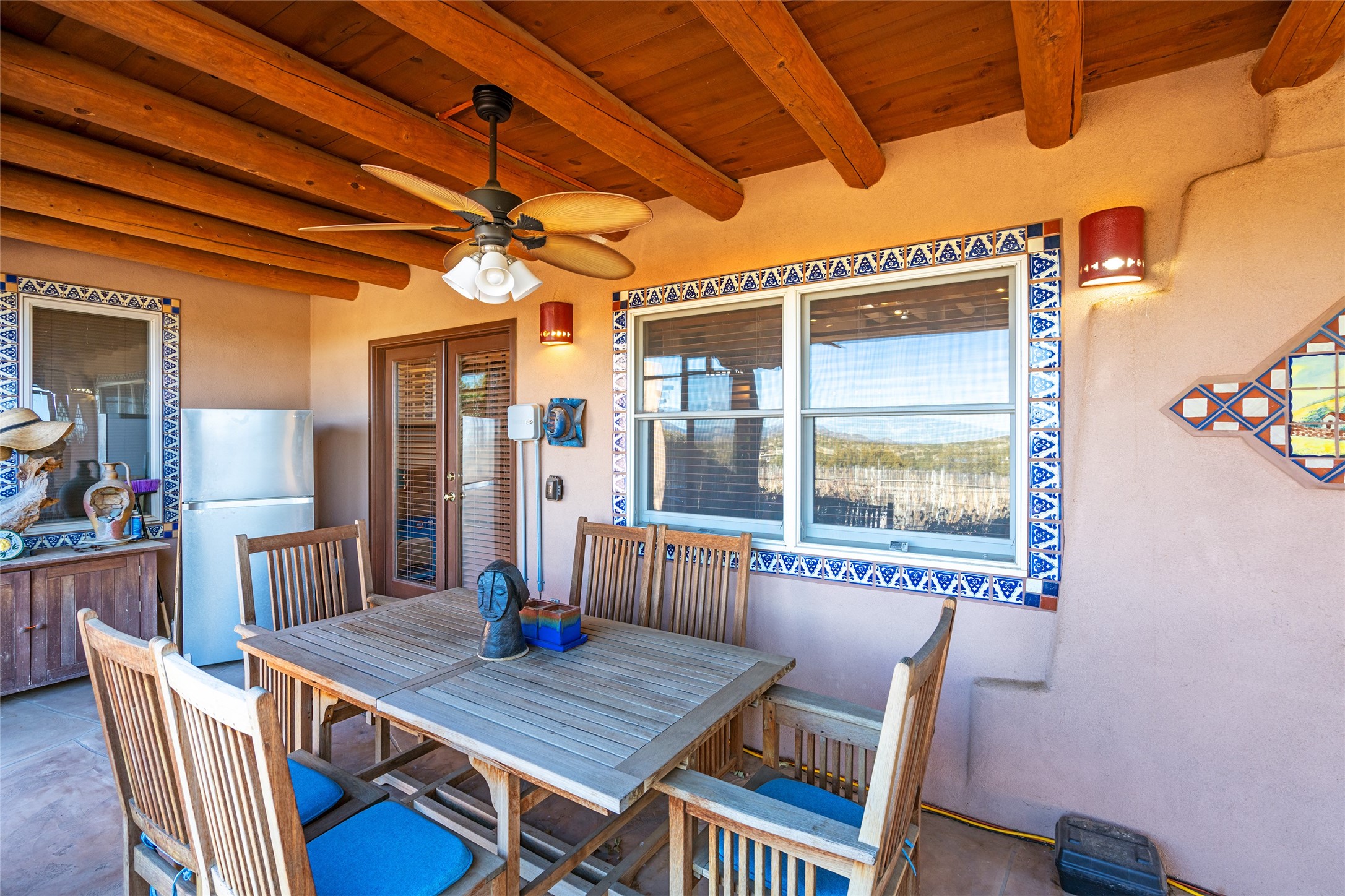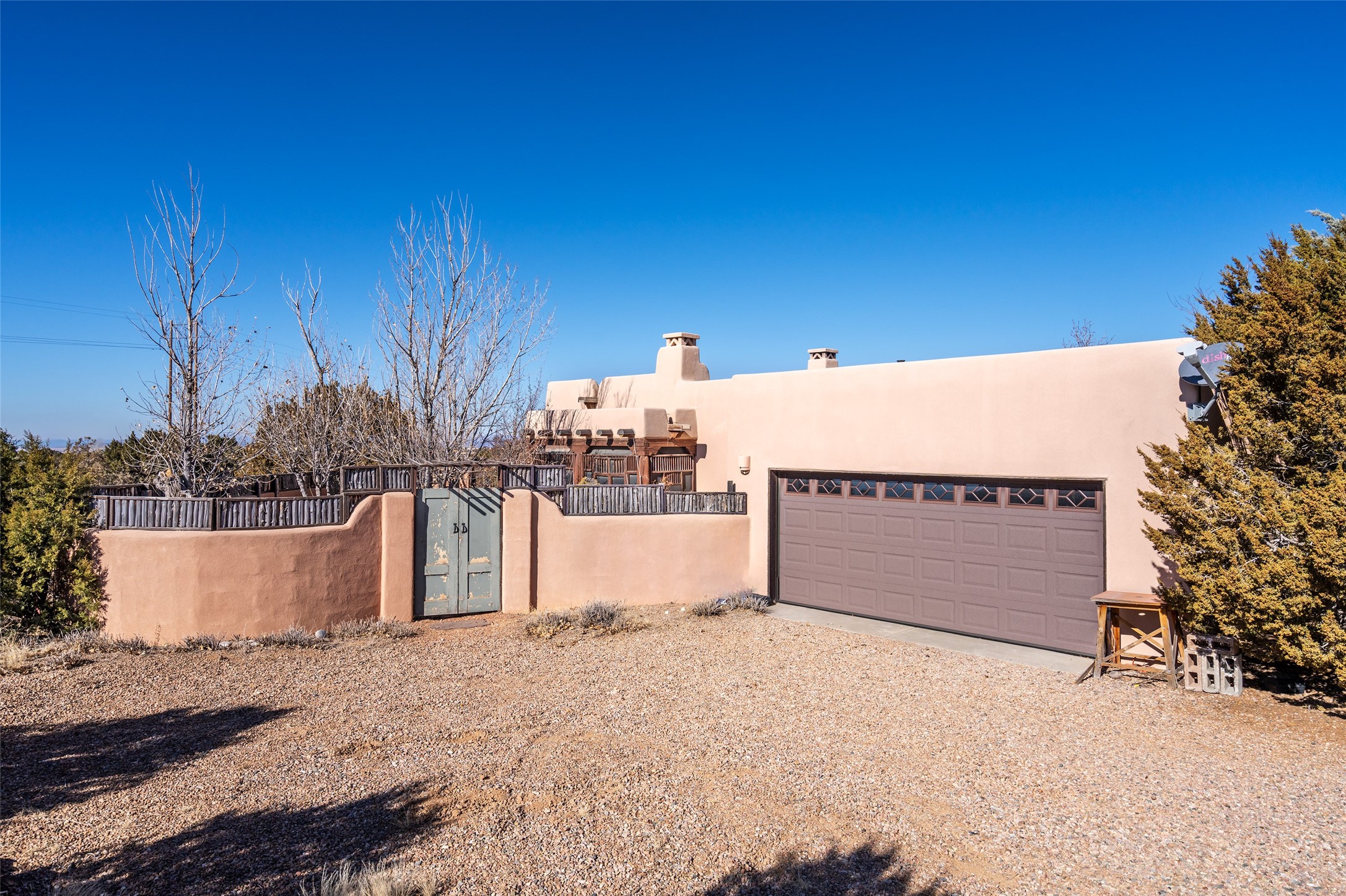 Lovely Eldorado home on 1.61 acres with views! Walled in entry courtyard with a Koi pond plus several outdoor portals with a green belt bordering the property in the back area. 3 bedrooms, 2 1/2 baths with an attached artist studio with a sink and upgraded 220 electric. There is a heated office area off the laundry room which is next to the heated studio. Three Kiva fireplaces and many colorful Santa Fe touches with an Asian twist! Vigas, Latilla ceilings, nichos, built-in bancos, vivid tile murals and 17" x 17" ceramic tile flooring throughout most of the home. New Weil McClain boiler installed in February 2025. Kitchen features stainless appliances with a newer Wolf induction cooktop, new LG refrigerator, Asko dishwasher, and new heavy duty Speed Queen washer/dryer. The kitchen cabinets have animated, hand painted tin motif panels. One step down to the Living area plus there is a den right by the kitchen. A bookshelf features a secret door that goes from the den to the entryway. Four mini-splits installed about 4 years ago. Roof redone by Santa Fe Roofing and Stucco; transferrable warranty until 11/2034. A heated walk way to the detached 3 car garage (874 square feet) was added in 2018 with built in California Closets cabinets. The garage also has epoxy painted floors and 2 skylights for natural light; with one skylight that can manually open. Mature landscaping with inground irrigation plus many apple, cherry and pear trees. Don't miss this delightful property; a peaceful oasis with plenty of Southwest charm.