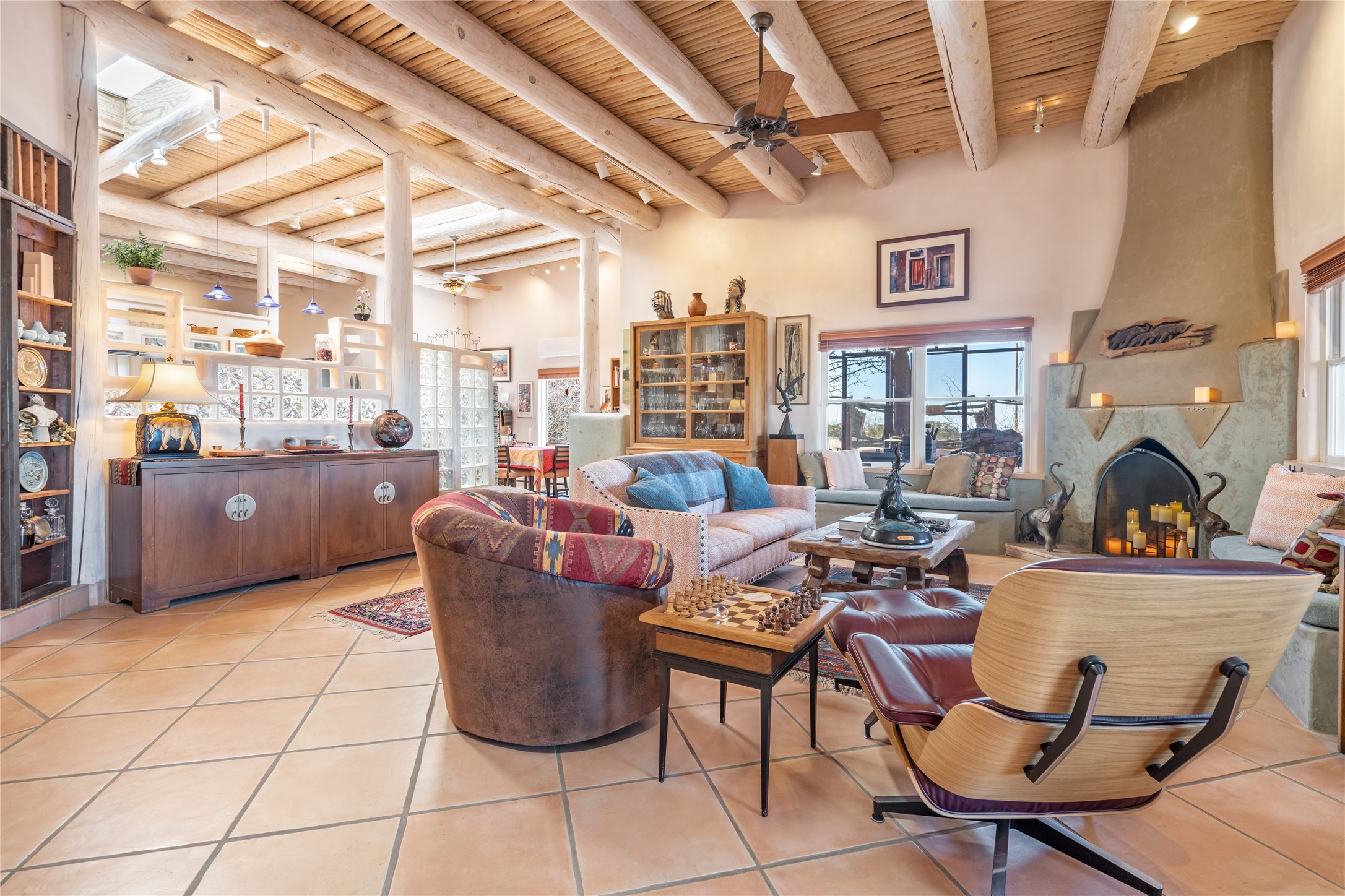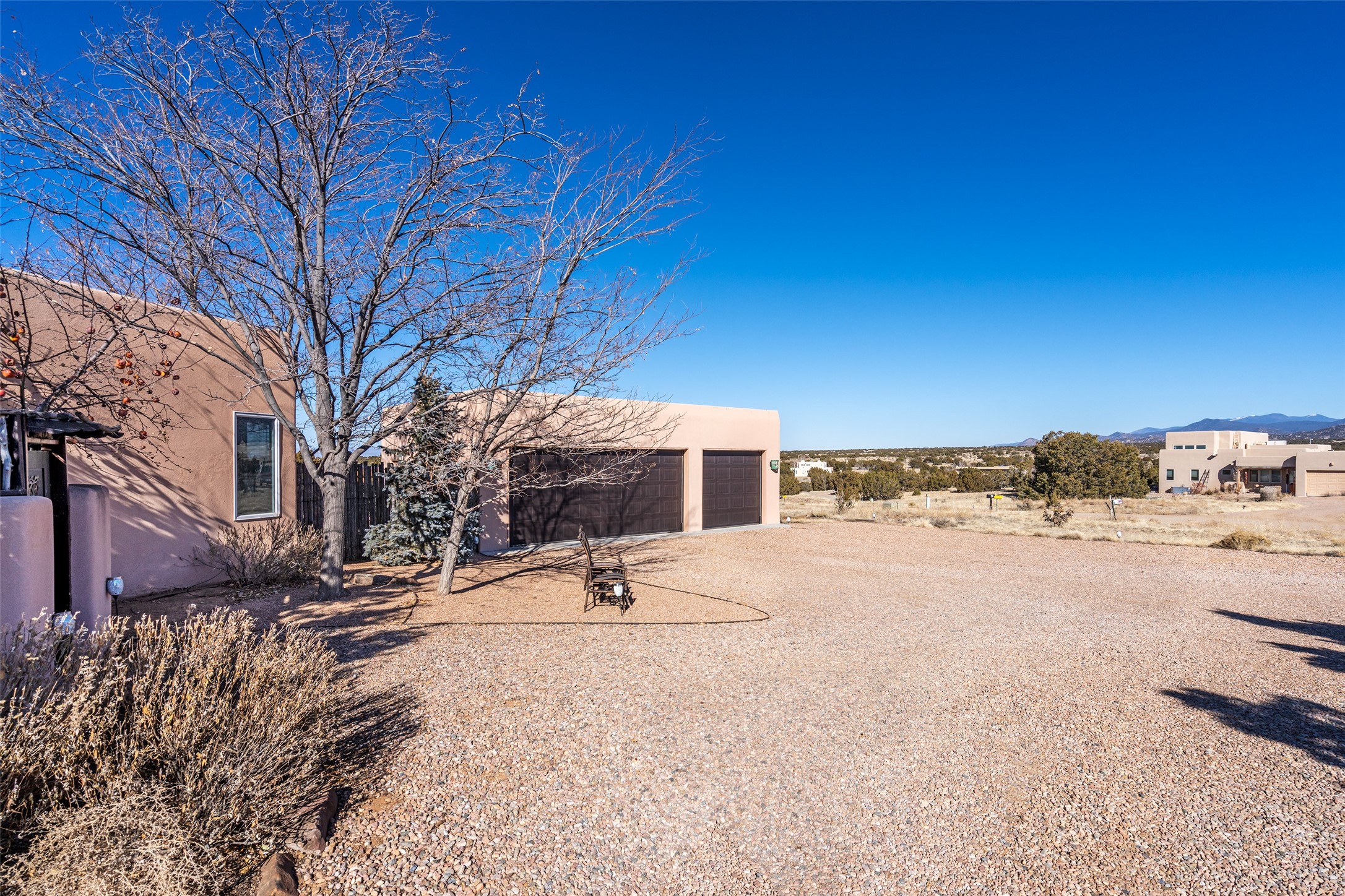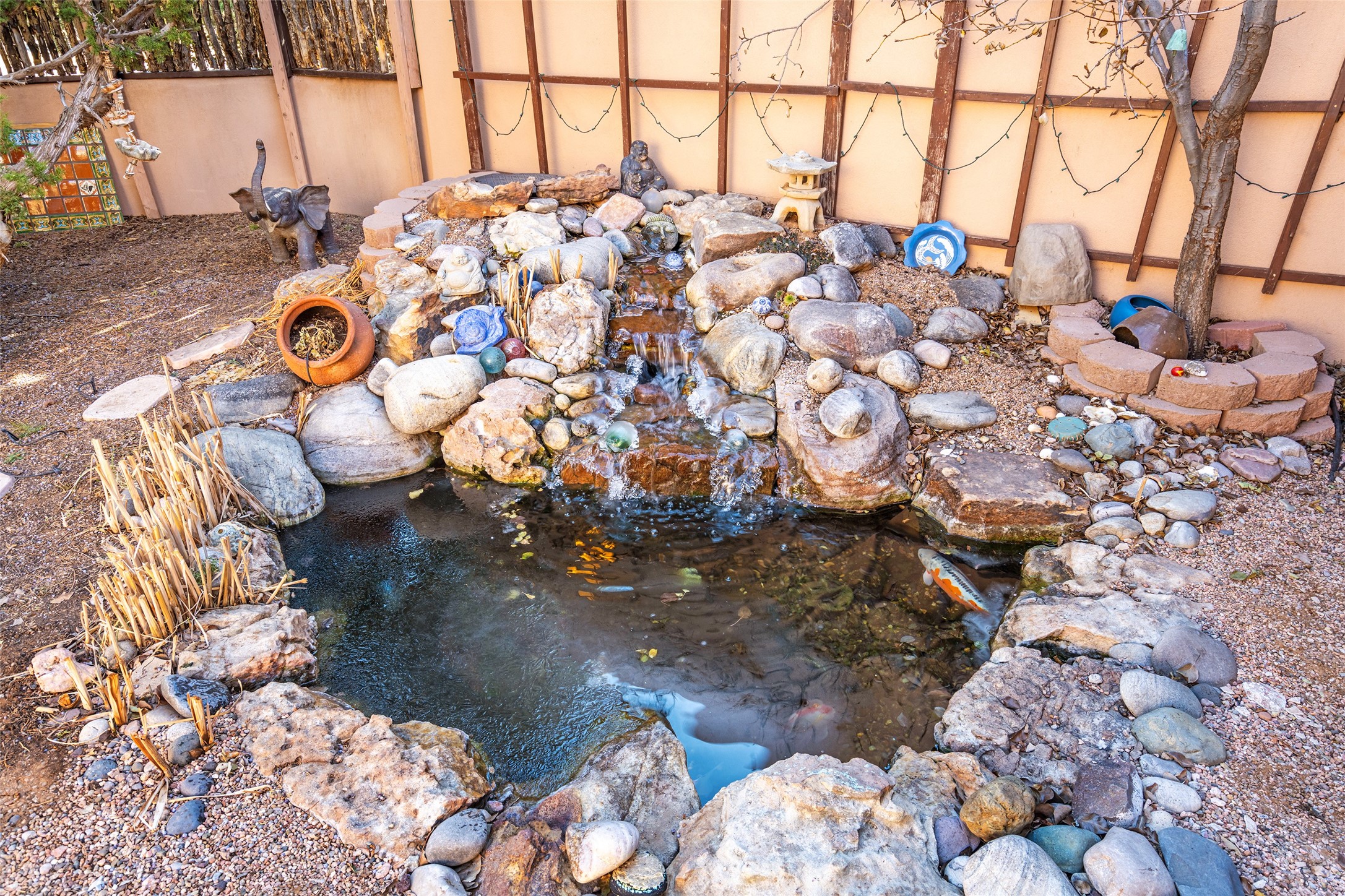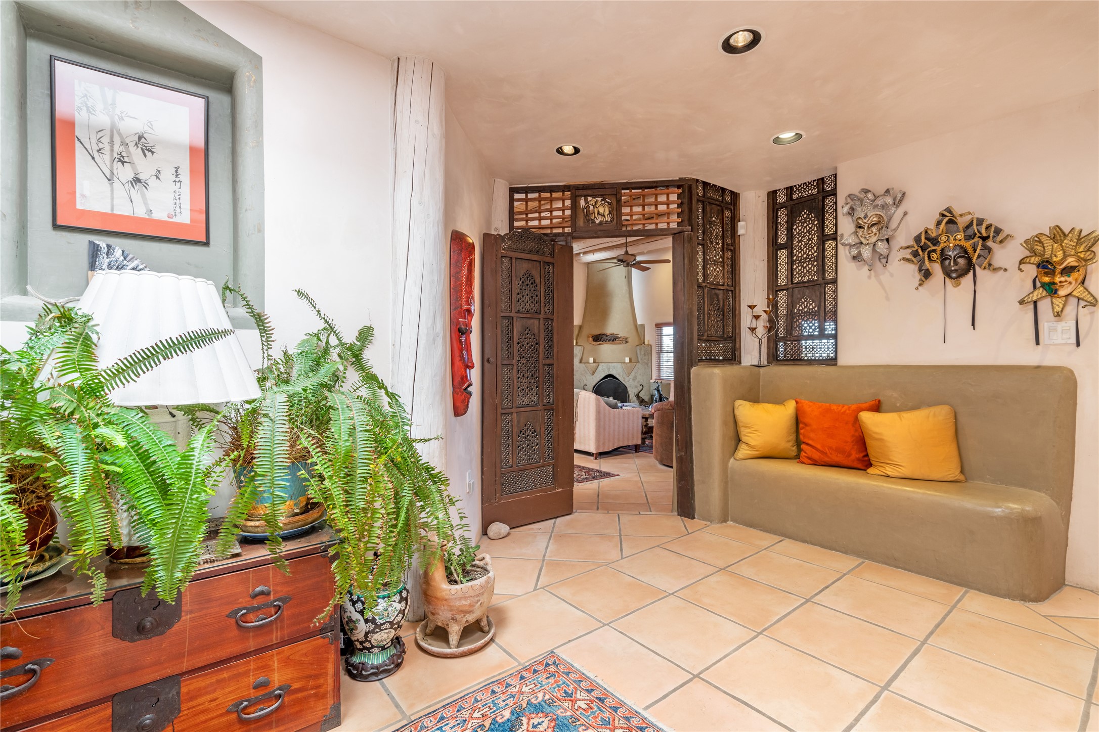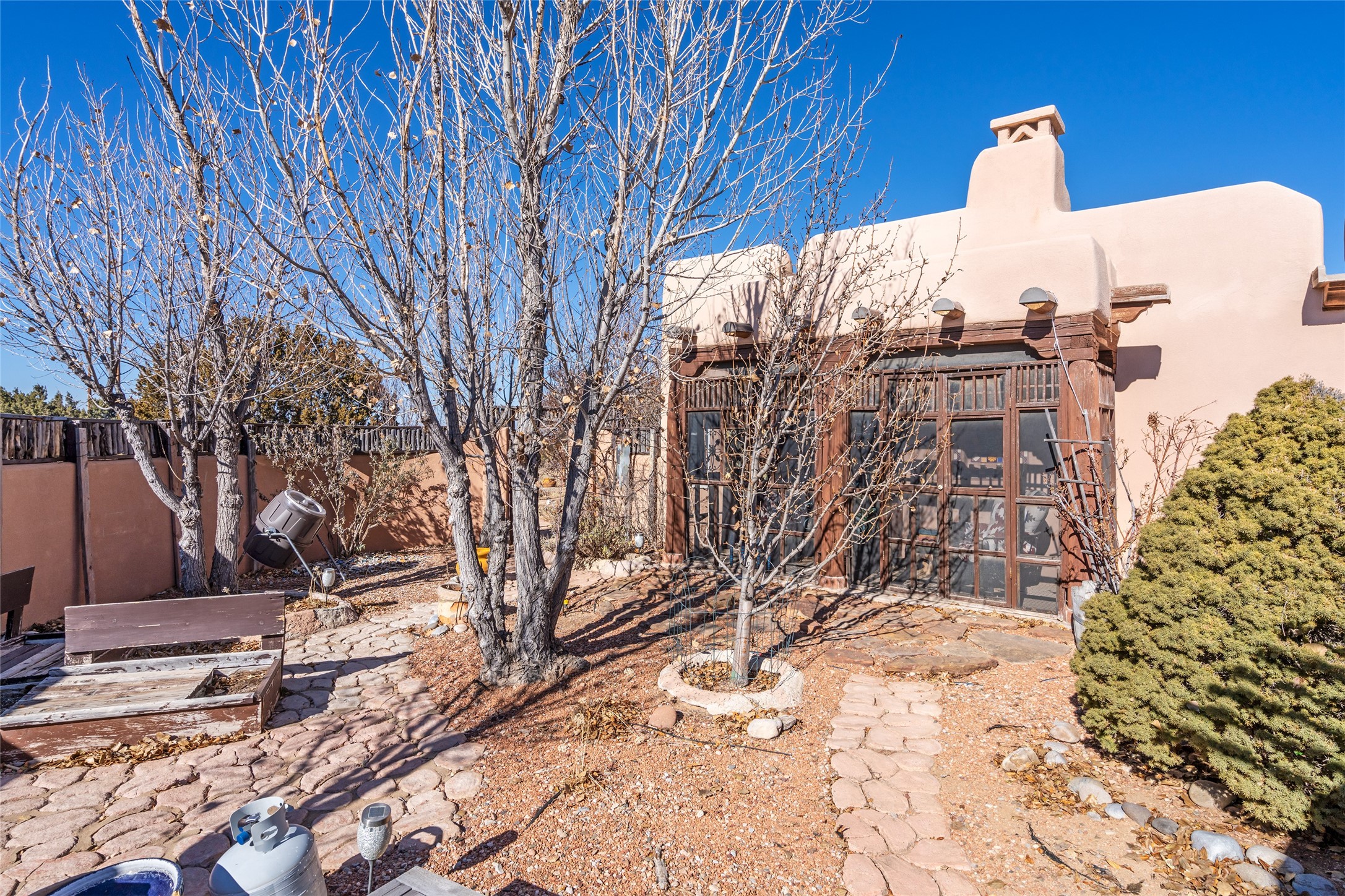Lovely Eldorado home on 1.61 acres with views! Walled in entry courtyard with a Koi pond plus several outdoor portals with a green belt bordering the property in the back area. 3 bedrooms, 2 1/2 baths with an attached artist studio with a sink and upgraded 220 electric. There is a heated office area off the laundry room which is next to the heated studio. Three Kiva fireplaces and many colorful Santa Fe touches with an Asian twist! Vigas, Latilla ceilings, nichos, built-in bancos, vivid tile murals and 17" x 17" ceramic tile flooring throughout most of the home. New Weil McClain boiler installed in February 2025. Kitchen features stainless appliances with a newer Wolf induction cooktop, new LG refrigerator, Asko dishwasher, and new heavy duty Speed Queen washer/dryer. The kitchen cabinets have animated, hand painted tin motif panels. One step down to the Living area plus there is a den right by the kitchen. A bookshelf features a secret door that goes from the den to the entryway. Four mini-splits installed about 4 years ago. Roof redone by Santa Fe Roofing and Stucco; transferrable warranty until 11/2034. A heated walk way to the detached 3 car garage (874 square feet) was added in 2018 with built in California Closets cabinets. The garage also has epoxy painted floors and 2 skylights for natural light; with one skylight that can manually open. Mature landscaping with inground irrigation plus many apple, cherry and pear trees. Don't miss this delightful property; a peaceful oasis with plenty of Southwest charm.