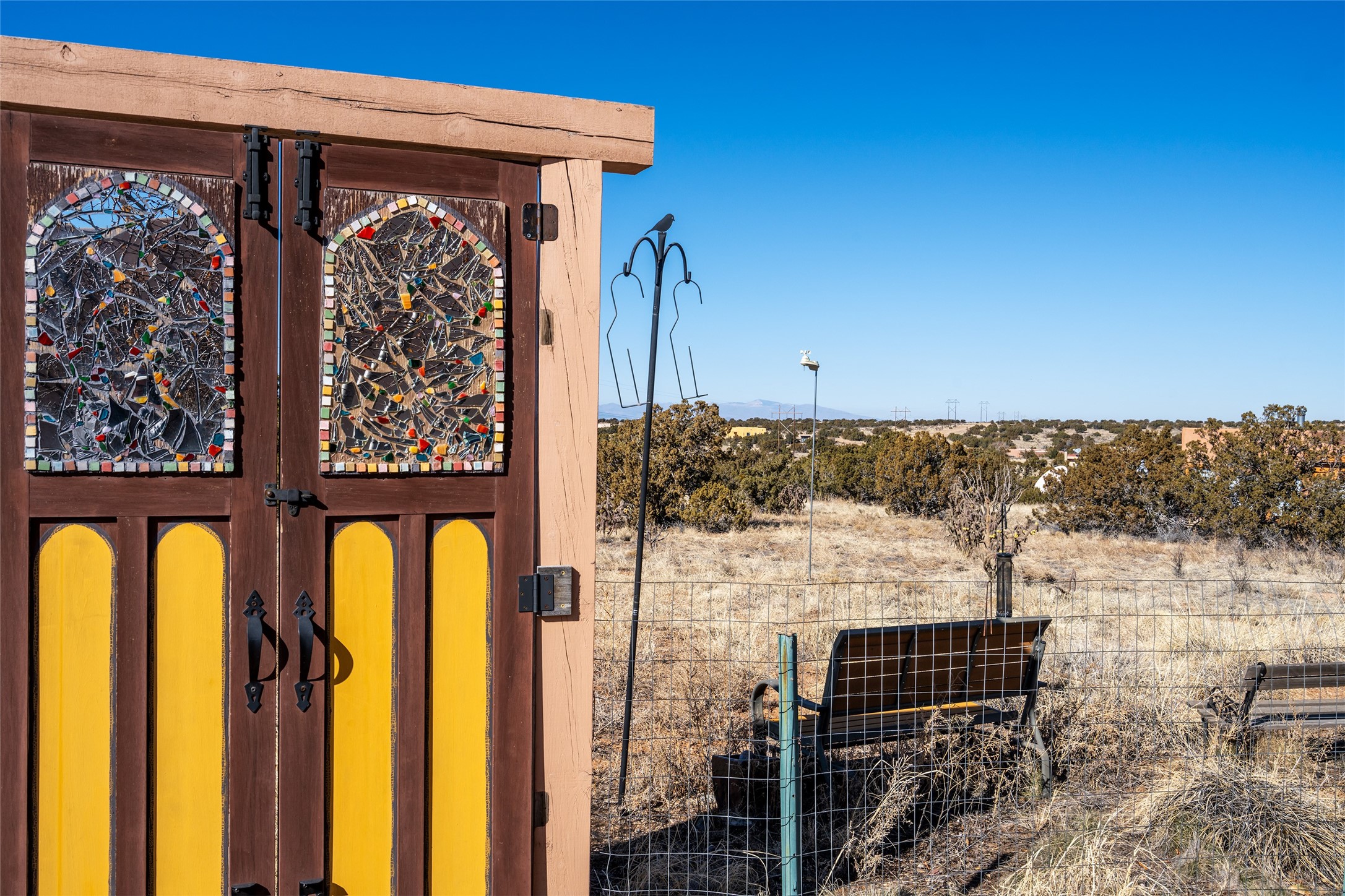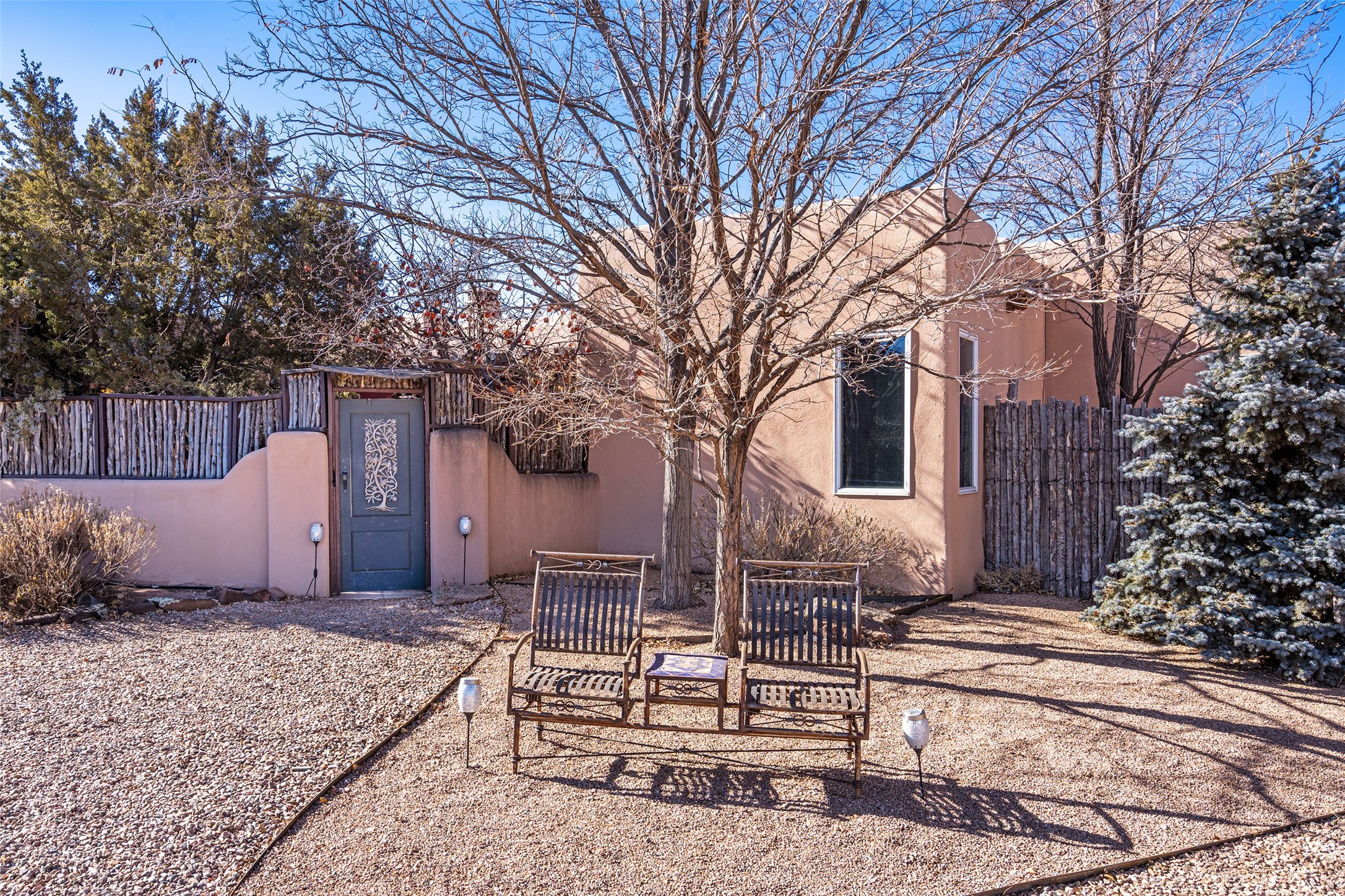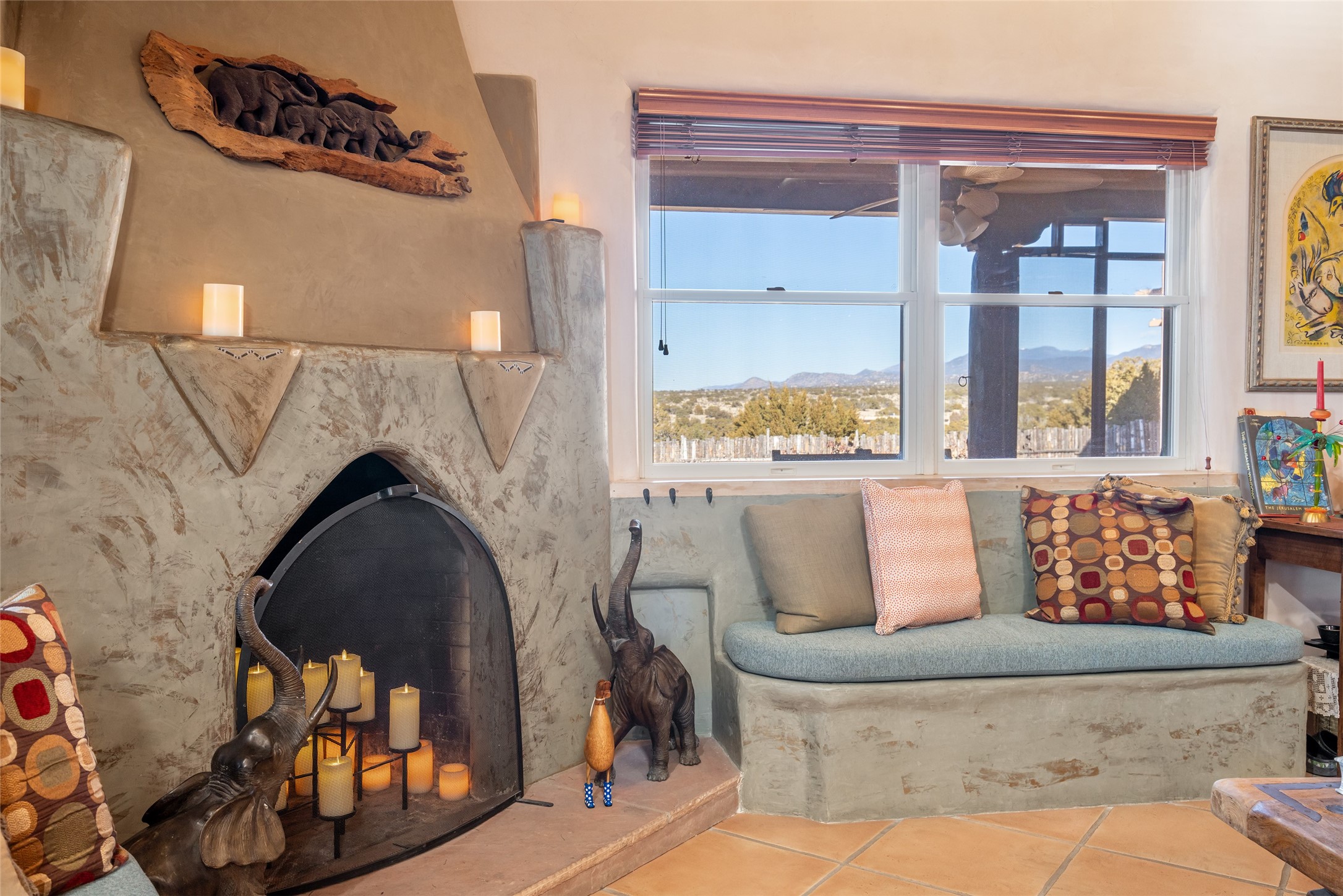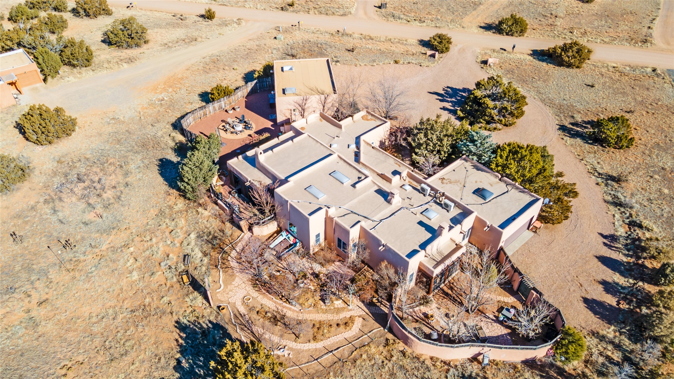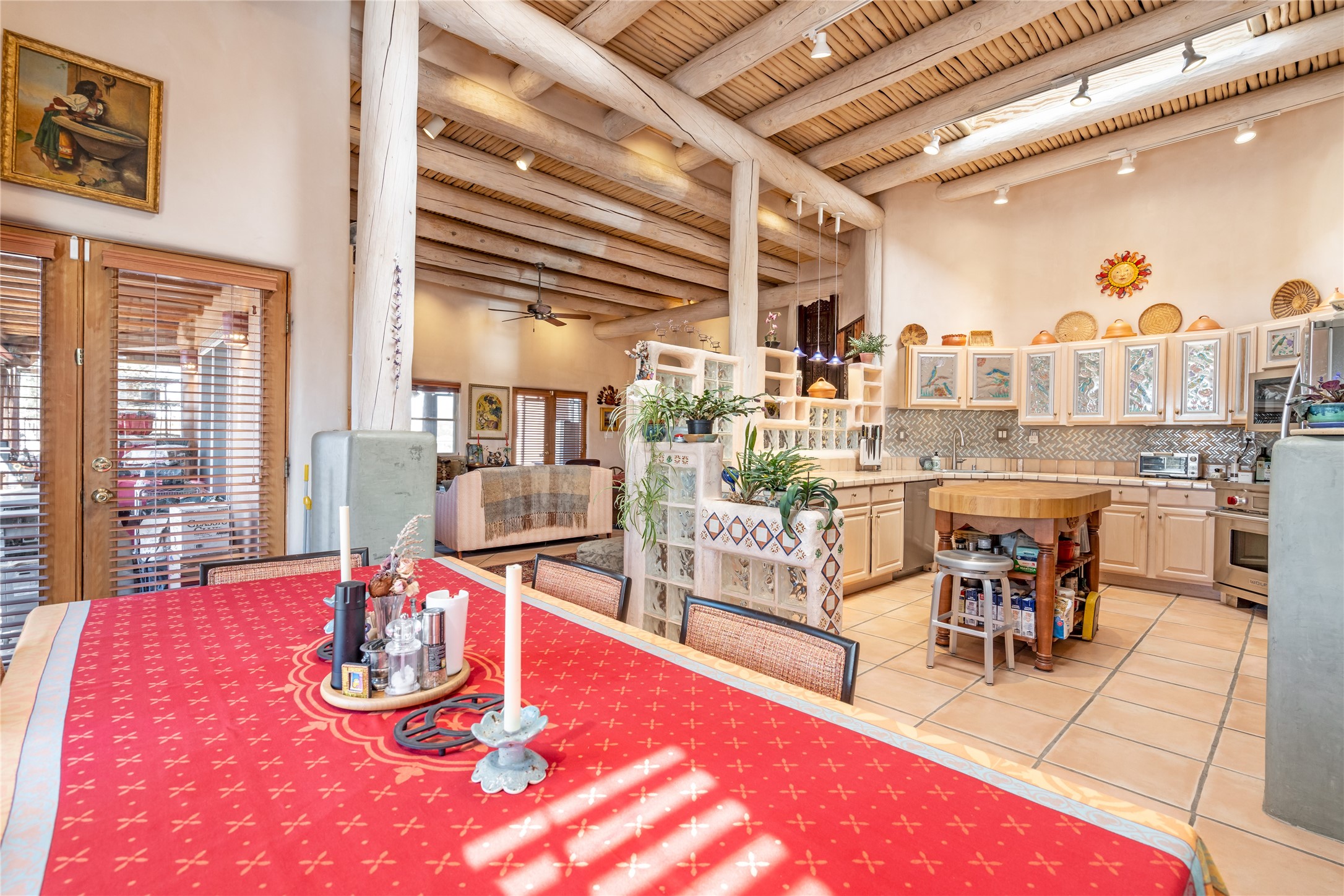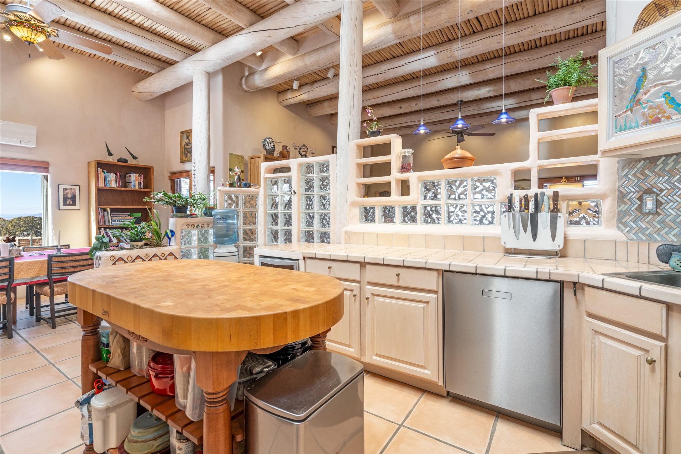 Lovely Eldorado home on 1.61 acres with views! Walled in entry courtyard with a Koi pond plus several outdoor portals with a green belt bordering the property in the back area. 3 bedrooms, 2 1/2 baths with an attached artist studio with a sink and upgraded 220 electric. There is a heated office area off the laundry room which is next to the heated studio. Three Kiva fireplaces and many colorful Santa Fe touches with an Asian twist! Vigas, Latilla ceilings, nichos, built-in bancos, vivid tile murals and 17" x 17" ceramic tile flooring throughout most of the home. New Weil McClain boiler installed in February 2025. Kitchen features stainless appliances with a newer Wolf induction cooktop, new LG refrigerator, Asko dishwasher, and new heavy duty Speed Queen washer/dryer. The kitchen cabinets have animated, hand painted tin motif panels. One step down to the Living area plus there is a den right by the kitchen. A bookshelf features a secret door that goes from the den to the entryway. Four mini-splits installed about 4 years ago. Roof redone by Santa Fe Roofing and Stucco; transferrable warranty until 11/2034. A heated walk way to the detached 3 car garage (874 square feet) was added in 2018 with built in California Closets cabinets. The garage also has epoxy painted floors and 2 skylights for natural light; with one skylight that can manually open. Mature landscaping with inground irrigation plus many apple, cherry and pear trees. Don't miss this delightful property; a peaceful oasis with plenty of Southwest charm.