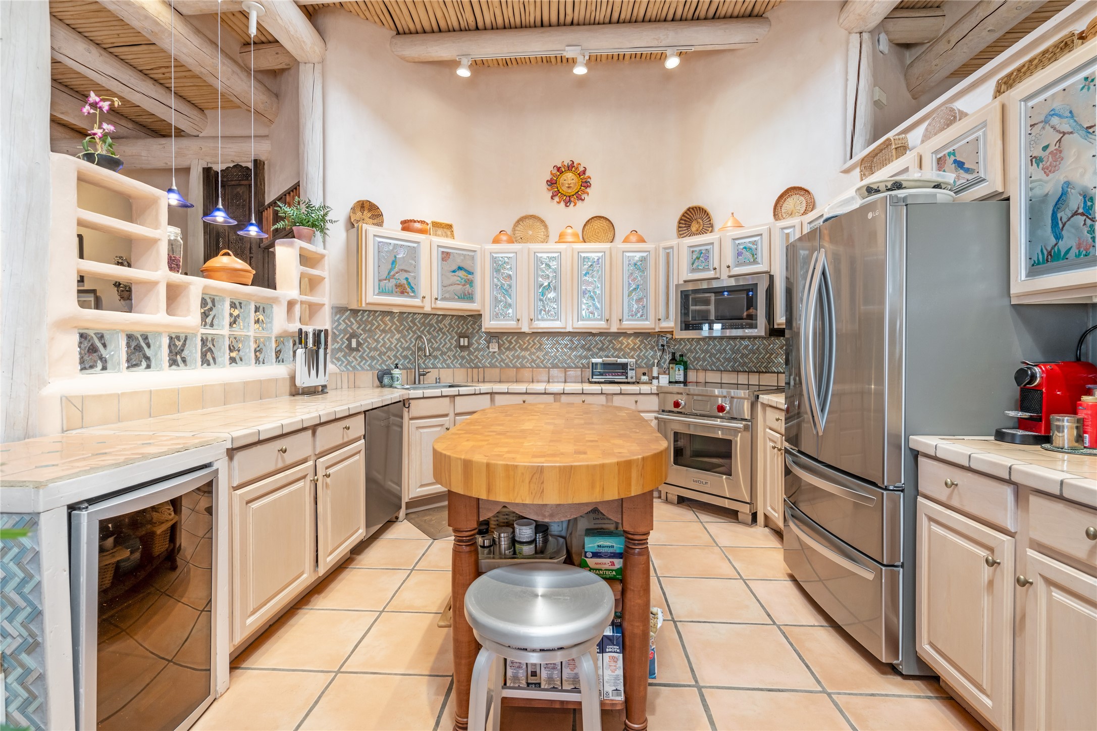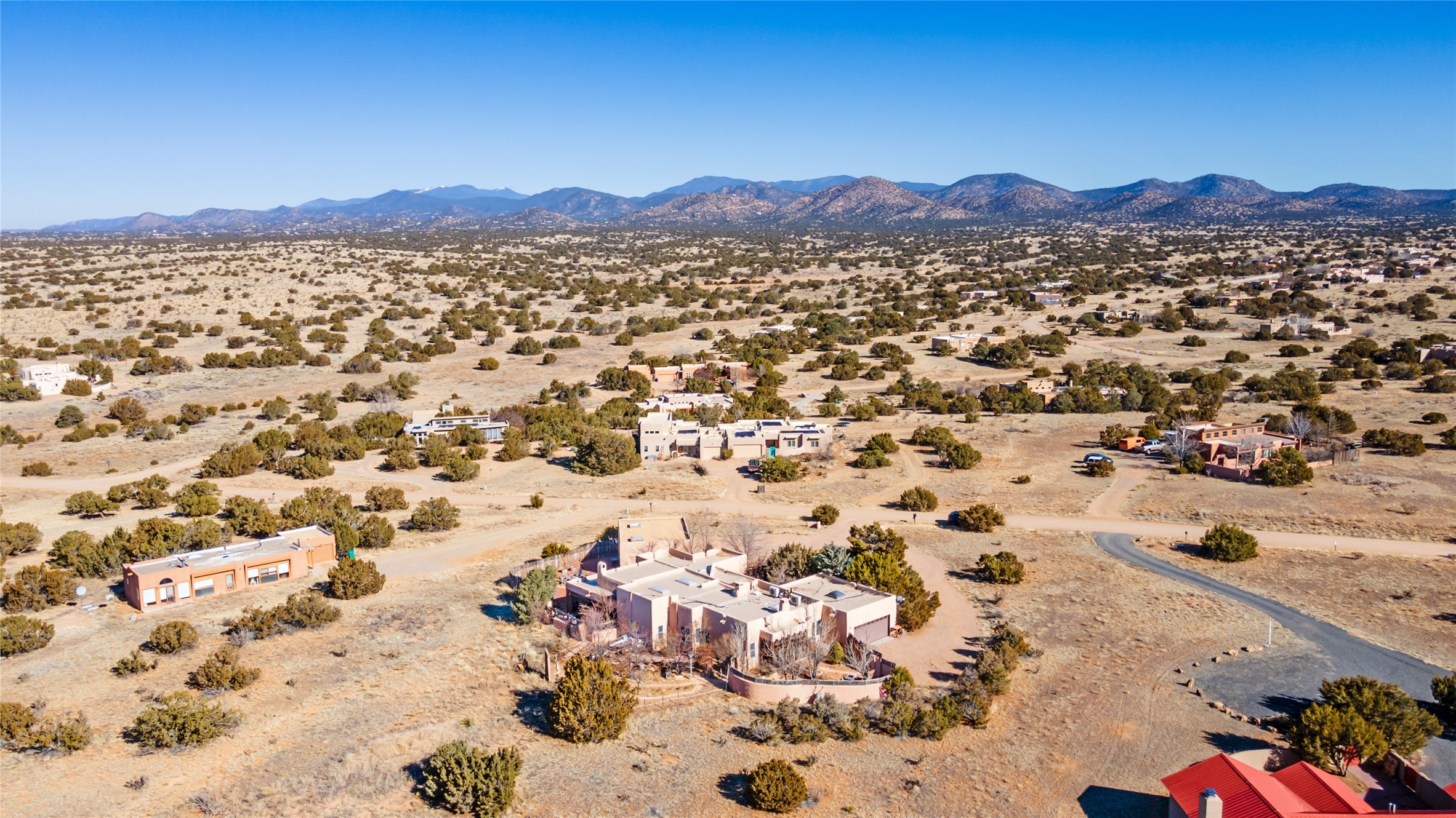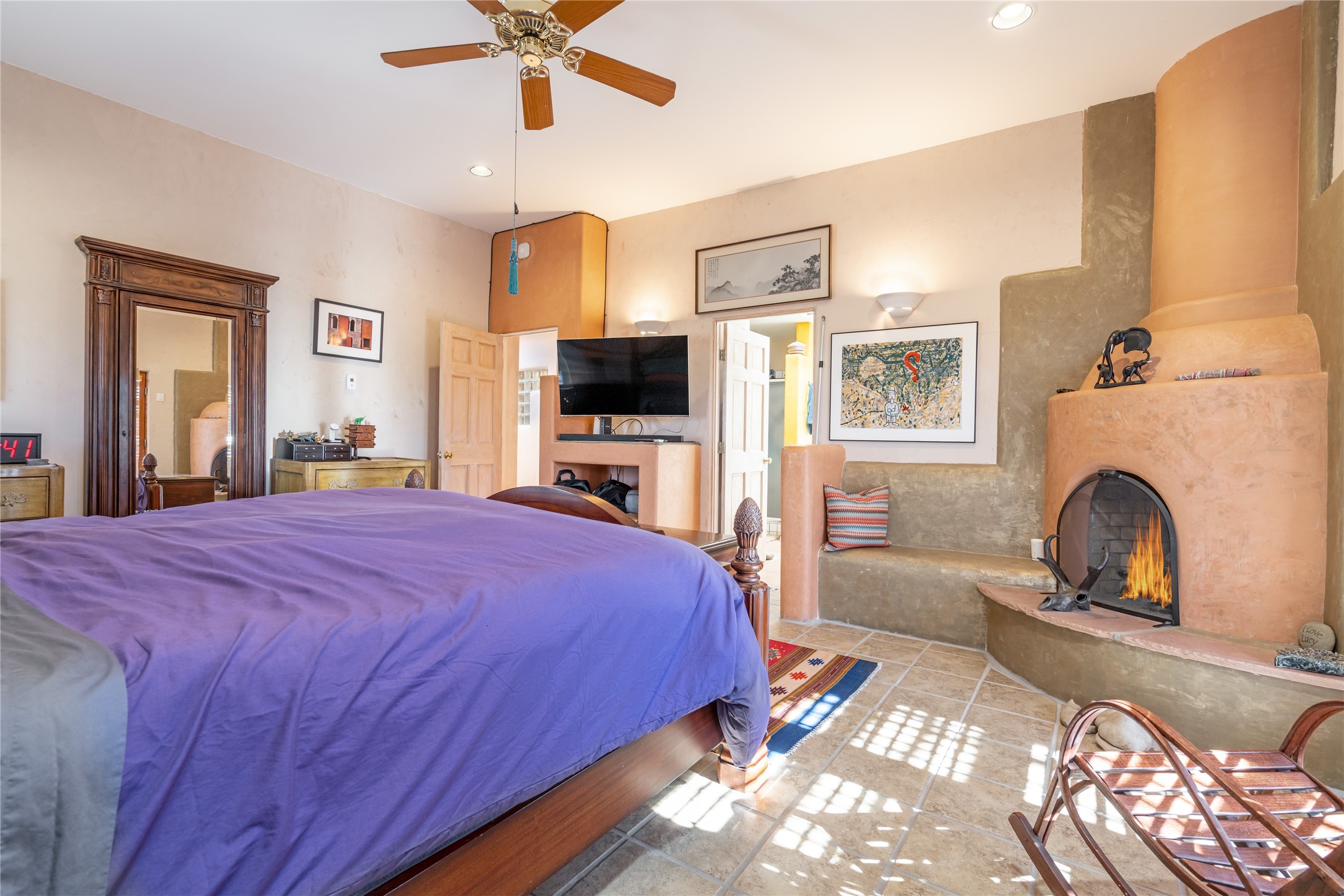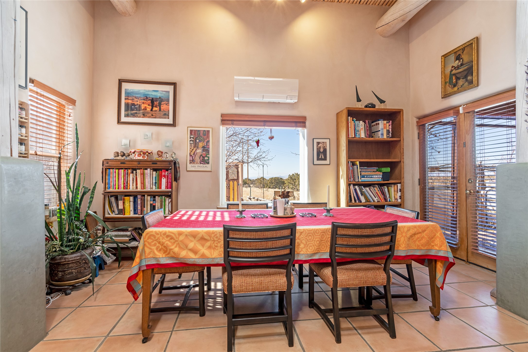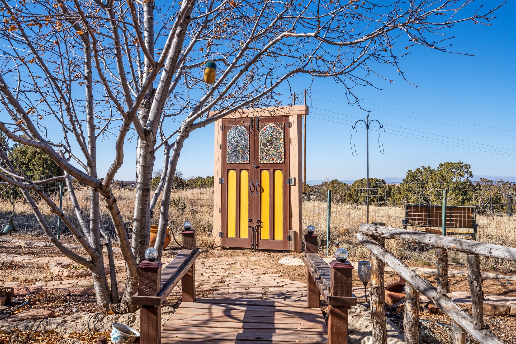 Lovely Eldorado home on 1.61 acres with views! Walled in entry courtyard with a Koi pond plus several outdoor portals with a green belt bordering the property in the back area. 3 bedrooms, 2 1/2 baths with an attached artist studio with a sink and upgraded 220 electric. There is a heated office area off the laundry room which is next to the heated studio. Three Kiva fireplaces and many colorful Santa Fe touches with an Asian twist! Vigas, Latilla ceilings, nichos, built-in bancos, vivid tile murals and 17" x 17" ceramic tile flooring throughout most of the home. New Weil McClain boiler installed in February 2025. Kitchen features stainless appliances with a newer Wolf induction cooktop, new LG refrigerator, Asko dishwasher, and new heavy duty Speed Queen washer/dryer. The kitchen cabinets have animated, hand painted tin motif panels. One step down to the Living area plus there is a den right by the kitchen. A bookshelf features a secret door that goes from the den to the entryway. Four mini-splits installed about 4 years ago. Roof redone by Santa Fe Roofing and Stucco; transferrable warranty until 11/2034. A heated walk way to the detached 3 car garage (874 square feet) was added in 2018 with built in California Closets cabinets. The garage also has epoxy painted floors and 2 skylights for natural light; with one skylight that can manually open. Mature landscaping with inground irrigation plus many apple, cherry and pear trees. Don't miss this delightful property; a peaceful oasis with plenty of Southwest charm.