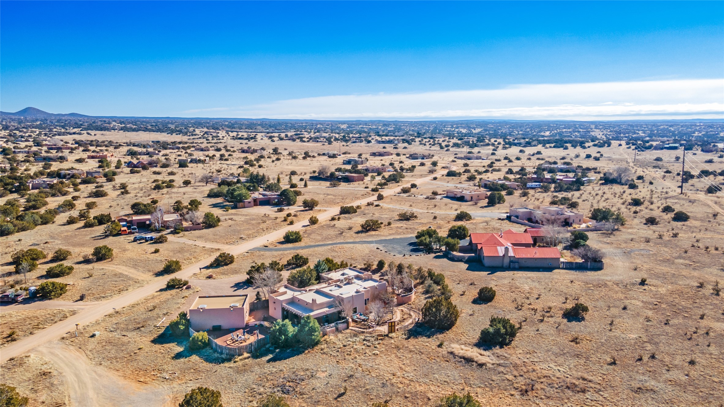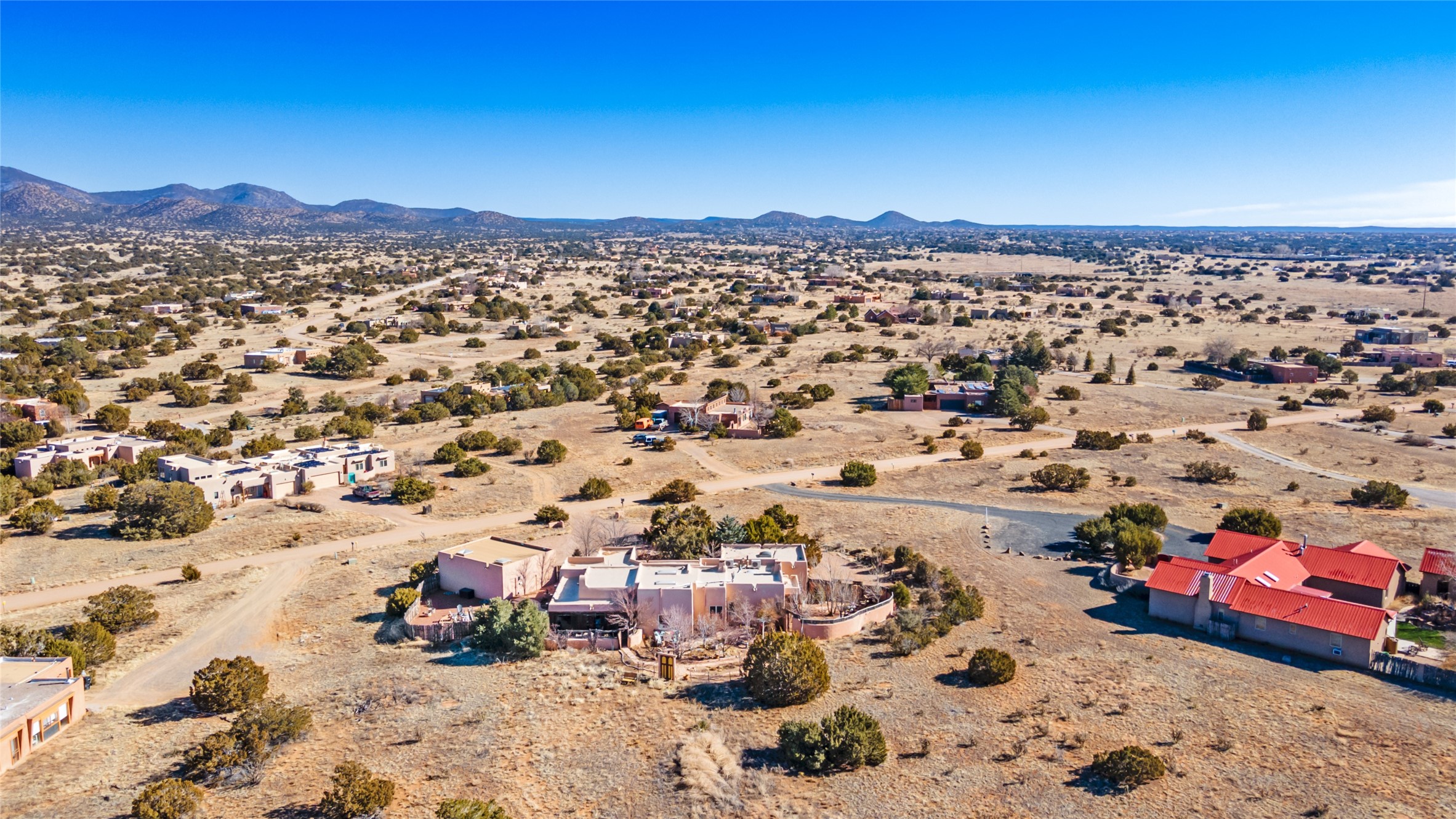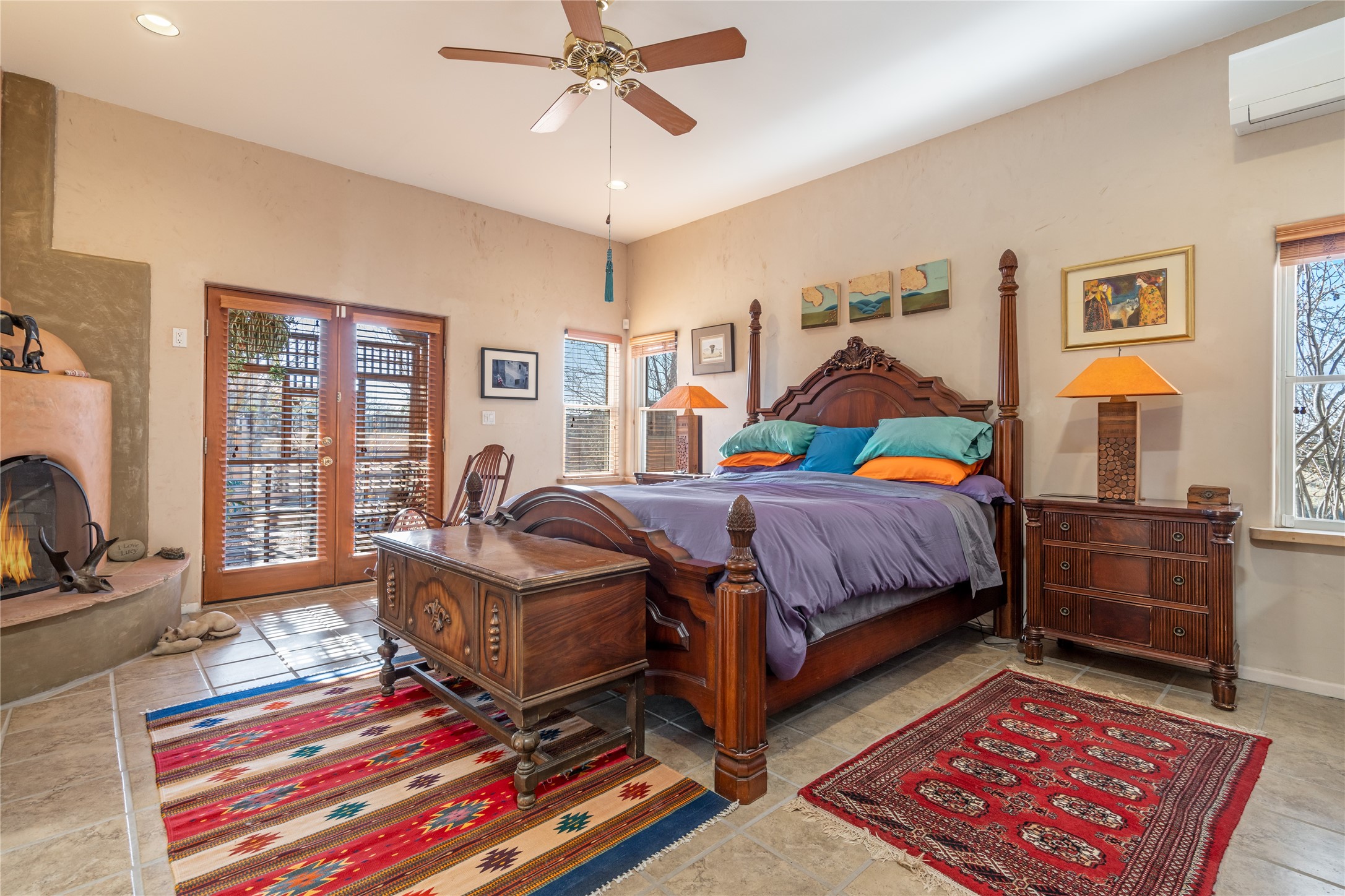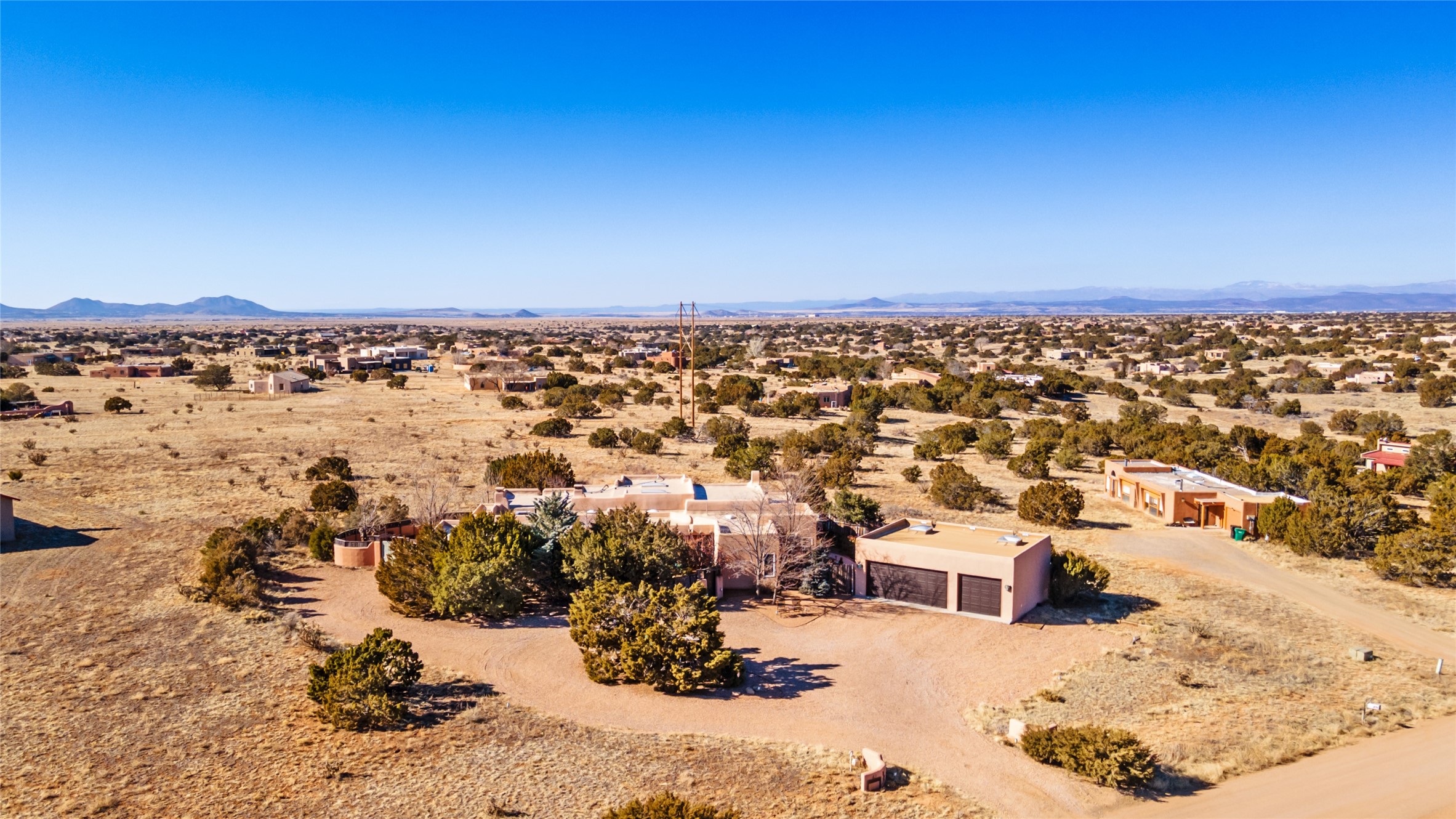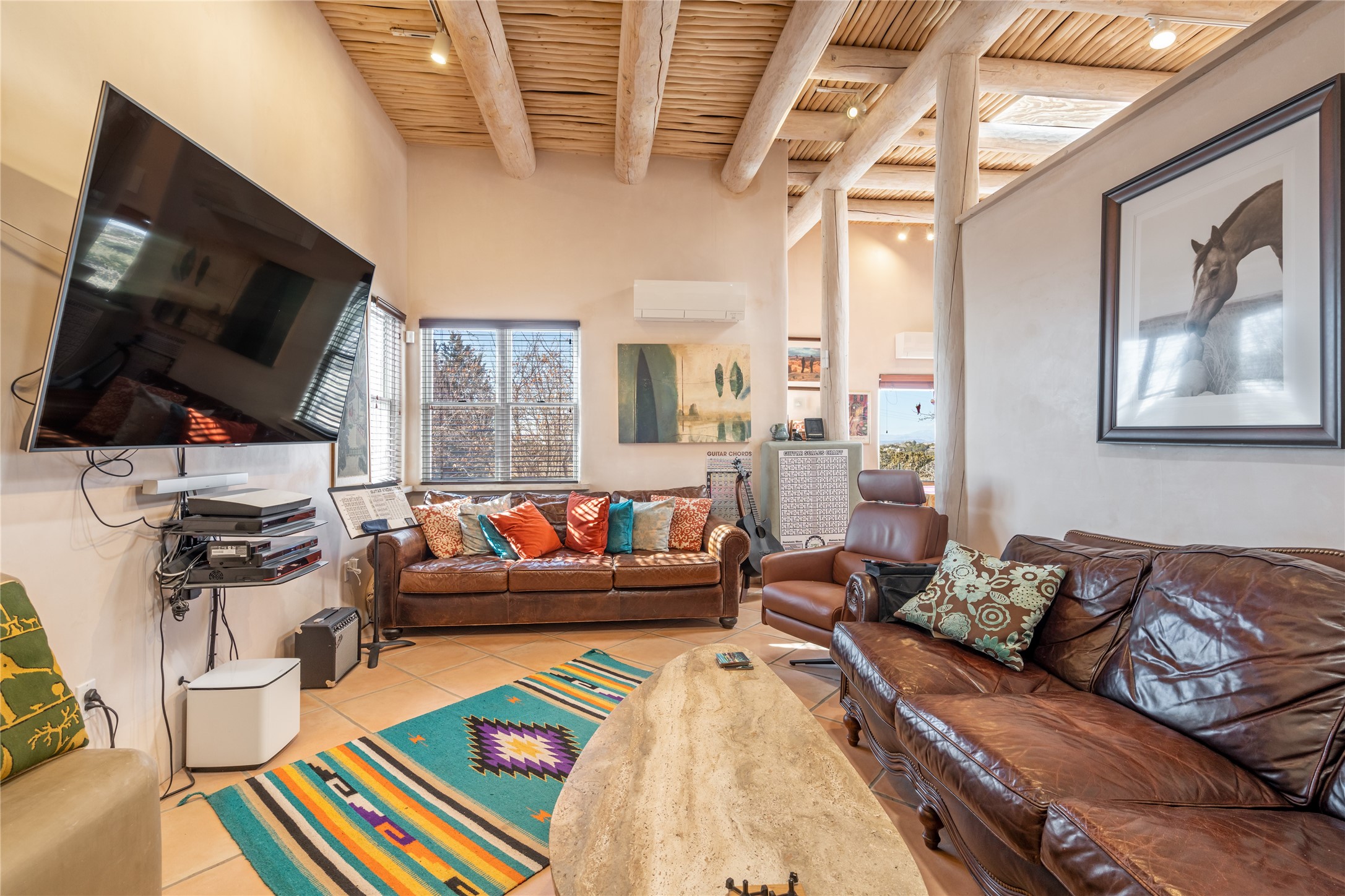Lovely Eldorado home on 1.61 acres with views! Walled in entry courtyard with a Koi pond plus several outdoor portals with a green belt bordering the property in the back area. 3 bedrooms, 2 1/2 baths with an attached artist studio with a sink and upgraded 220 electric. There is a heated office area off the laundry room which is next to the heated studio. Three Kiva fireplaces and many colorful Santa Fe touches with an Asian twist! Vigas, Latilla ceilings, nichos, built-in bancos, vivid tile murals and 17" x 17" ceramic tile flooring throughout most of the home. New Weil McClain boiler installed in February 2025. Kitchen features stainless appliances with a newer Wolf induction cooktop, new LG refrigerator, Asko dishwasher, and new heavy duty Speed Queen washer/dryer. The kitchen cabinets have animated, hand painted tin motif panels. One step down to the Living area plus there is a den right by the kitchen. A bookshelf features a secret door that goes from the den to the entryway. Four mini-splits installed about 4 years ago. Roof redone by Santa Fe Roofing and Stucco; transferrable warranty until 11/2034. A heated walk way to the detached 3 car garage (874 square feet) was added in 2018 with built in California Closets cabinets. The garage also has epoxy painted floors and 2 skylights for natural light; with one skylight that can manually open. Mature landscaping with inground irrigation plus many apple, cherry and pear trees. Don't miss this delightful property; a peaceful oasis with plenty of Southwest charm.