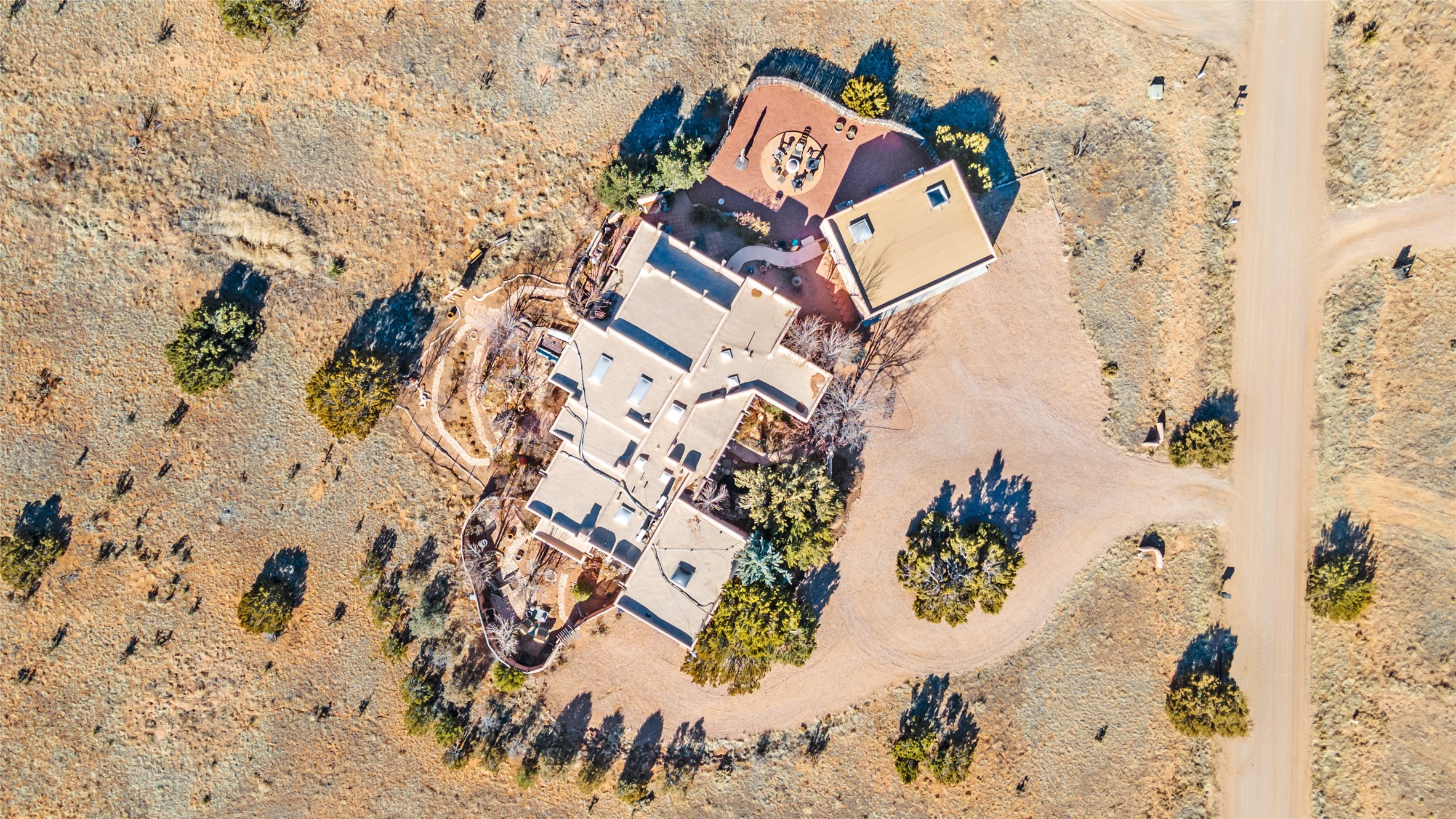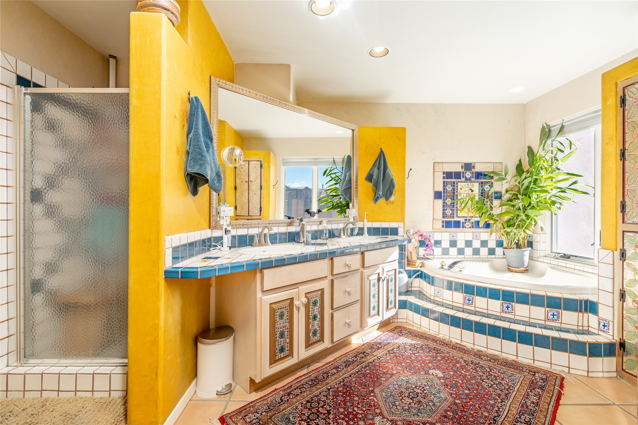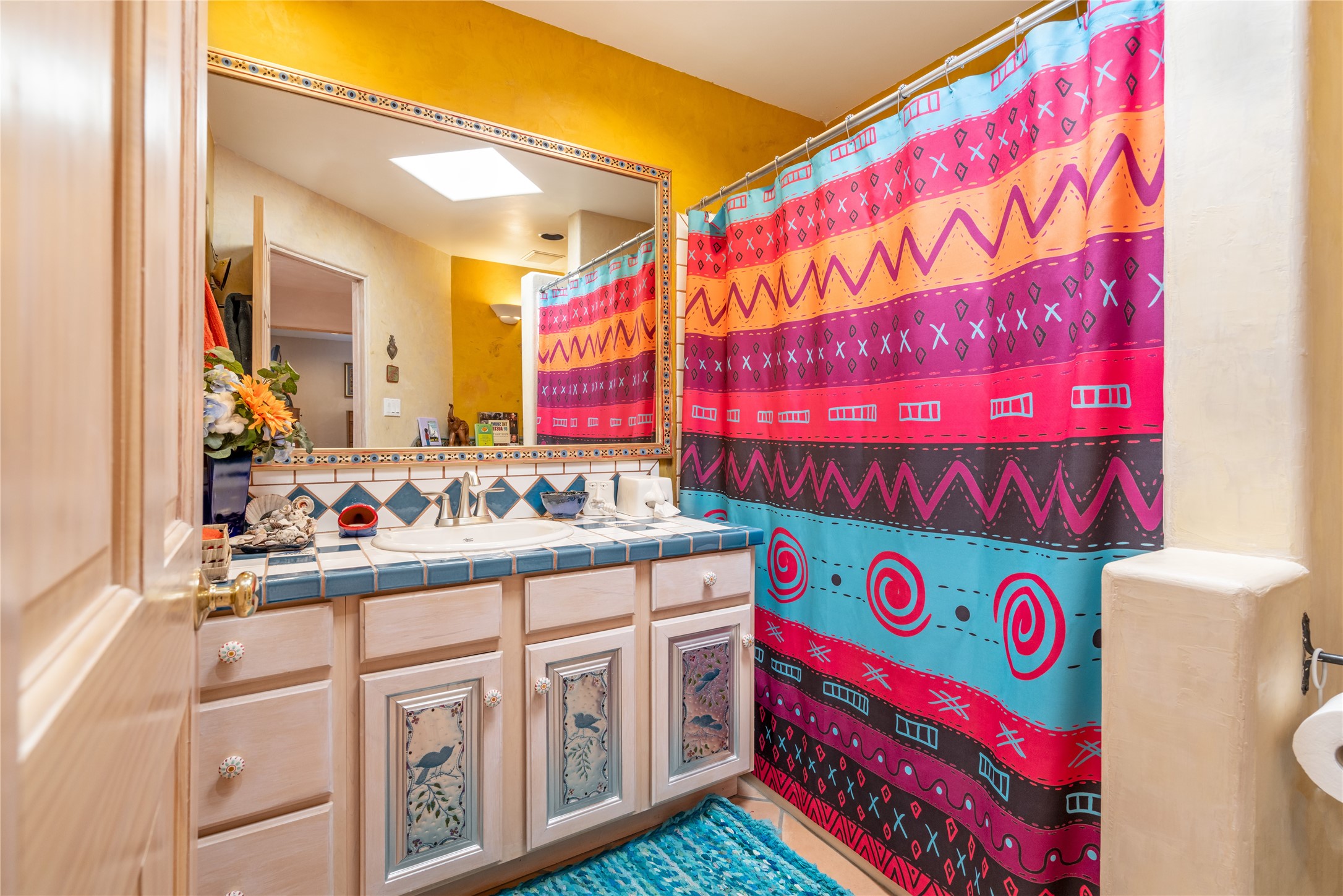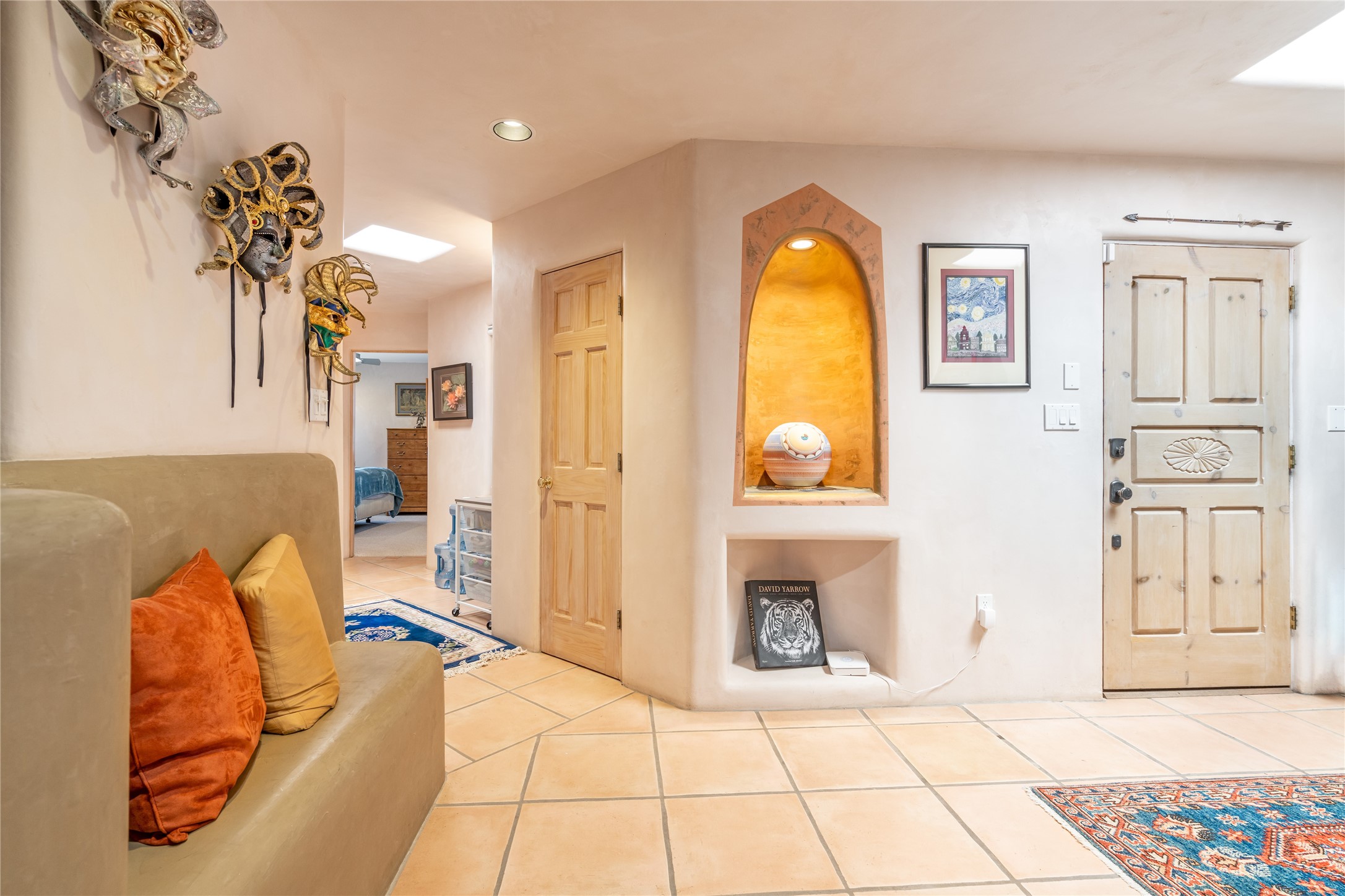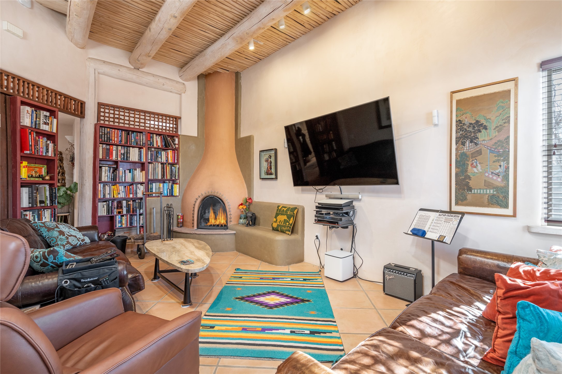 Lovely Eldorado home on 1.61 acres with views! Walled in entry courtyard with a Koi pond plus several outdoor portals with a green belt bordering the property in the back area. 3 bedrooms, 2 1/2 baths with an attached artist studio with a sink and upgraded 220 electric. There is a heated office area off the laundry room which is next to the heated studio. Three Kiva fireplaces and many colorful Santa Fe touches with an Asian twist! Vigas, Latilla ceilings, nichos, built-in bancos, vivid tile murals and 17" x 17" ceramic tile flooring throughout most of the home. New Weil McClain boiler installed in February 2025. Kitchen features stainless appliances with a newer Wolf induction cooktop, new LG refrigerator, Asko dishwasher, and new heavy duty Speed Queen washer/dryer. The kitchen cabinets have animated, hand painted tin motif panels. One step down to the Living area plus there is a den right by the kitchen. A bookshelf features a secret door that goes from the den to the entryway. Four mini-splits installed about 4 years ago. Roof redone by Santa Fe Roofing and Stucco; transferrable warranty until 11/2034. A heated walk way to the detached 3 car garage (874 square feet) was added in 2018 with built in California Closets cabinets. The garage also has epoxy painted floors and 2 skylights for natural light; with one skylight that can manually open. Mature landscaping with inground irrigation plus many apple, cherry and pear trees. Don't miss this delightful property; a peaceful oasis with plenty of Southwest charm.