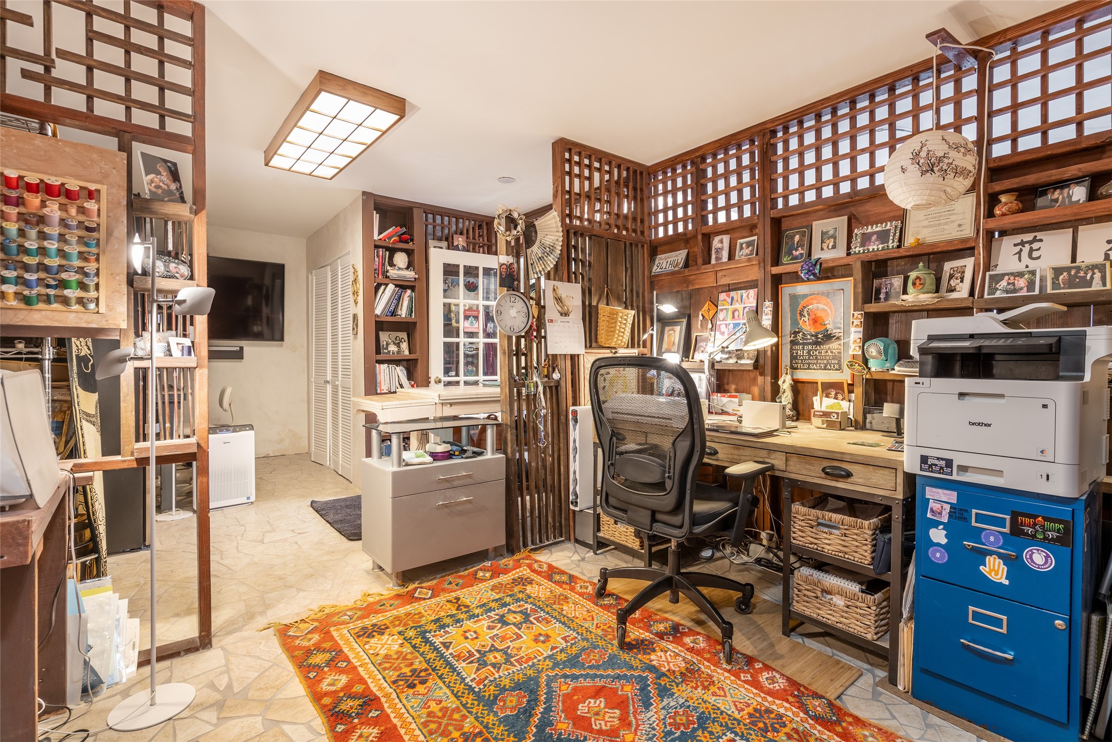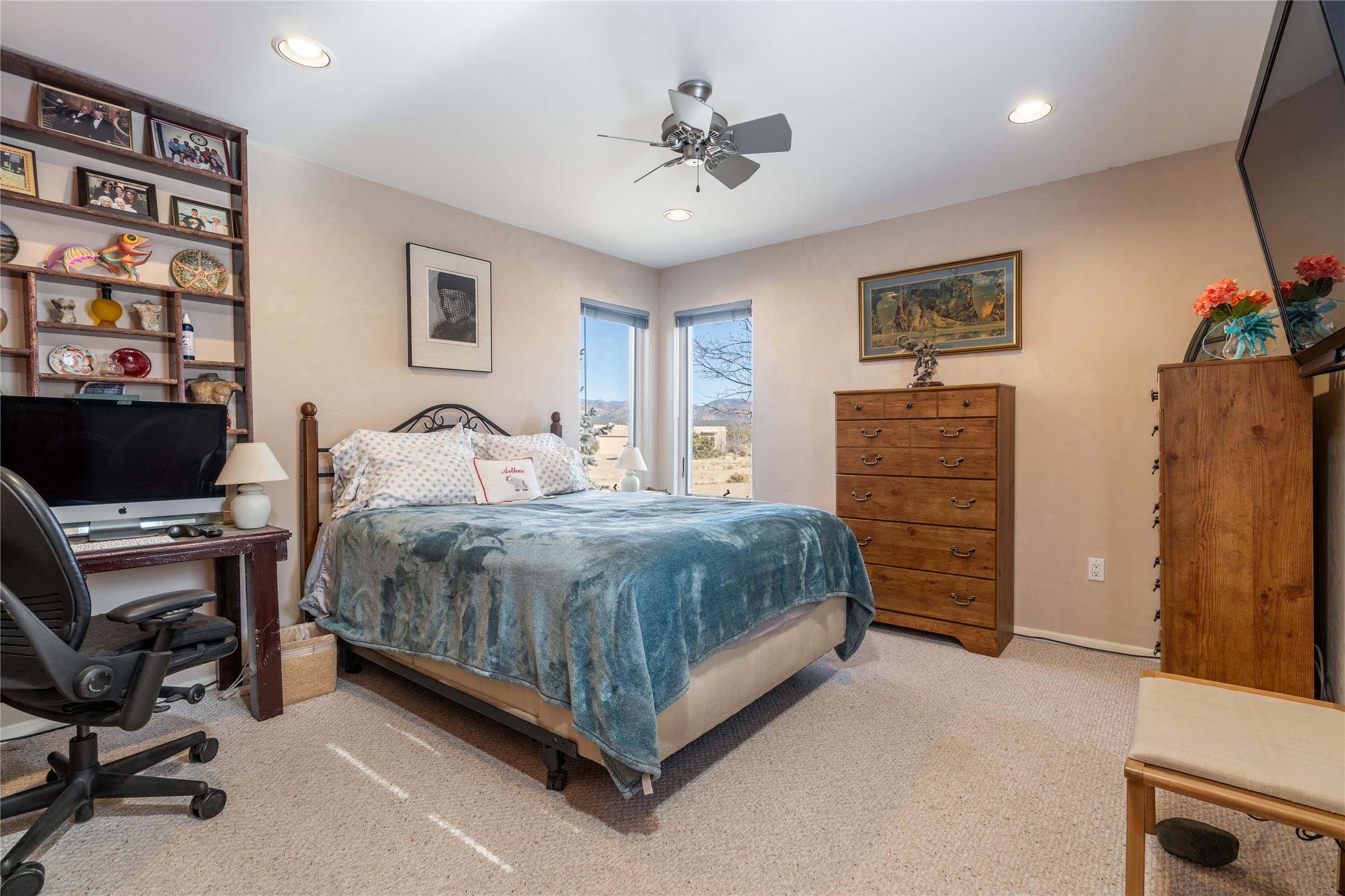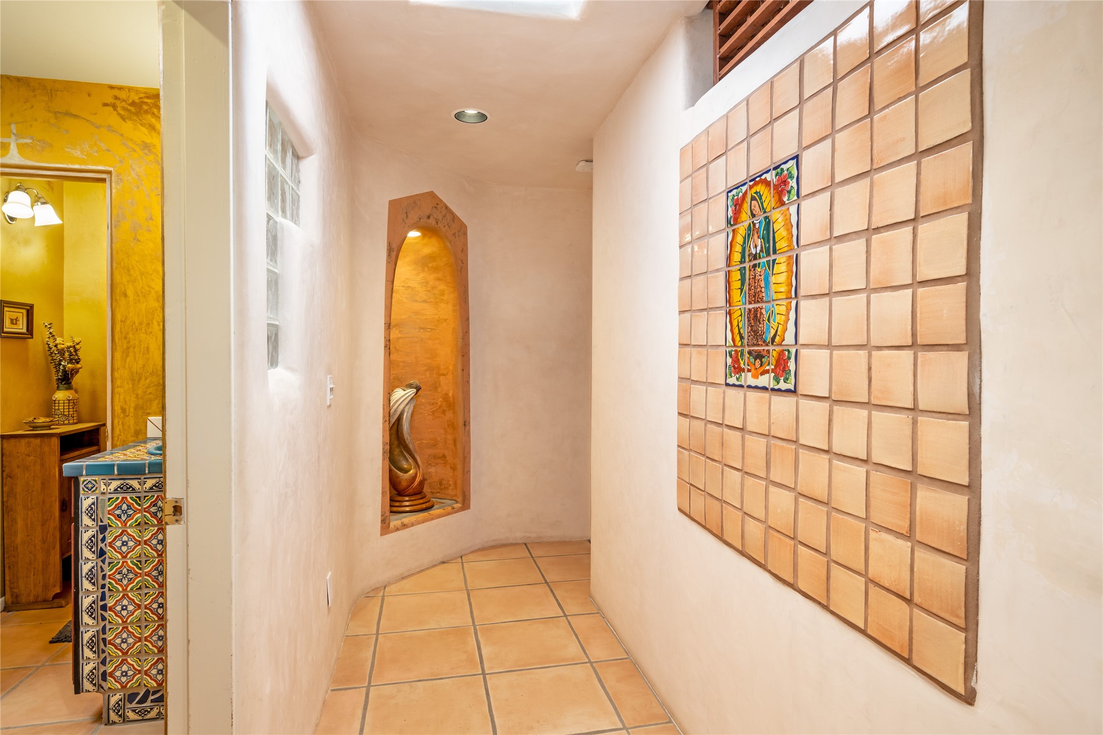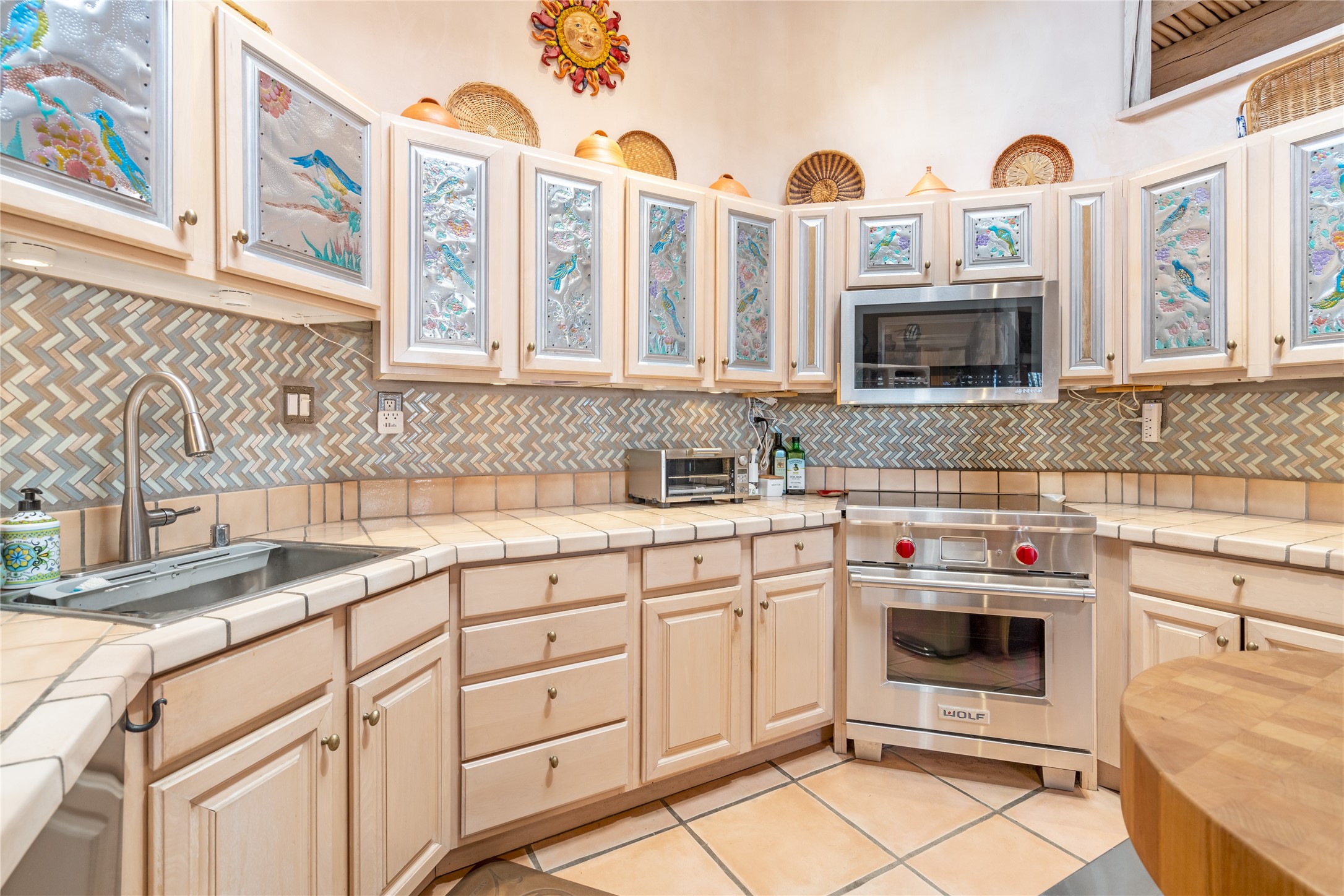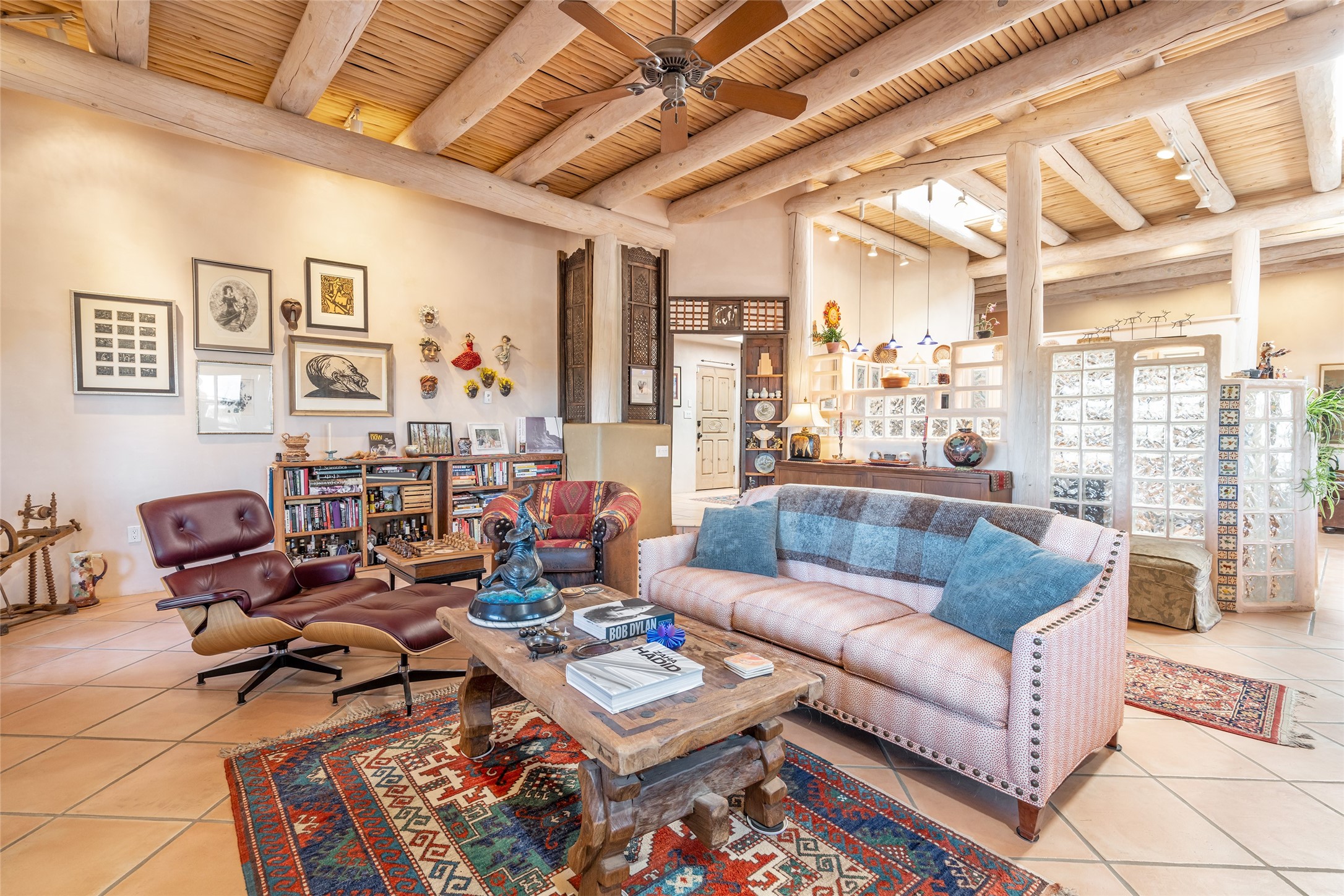 Lovely Eldorado home on 1.61 acres with views! Walled in entry courtyard with a Koi pond plus several outdoor portals with a green belt bordering the property in the back area. 3 bedrooms, 2 1/2 baths with an attached artist studio with a sink and upgraded 220 electric. There is a heated office area off the laundry room which is next to the heated studio. Three Kiva fireplaces and many colorful Santa Fe touches with an Asian twist! Vigas, Latilla ceilings, nichos, built-in bancos, vivid tile murals and 17" x 17" ceramic tile flooring throughout most of the home. New Weil McClain boiler installed in February 2025. Kitchen features stainless appliances with a newer Wolf induction cooktop, new LG refrigerator, Asko dishwasher, and new heavy duty Speed Queen washer/dryer. The kitchen cabinets have animated, hand painted tin motif panels. One step down to the Living area plus there is a den right by the kitchen. A bookshelf features a secret door that goes from the den to the entryway. Four mini-splits installed about 4 years ago. Roof redone by Santa Fe Roofing and Stucco; transferrable warranty until 11/2034. A heated walk way to the detached 3 car garage (874 square feet) was added in 2018 with built in California Closets cabinets. The garage also has epoxy painted floors and 2 skylights for natural light; with one skylight that can manually open. Mature landscaping with inground irrigation plus many apple, cherry and pear trees. Don't miss this delightful property; a peaceful oasis with plenty of Southwest charm.