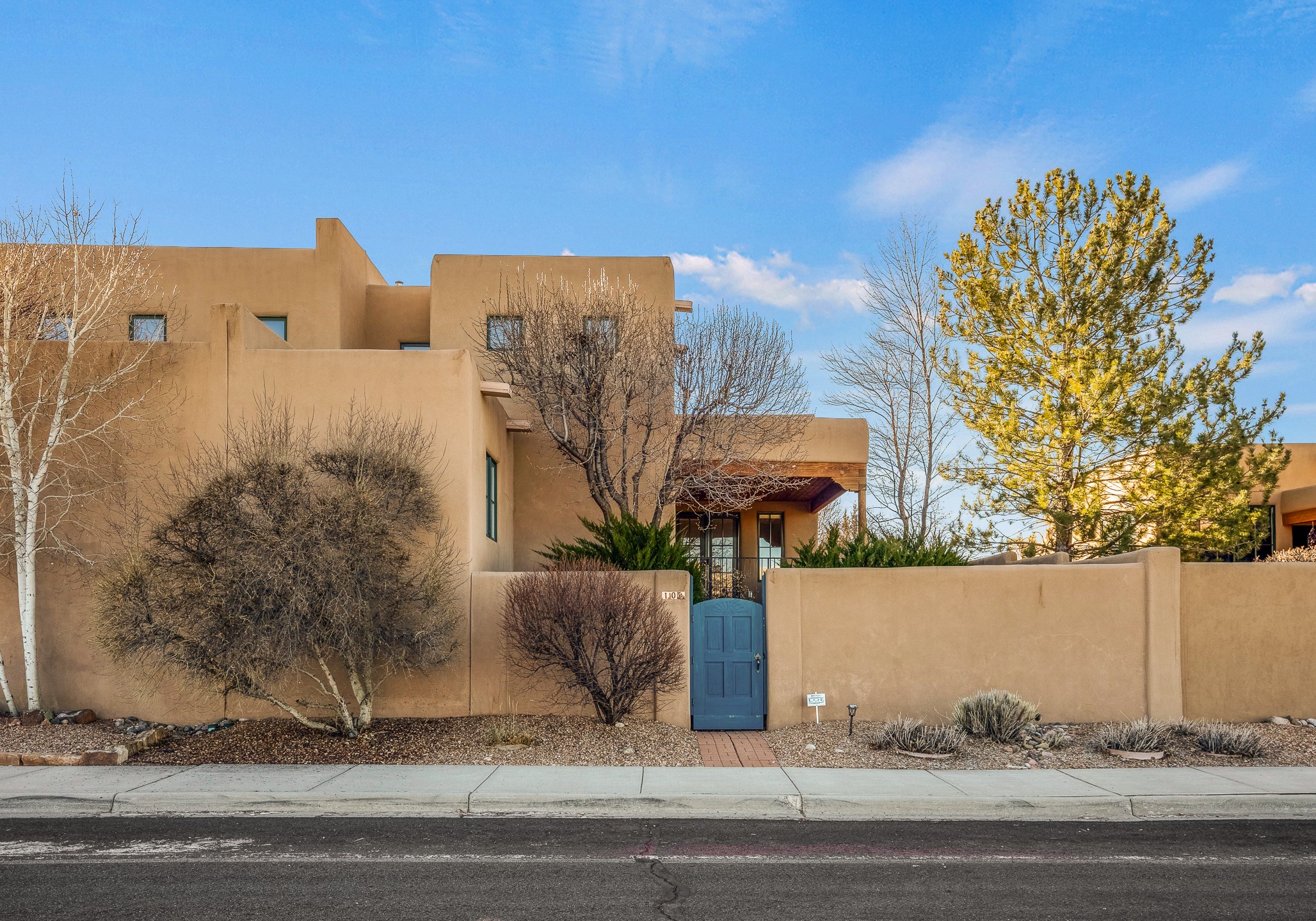 A bright and contemporary patio home in Aldea de Santa Fe features a light-filled open floor plan, a first-floor master suite, and an attached garage. The home includes radiant in-floor heating, evaporative cooling, beautiful landscaping with drip irrigation, and a large covered patio offering stunning Jemez mountain views. The main living area boasts high ceilings, vigas, large windows, a kiva fireplace, and a faux-painted finish. The kitchen has ample storage, maple cabinets, a center island, and stainless Bosch and Amana appliances. An existing security system is available, and a landscaping drip system is in use. Additionally, a Tesla car charger has been installed in the garage. Bocce ball and tennis courts are nearby along with a community center with exercise equipment!
