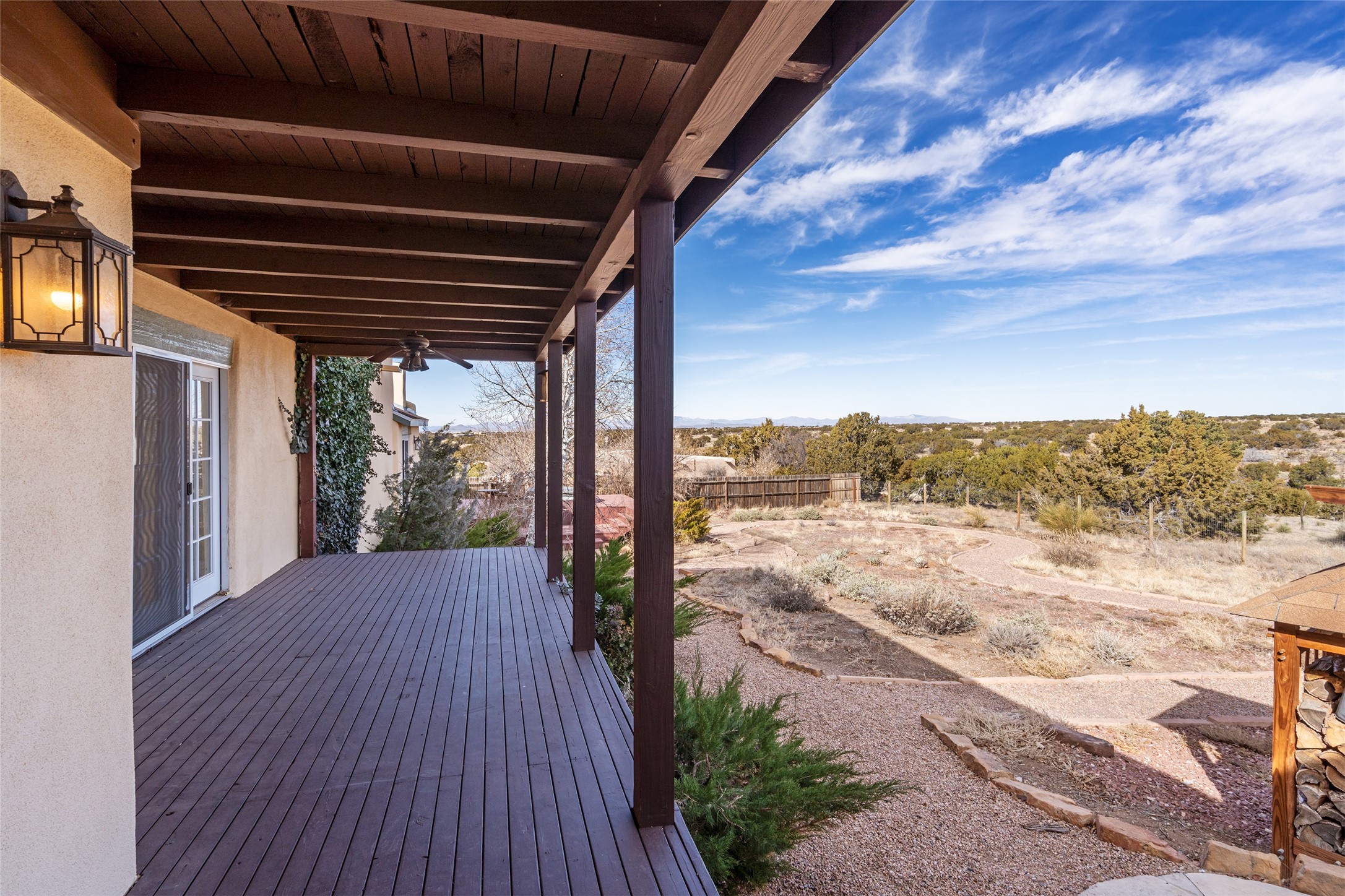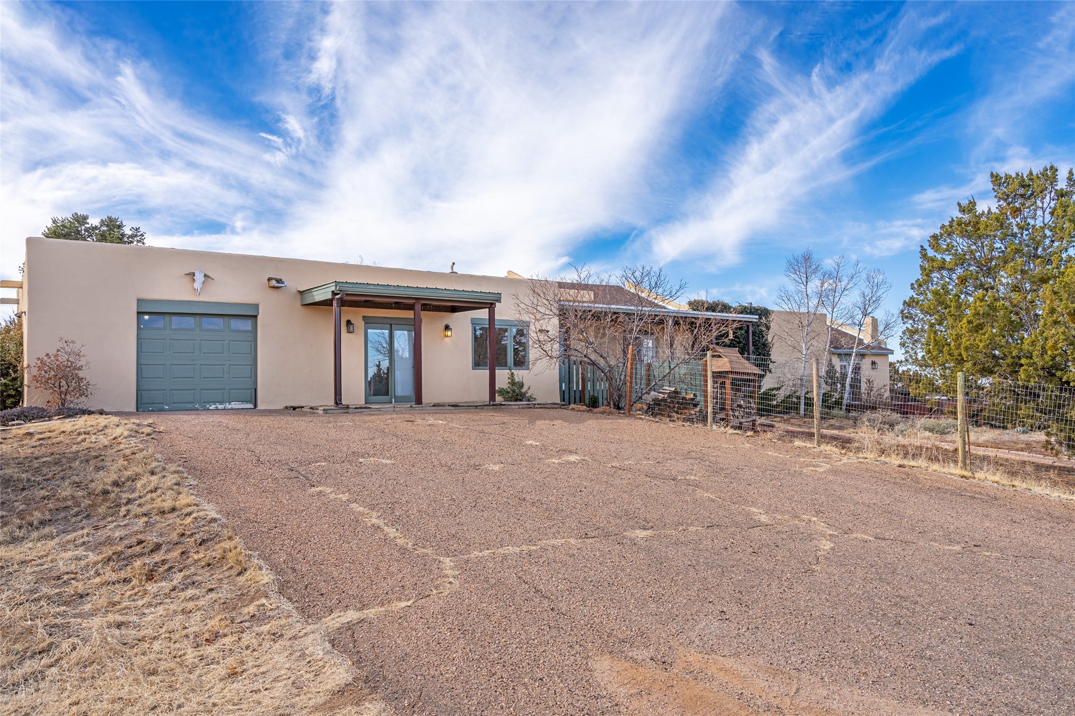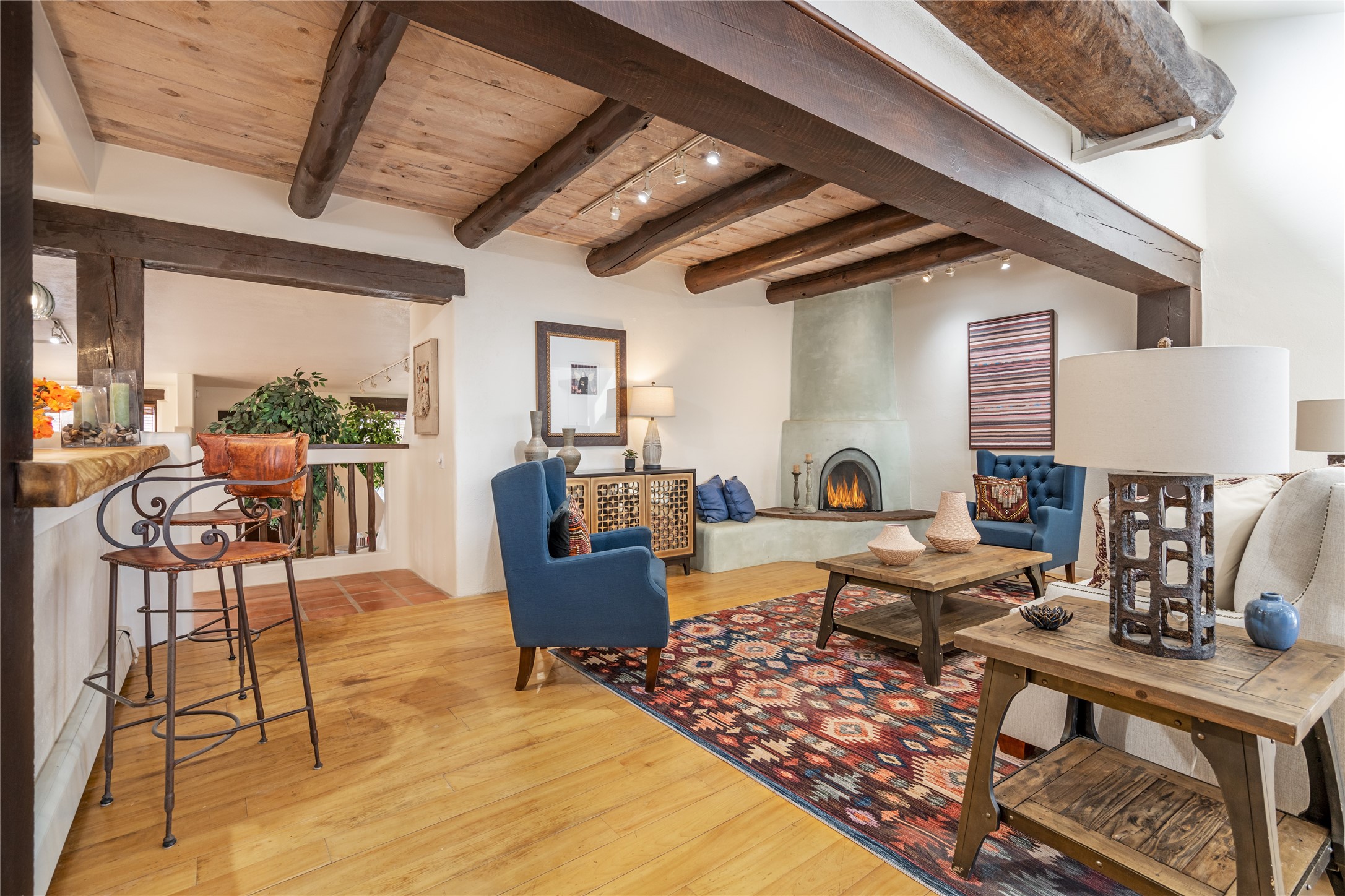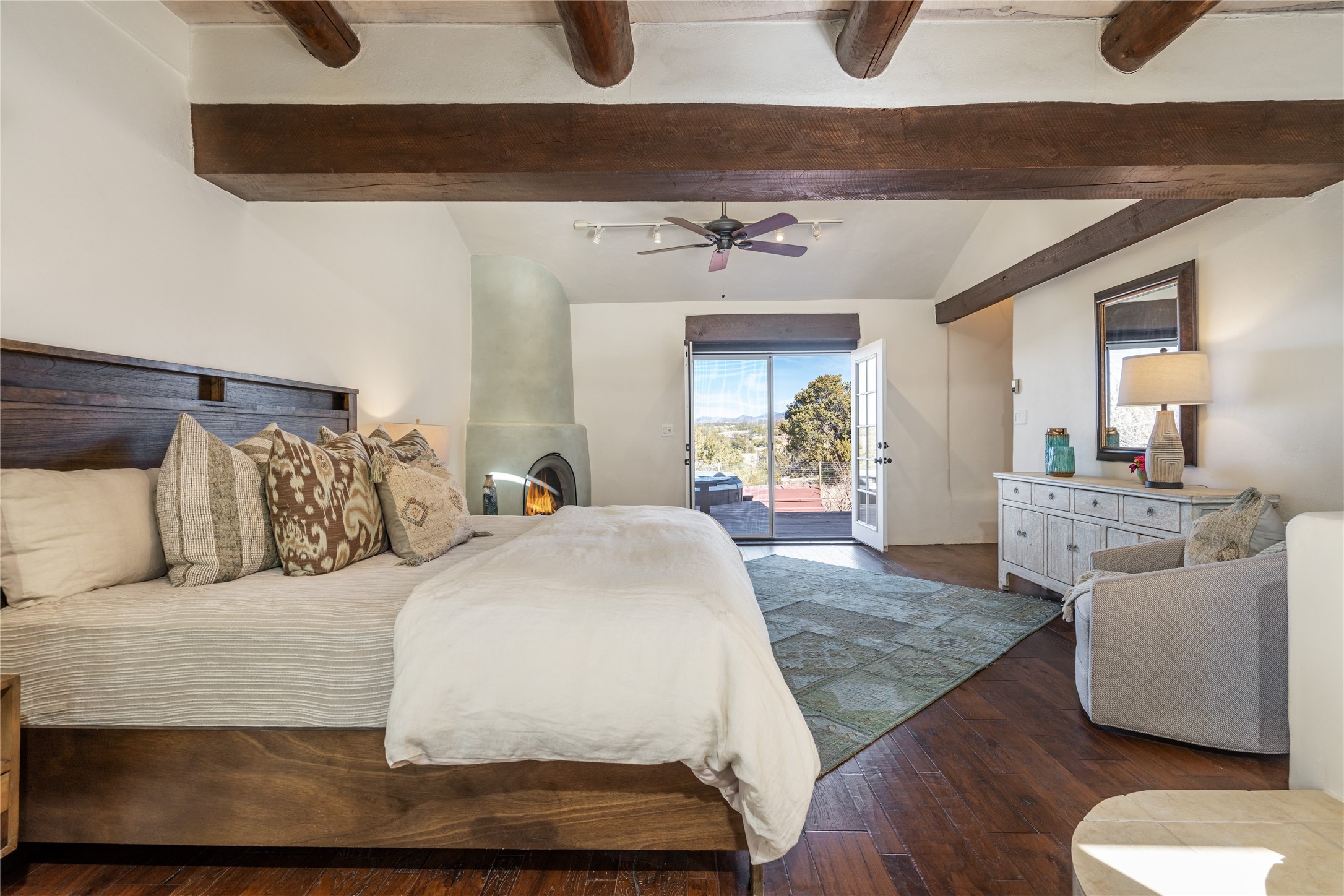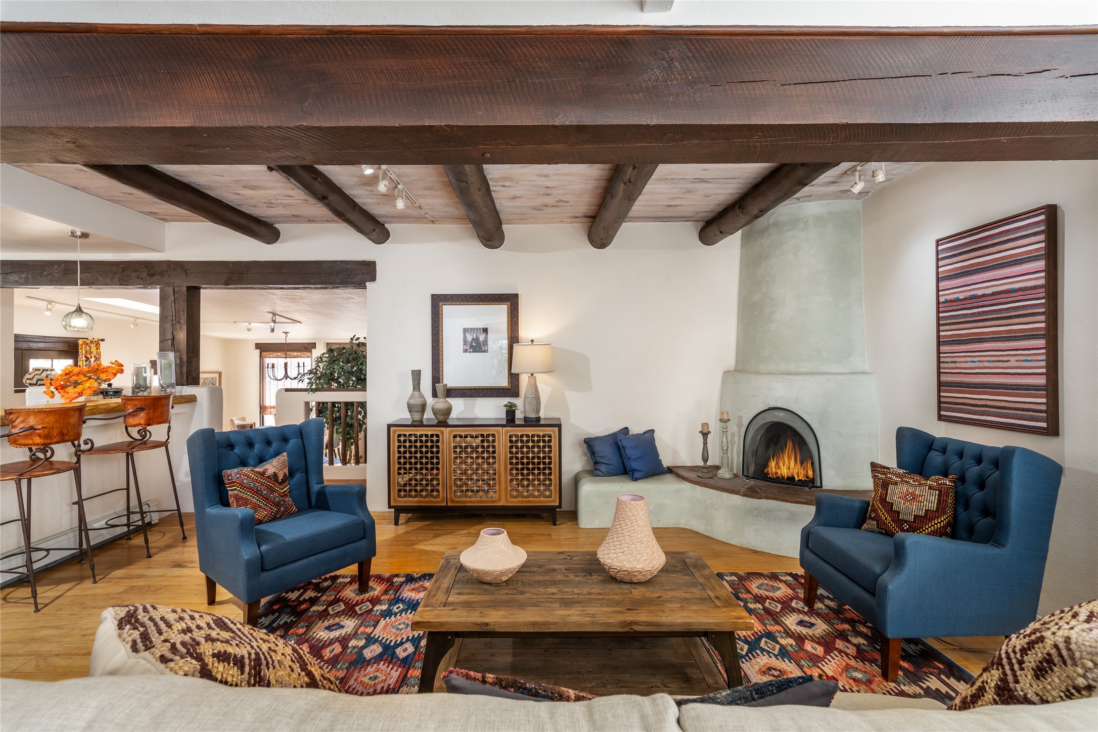 Welcome to 22 Alcalde Rd, a breathtaking 3,404 sq. ft. Southwestern-style home nestled in the heart of Eldorado at Santa Fe. This exquisite 4-bedroom, 3-bath residence captures the essence of Santa Fe living with its warm adobe charm, stunning mountain views, and elegant design details.Step inside to discover two inviting living areas, each featuring a gorgeous Kiva fireplace, creating a cozy ambiance perfect for relaxing or entertaining. The spacious primary suite is a true sanctuary, boasting a grand Kiva fireplace, luxurious en-suite bath, and double doors that open onto a private deck--where you can take in the sweeping views of the Sangre de Cristo Mountain foothills.Throughout the home, you'll find lovely architectural accents, including vigas, Saltillo tile, and custom woodwork, adding to its authentic charm. The well-appointed kitchen and dining areas provide the perfect blend of style and function, ideal for hosting gatherings or enjoying quiet evenings at home.Situated in the sought-after Eldorado community, this property offers access to miles of trails, scenic open spaces, and a vibrant arts scene--all while being just a short drive to downtown Santa Fe.Come experience the magic of this stunning home.