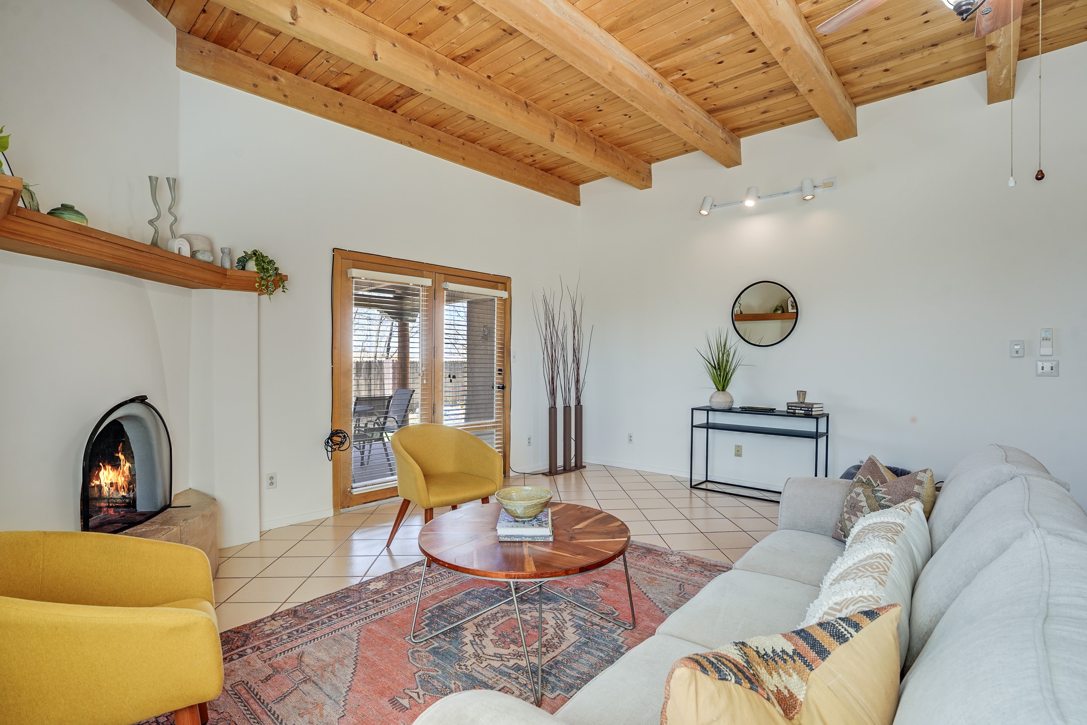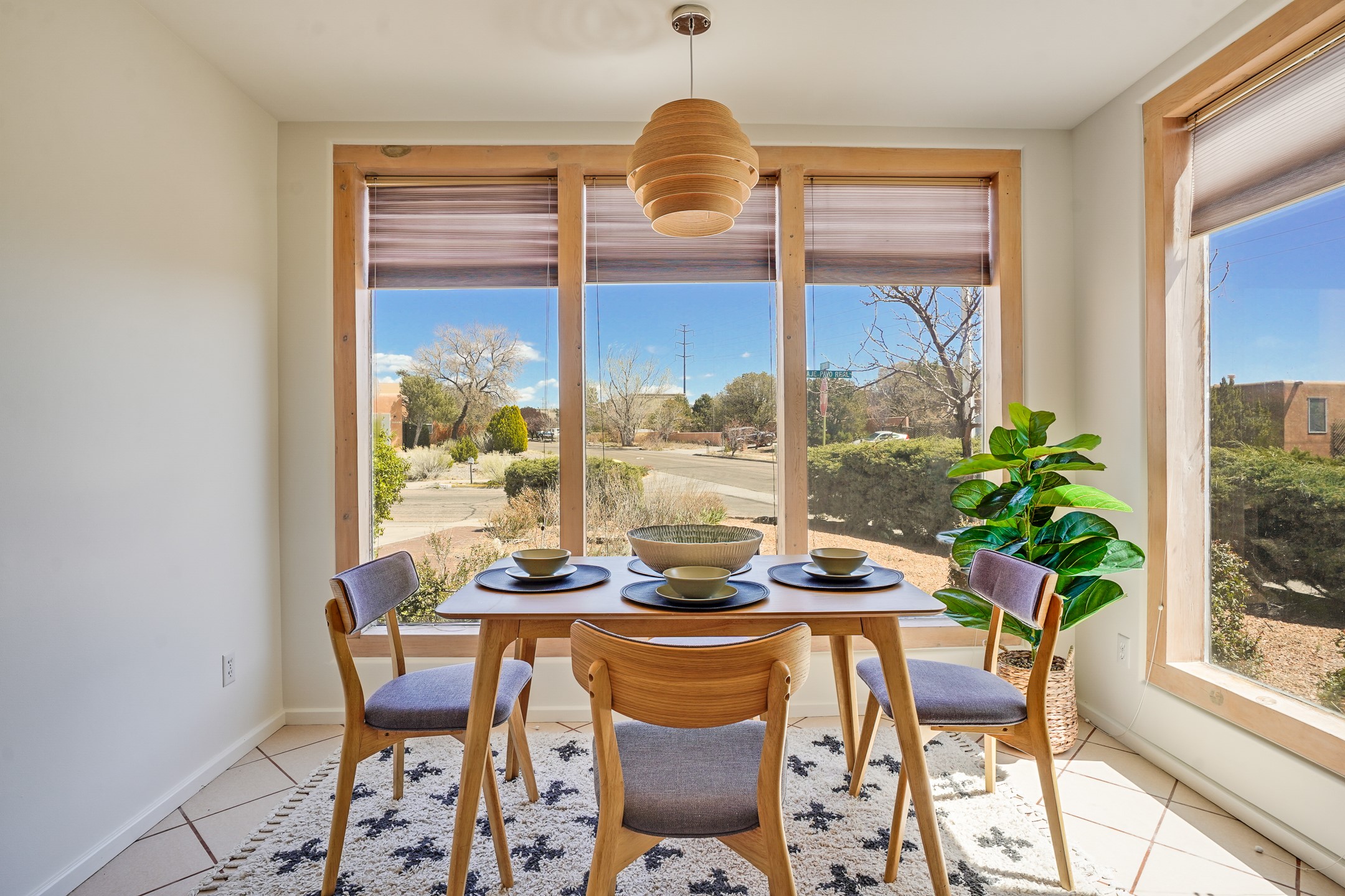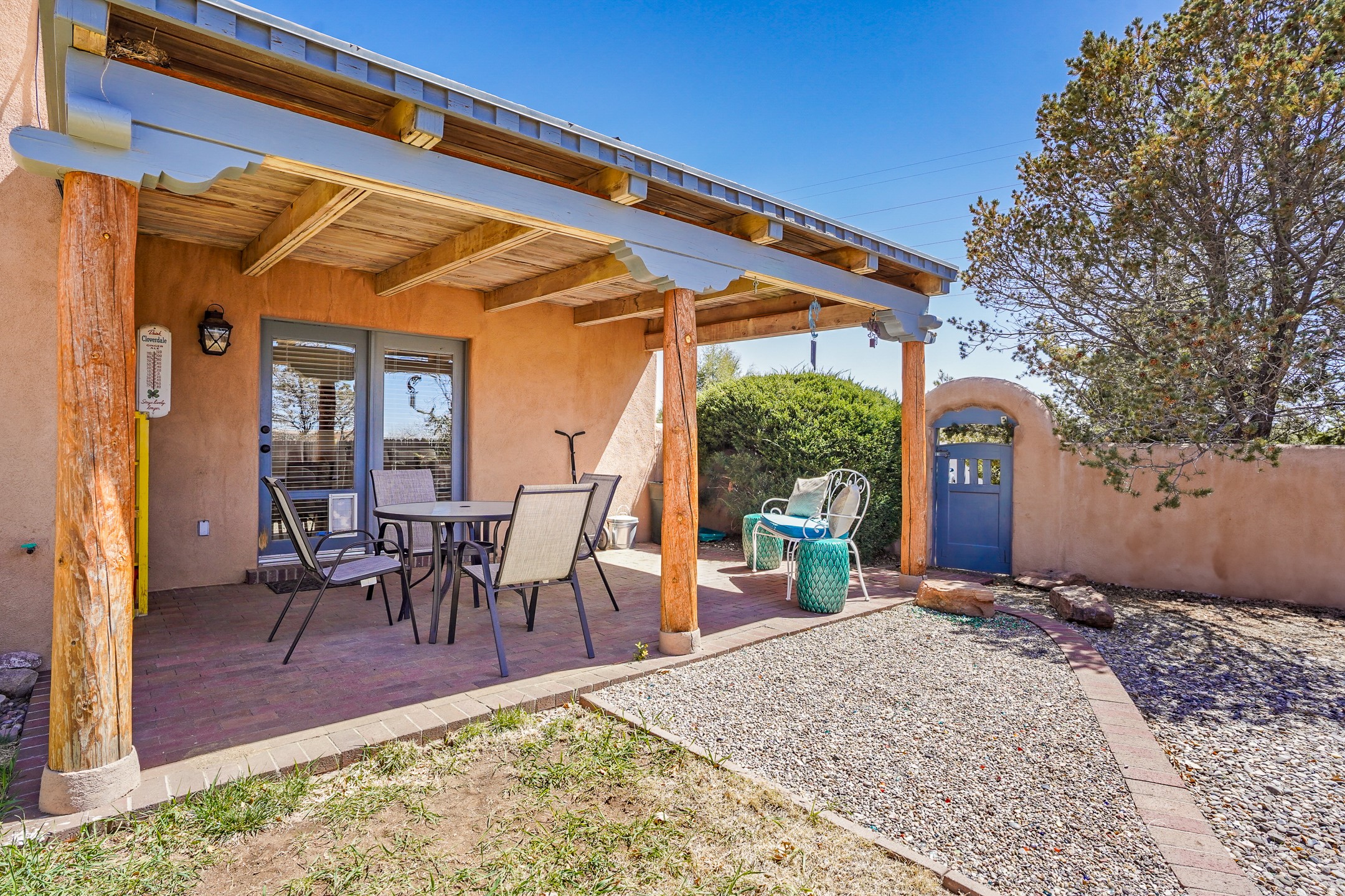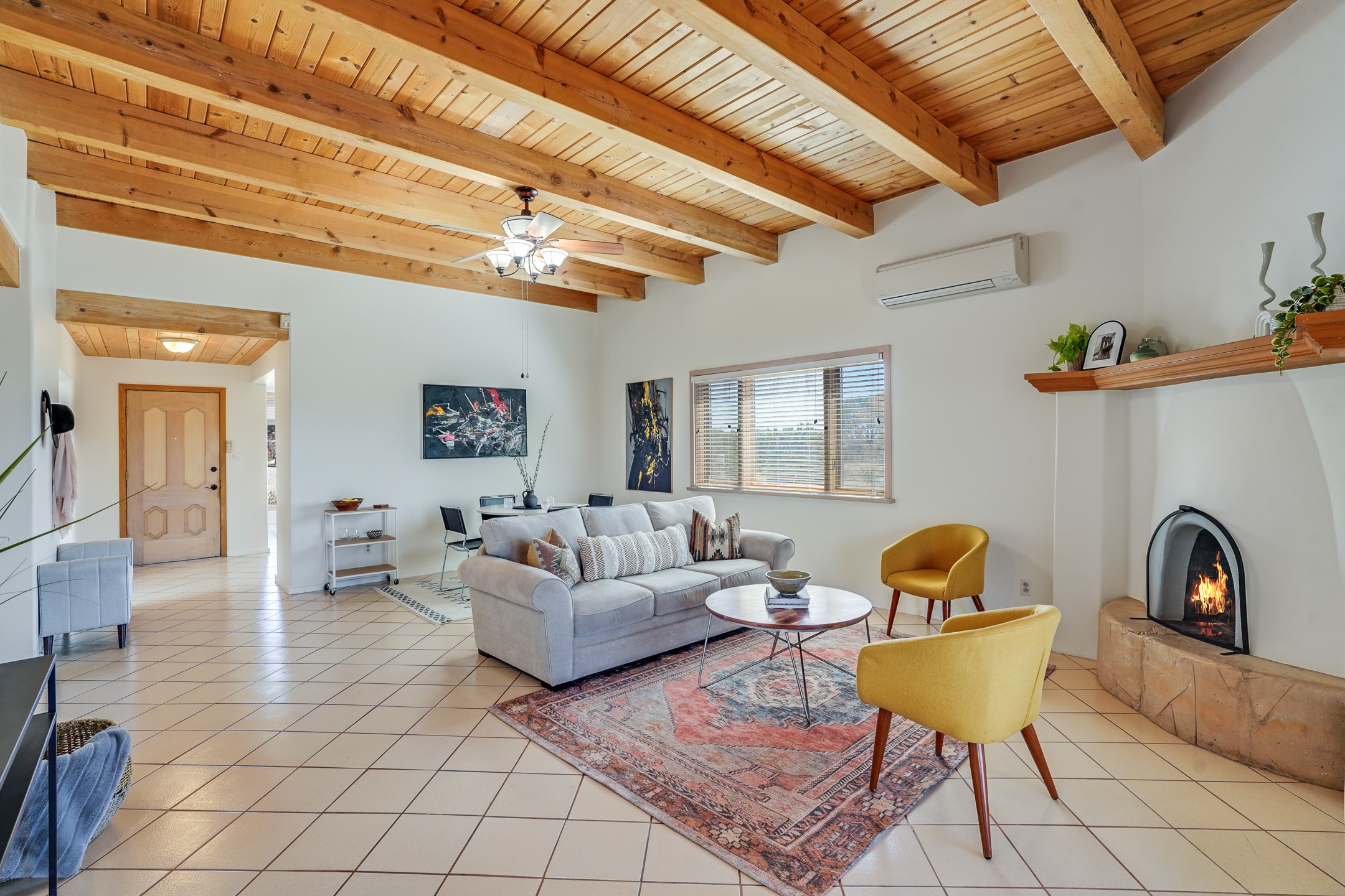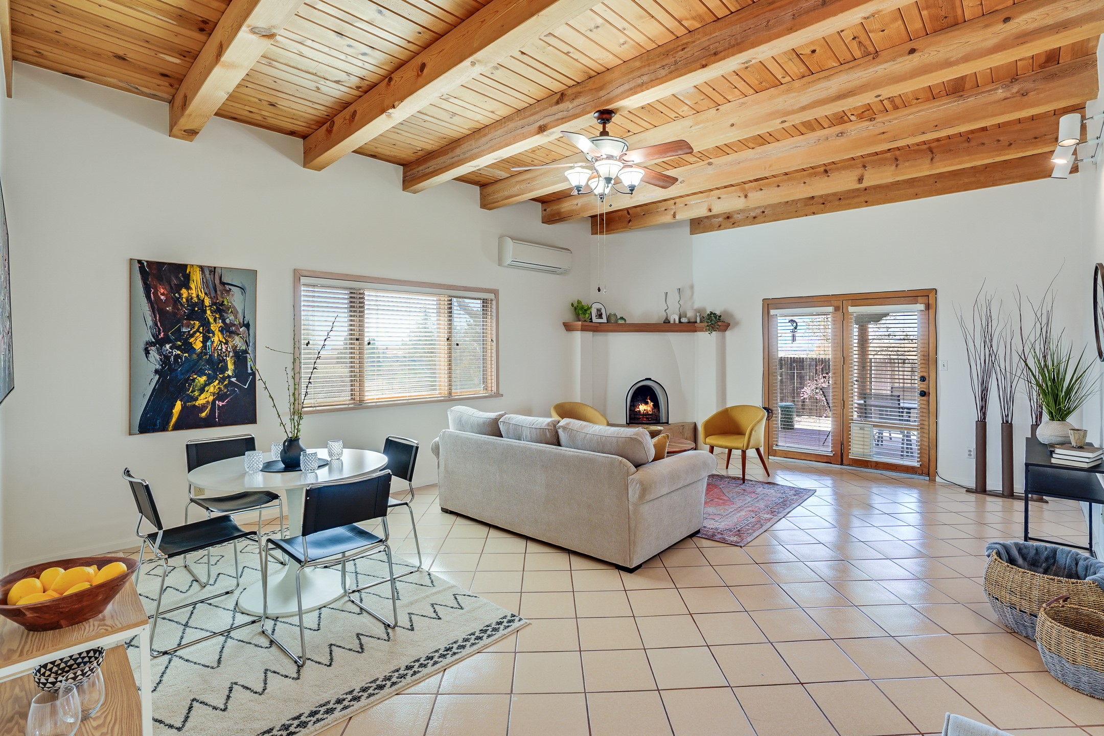 Nestled on a spacious corner lot in the highly sought-after Via Caballero neighborhood, this charming single-level home offers 1,592 square feet of light-filled living space. Thoughtfully designed with clerestory windows and passive solar elements, natural light pours into the home. The 2-bedroom, 2-bath floor plan includes a versatile home office or den, as well as a generous eat-in kitchen perfect for everyday living and entertaining. The main living and dining area features soaring beamed ceilings and is centered around a striking kiva fireplace, creating a warm and welcoming ambiance. The primary suite is a serene retreat with clerestory windows, a deep soaking tub, and a walk-in shower in the ensuite bath. Outdoors, the west-facing courtyard offers a peaceful setting to enjoy Santa Fe's sunsets, with a deep portal accessed directly from the living room. Additional highlights include central forced-air heating, mini-split cooling systems, and a detached two-car garage connected to the home via a covered breezeway. Lovingly maintained and move-in ready, this beautiful home is waiting for its next lucky owner to make it their own.