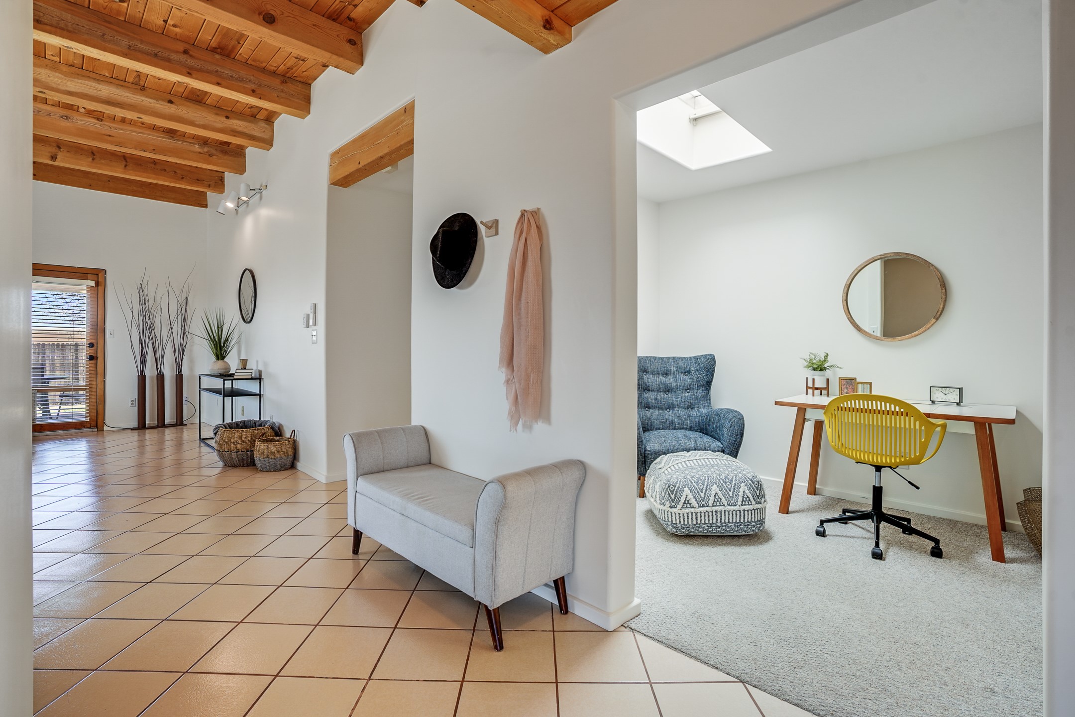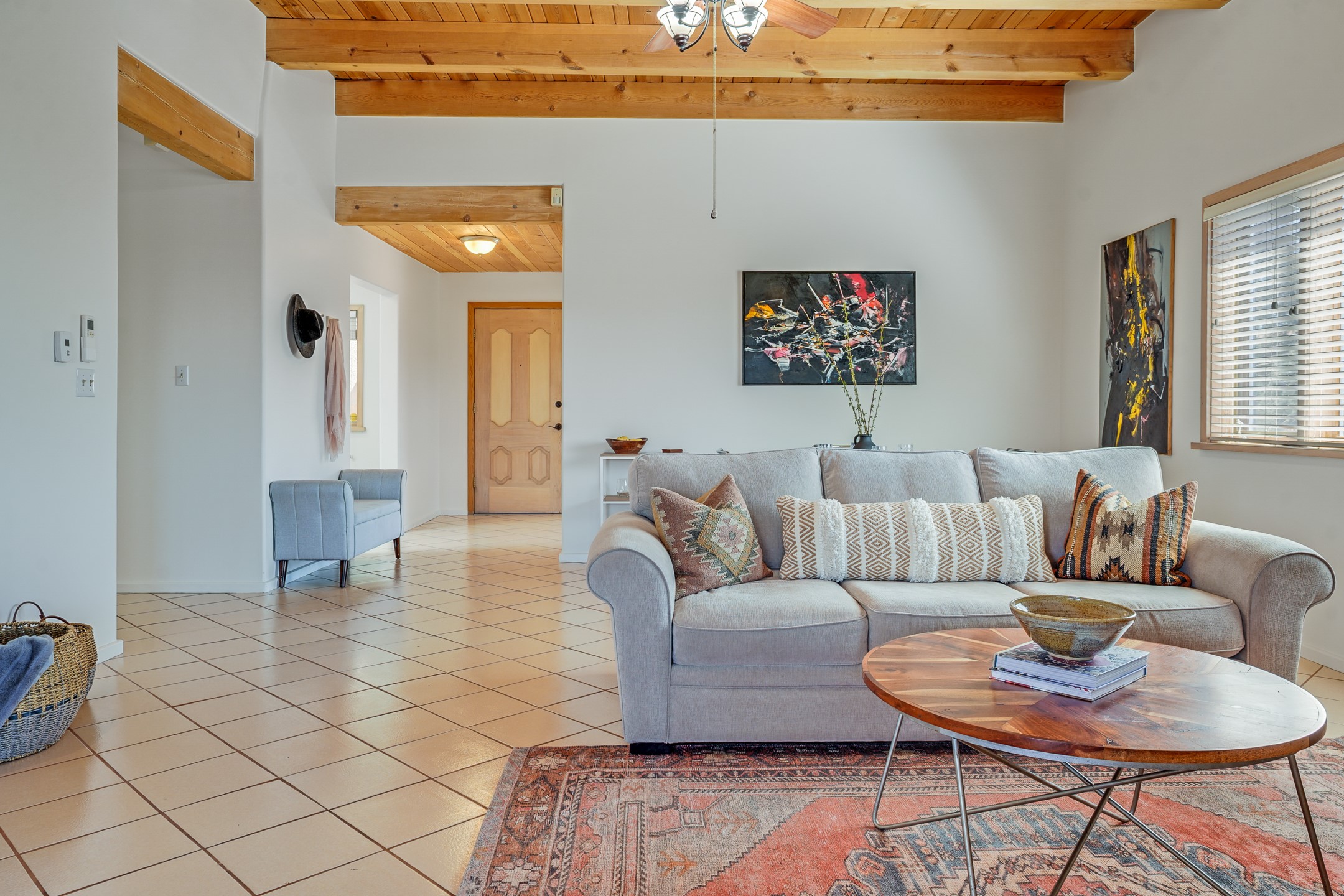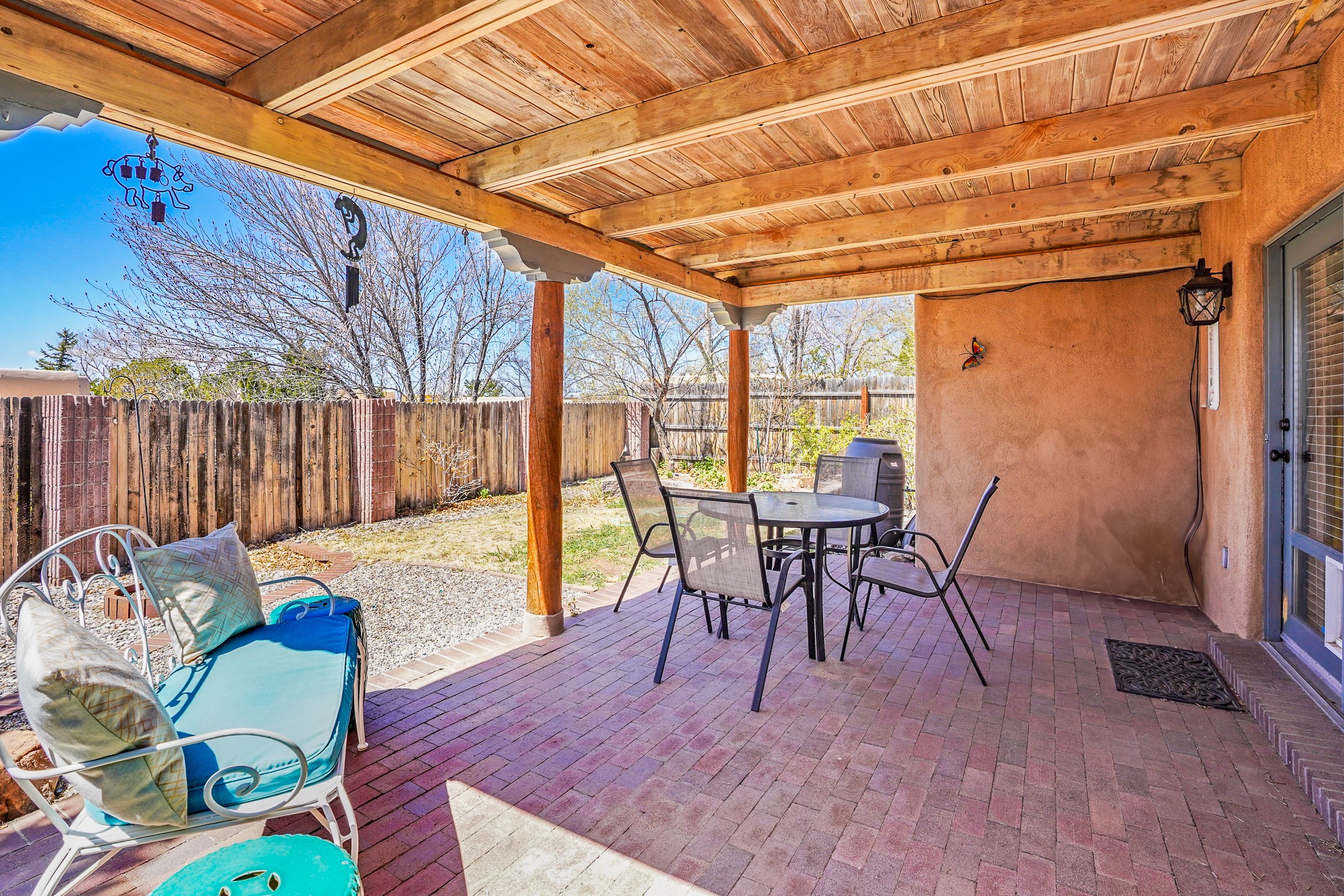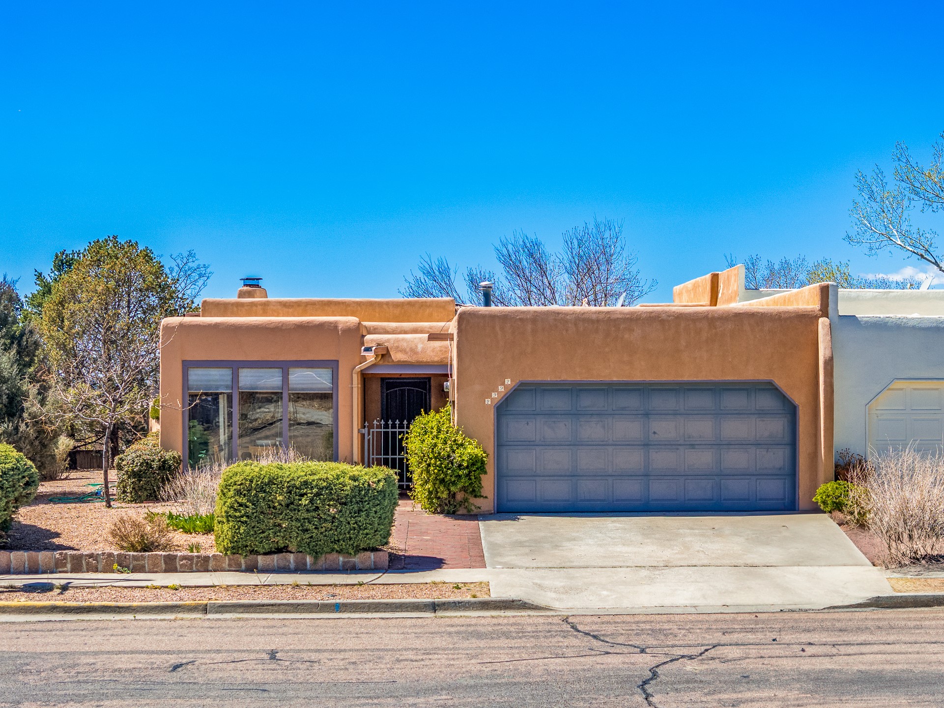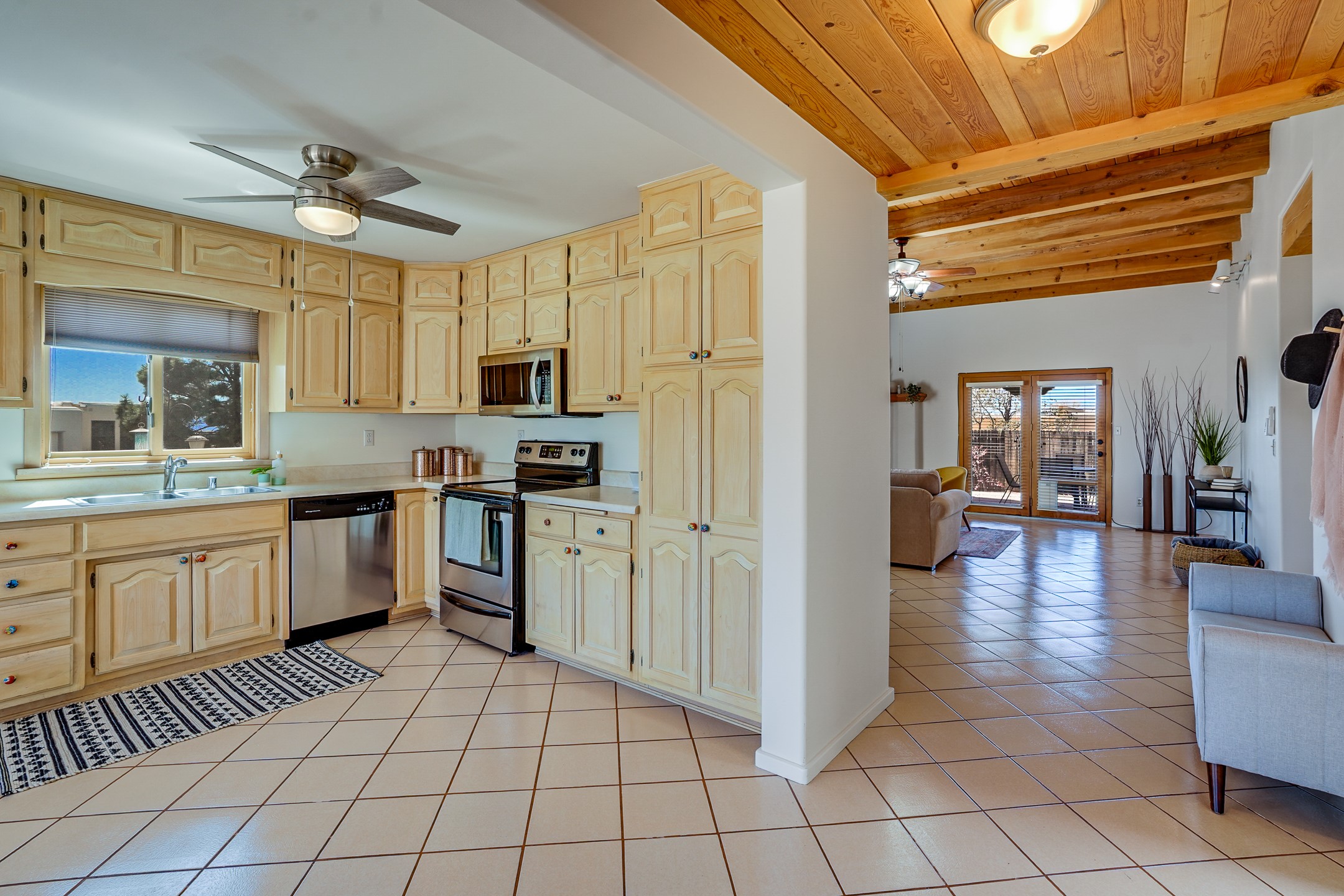 Nestled on a spacious corner lot in the highly sought-after Via Caballero neighborhood, this charming single-level home offers 1,592 square feet of light-filled living space. Thoughtfully designed with clerestory windows and passive solar elements, natural light pours into the home. The 2-bedroom, 2-bath floor plan includes a versatile home office or den, as well as a generous eat-in kitchen perfect for everyday living and entertaining. The main living and dining area features soaring beamed ceilings and is centered around a striking kiva fireplace, creating a warm and welcoming ambiance. The primary suite is a serene retreat with clerestory windows, a deep soaking tub, and a walk-in shower in the ensuite bath. Outdoors, the west-facing courtyard offers a peaceful setting to enjoy Santa Fe's sunsets, with a deep portal accessed directly from the living room. Additional highlights include central forced-air heating, mini-split cooling systems, and a detached two-car garage connected to the home via a covered breezeway. Lovingly maintained and move-in ready, this beautiful home is waiting for its next lucky owner to make it their own.