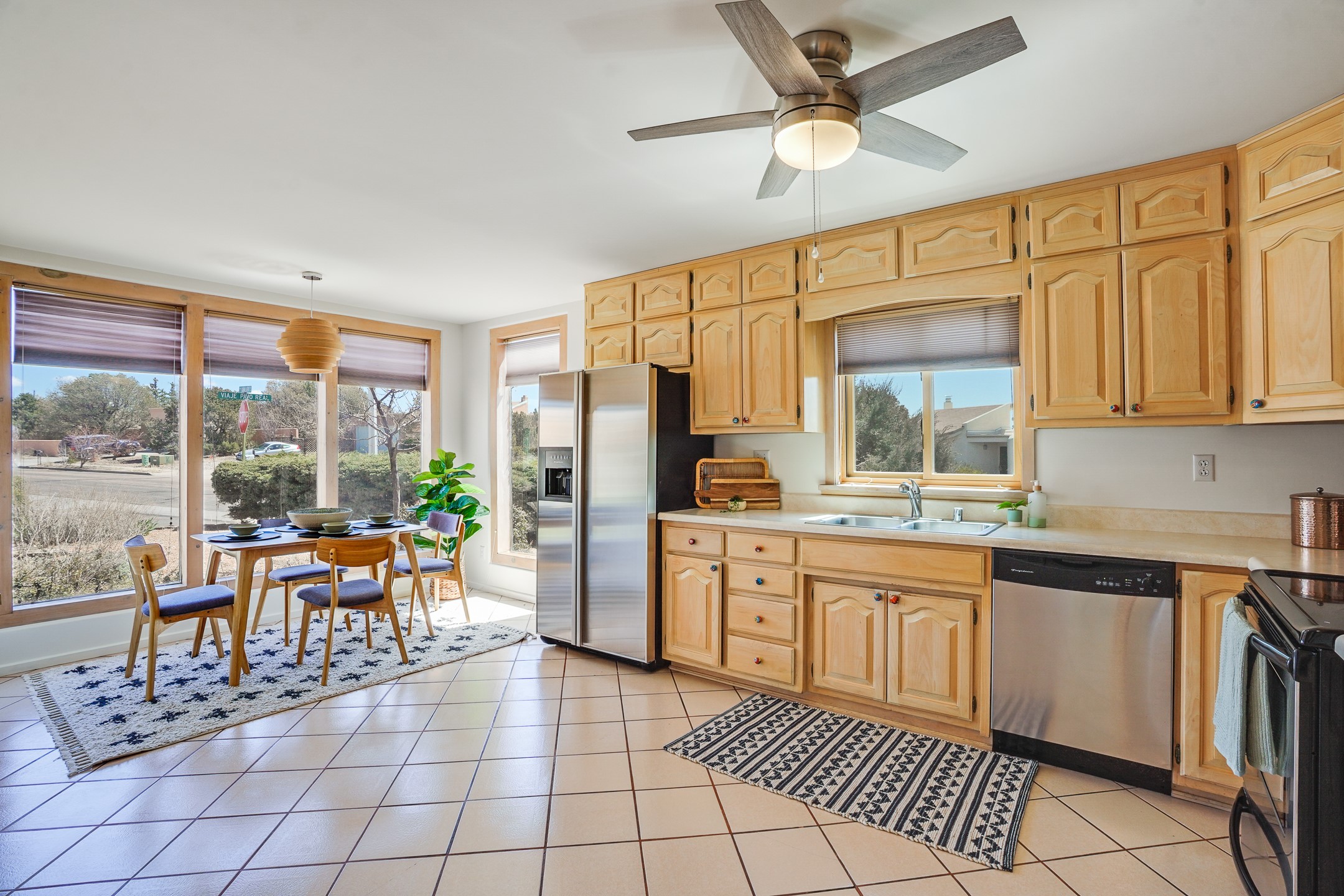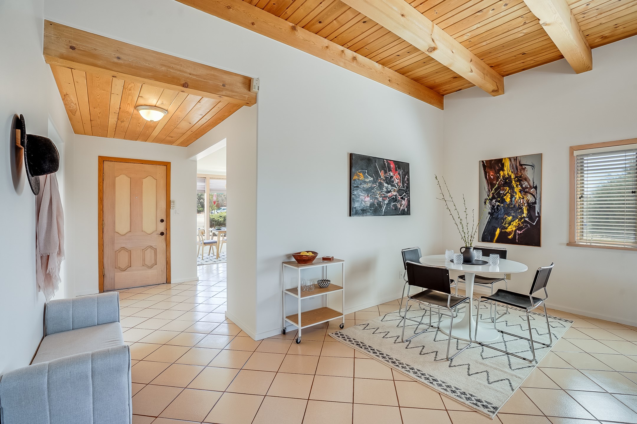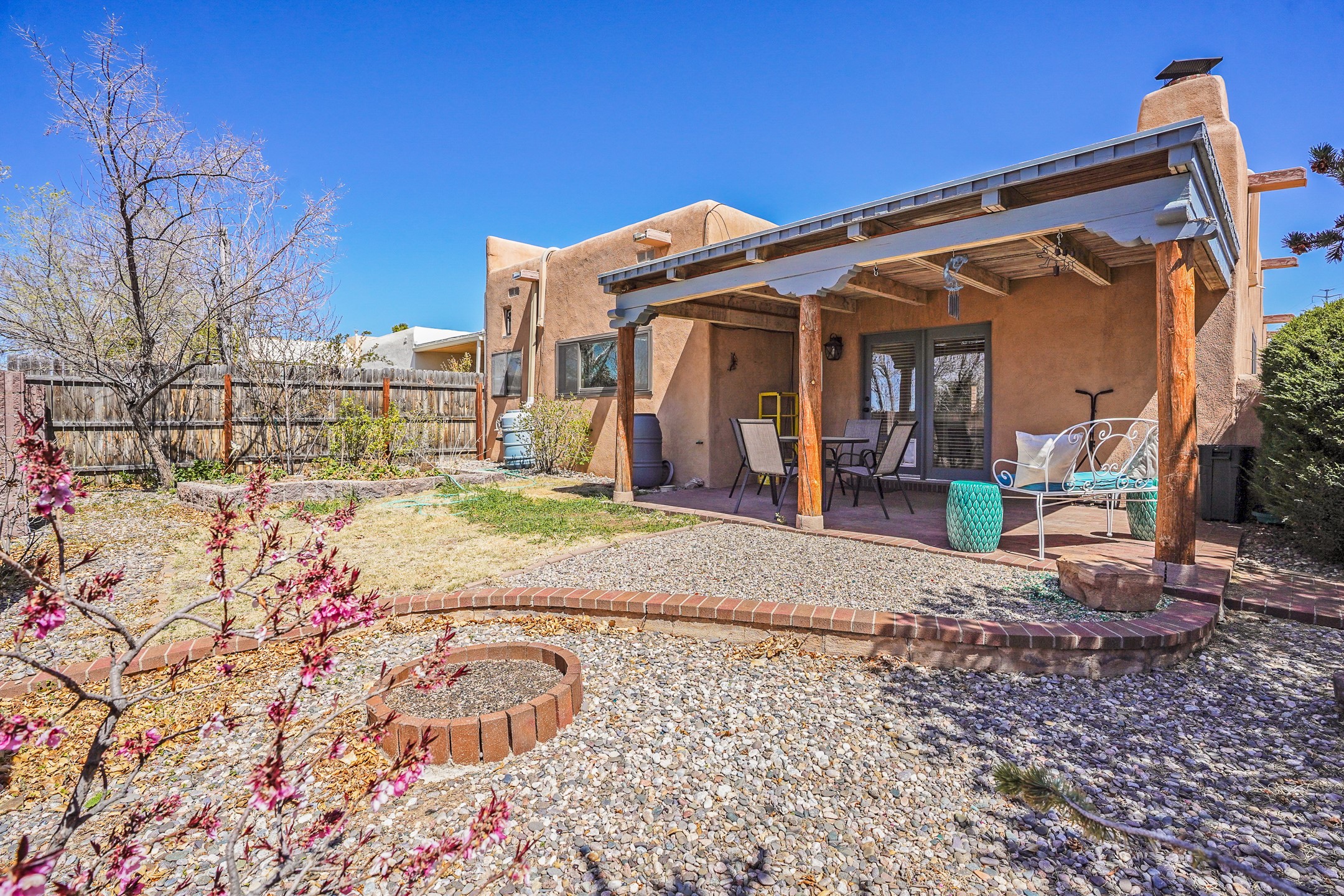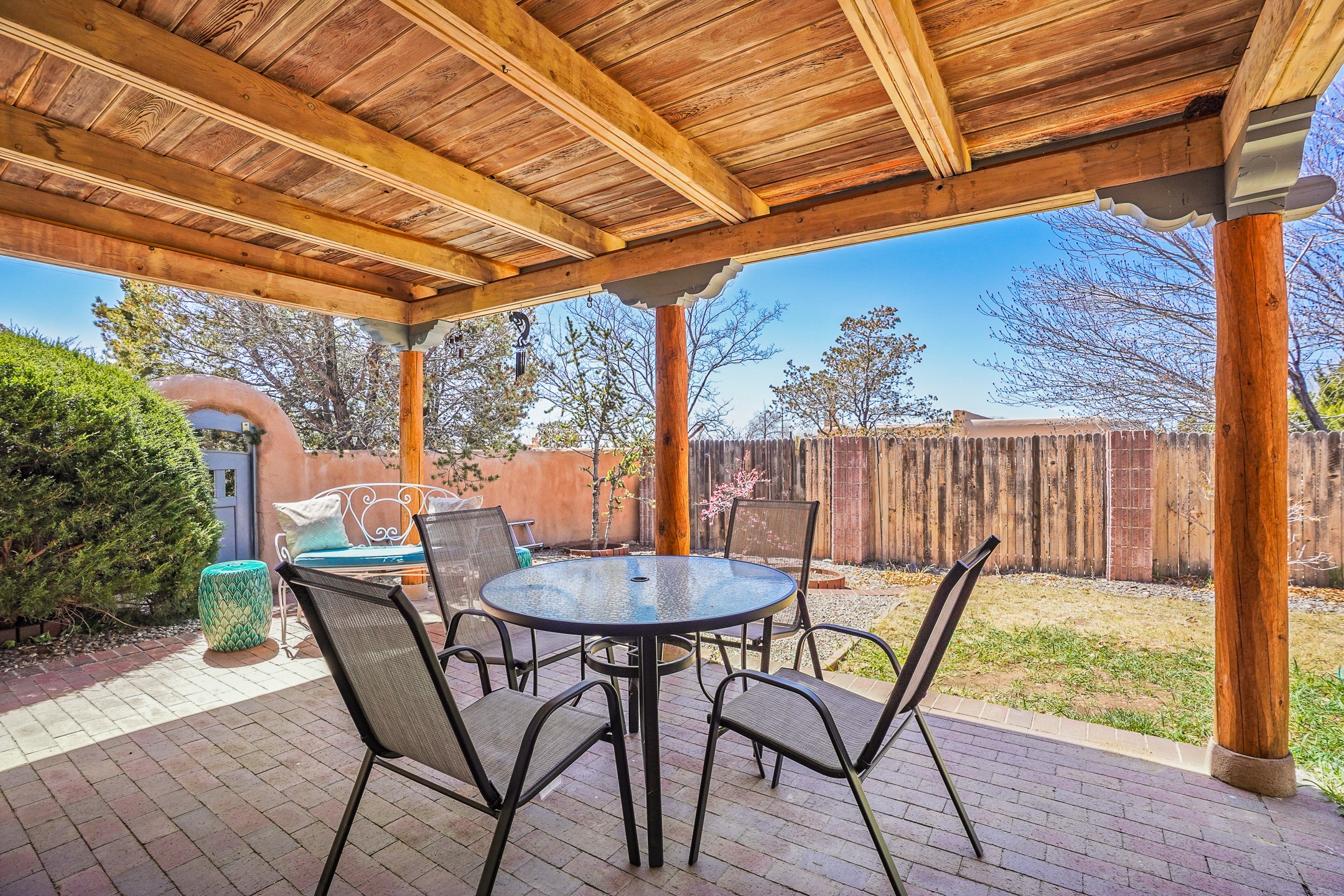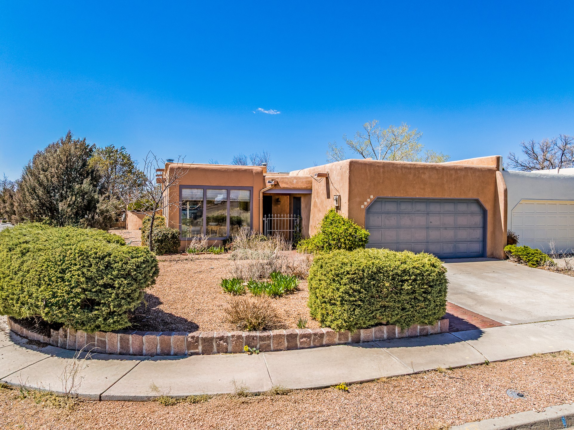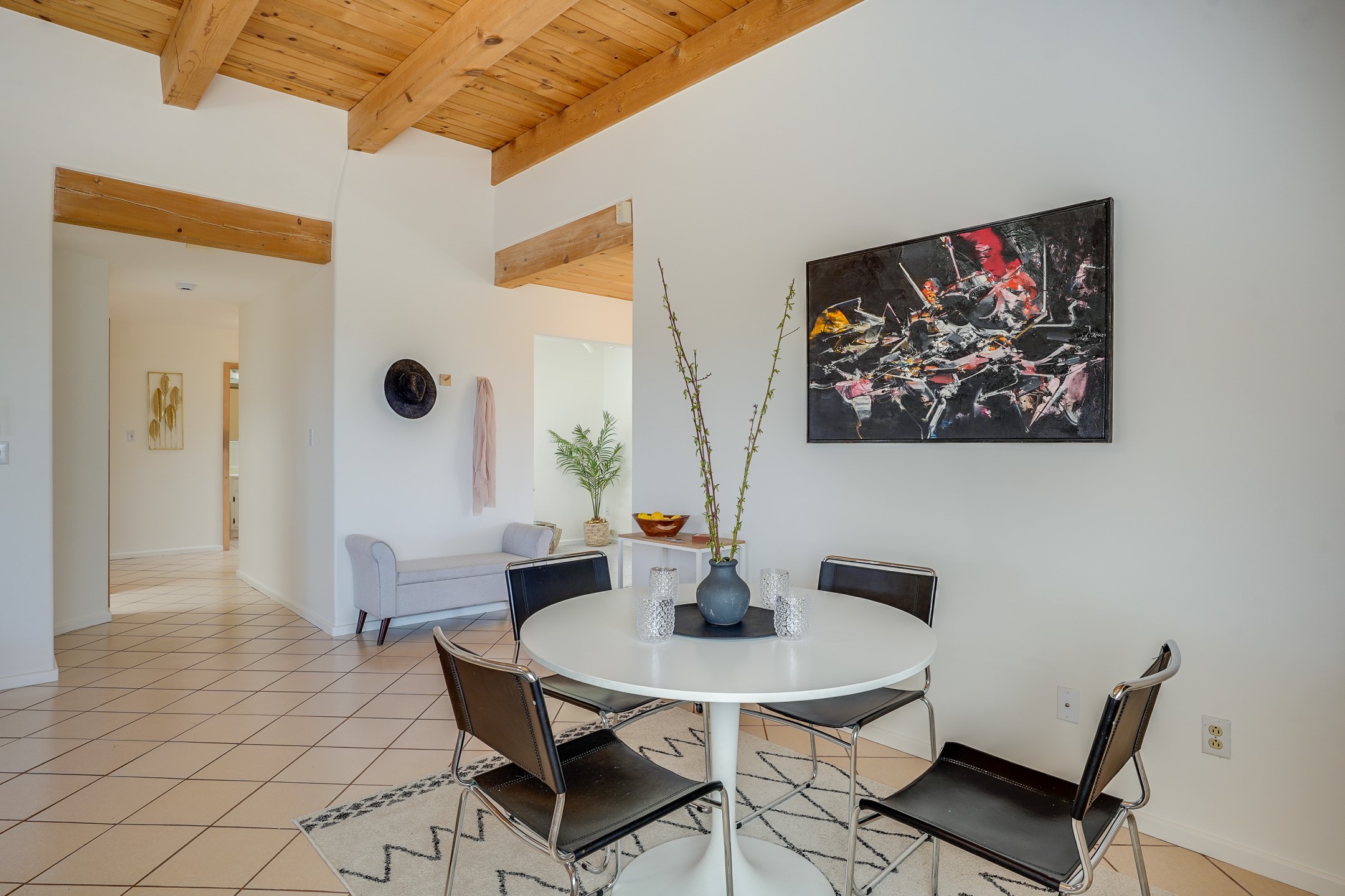 Nestled on a spacious corner lot in the highly sought-after Via Caballero neighborhood, this charming single-level home offers 1,592 square feet of light-filled living space. Thoughtfully designed with clerestory windows and passive solar elements, natural light pours into the home. The 2-bedroom, 2-bath floor plan includes a versatile home office or den, as well as a generous eat-in kitchen perfect for everyday living and entertaining. The main living and dining area features soaring beamed ceilings and is centered around a striking kiva fireplace, creating a warm and welcoming ambiance. The primary suite is a serene retreat with clerestory windows, a deep soaking tub, and a walk-in shower in the ensuite bath. Outdoors, the west-facing courtyard offers a peaceful setting to enjoy Santa Fe's sunsets, with a deep portal accessed directly from the living room. Additional highlights include central forced-air heating, mini-split cooling systems, and a detached two-car garage connected to the home via a covered breezeway. Lovingly maintained and move-in ready, this beautiful home is waiting for its next lucky owner to make it their own.
