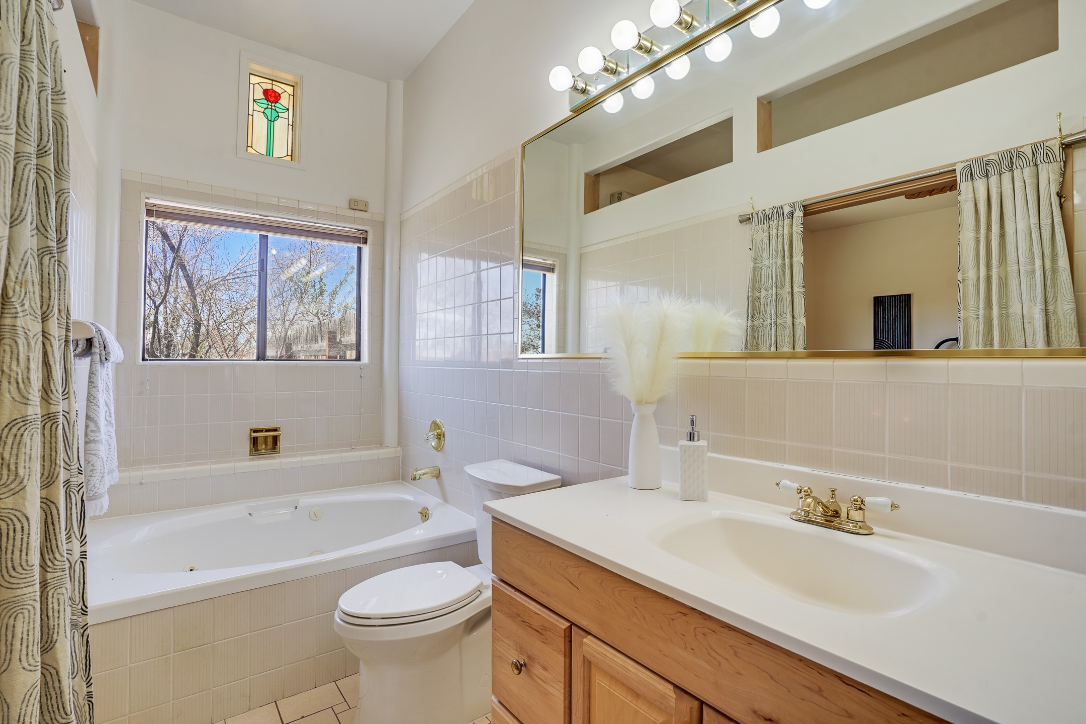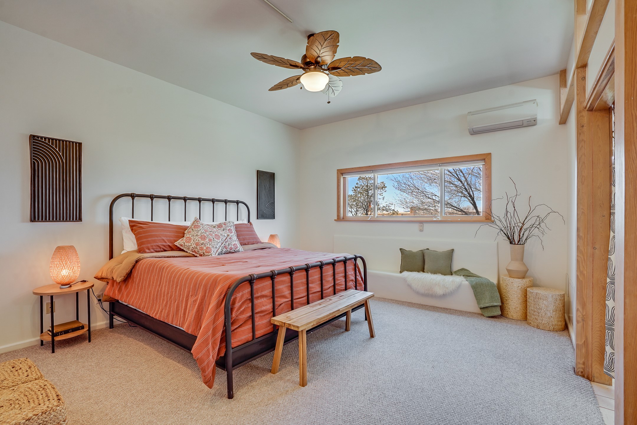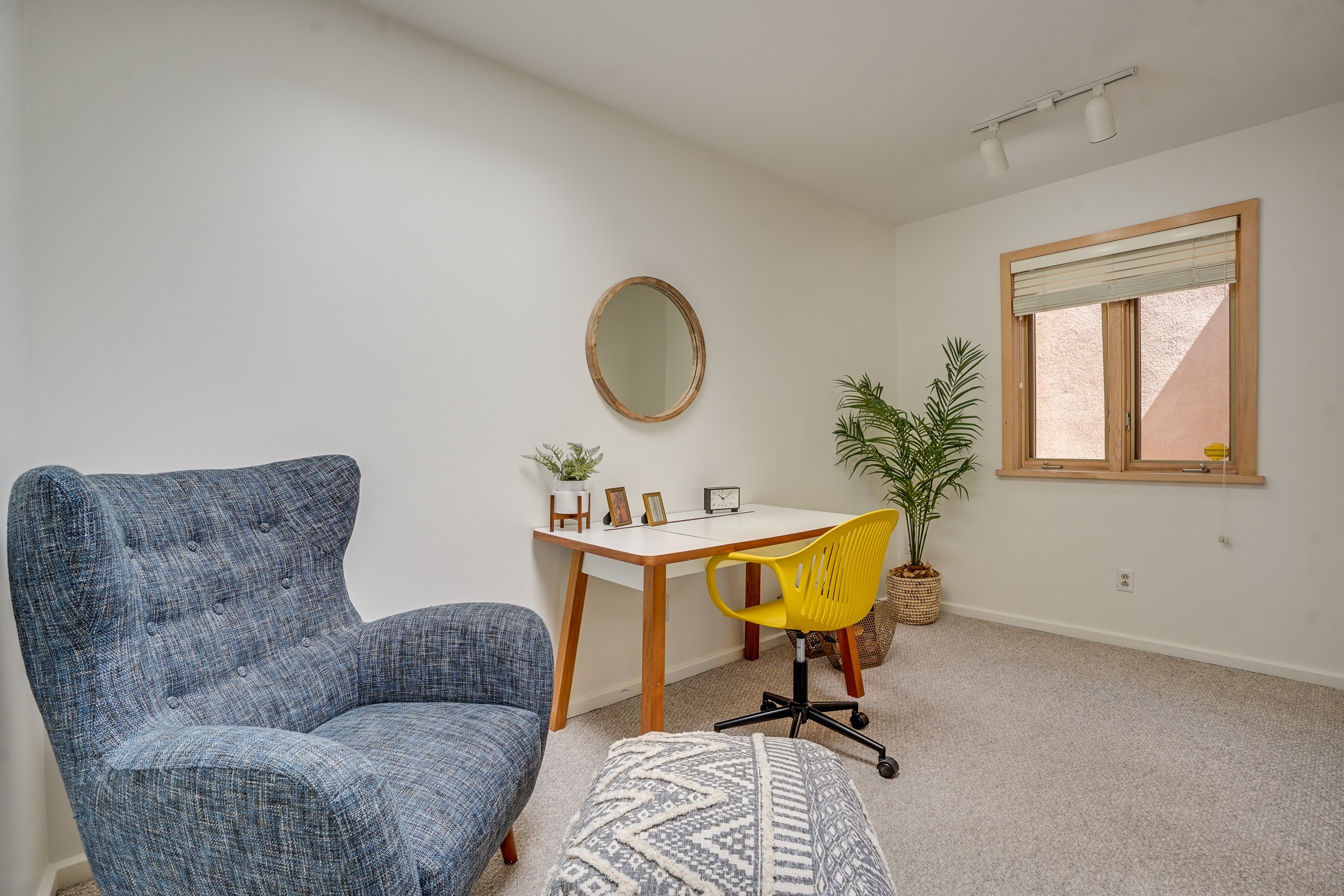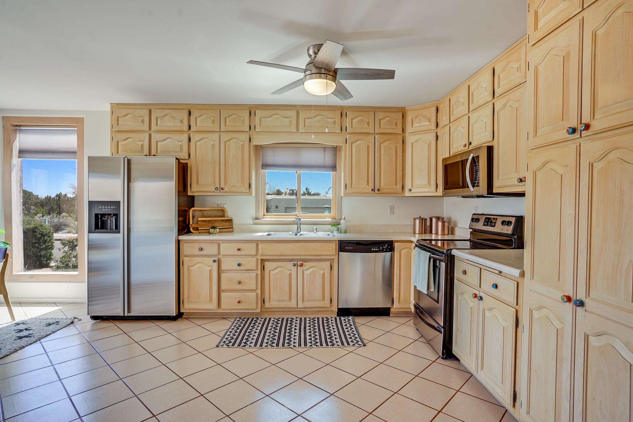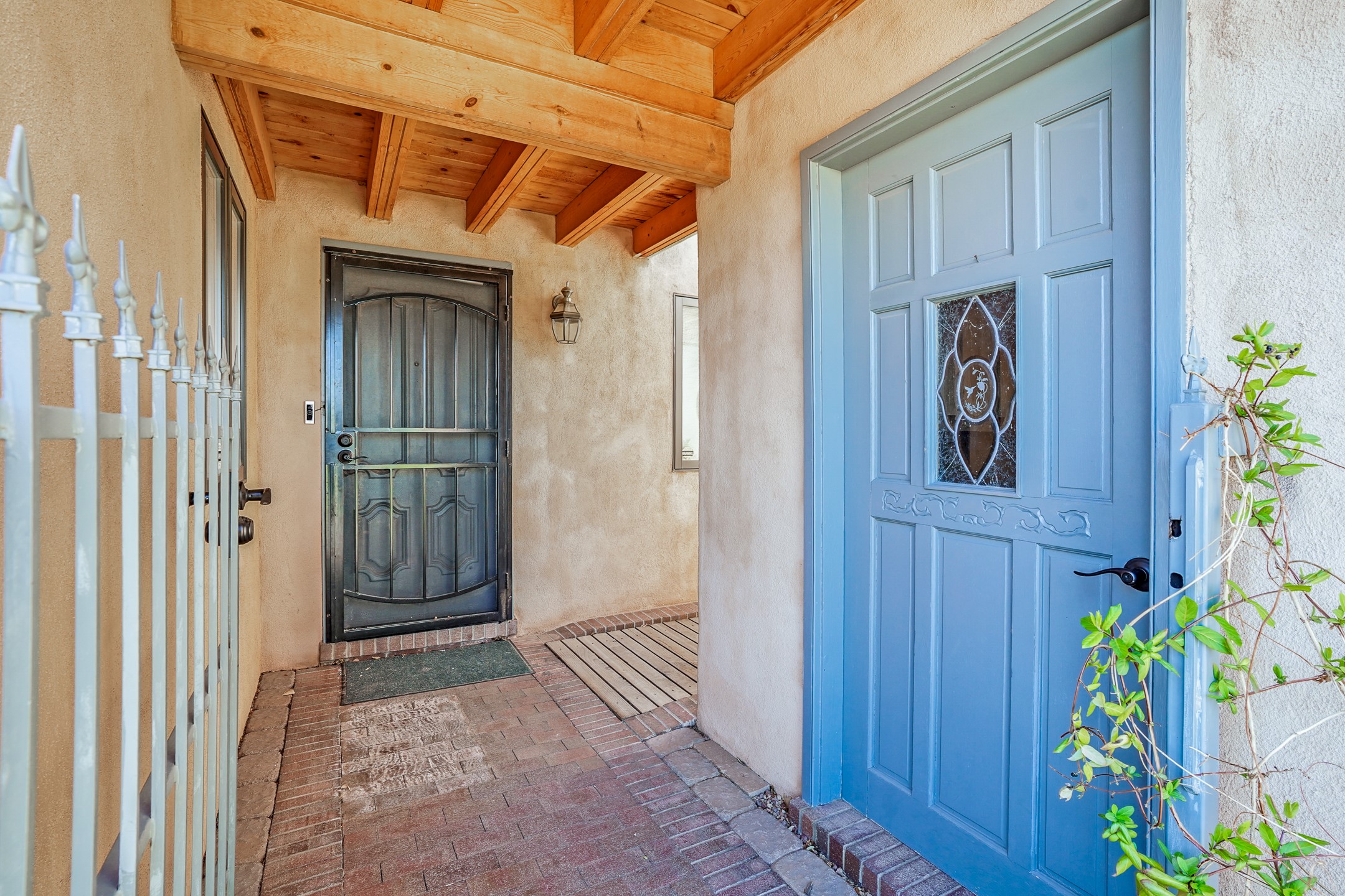 Nestled on a spacious corner lot in the highly sought-after Via Caballero neighborhood, this charming single-level home offers 1,592 square feet of light-filled living space. Thoughtfully designed with clerestory windows and passive solar elements, natural light pours into the home. The 2-bedroom, 2-bath floor plan includes a versatile home office or den, as well as a generous eat-in kitchen perfect for everyday living and entertaining. The main living and dining area features soaring beamed ceilings and is centered around a striking kiva fireplace, creating a warm and welcoming ambiance. The primary suite is a serene retreat with clerestory windows, a deep soaking tub, and a walk-in shower in the ensuite bath. Outdoors, the west-facing courtyard offers a peaceful setting to enjoy Santa Fe's sunsets, with a deep portal accessed directly from the living room. Additional highlights include central forced-air heating, mini-split cooling systems, and a detached two-car garage connected to the home via a covered breezeway. Lovingly maintained and move-in ready, this beautiful home is waiting for its next lucky owner to make it their own.