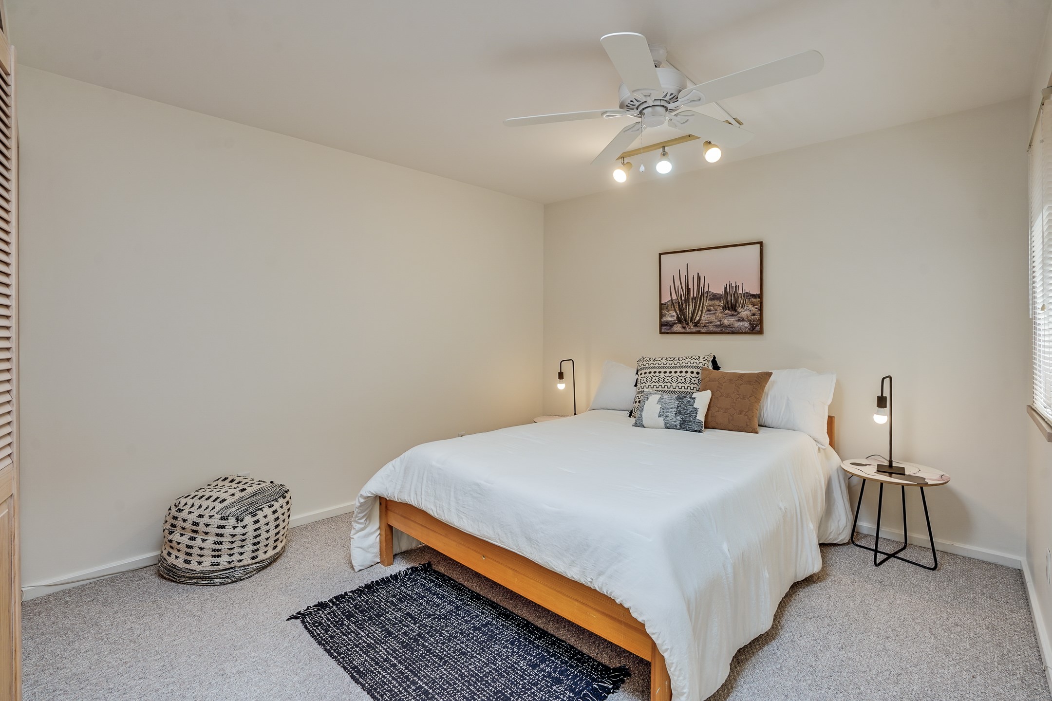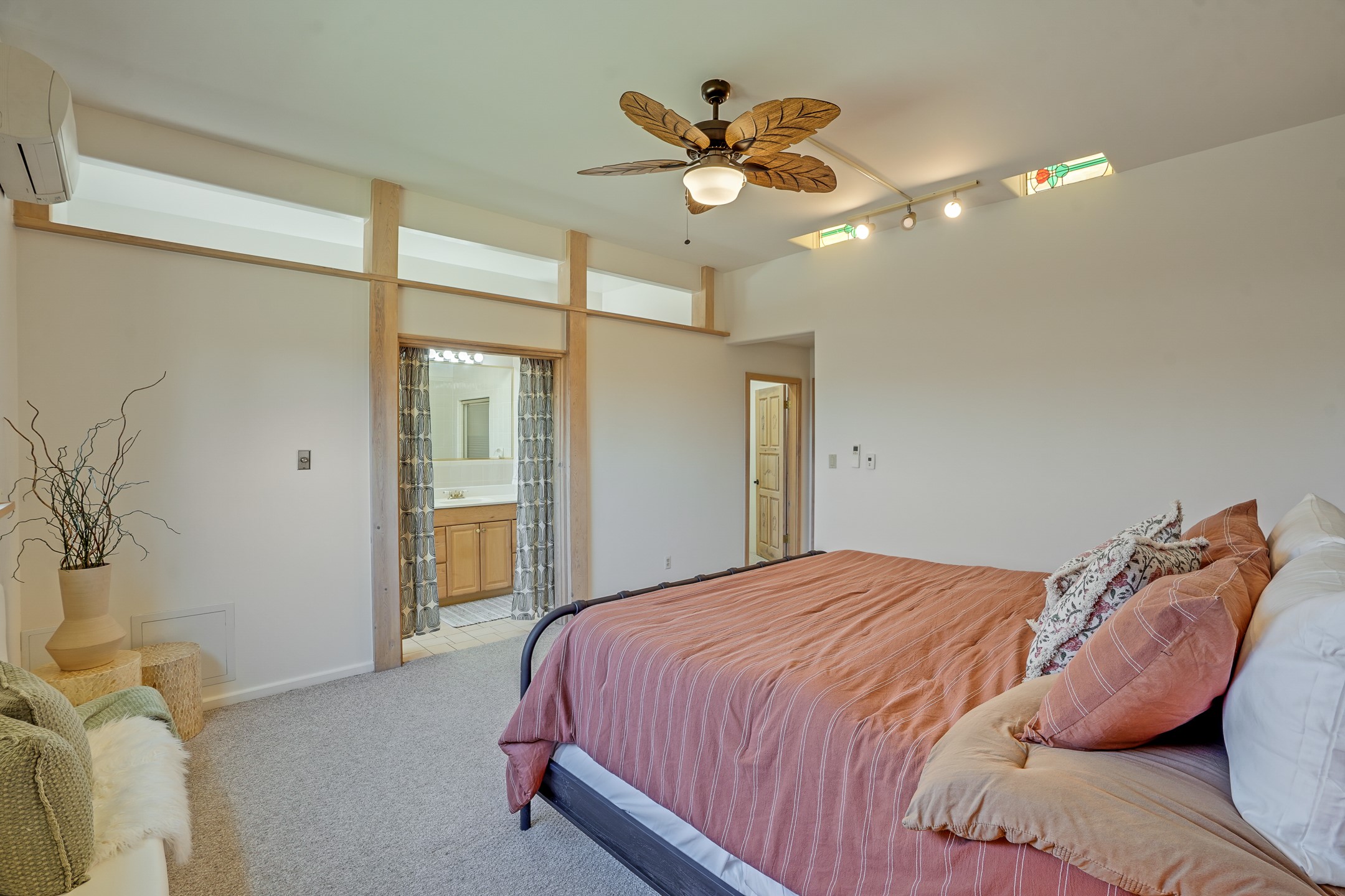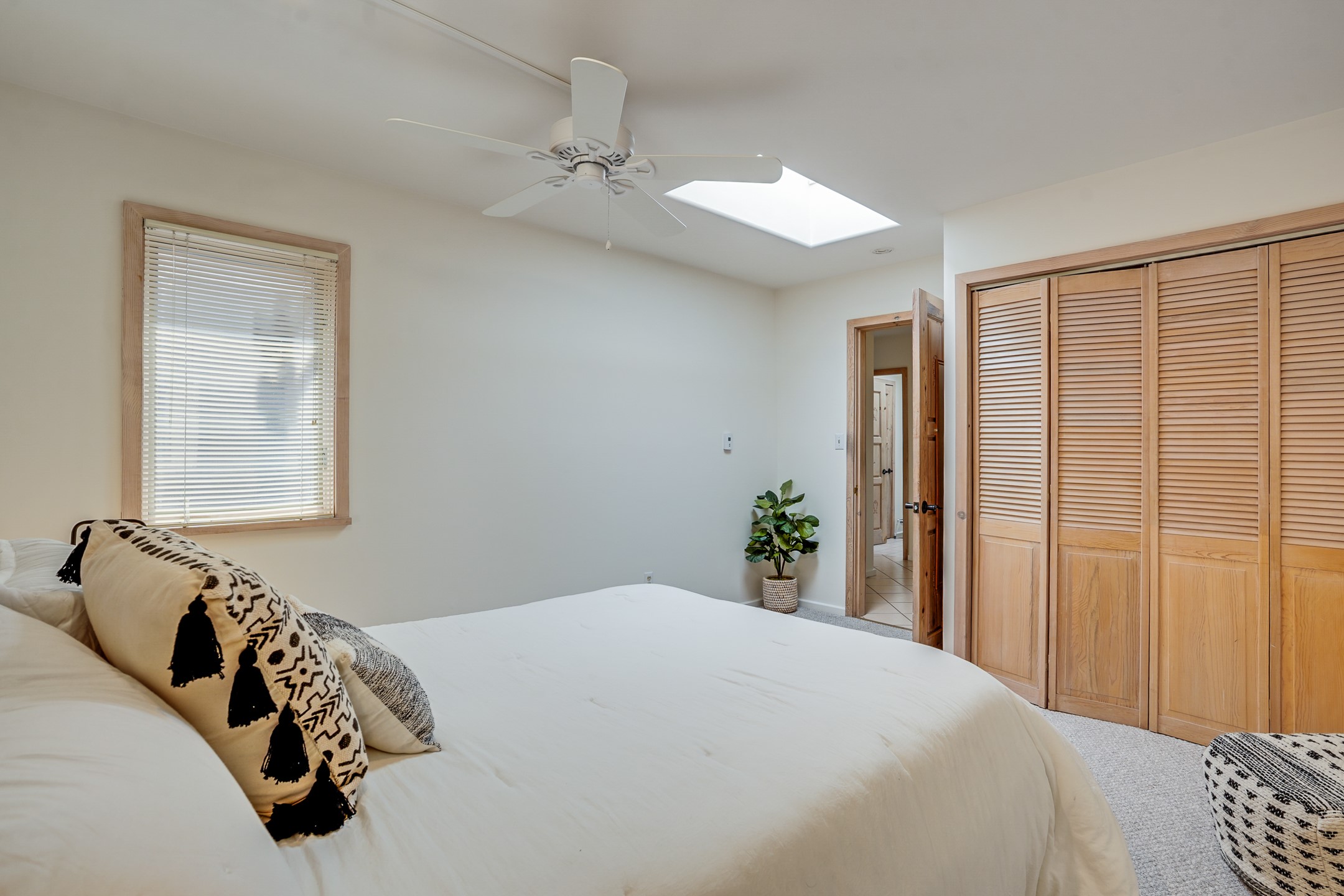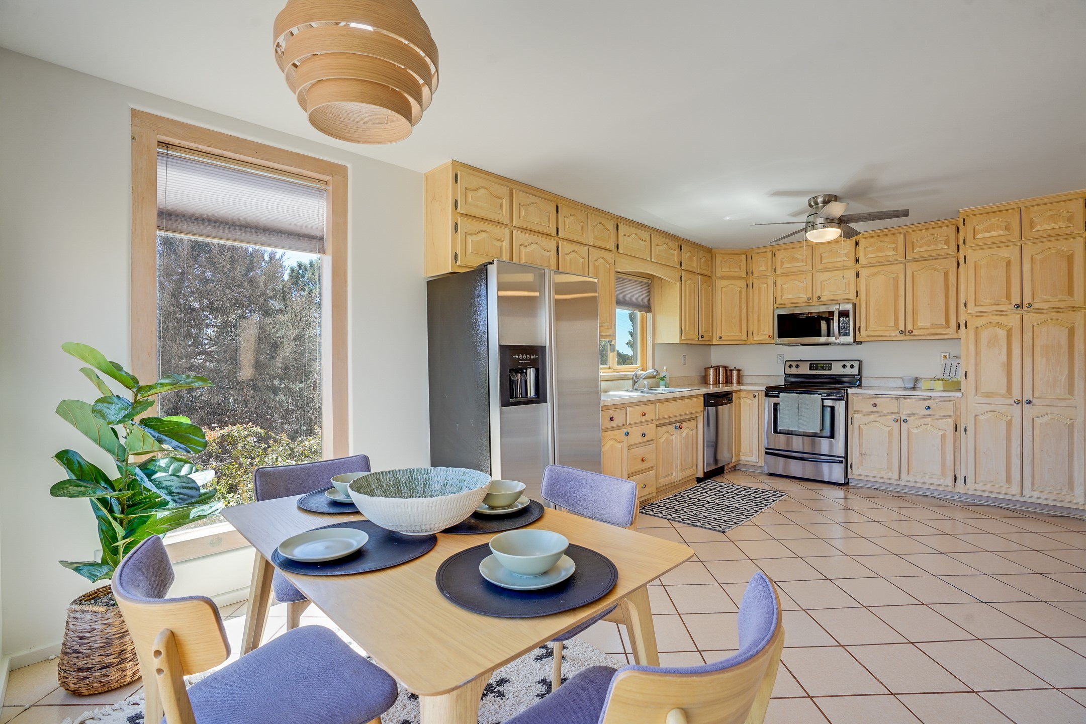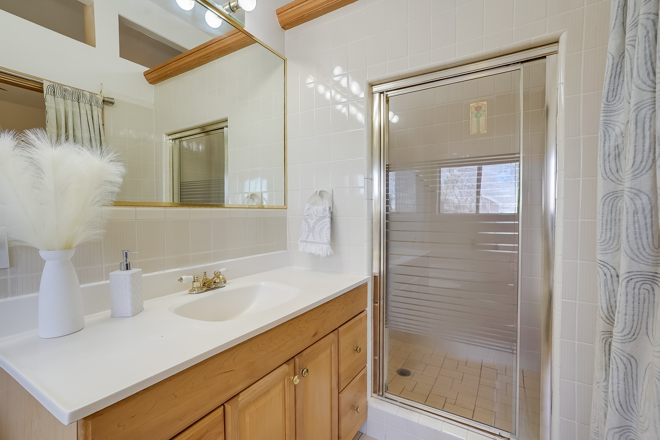 Nestled on a spacious corner lot in the highly sought-after Via Caballero neighborhood, this charming single-level home offers 1,592 square feet of light-filled living space. Thoughtfully designed with clerestory windows and passive solar elements, natural light pours into the home. The 2-bedroom, 2-bath floor plan includes a versatile home office or den, as well as a generous eat-in kitchen perfect for everyday living and entertaining. The main living and dining area features soaring beamed ceilings and is centered around a striking kiva fireplace, creating a warm and welcoming ambiance. The primary suite is a serene retreat with clerestory windows, a deep soaking tub, and a walk-in shower in the ensuite bath. Outdoors, the west-facing courtyard offers a peaceful setting to enjoy Santa Fe's sunsets, with a deep portal accessed directly from the living room. Additional highlights include central forced-air heating, mini-split cooling systems, and a detached two-car garage connected to the home via a covered breezeway. Lovingly maintained and move-in ready, this beautiful home is waiting for its next lucky owner to make it their own.