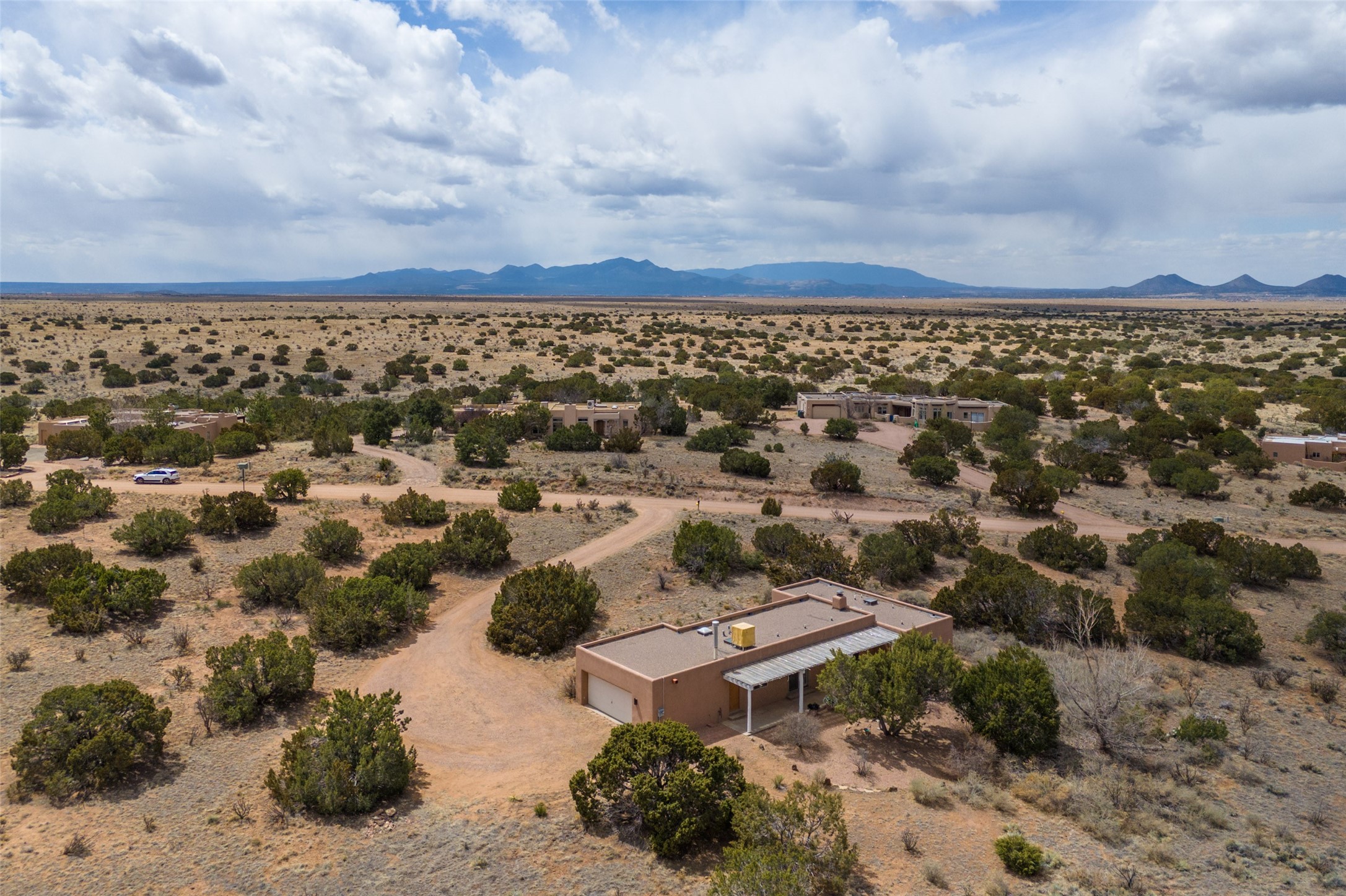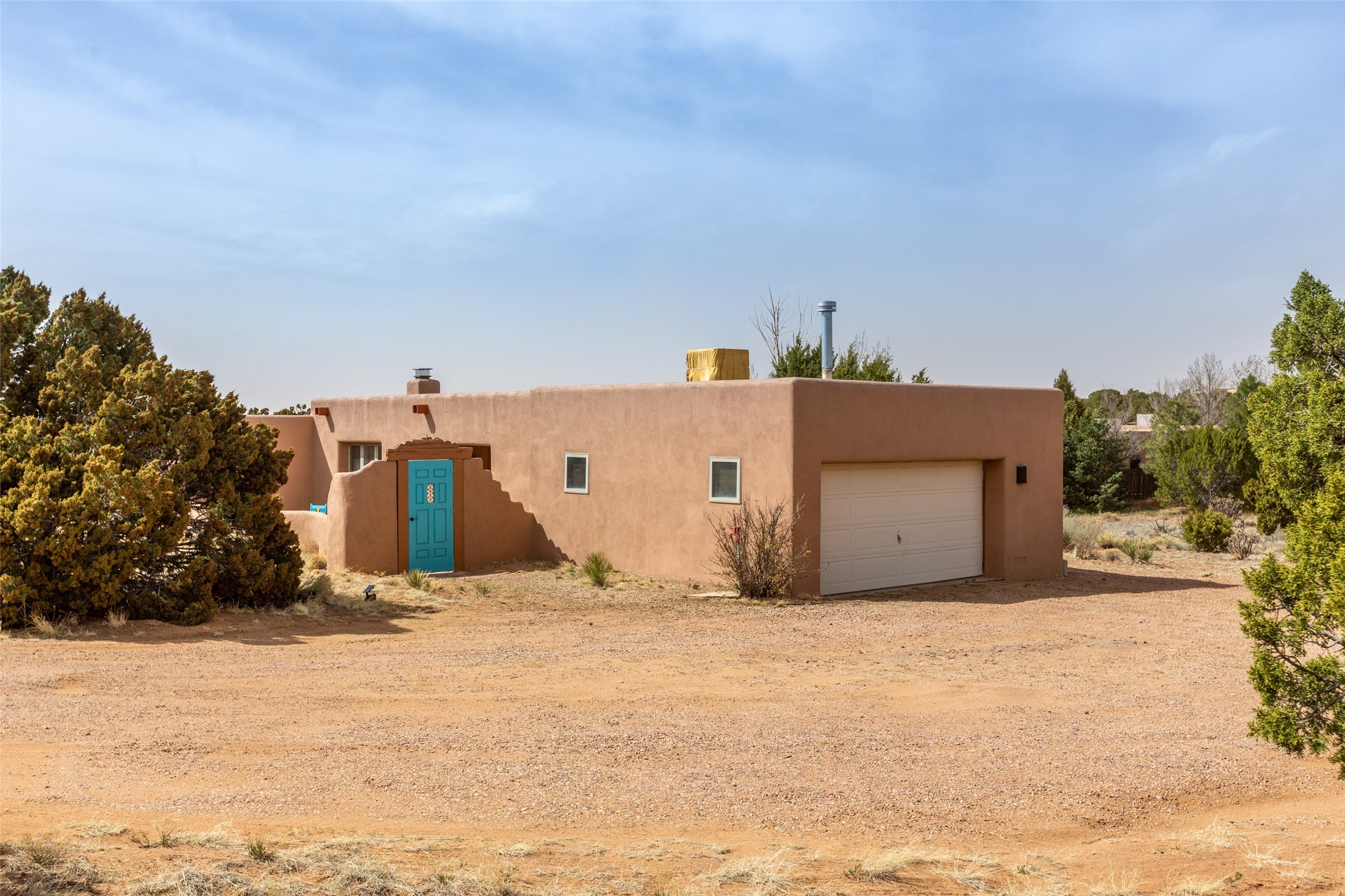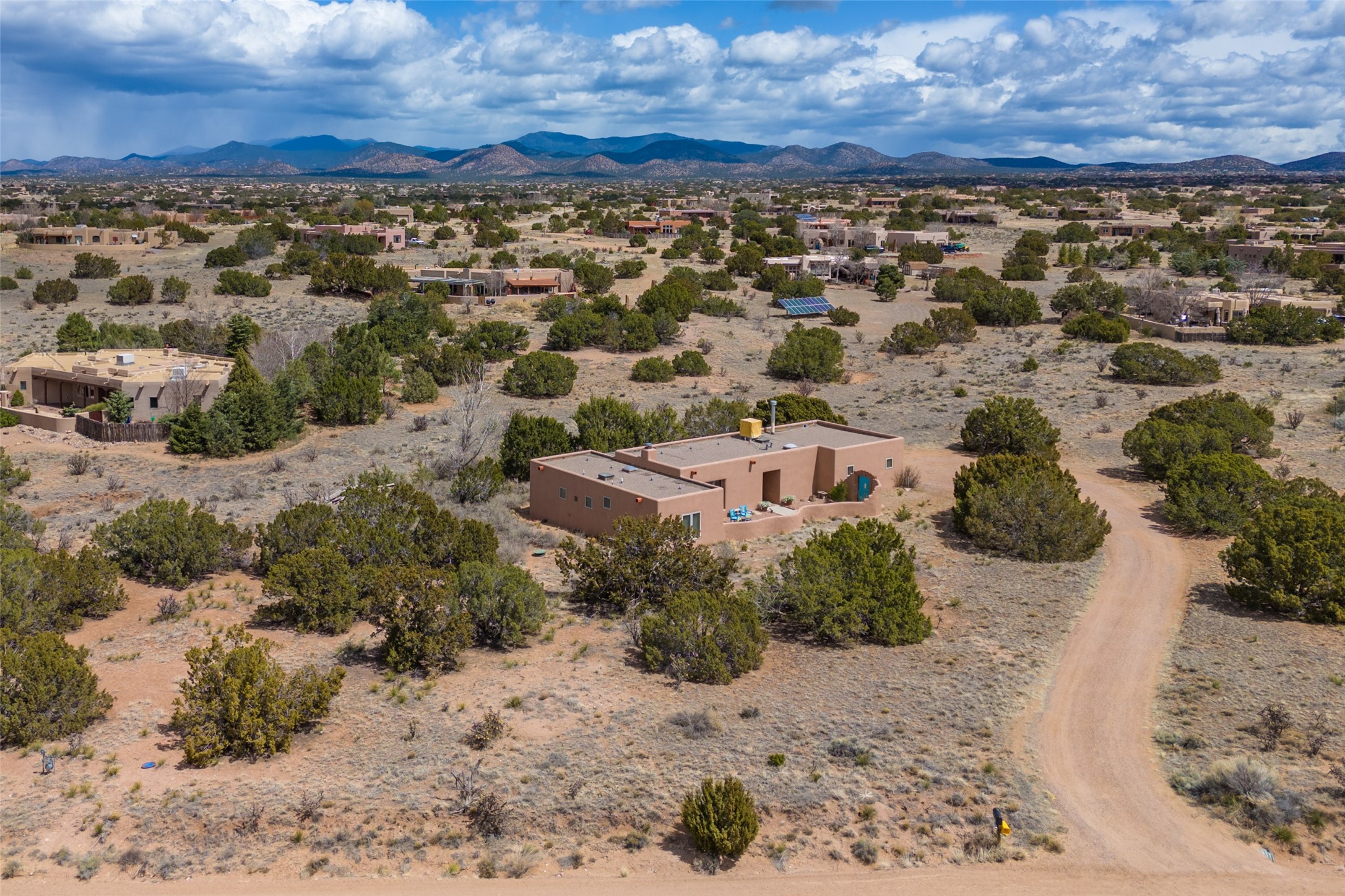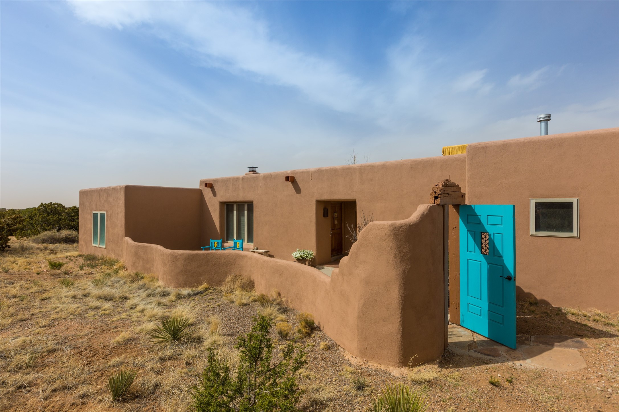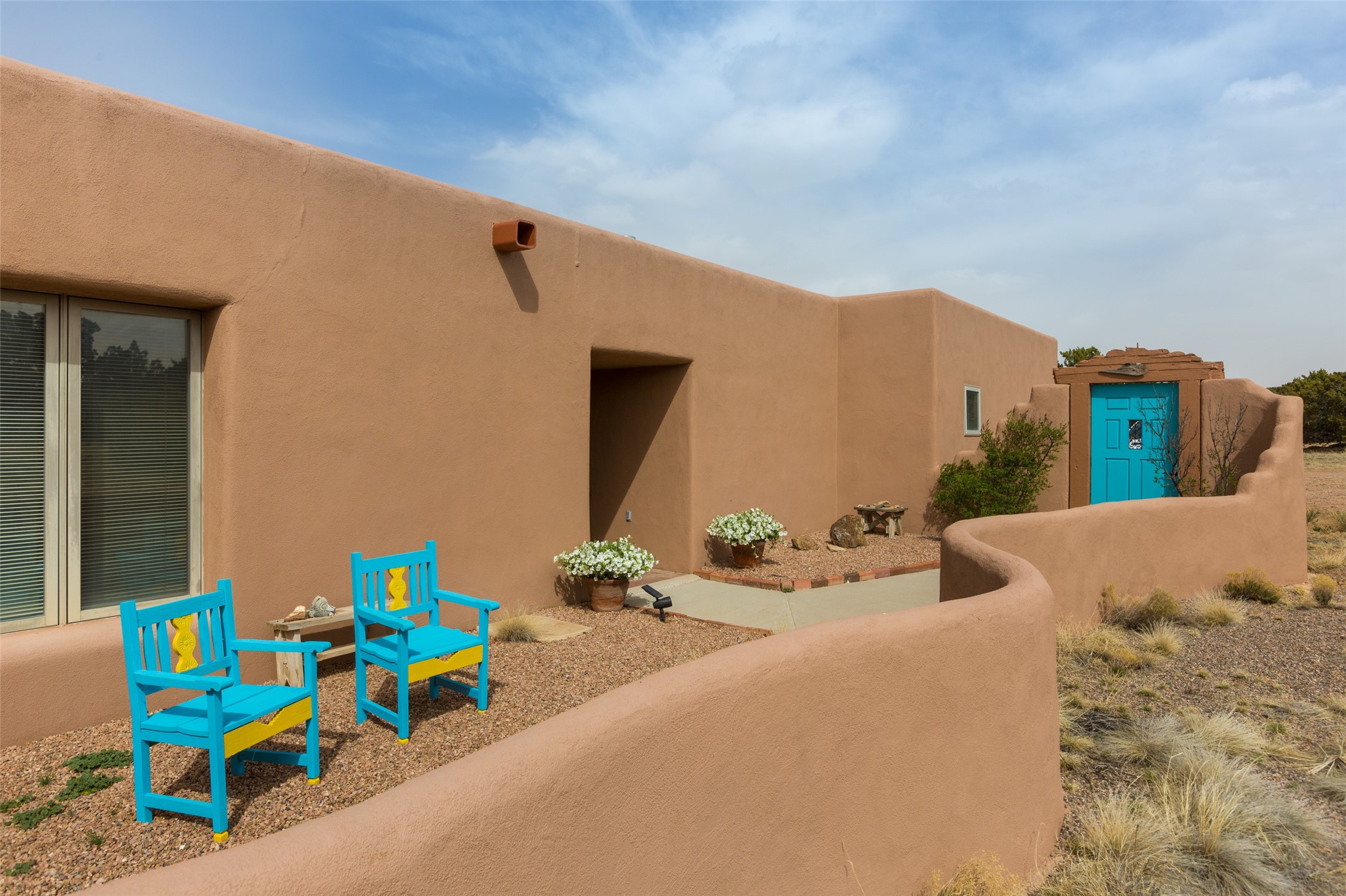 This one owner 2 bedroom, 2 bath open concept home in the peaceful Ladera section of Eldorado, designed by architect Bob Zachry, offers comfortable, contemporary living. The 1.77 acre lot is one of the larger lots in the area. The home has been freshly painted (03/25) and features a living room with wood burning fireplace, tongue and groove ceiling and beams, and a large picture window flanked by bookcases which go to the ceiling. A large informal dining area adjacent to the kitchen offers room to gather for meals. The kitchen has a newer GE electric range (06/23). Unique floor plan features a primary suite with ensuite bath and walk in closet, and a separate guest suite with a bedroom, bath and linen closet. French doors to the guest suite allow for maximum privacy. Four skylights and large windows provide lots of natural light. French doors in the kitchen lead to a large portal (painted 05/22) where you can relax and enjoy your morning coffee. The oversized, drywalled attached garage leads to a combination mudroom, laundry, and pantry. Radiant heating with three zones and a central evaporative cooler will keep you comfortable year round. The courtyard and area near the rear portal has been xeriscaped. Stucco repaired and painted with elastomeric paint 05/22. Gas hot water heater replaced 01/24. Eldorado has a community center, swimming pool, dog park, walking paths, nature preserve, pickleball and tennis courts.